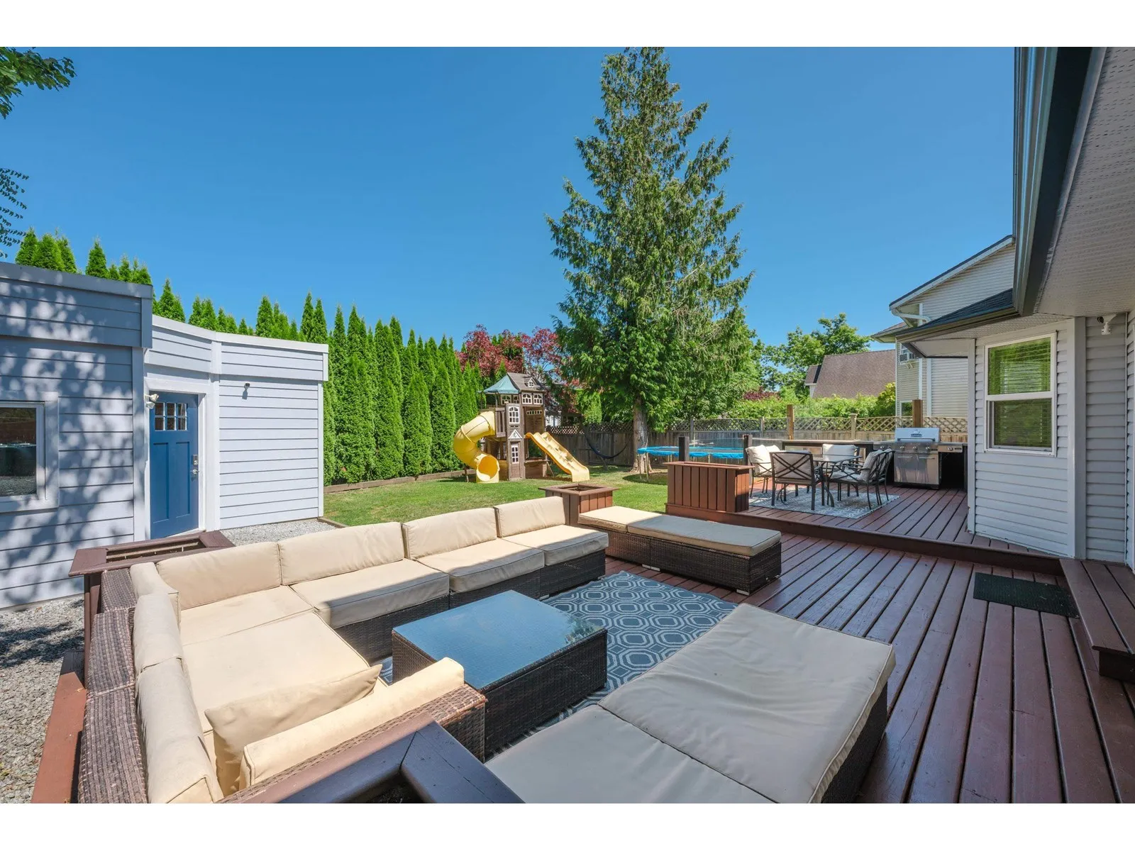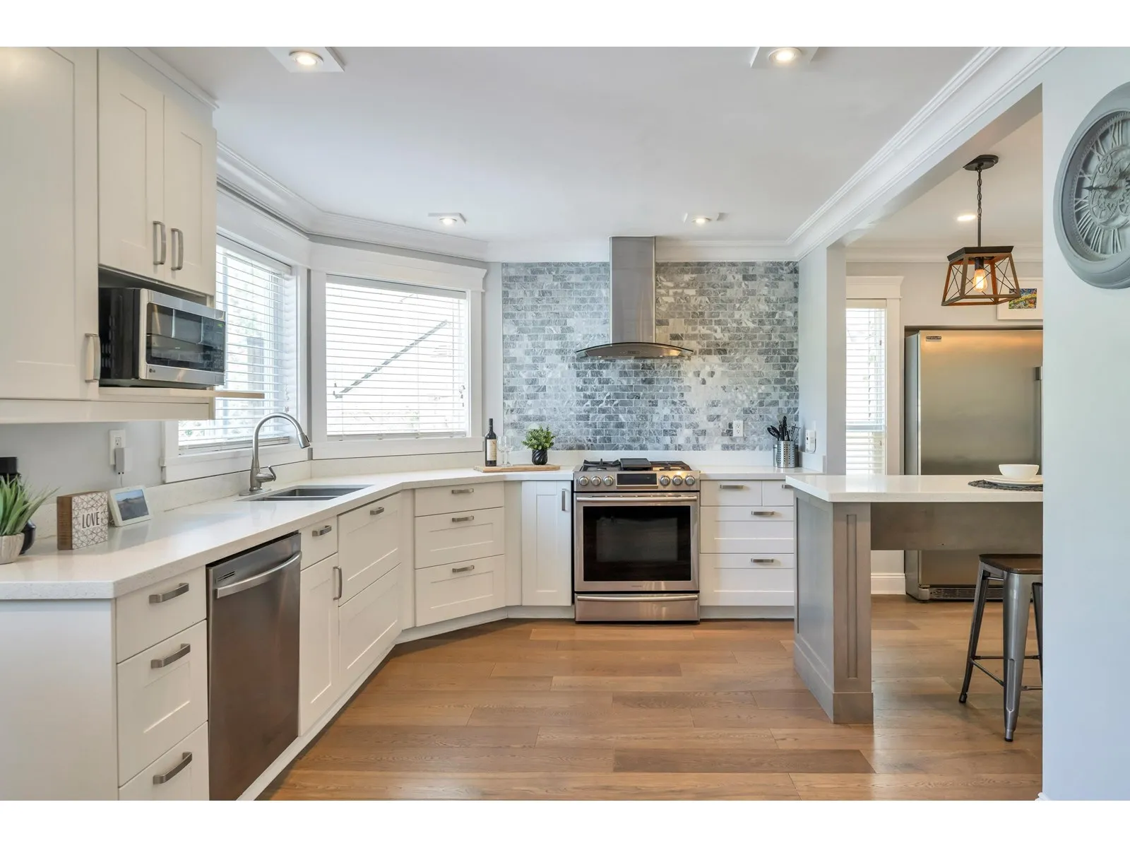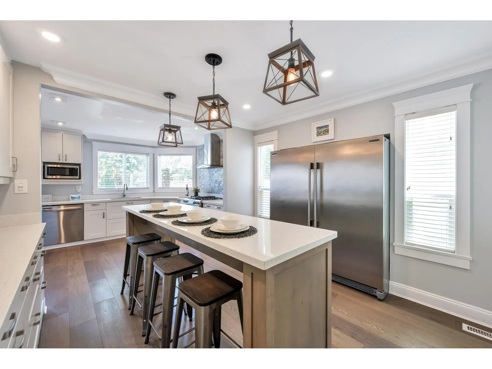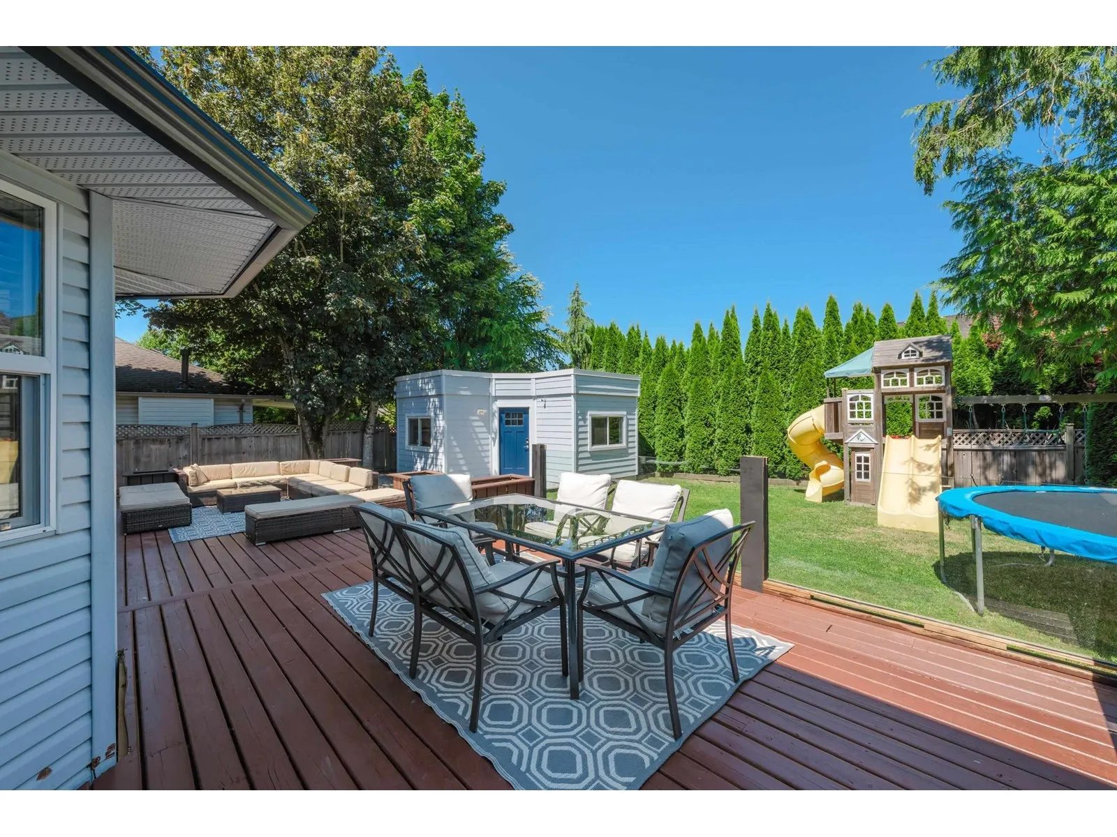 Beautiful 2-storey home on a quiet, tree-lined street in upper Murrayville. Main floor boasts wide plank hardwood flooring, crown moldings, a gorgeous renovated & expanded kitchen featuring extensive white shaker cabinetry, quartz counters, breakfast bar with pendant lighting, & stainless appliances incl double-wide fridge/freezer. Eating area w/ bay windows, and adjacent family room w/ glass doors leading to huge rear decks, private yard, and detached 230 sq ft rec room/flex space (ideal for teens or private office). Bdrm/flex rm, powder rm, and laundry. 3 spacious bedrooms up incl primary bdrm w/ sitting area and gorgeous ensuite. Bathrooms tastefully updated. Double garage, & RV parking! Great family neighbourhood close to parks, cafes, shops, schools, hospital, & WC Blair Rec Centre. (id:27476)