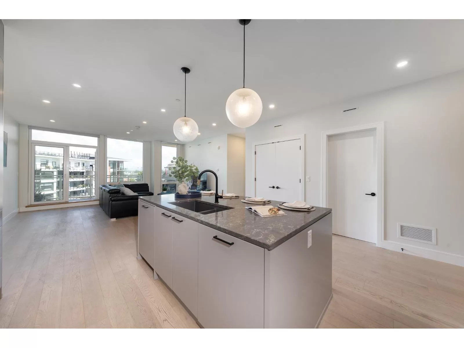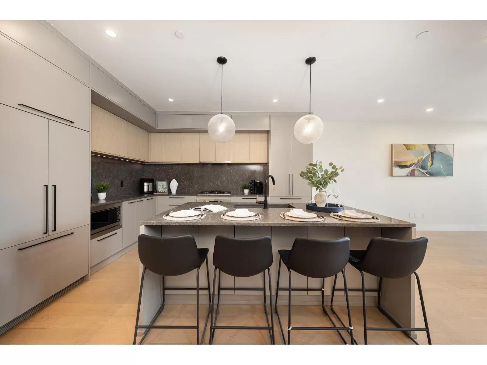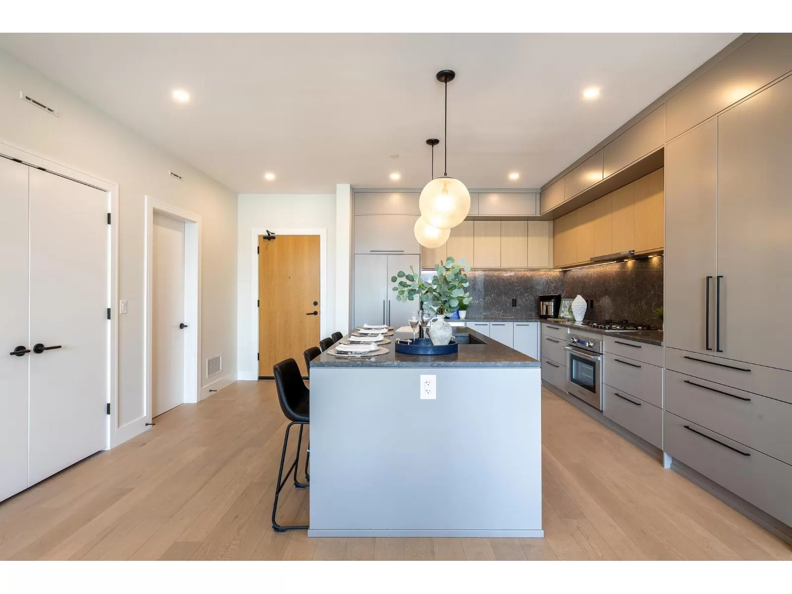 Luxurious sub-penthouse at Legacy On Park Avenue! This stunning 54' wide home features floor-to-ceiling windows showcasing beautiful mountain views and a 331 sq. ft. deck spanning the entire width. Unique curved architecture, durable aluminum & tile exterior, and mass timber low-carbon construction ensure timeless quality. Features 3 bedrooms + den with a walk-in closet (can be used as a 4th bedroom), ducted heating & air conditioning, Fisher & Paykel built-in appliances, Caesarstone countertops, and 3/4" oak hardwood flooring throughout. Amenities include concierge, fitness centre, Grand Lounge, and EV charging. Includes 2 parking & 1 locker. Half a block to shopping and community centre, and only 8-minute walk to the future SkyTrain station. (id:27476)