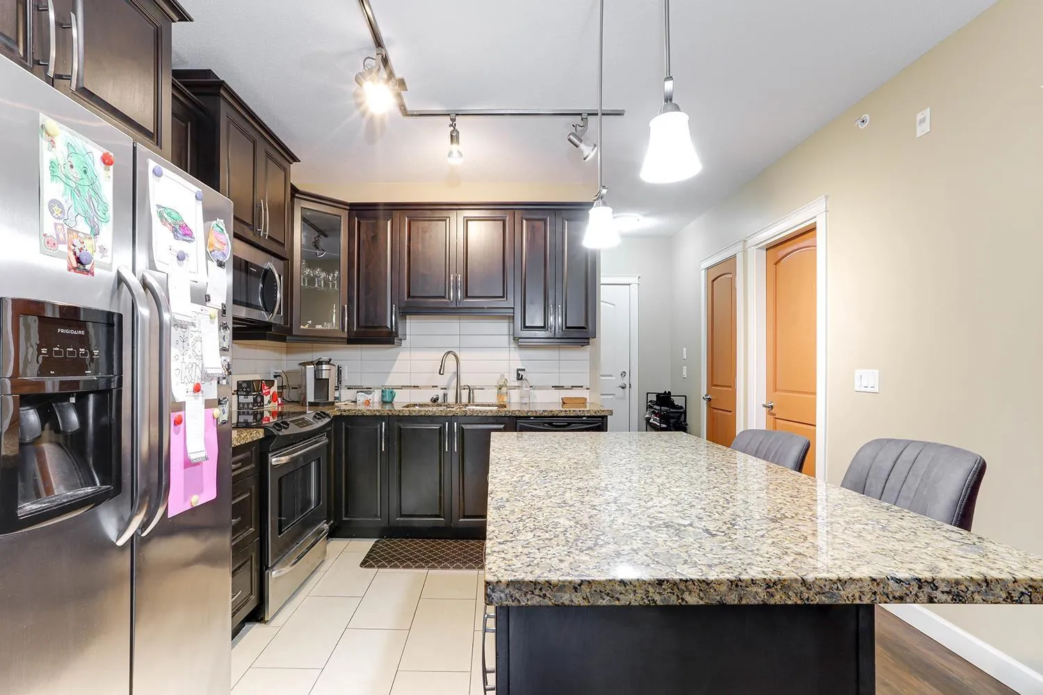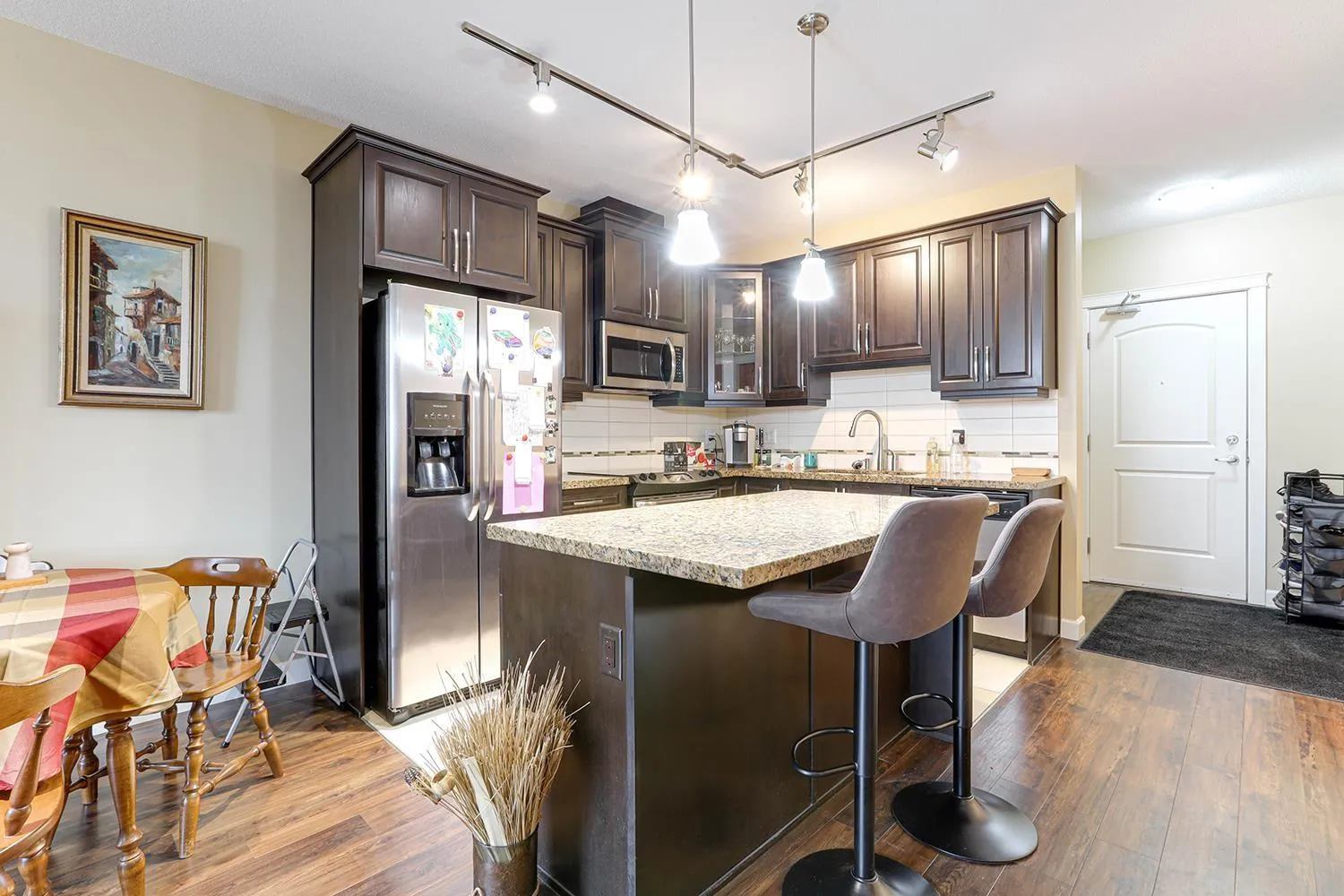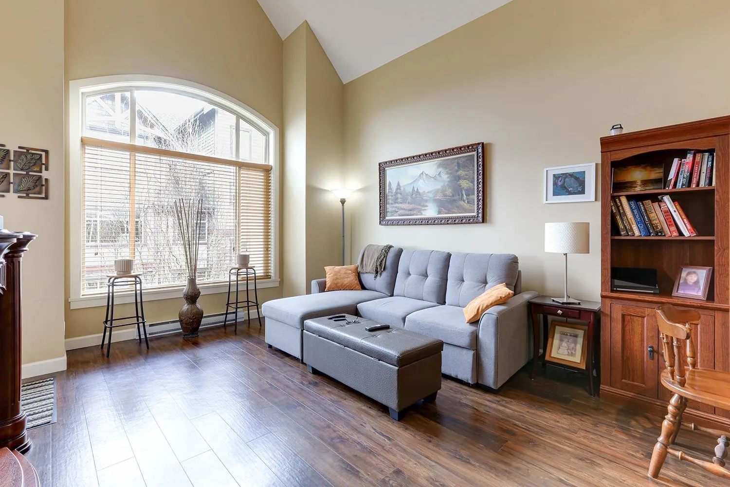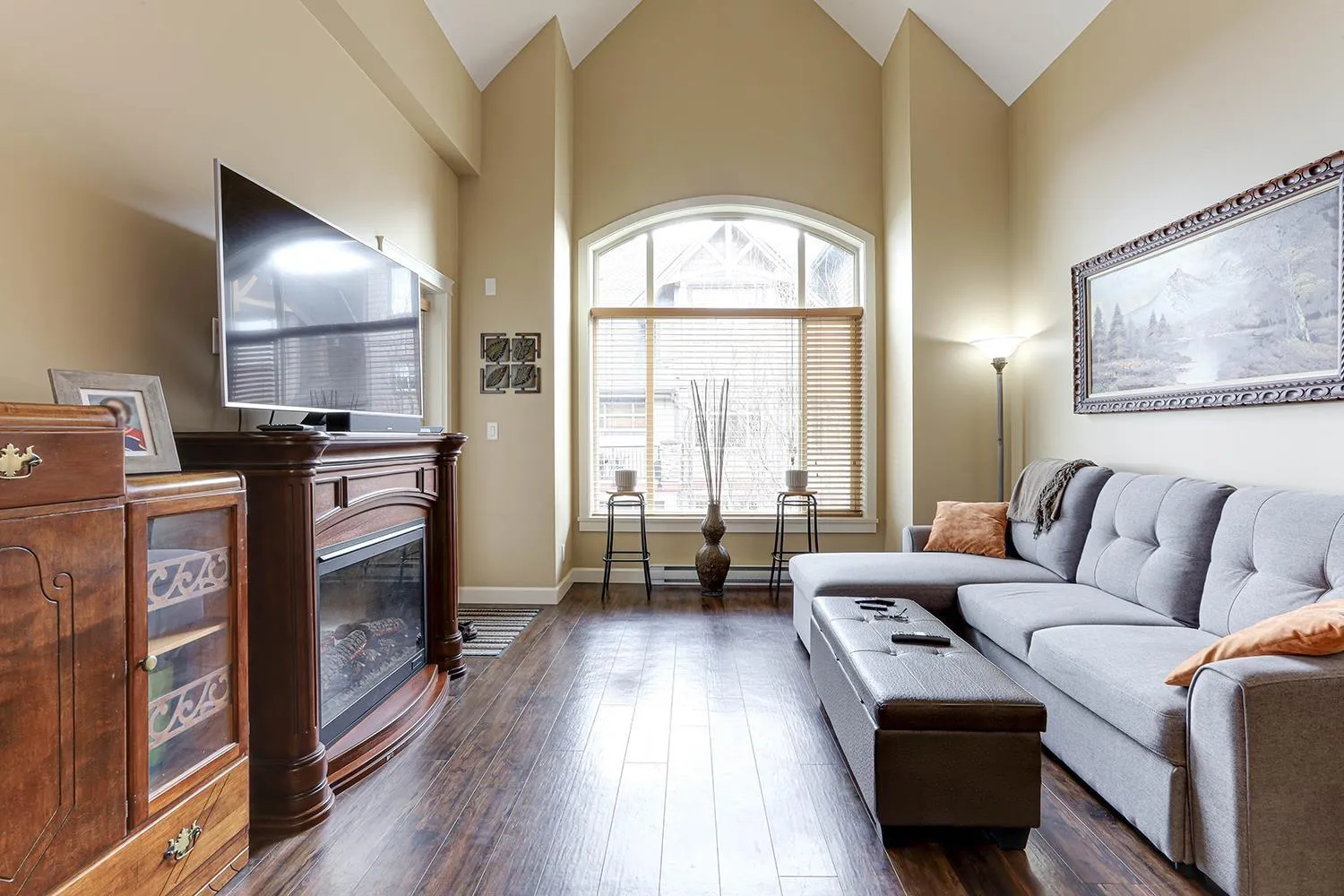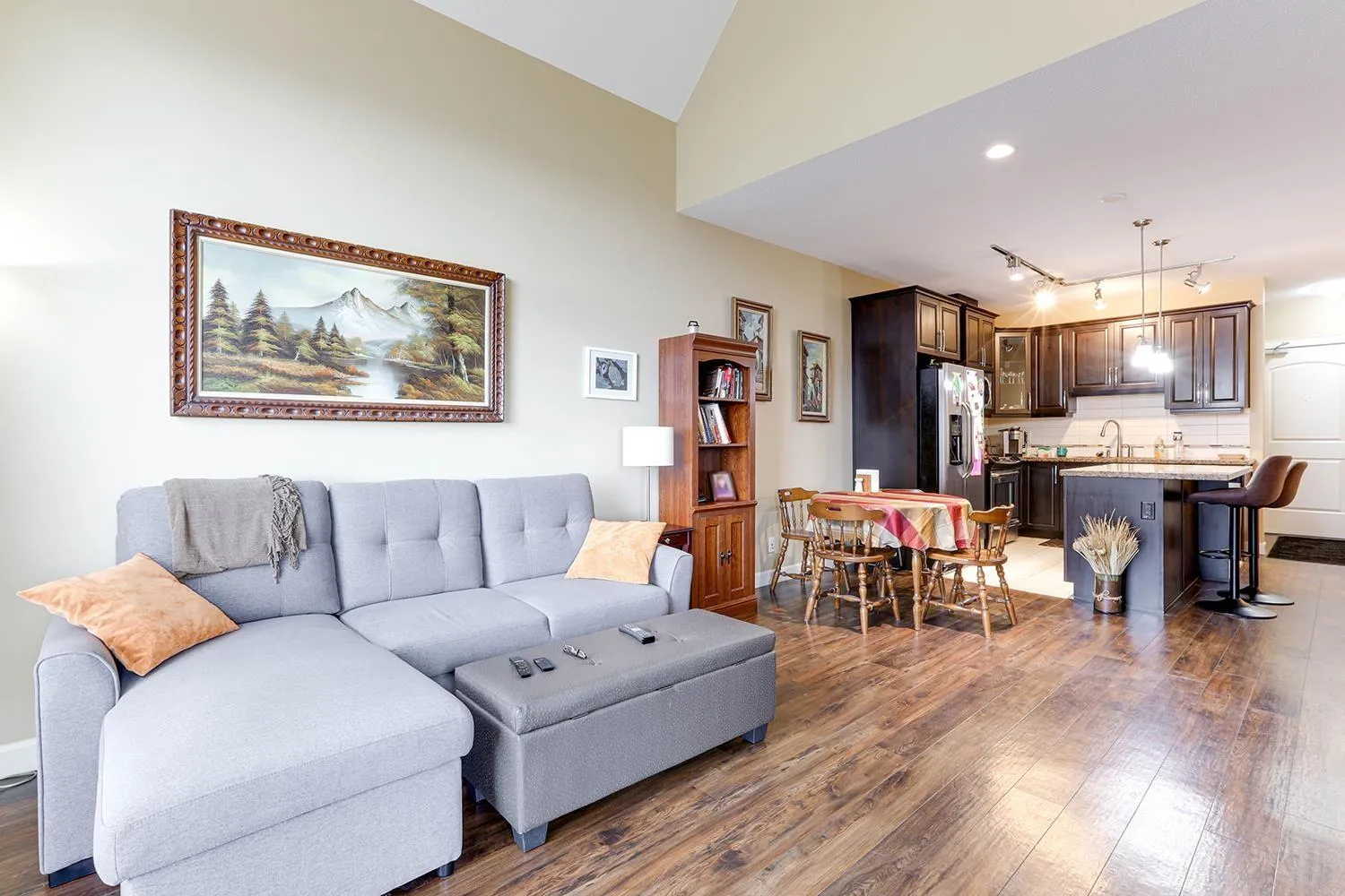 TOP FLOOR CORNER UNIT with soaring vaulted ceilings and a massive 231 sqft balcony-perfect for entertaining or unwinding with mountain views! Welcome to Yorkson Creek, one of Willoughby's most desirable communities. This 2 bed + DEN, 2 bath home offers 906 sqft of beautifully designed living space featuring rich hardwood floors, granite countertops, solid wood cabinetry, and s/s appliances. Natural light pours in through oversized windows, creating a bright and inviting ambiance. The layout offers excellent bedroom separation and a flexible den-ideal for a home office or nursery. Perfect for downsizers or young families! Comes with 2 parking stalls and a large storage locker conveniently located behind your stall. Amenities include gym, playground, and more. Pet-friendly, steps to schools, transit, parks, shopping, and HWY 1. Click on virtual tour for more. (id:27476)