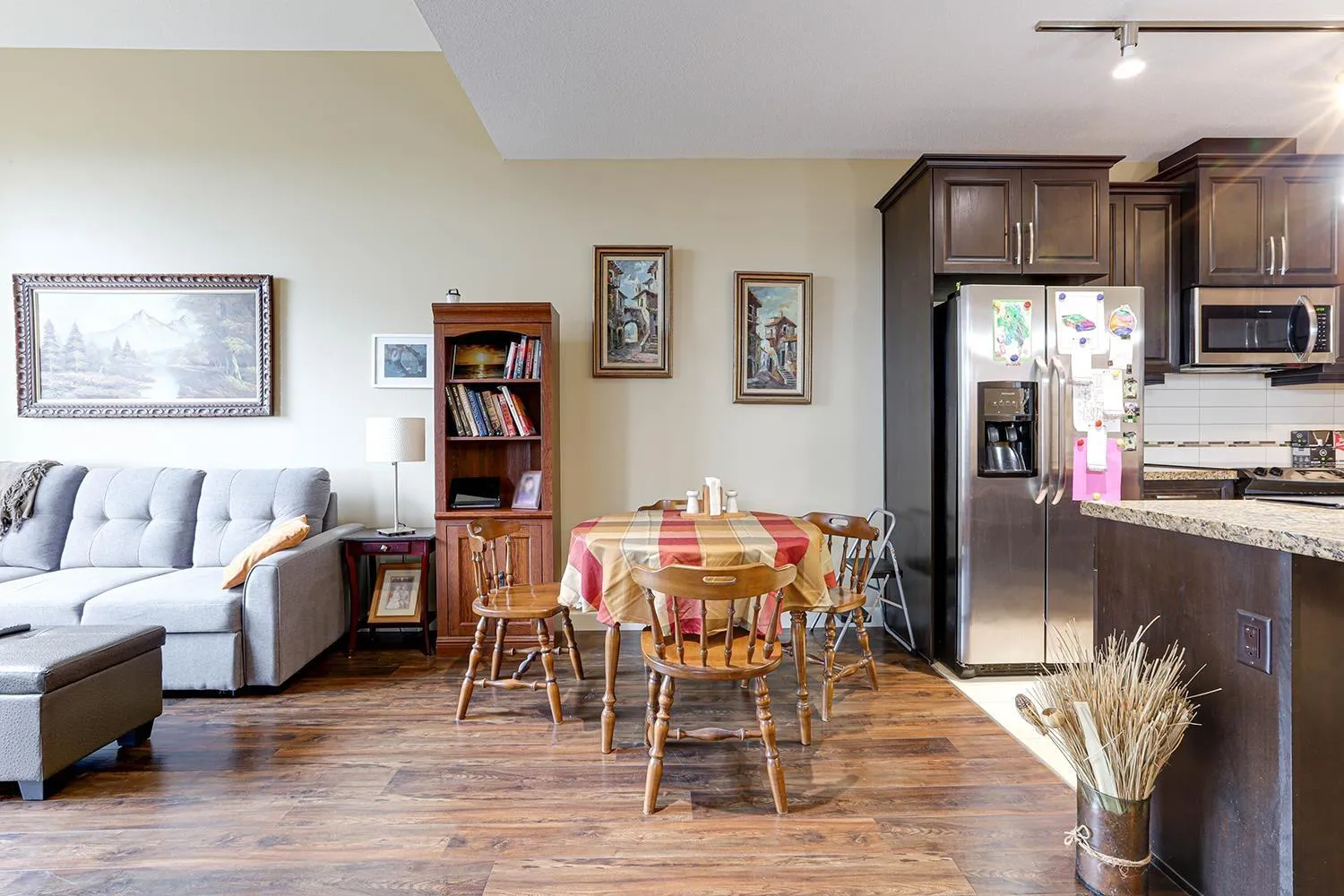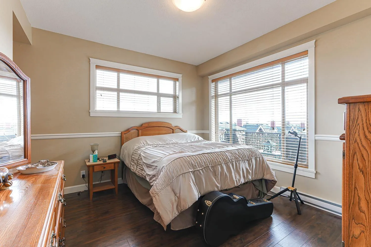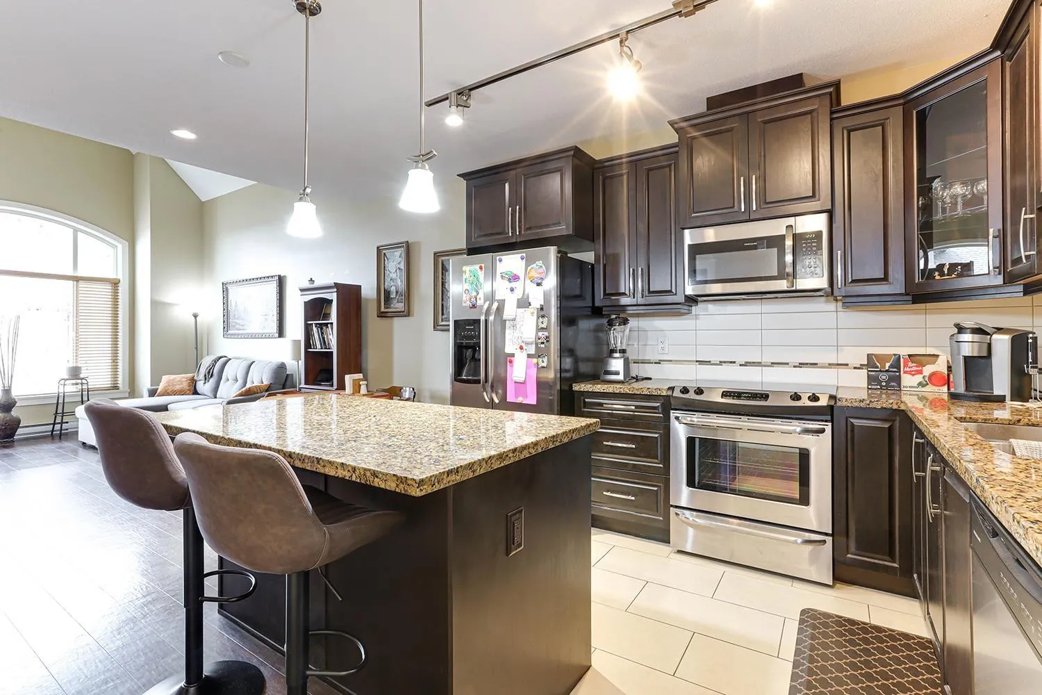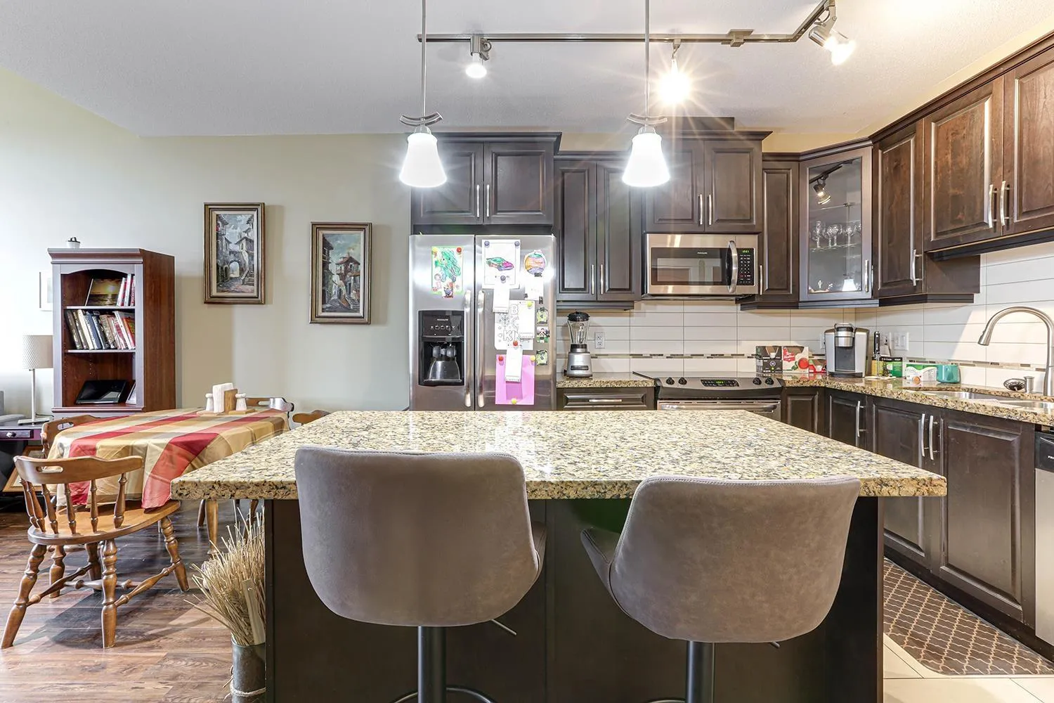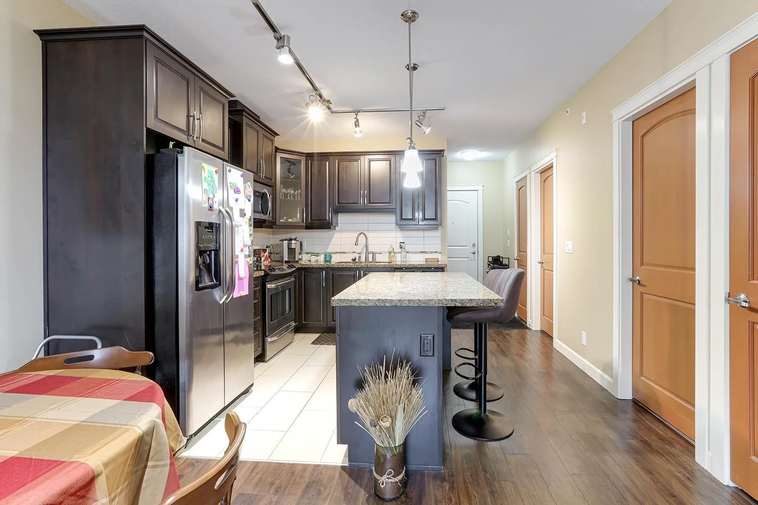 TOP FLOOR CORNER UNIT with soaring vaulted ceilings and a massive 231 sqft balcony-perfect for entertaining or unwinding with mountain views! Welcome to Yorkson Creek, one of Willoughby's most desirable communities. This 2 bed + DEN, 2 bath home offers 906 sqft of beautifully designed living space featuring rich hardwood floors, granite countertops, solid wood cabinetry, and s/s appliances. Natural light pours in through oversized windows, creating a bright and inviting ambiance. The layout offers excellent bedroom separation and a flexible den-ideal for a home office or nursery. Perfect for downsizers or young families! Comes with 2 parking stalls and a large storage locker conveniently located behind your stall. Amenities include gym, playground, and more. Pet-friendly, steps to schools, transit, parks, shopping, and HWY 1. Click on virtual tour for more. (id:27476)