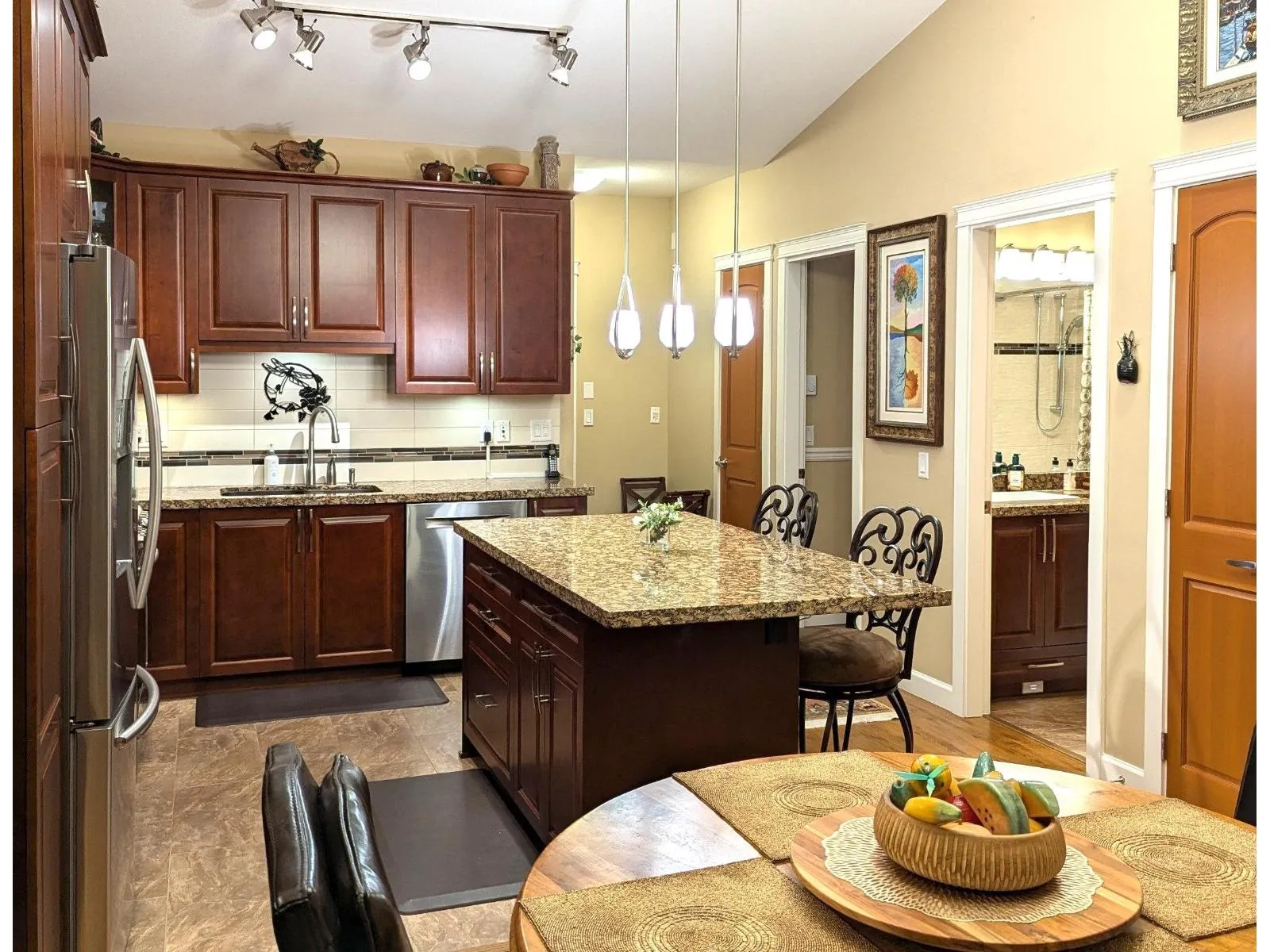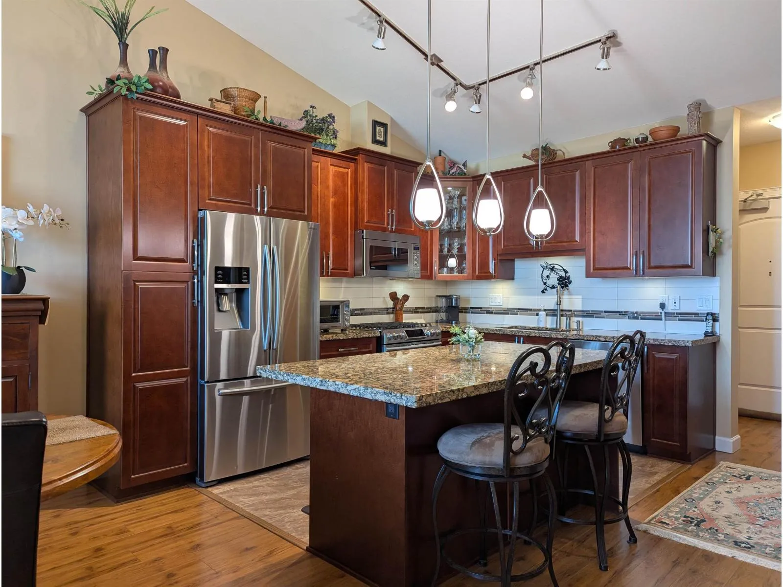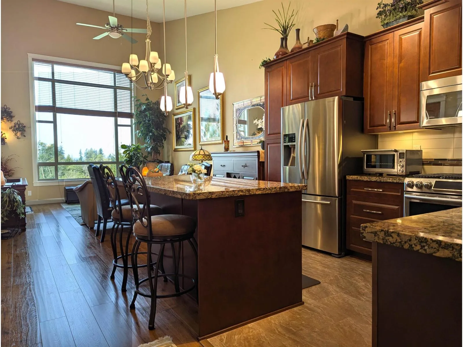 Stop your search; this executive, luxury penthouse is the one! Yorkston Creek Parkside 1 was constructed by Quadra with quality design & materials and this home features many upgrades and thoughtful, value-added extras added by my meticulously clean & detail-oriented original owners. Please request the full list! This corner unit has a wrap around 240 sqft solarium that enjoys greenbelt and sunset views, an impressive vaulted ceiling in the living room, heated bathroom floors and mirrors, ductless heat pumps, solid wood cabinetry and doors, granite counters and high-end stainless steel appliances. ADA (handicap)friendly home, with wider doors and including a parking location near the elevators and one parking stall that is wider for improved accessibility. EV capable; private garage-style storage. Fabulous location near shopping, parks, restaurants, schools, daycare, tennis dome and coming soon - a new indoor pool and rec centre! Strata fee includes gas, hot water, gym. Won't last - book your showing today! (id:27476)