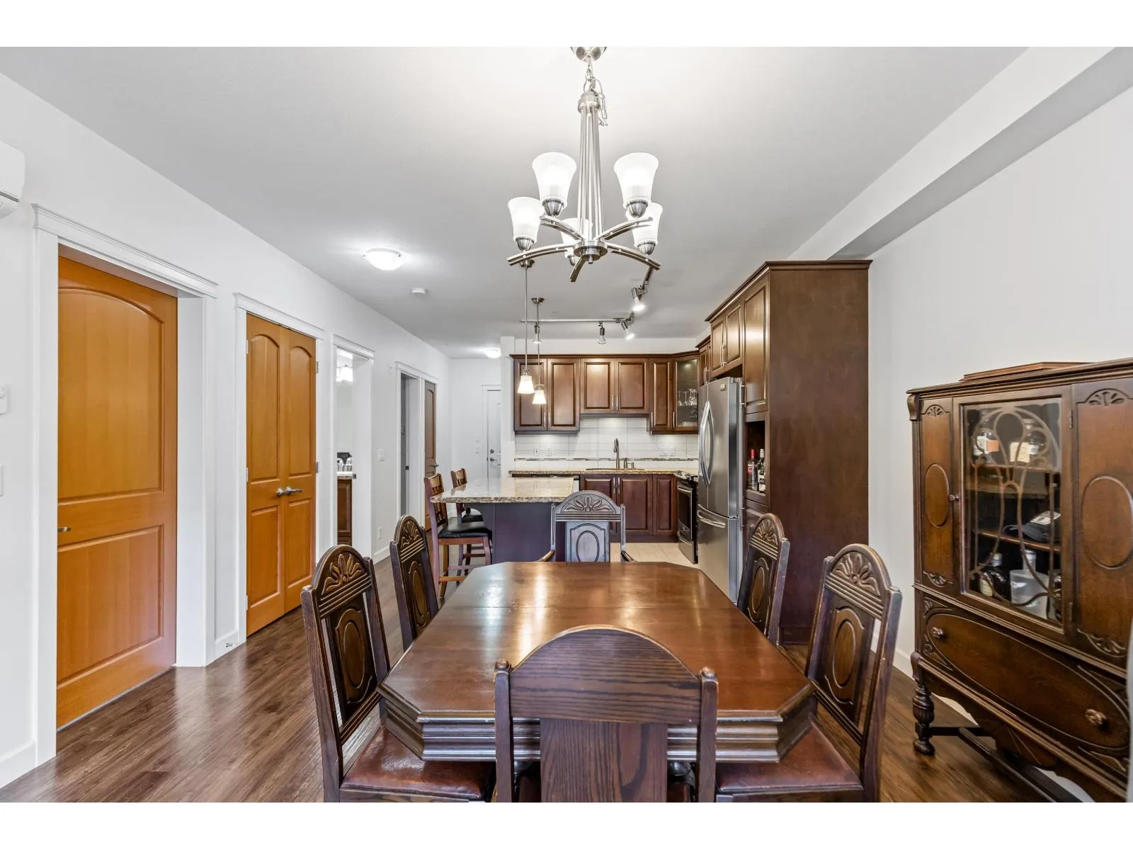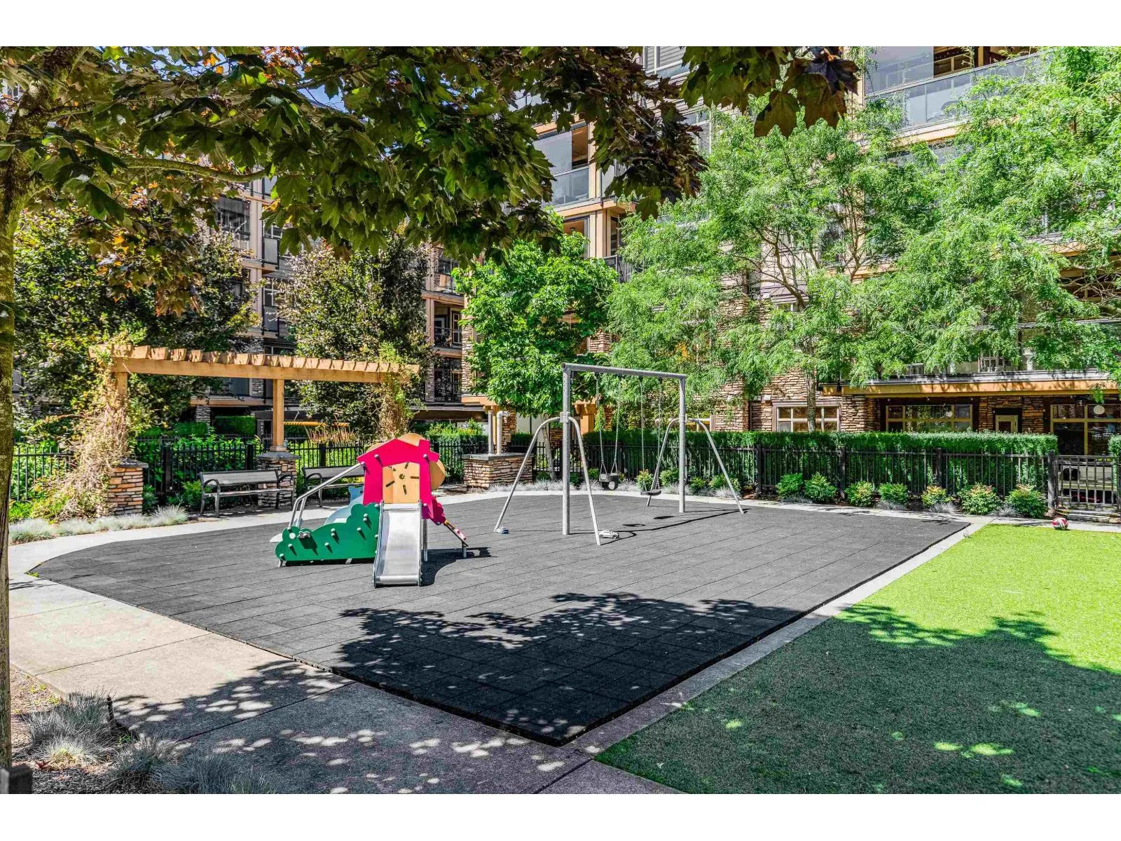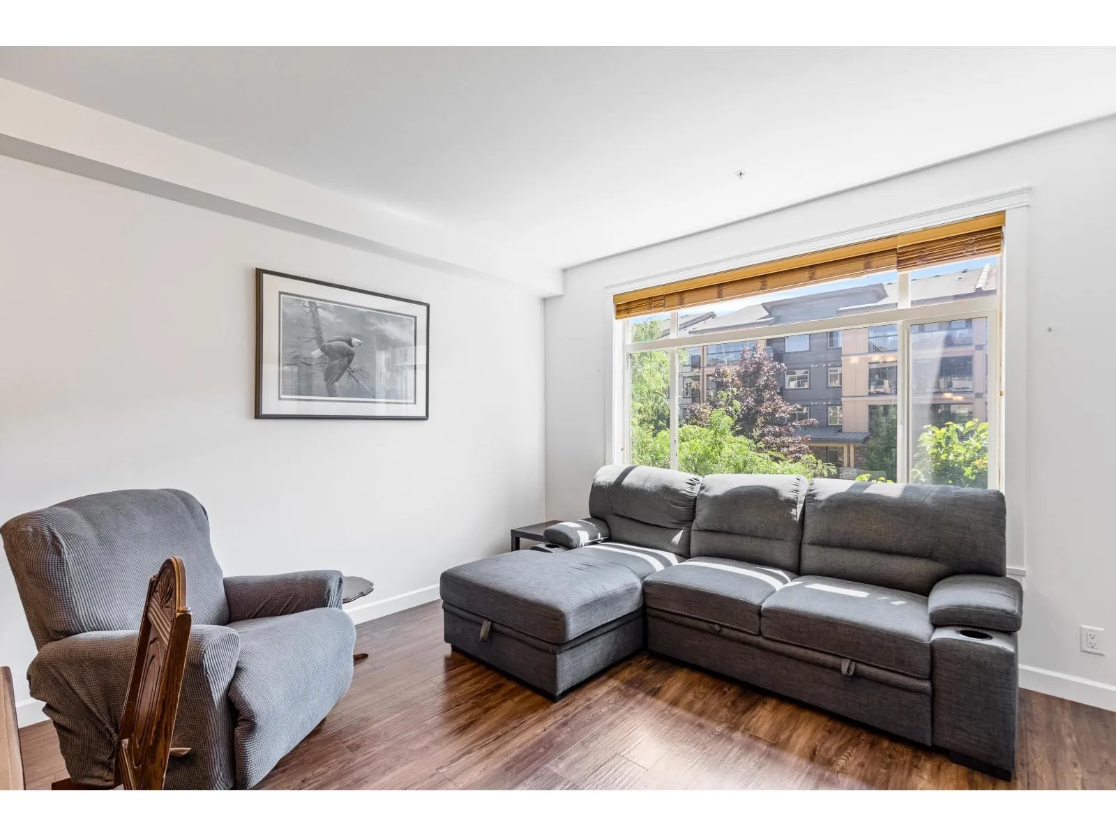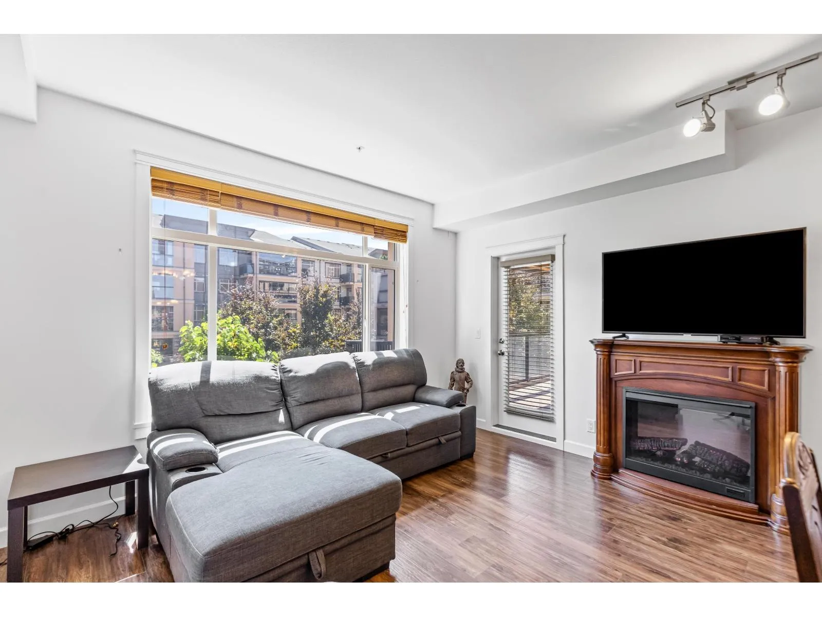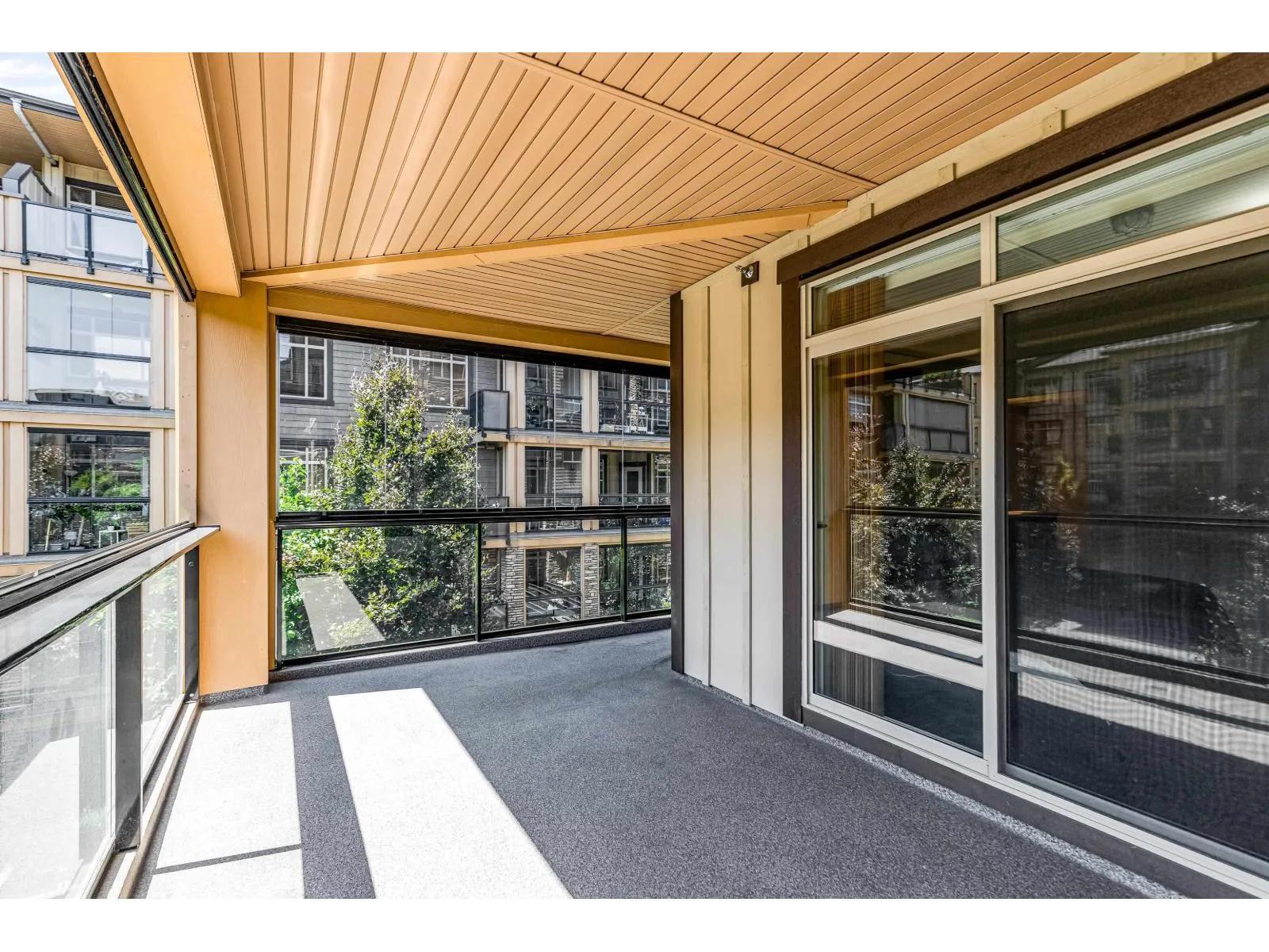 Stunning 2 bed, 2 bath + den (or 3rd bed) corner unit in sought after Walnut Ridge at Yorkson by Quadra Homes. This 1,035FT home features a spacious open layout w/ bedrooms on opposite sides of living for added privacy. Enjoy year round use of the 224FT covered, south facing, wrap around balcony, w/retractable glass, overlooking peaceful courtyard. Chef's kitchen boasts s/s appliances, granite countertops, quality cabinetry & large island. Primary suite inc/walk-in closet & spa like ensuite with large shower. Freshly painted with luxury touches like A/C, heated bathroom floors & anti-fog mirrors. Includes 2 parking stalls & oversized storage w/ electrical outlet & roll-up door. In the heart of Willoughby Heights close to schools, parks, transit, restaurants, shopping & Hwy1 access. (id:27476)