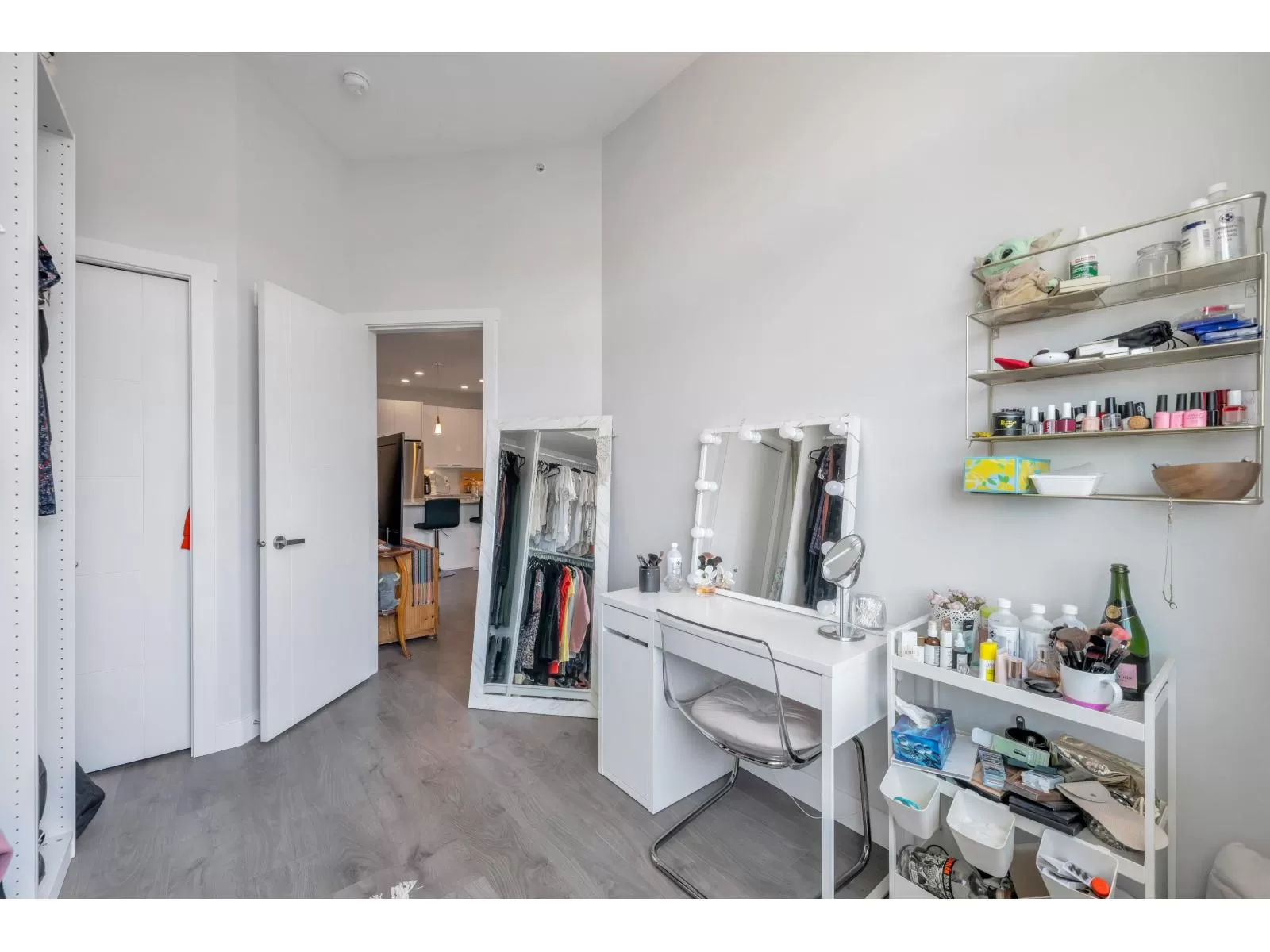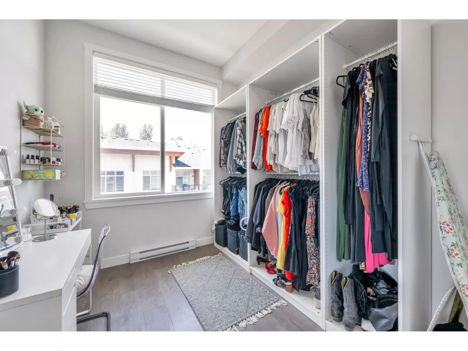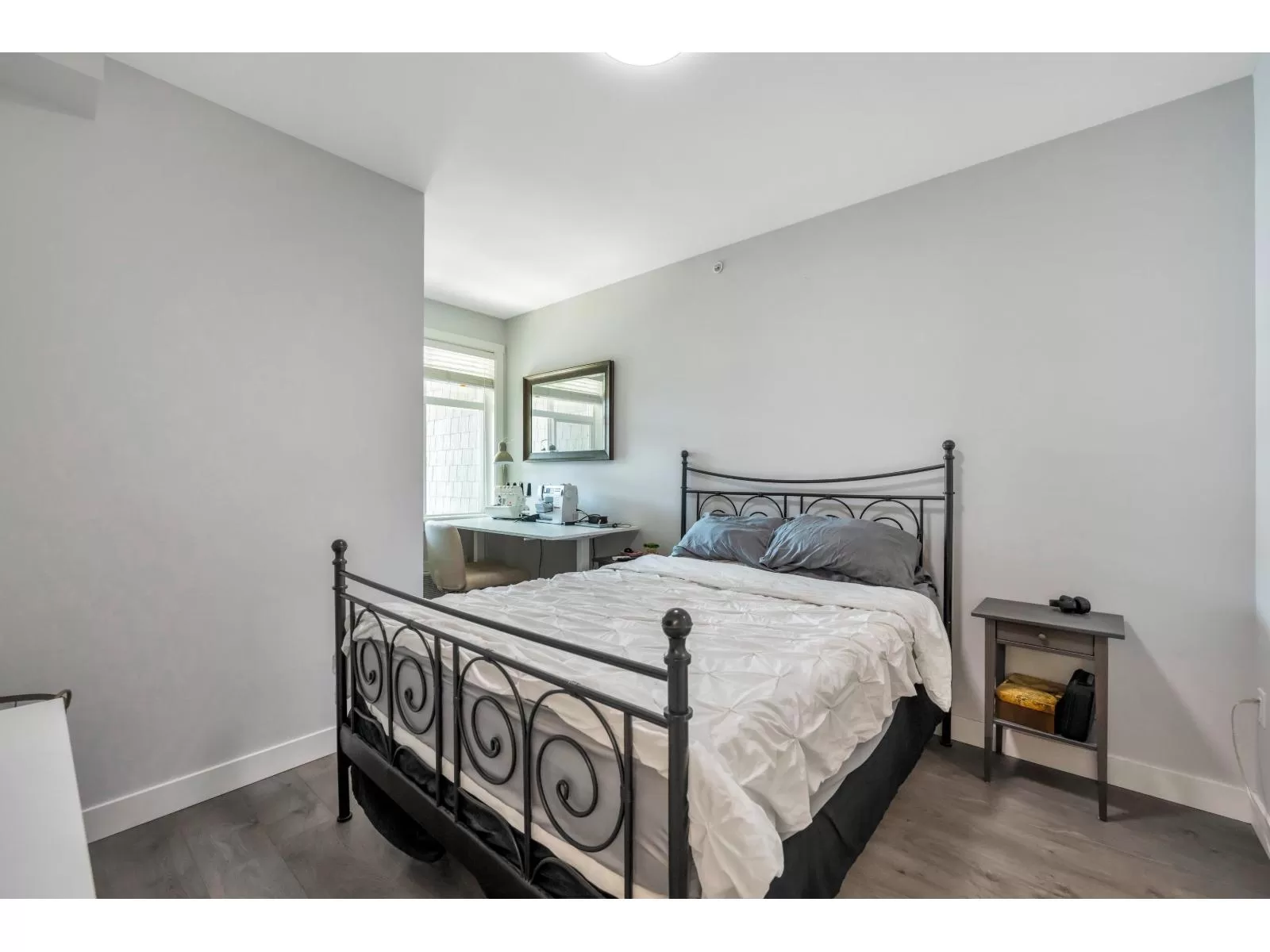 Brydon Green. Spacious 2 bedroom 2 bath top floor bright unit with oversized windows and 9' ceilings. Kitchen has Samsung S/S appliances incl microwave, European white lacquer cabinets, breakfast bar with granite countertops. Spacious primary bedroom with A/C. Ensuite has twin sinks & large walk-in shower. Large storage area and w/d. Centrally located and minutes away to schools, parks, Willowbrook Mall and transit plus future skytrain station, Great walking nature trails! The High quality laminate floors throughout. 2 pets allowed. 5 years remaining on building warranty. Low strata fees of $304.00. 1 parking (additional available). Top floor condo is vacant and ready for occupancy. (id:27476)