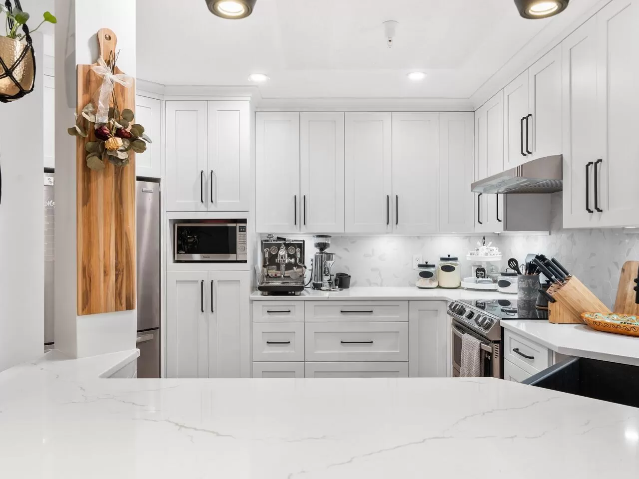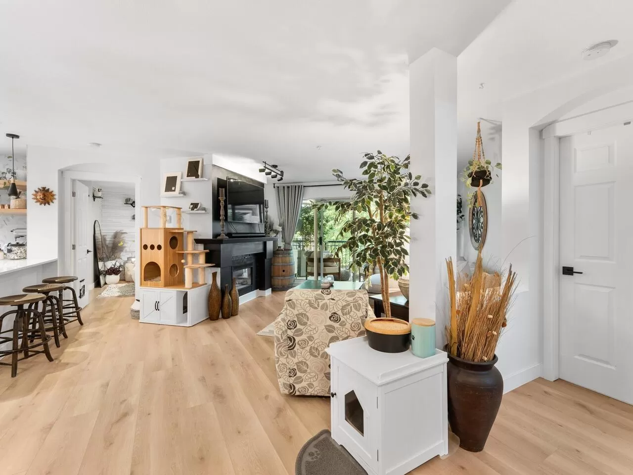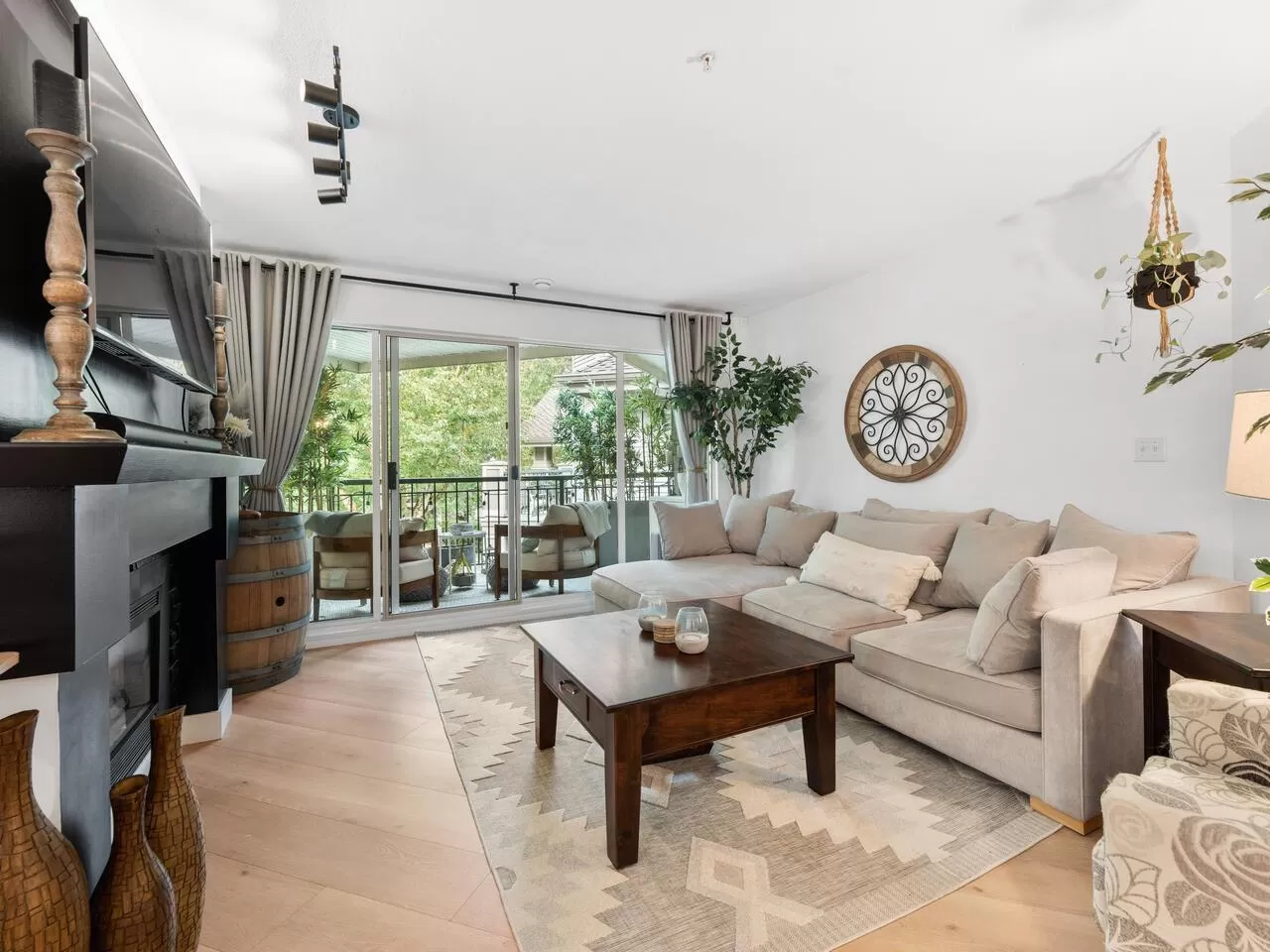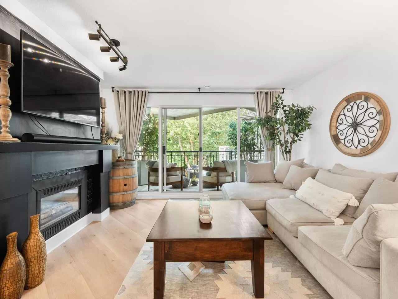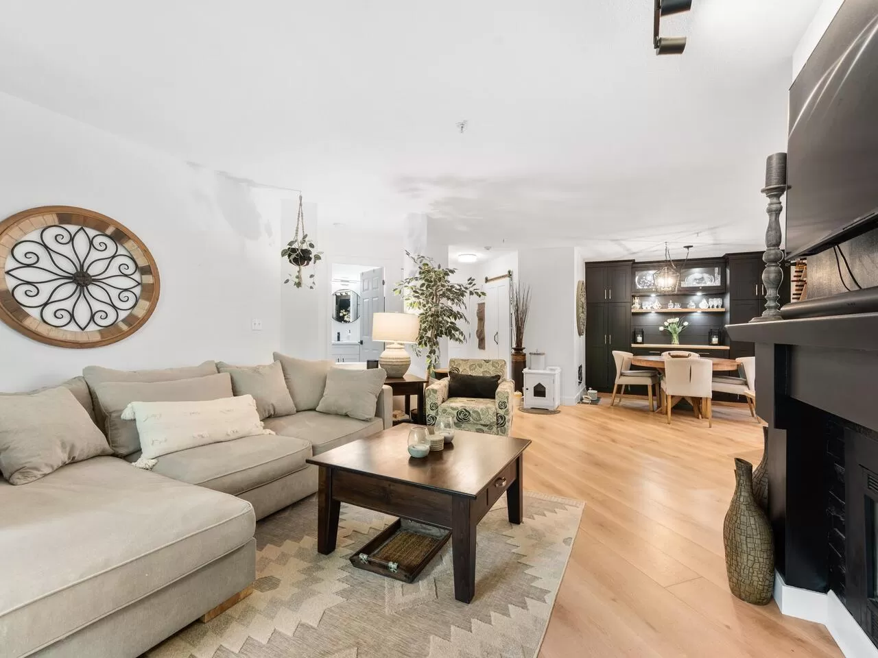 Absolutely gorgeous 1,151 sf, 2 bdrm, 2 bath extensively updated condo with high end renovations including gorgeous wide plank floors, tasteful décor, updated light fixtures, entertainment sized living rm with gas fireplace & door to patio, spacious dining rm with attractive built-ins, gorgeous updated kitchen w/white shaker style cabinets, SS appliances and quartz counters w/breakfast bar, 2 spacious bdrms & 2 extensively updated baths including primary bdrm w/wi closet & spectacular 4 pce ensuite. Fantastic floor plan with the 2 bdrms separated from each other by the living area provides the utmost in privacy. 2 parking stalls and storage locker are added value. Very spacious absolutely gorgeous updated condo with fantastic layout in prime Murrayville location absolutely must be seen. (id:27476)