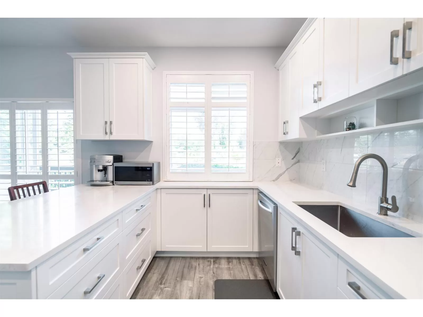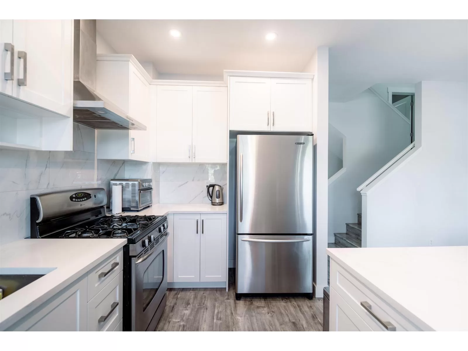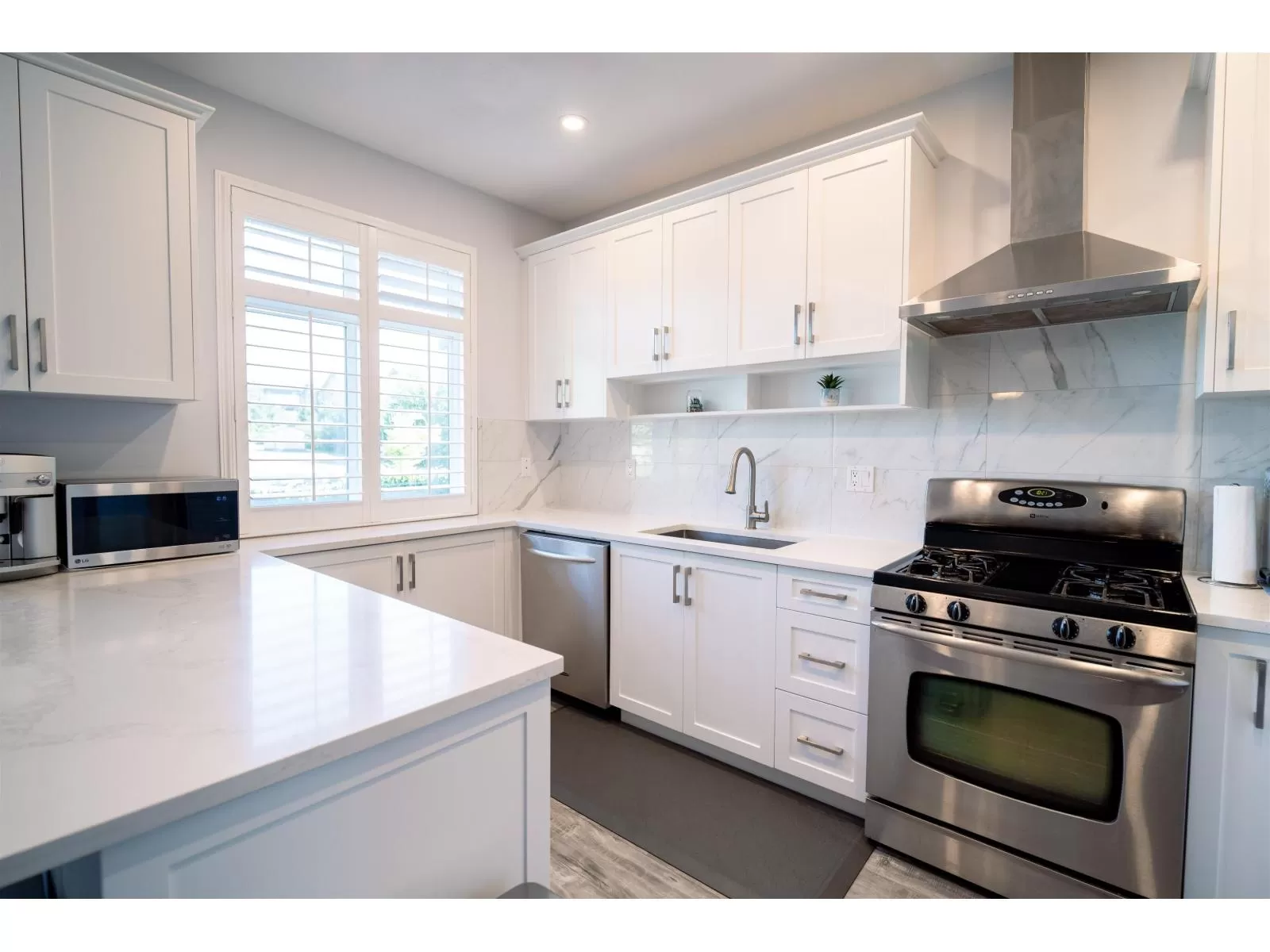 Renovated in 2022 with $50K, this 3-level end unit has 3 bedrooms and 3.5 baths. Updates include flooring, bathrooms, kitchen, hot water tank, and more. The main floor has 9' ceilings, a gas fireplace, and a bright kitchen with granite counters, island, stainless appliances, and gas stove that opens to a sunny deck. Upstairs has 3 bedrooms including a vaulted primary with walk-in and ensuite. Downstairs offers a big rec room with full bath and walkout patio. Complete with California shutters, side-by-side garage, and extra street parking. Close to shopping, schools, and freeway. (id:27476)