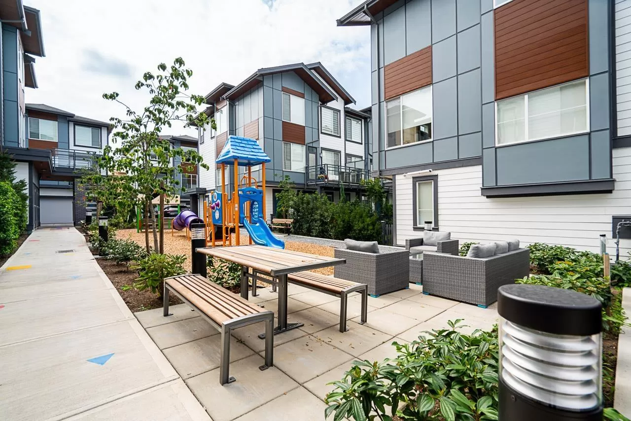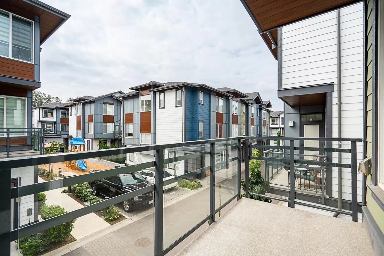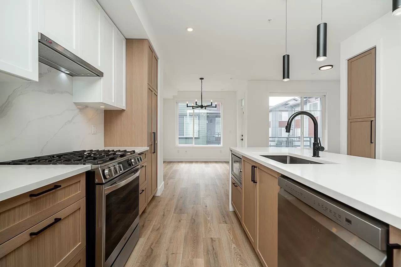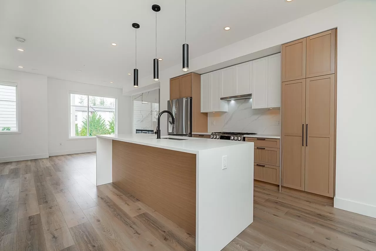 Welcome to Crofton! This 1,670 sq. ft. END-UNIT townhome offers 4 bedrooms and 4 bathrooms in one of the community's best locations-QUIET, BRIGHT, with excellent sightlines and set back from main roads. 9-foot ceiling on all levels and laminate flooring throughout. The chef's kitchen boasts a waterfall island, quartz counters, shaker cabinets and premium LG appliances-ideal for cooking and entertaining. Enjoy AIR CONDITIONING on all three levels, spa-inspired bathrooms, and a cozy fireplace. The double garage is EV-READY. The private, fenced, turfed yard provides plenty of space for family gatherings or relaxing outdoors. Walking distance to top schools, shopping, transit, and all the amenities Willoughby has to offer. Still under 2-5-10 year warranty and no GST; very low maintenance fee. (id:27476)