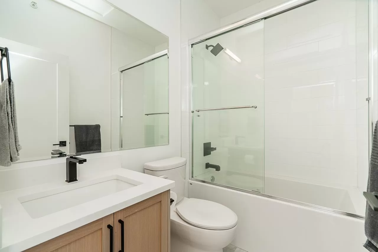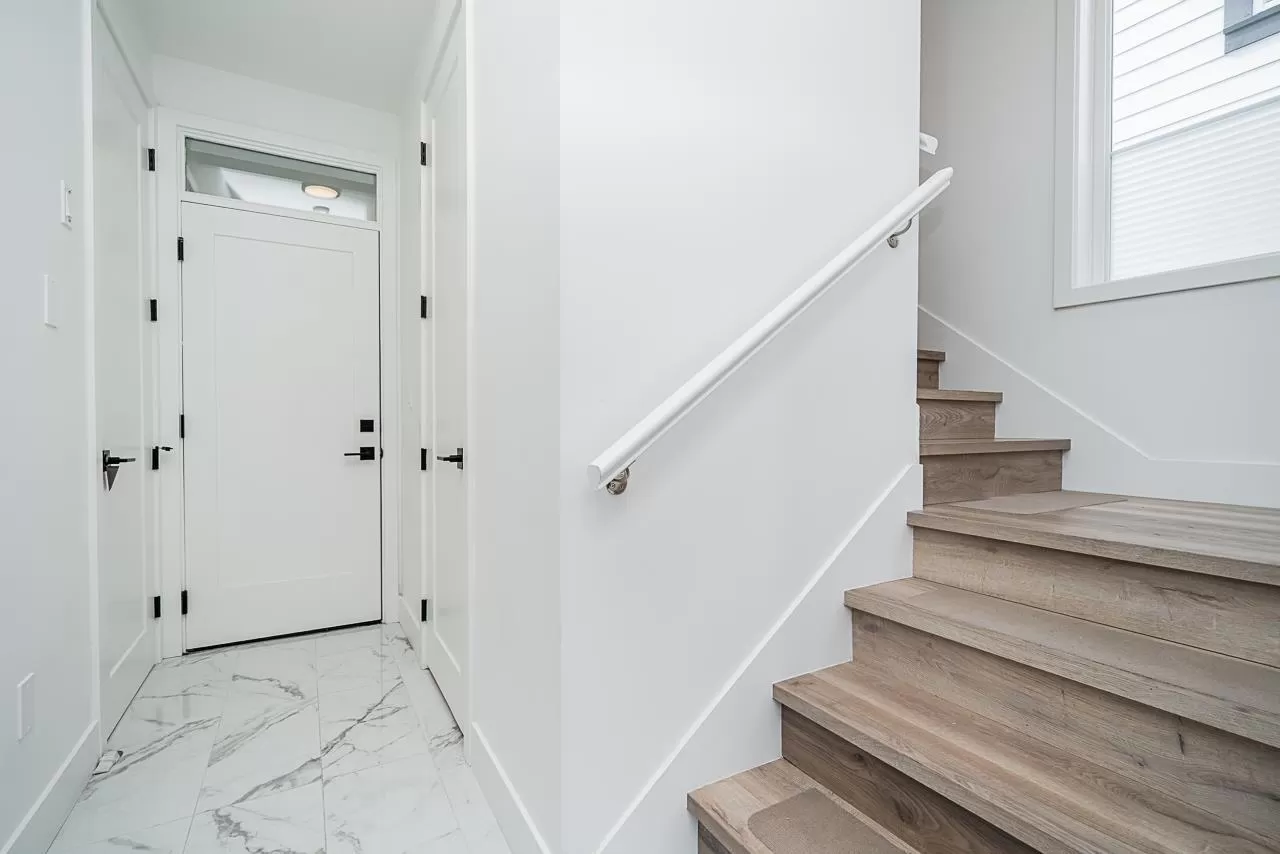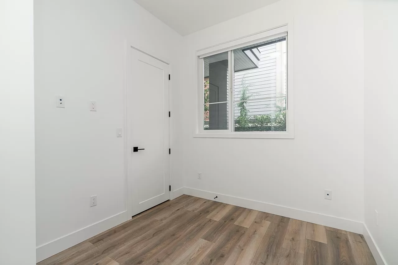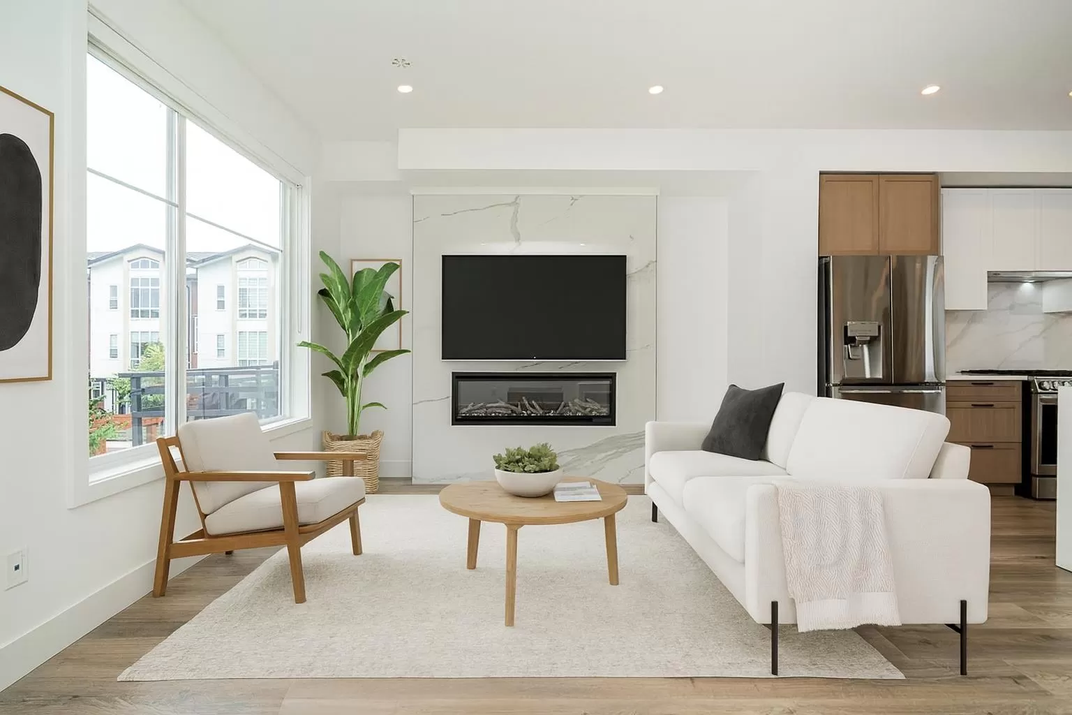 Welcome to Crofton! This 1,670 sq. ft. END-UNIT townhome offers 4 bedrooms and 4 bathrooms in one of the community's best locations-QUIET, BRIGHT, with excellent sightlines and set back from main roads. 9-foot ceiling on all levels and laminate flooring throughout. The chef's kitchen boasts a waterfall island, quartz counters, shaker cabinets and premium LG appliances-ideal for cooking and entertaining. Enjoy AIR CONDITIONING on all three levels, spa-inspired bathrooms, and a cozy fireplace. The double garage is EV-READY. The private, fenced, turfed yard provides plenty of space for family gatherings or relaxing outdoors. Walking distance to top schools, shopping, transit, and all the amenities Willoughby has to offer. Still under 2-5-10 year warranty and no GST; very low maintenance fee. (id:27476)