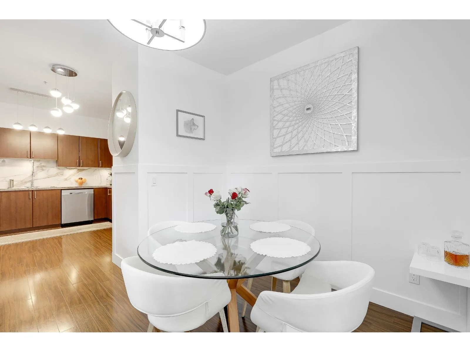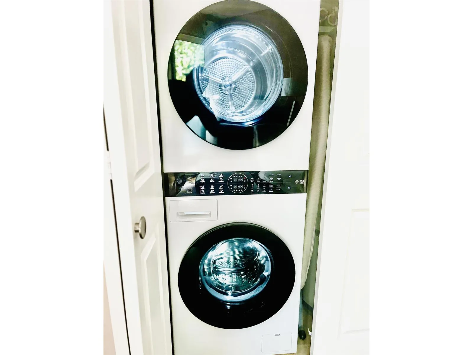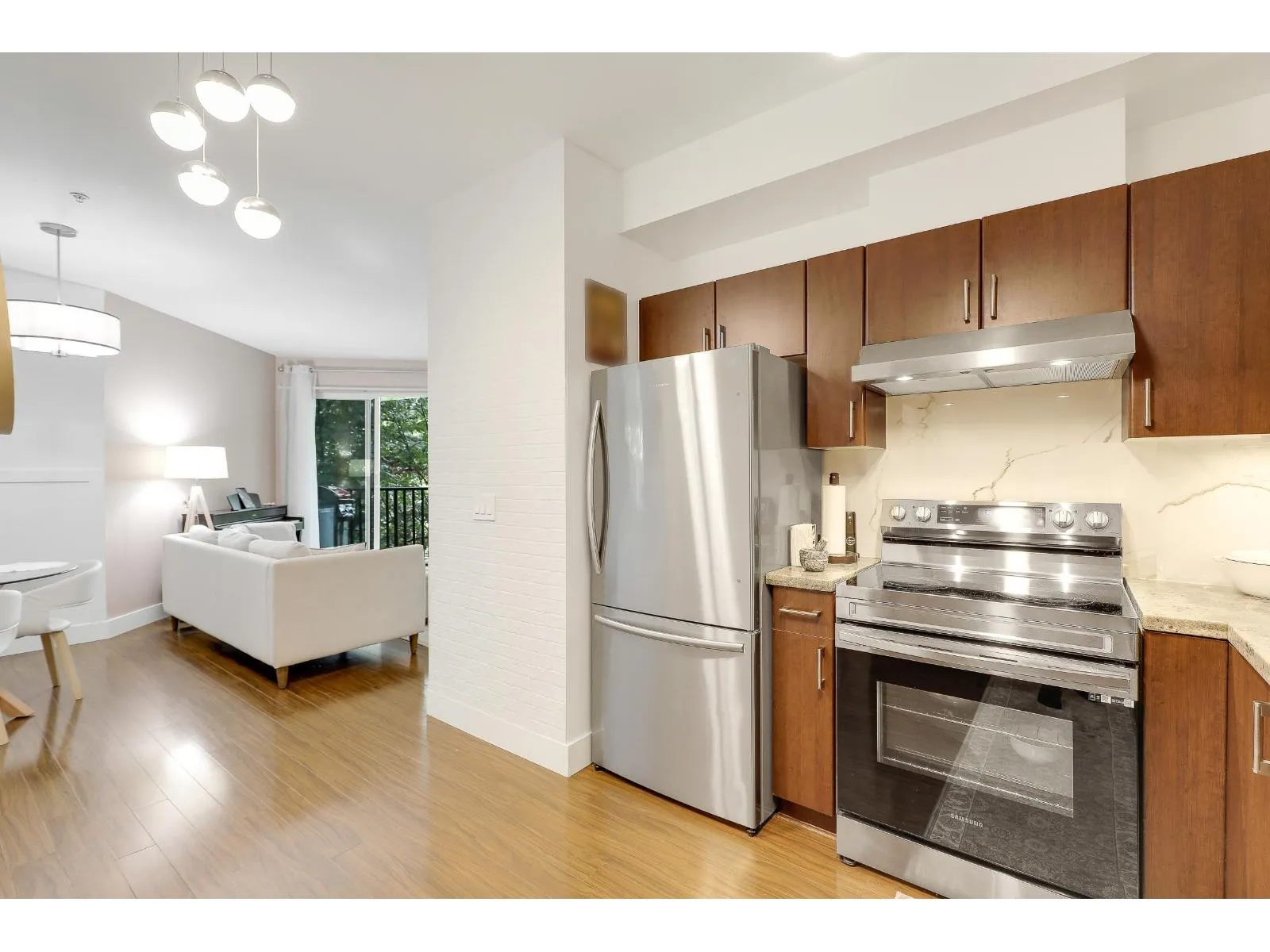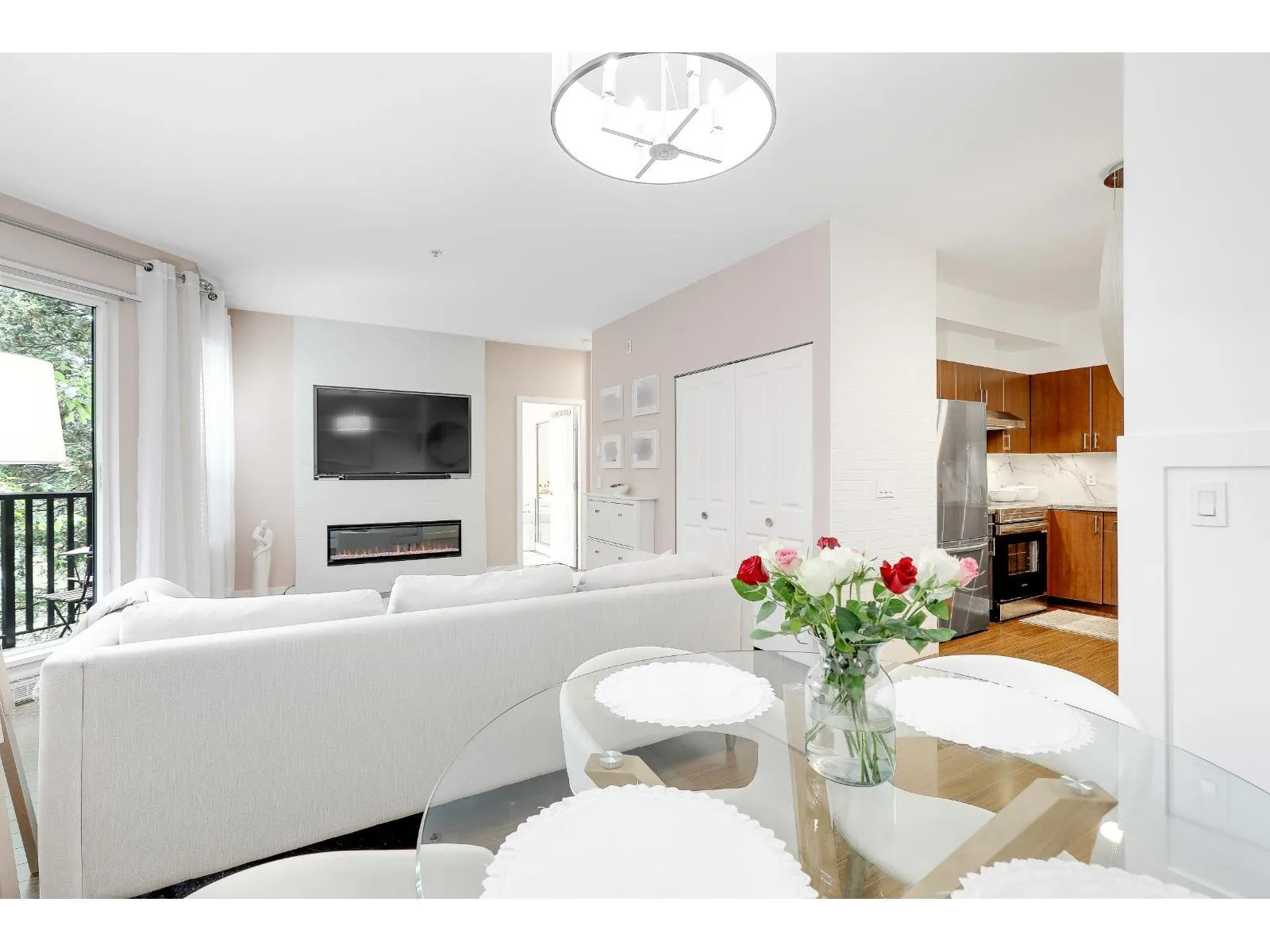 GREAT HOME, INCREDIBLE PRICE! Modern, contemporary one bedroom plus den that is used as a 2nd bdrm. 9' ceiling, open floor plan with a European flair, a gourmet kitchen and spa like bath with top of the line finishings. Beautiful LVG with accent wall, electric fireplace & TV, fresh paint, blinds and light fixtures. Dining with wainscoting, KITCHEN with new backsplash, granite countertops and brand new S/s appliances. Laminate flooring, & closet organizers. 'Mysa' smart thermostats in all rooms. New LG washer & dryer & so much more to list. South facing, situated beside a beautiful greenbelt, close to transit, restaurants & recreation center. Only 5 min away from 'Willowbrook Mall'. A must see! It will not last. Pets and rentals are welcomed. Don't look any further this is it! I will be waiting! (id:27476)
