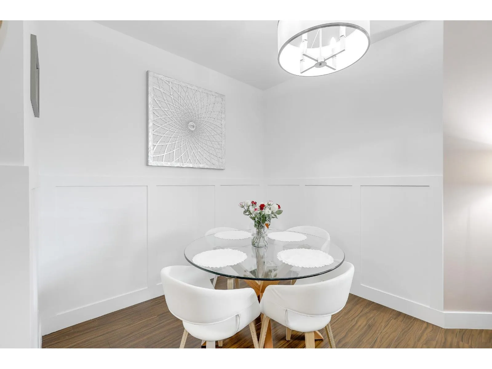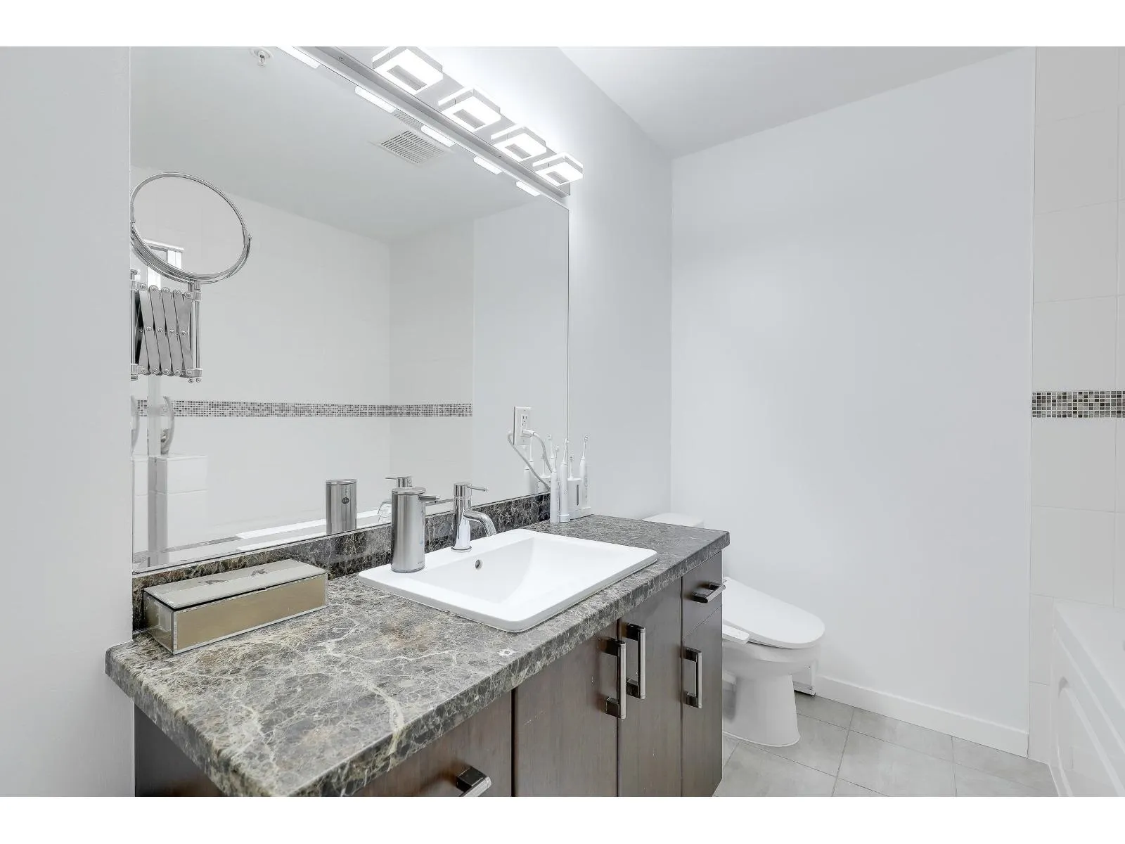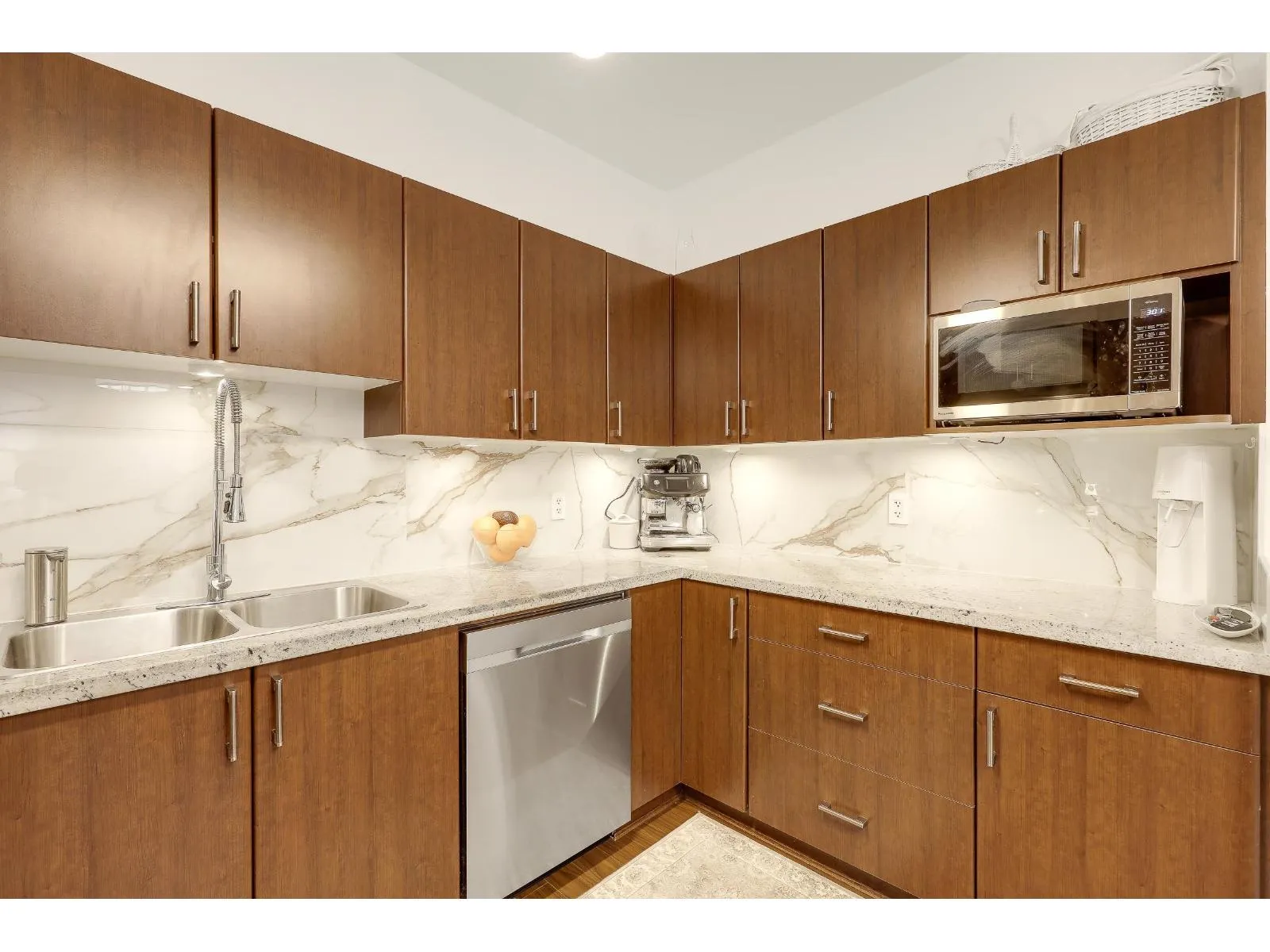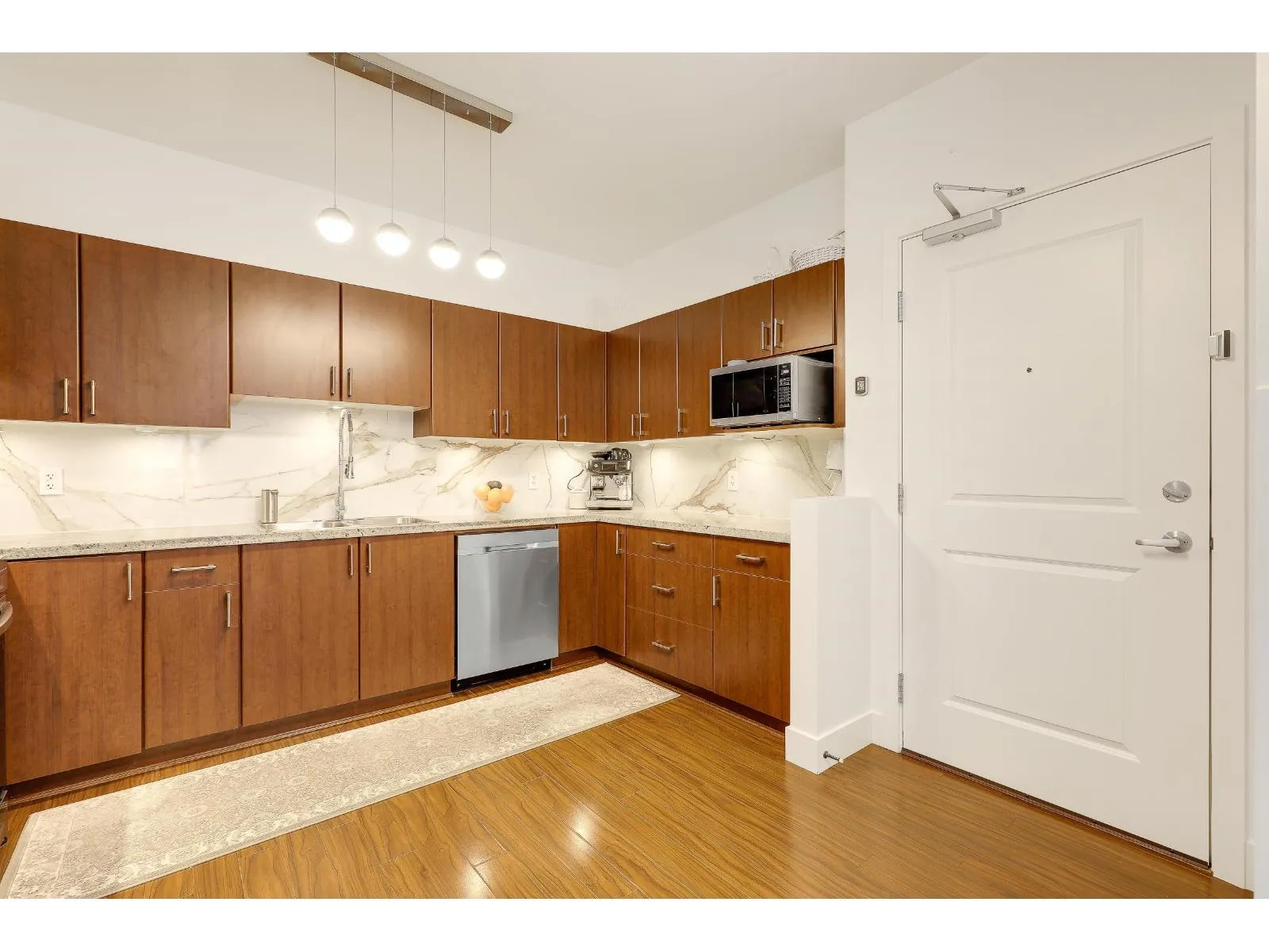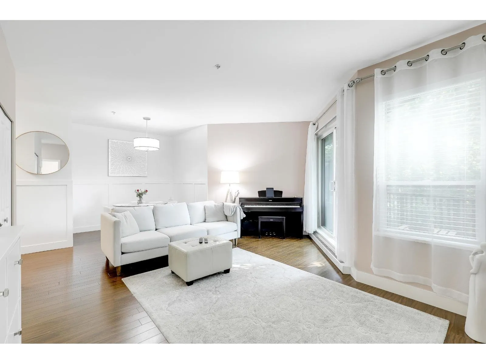 GREAT HOME, INCREDIBLE PRICE! Modern, contemporary one bedroom plus den that is used as a 2nd bdrm. 9' ceiling, open floor plan with a European flair, a gourmet kitchen and spa like bath with top of the line finishings. Beautiful LVG with accent wall, electric fireplace & TV, fresh paint, blinds and light fixtures. Dining with wainscoting, KITCHEN with new backsplash, granite countertops and brand new S/s appliances. Laminate flooring, & closet organizers. 'Mysa' smart thermostats in all rooms. New LG washer & dryer & so much more to list. South facing, situated beside a beautiful greenbelt, close to transit, restaurants & recreation center. Only 5 min away from 'Willowbrook Mall'. A must see! It will not last. Pets and rentals are welcomed. Don't look any further this is it! I will be waiting! (id:27476)