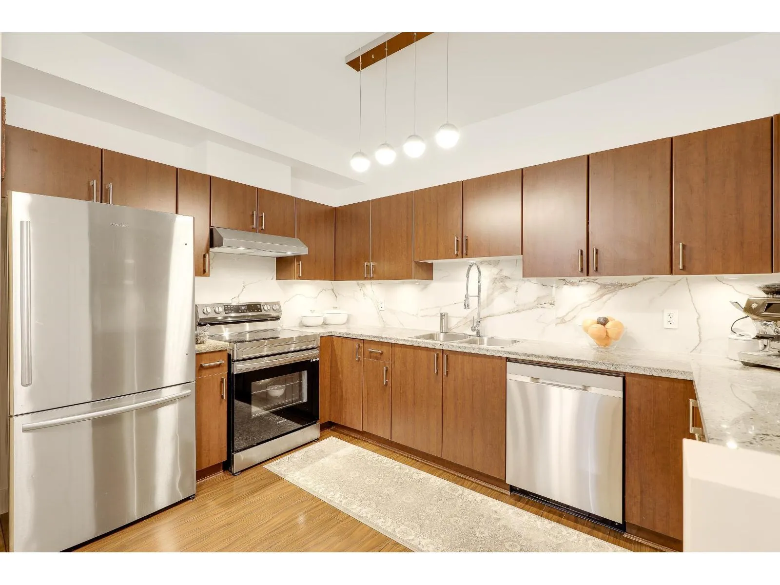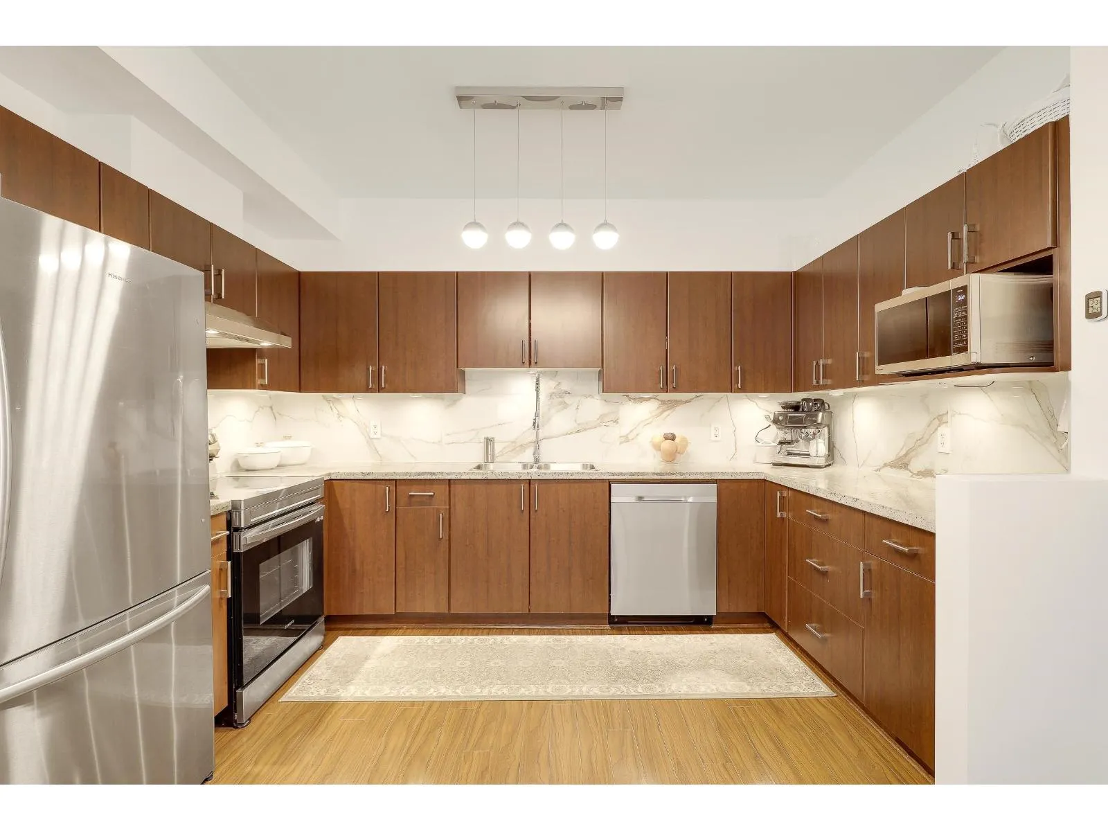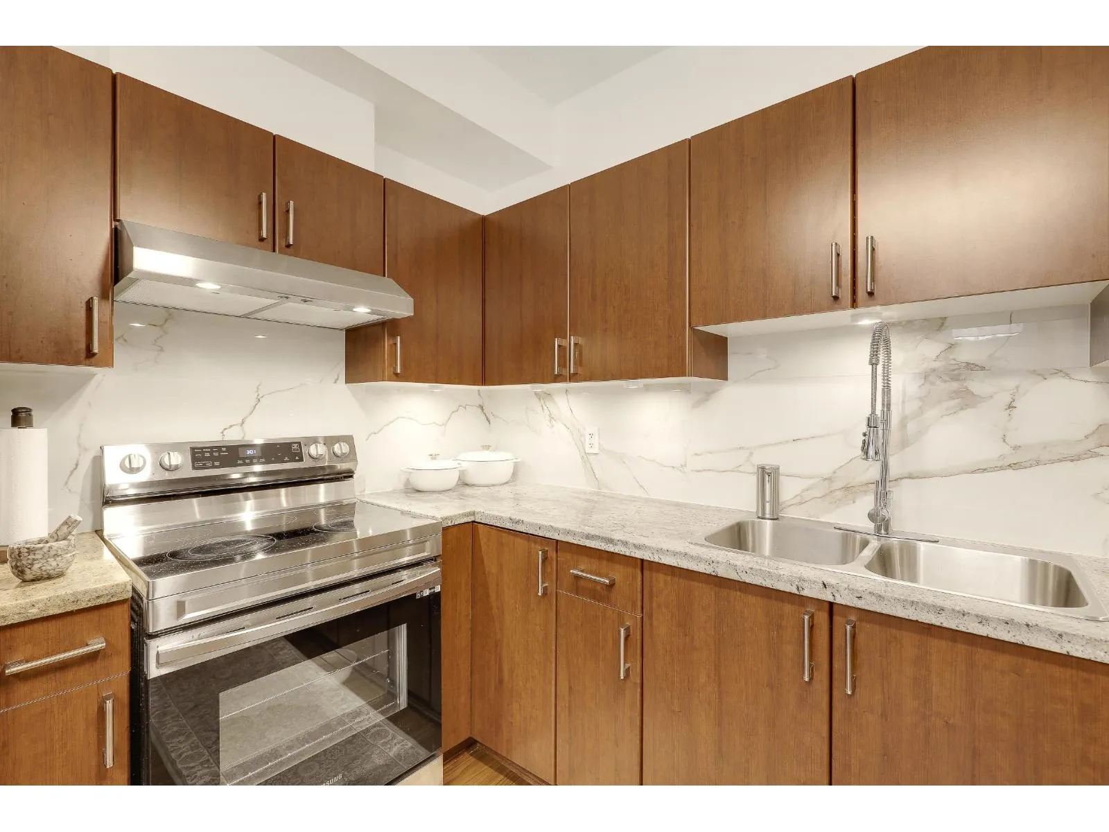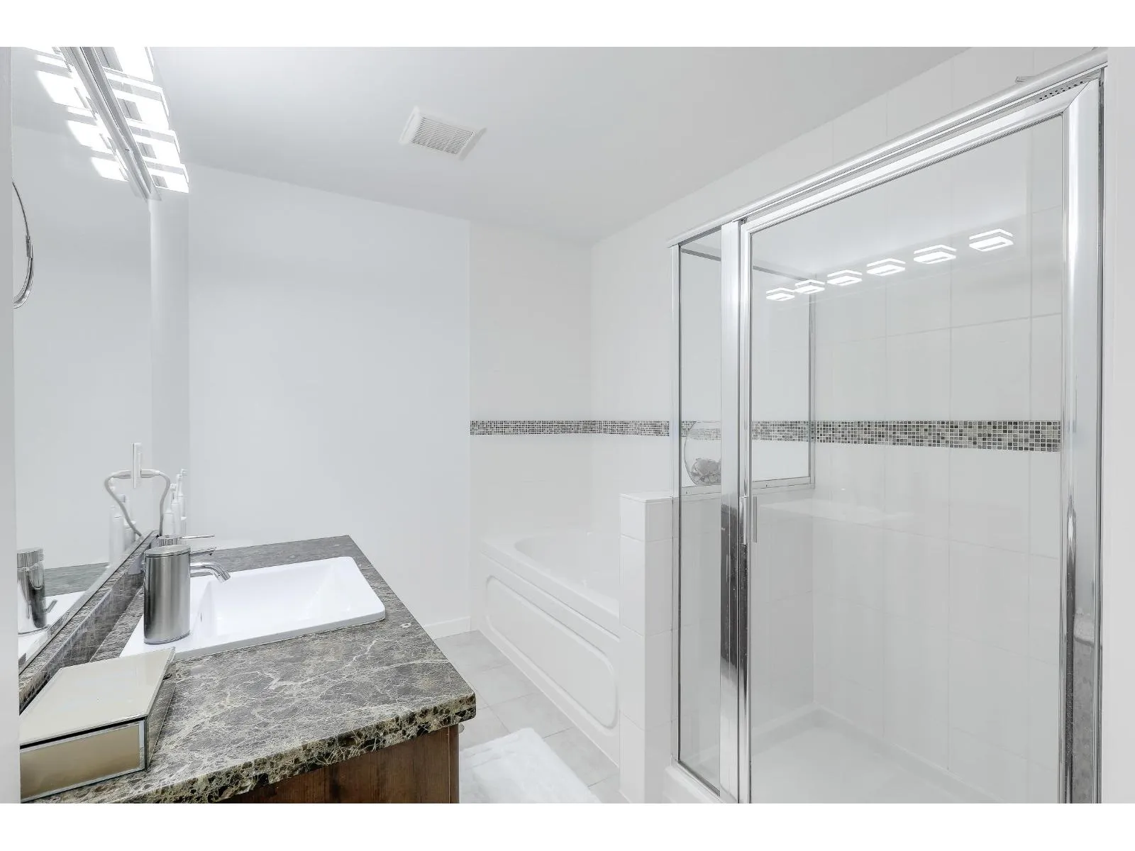 GREAT HOME, INCREDIBLE PRICE! Modern, contemporary one bedroom plus den that is used as a 2nd bdrm. 9' ceiling, open floor plan with a European flair, a gourmet kitchen and spa like bath with top of the line finishings. Beautiful LVG with accent wall, electric fireplace & TV, fresh paint, blinds and light fixtures. Dining with wainscoting, KITCHEN with new backsplash, granite countertops and brand new S/s appliances. Laminate flooring, & closet organizers. 'Mysa' smart thermostats in all rooms. New LG washer & dryer & so much more to list. South facing, situated beside a beautiful greenbelt, close to transit, restaurants & recreation center. Only 5 min away from 'Willowbrook Mall'. A must see! It will not last. Pets and rentals are welcomed. Don't look any further this is it! I will be waiting! (id:27476)