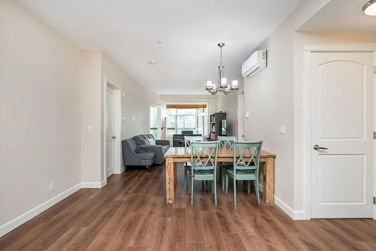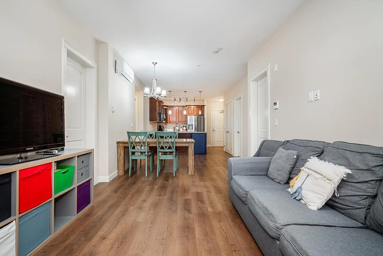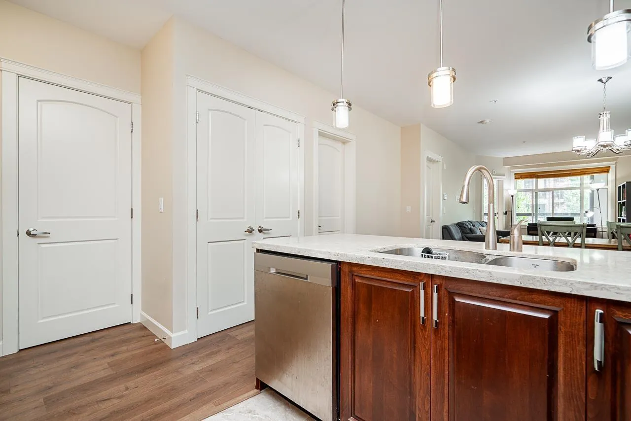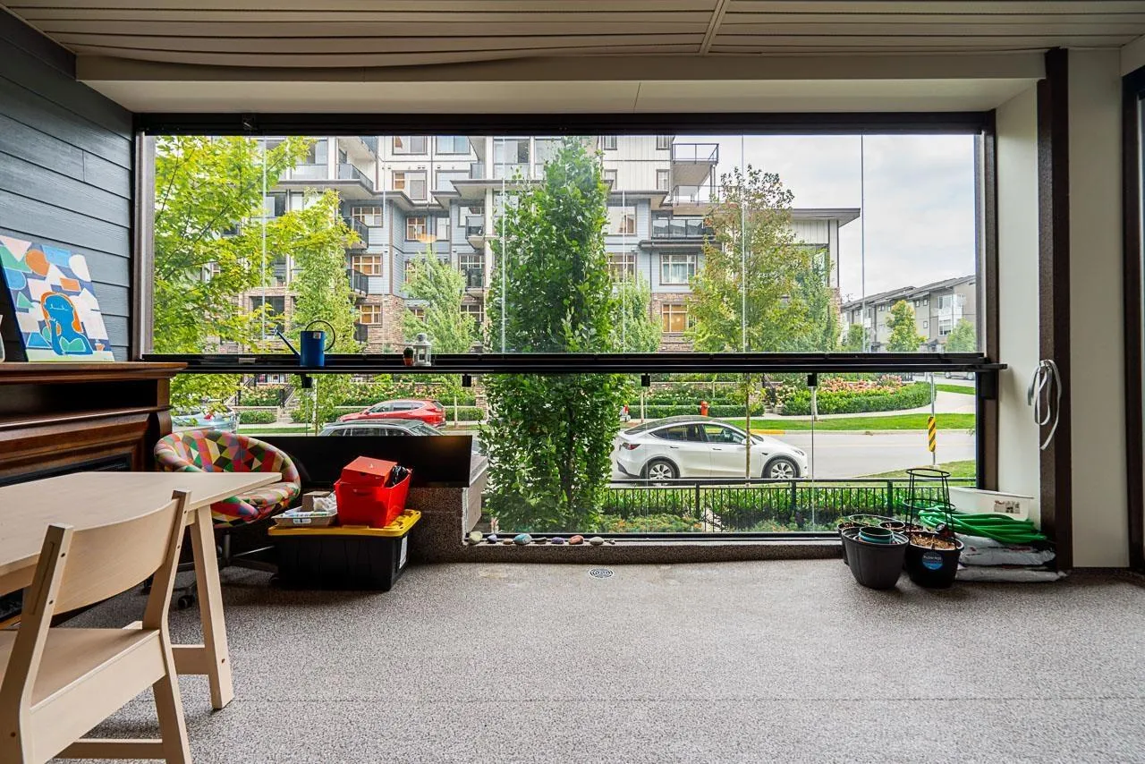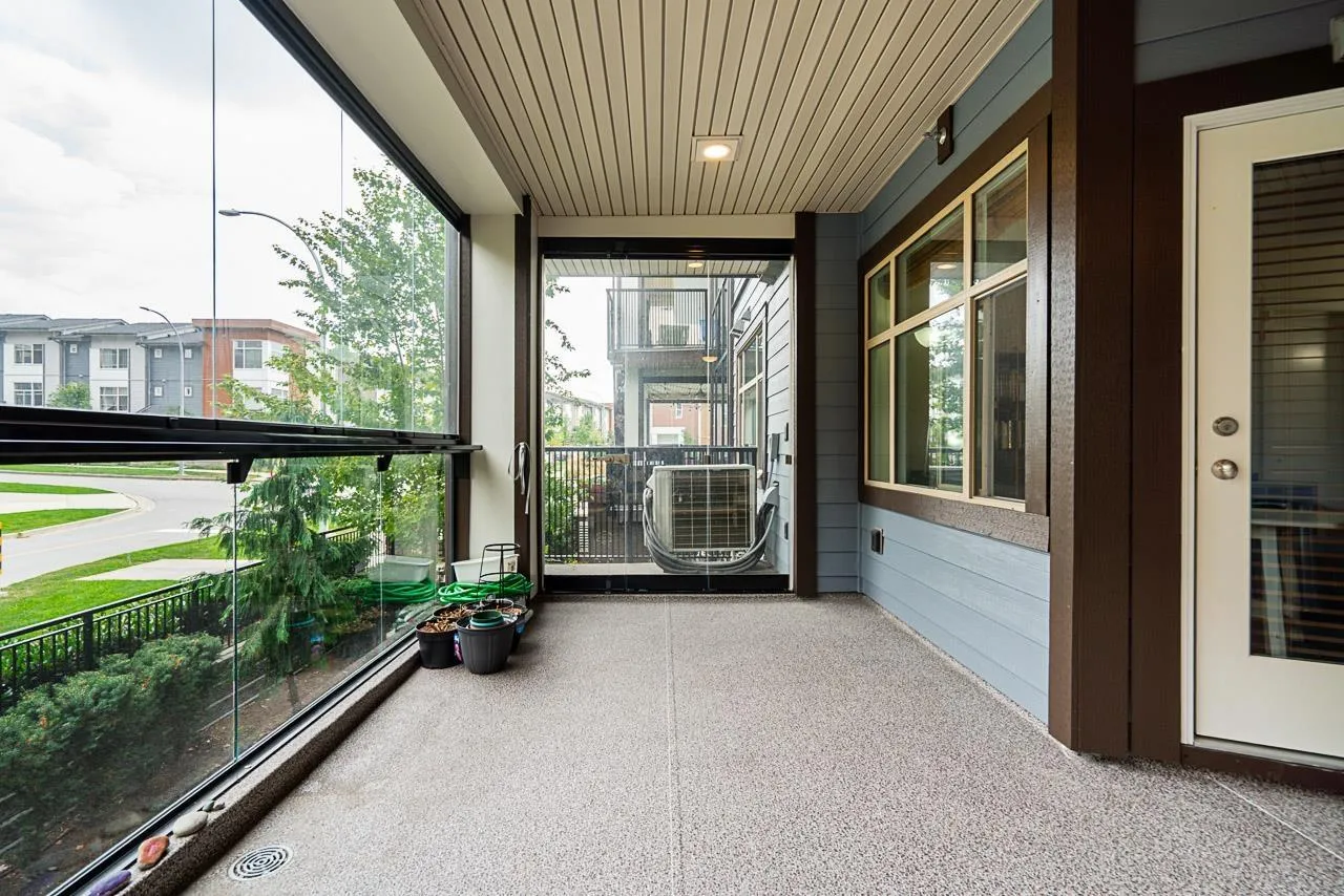 Yorkson Park - 2 Bed + 2 Bath + Den + Storage Unit. Functional layout with 2 large bedrooms across from each other- giving extra privacy, enclosed solarium with gas BBQ hook-up (gas included in strata fees), and 2 parking stalls with EV-capable rolling door storage by the parking space. Features include energy-efficient heat pump and A/C in every room, Samsung appliances, quartz countertops, heated bathroom floors with anti-fog mirrors, solid wood doors and closets, kitchen looking out to living area with ample cabinet space, European laminate flooring, Hybrid concrete and wood construction for quieter living. Convenient location across from Carvolth Park & Ride and beside the new 1.3-acre City Park. (id:27476)