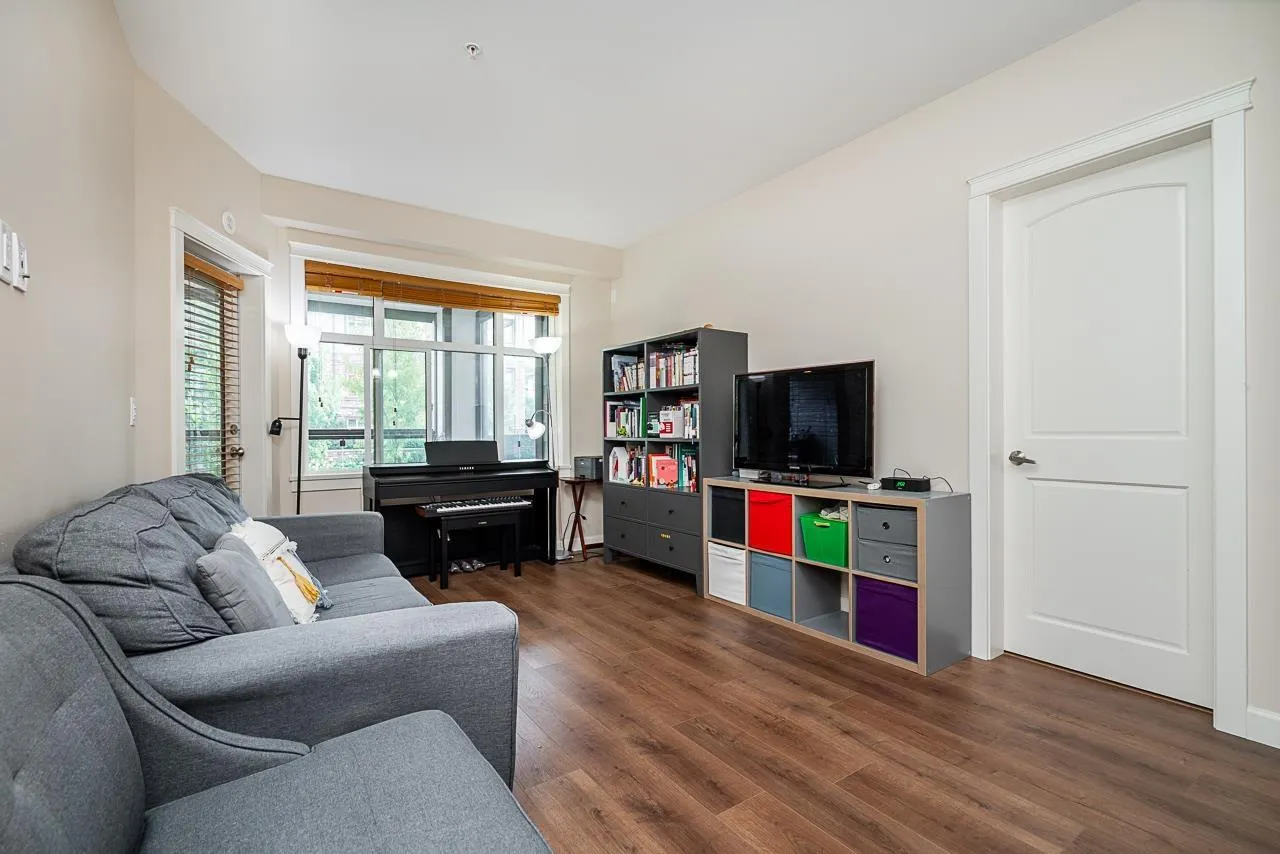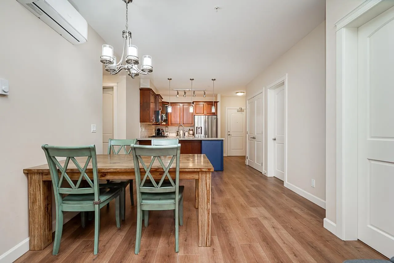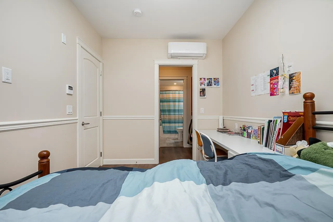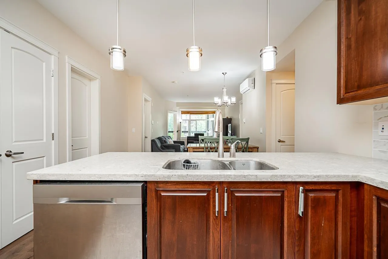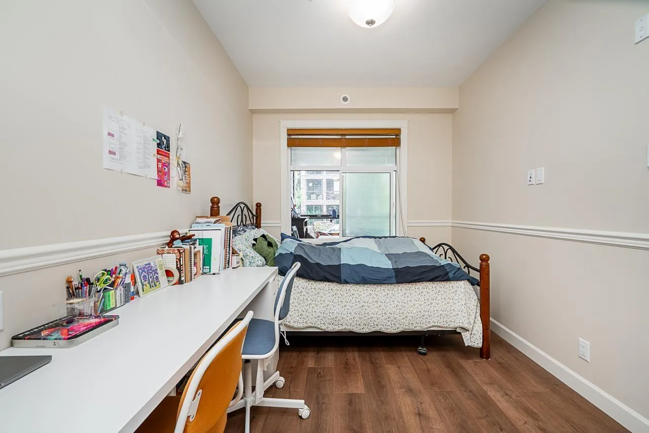Yorkson Park - 2 Bed + 2 Bath + Den + Storage Unit. Functional layout with 2 large bedrooms across from each other- giving extra privacy, enclosed solarium with gas BBQ hook-up (gas included in strata fees), and 2 parking stalls with EV-capable rolling door storage by the parking space. Features include energy-efficient heat pump and A/C in every room, Samsung appliances, quartz countertops, heated bathroom floors with anti-fog mirrors, solid wood doors and closets, kitchen looking out to living area with ample cabinet space, European laminate flooring, Hybrid concrete and wood construction for quieter living. Convenient location across from Carvolth Park & Ride and beside the new 1.3-acre City Park. (id:27476)