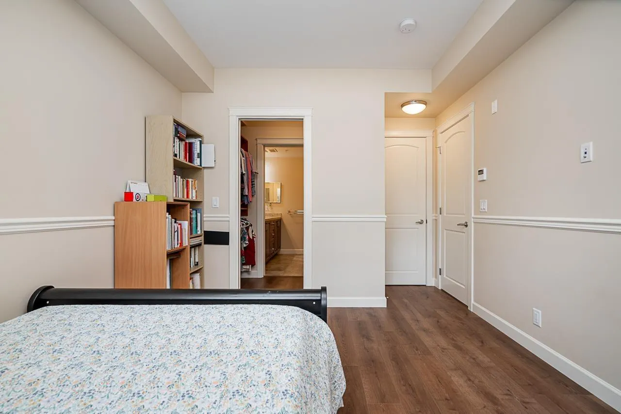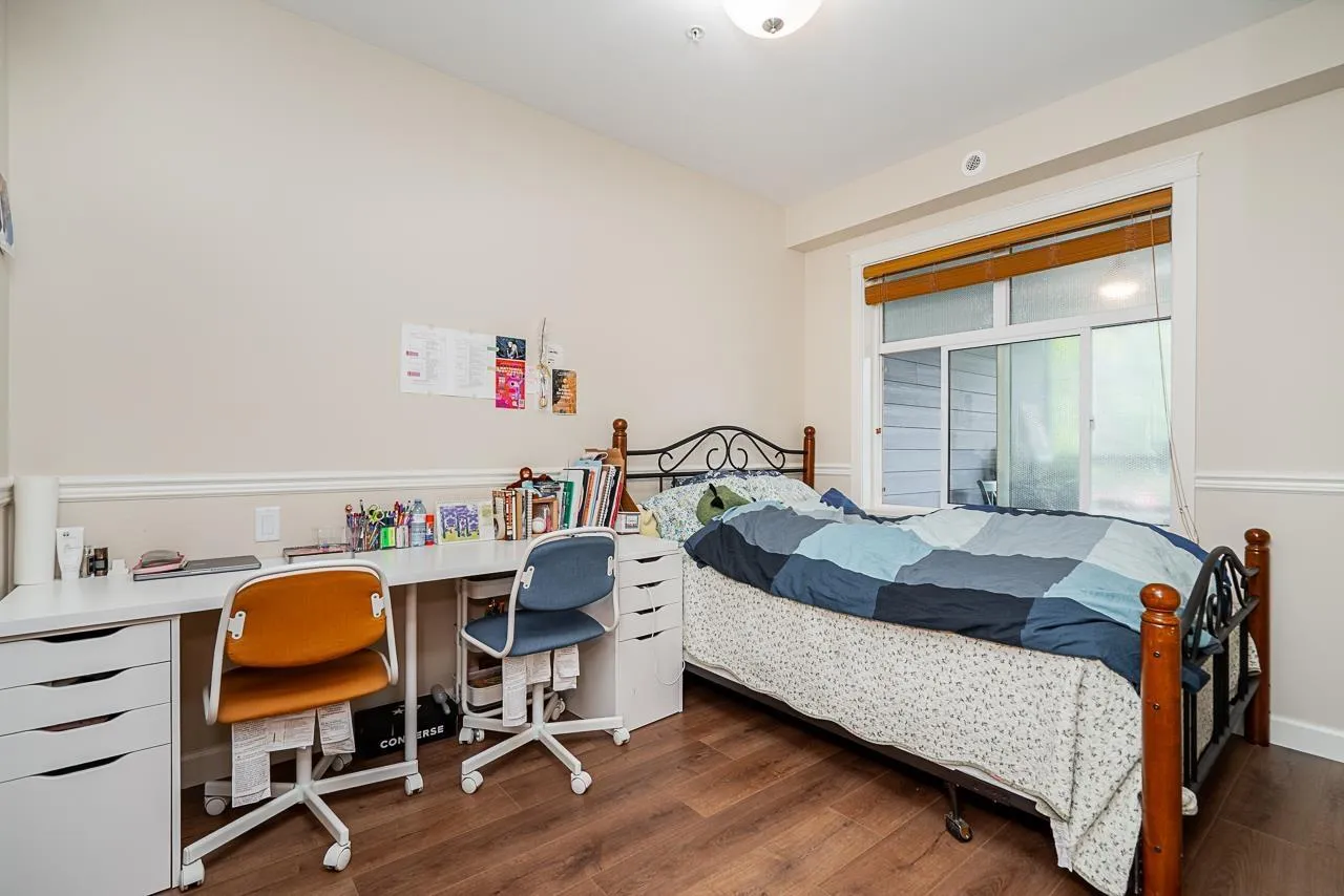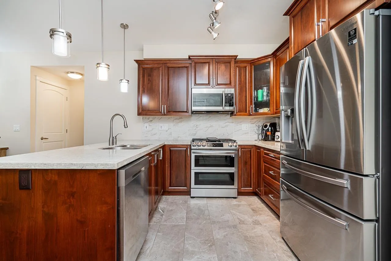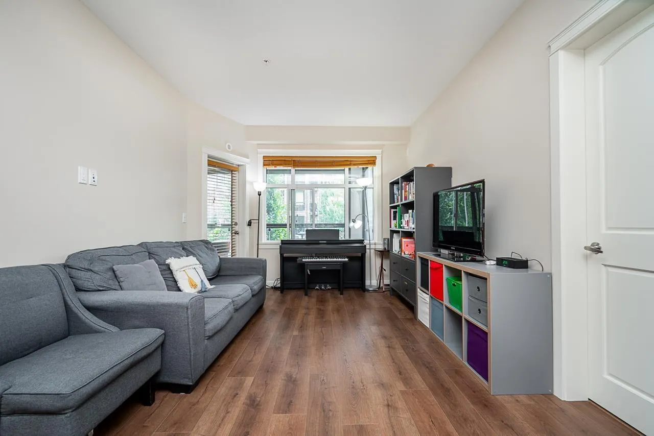 Yorkson Park - 2 Bed + 2 Bath + Den + Storage Unit. Functional layout with 2 large bedrooms across from each other- giving extra privacy, enclosed solarium with gas BBQ hook-up (gas included in strata fees), and 2 parking stalls with EV-capable rolling door storage by the parking space. Features include energy-efficient heat pump and A/C in every room, Samsung appliances, quartz countertops, heated bathroom floors with anti-fog mirrors, solid wood doors and closets, kitchen looking out to living area with ample cabinet space, European laminate flooring, Hybrid concrete and wood construction for quieter living. Convenient location across from Carvolth Park & Ride and beside the new 1.3-acre City Park. (id:27476)