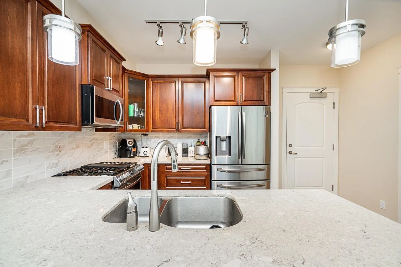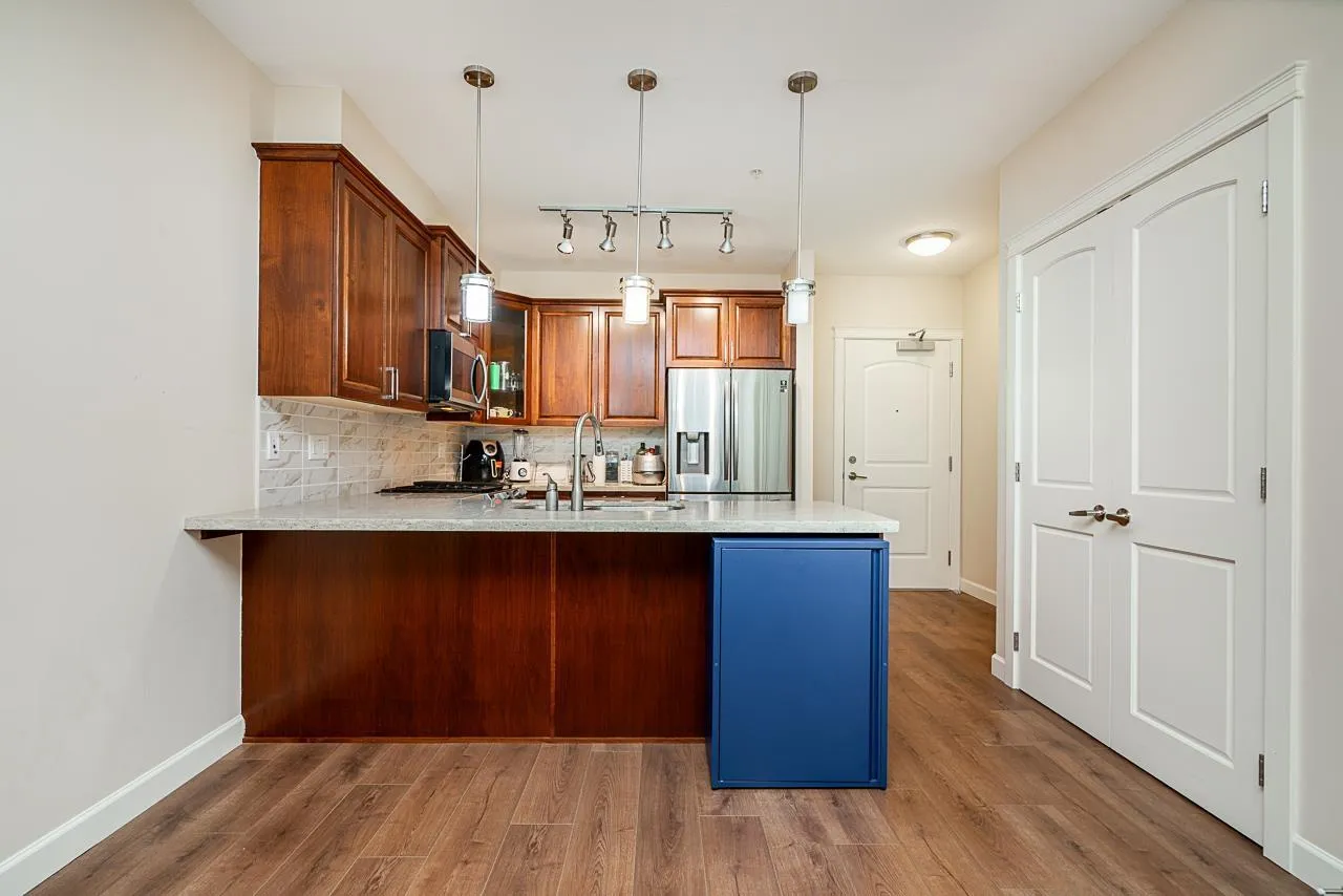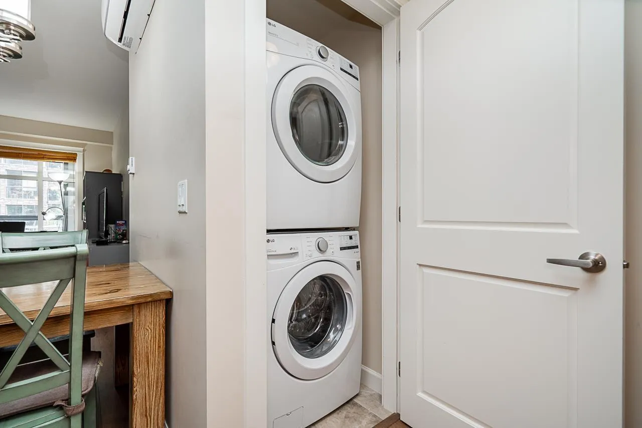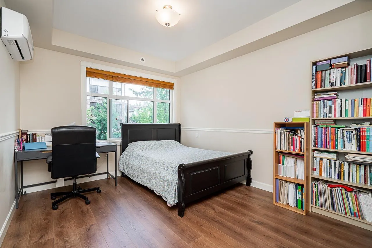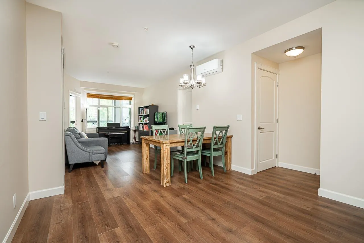 Yorkson Park - 2 Bed + 2 Bath + Den + Storage Unit. Functional layout with 2 large bedrooms across from each other- giving extra privacy, enclosed solarium with gas BBQ hook-up (gas included in strata fees), and 2 parking stalls with EV-capable rolling door storage by the parking space. Features include energy-efficient heat pump and A/C in every room, Samsung appliances, quartz countertops, heated bathroom floors with anti-fog mirrors, solid wood doors and closets, kitchen looking out to living area with ample cabinet space, European laminate flooring, Hybrid concrete and wood construction for quieter living. Convenient location across from Carvolth Park & Ride and beside the new 1.3-acre City Park. (id:27476)