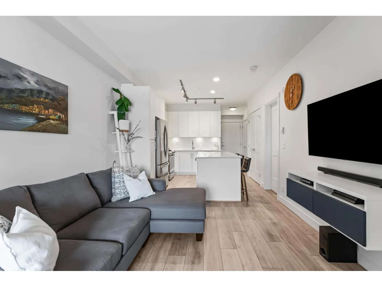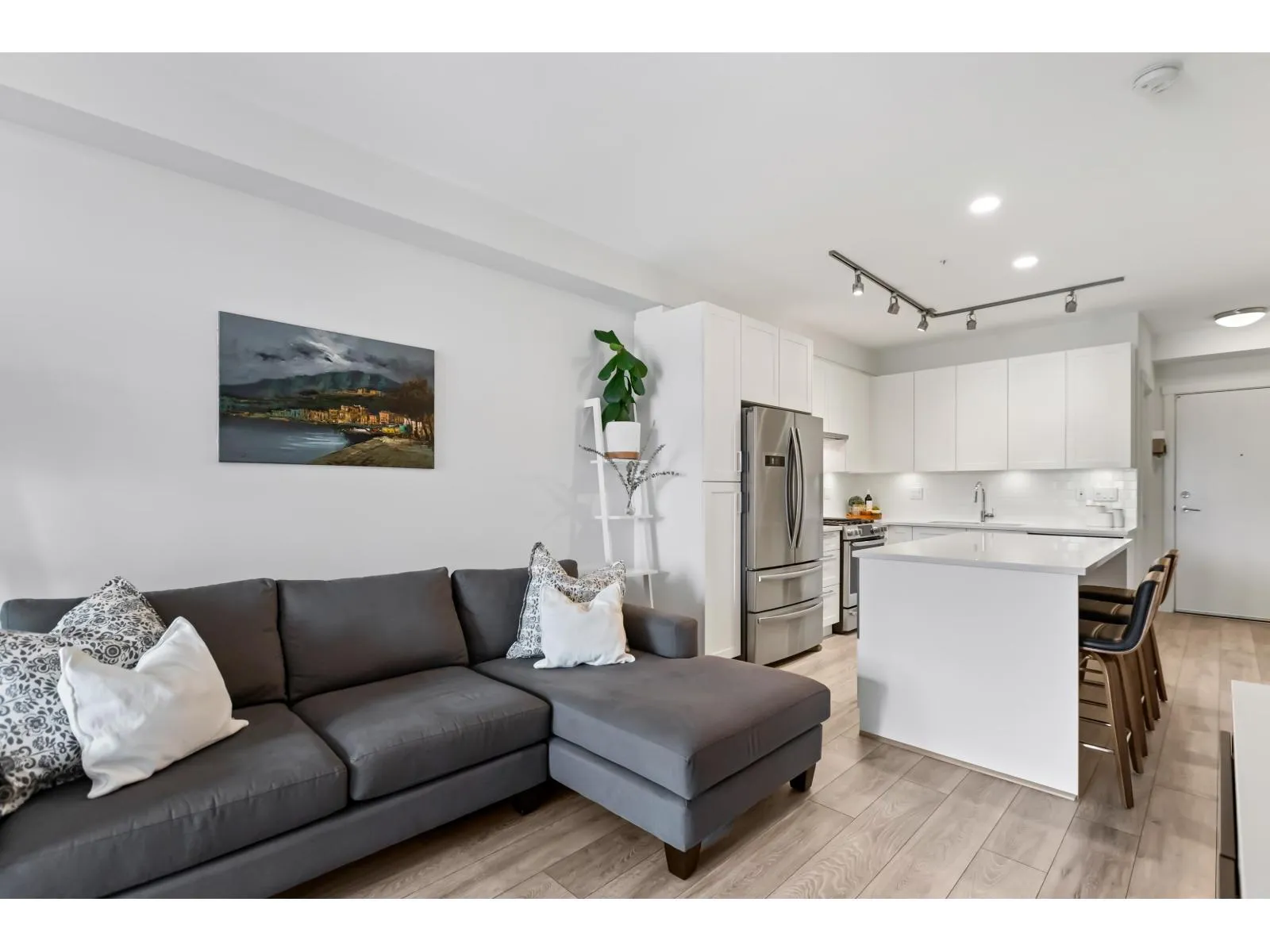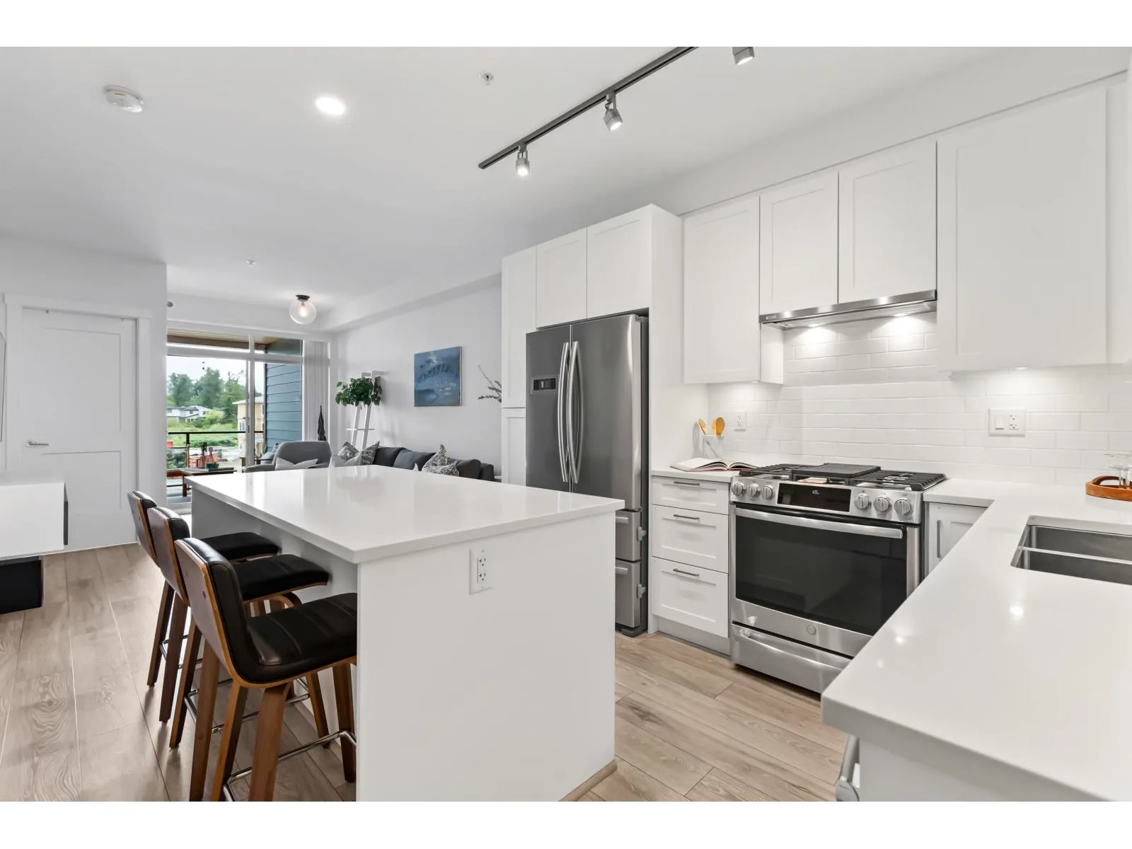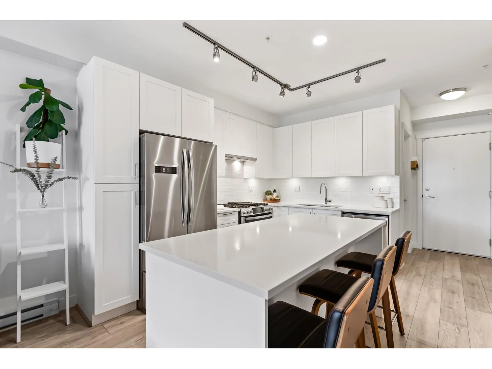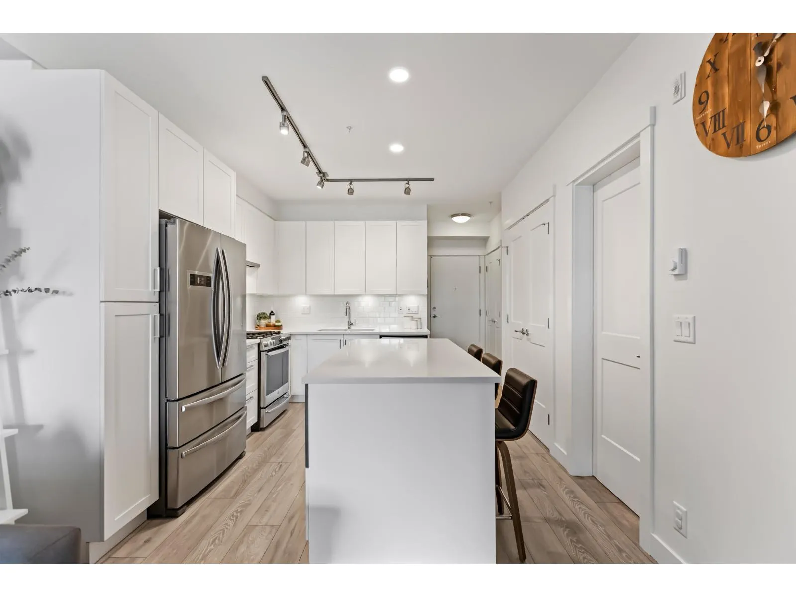 Bright, stylish, and in the heart of Willoughby Town Centre, this 2 bed, 2 bath condo at Grayson checks all the boxes. It's been incredibly well cared for and shows like new. Smart layout with two true bedrooms, sunny south-facing views, and wide plank flooring. The kitchen has a gas stove, stainless appliances, and a big eat-up bar, perfect for hosting. The primary suite features a walk-in closet and sleek en suite with double sinks and heated floors. The second bedroom has a window and works great as a kid's room, office, or guest space. Large covered deck, gym, playground, and social lounge with BBQ and fire pit seating. Includes two parking stalls and a roll-up storage locker. Steps to parks, schools, and shopping. (id:27476)