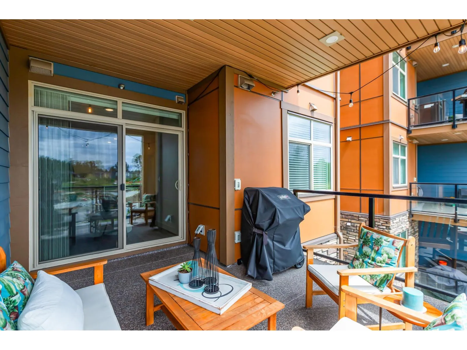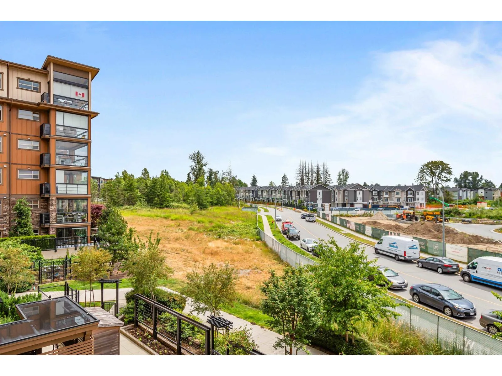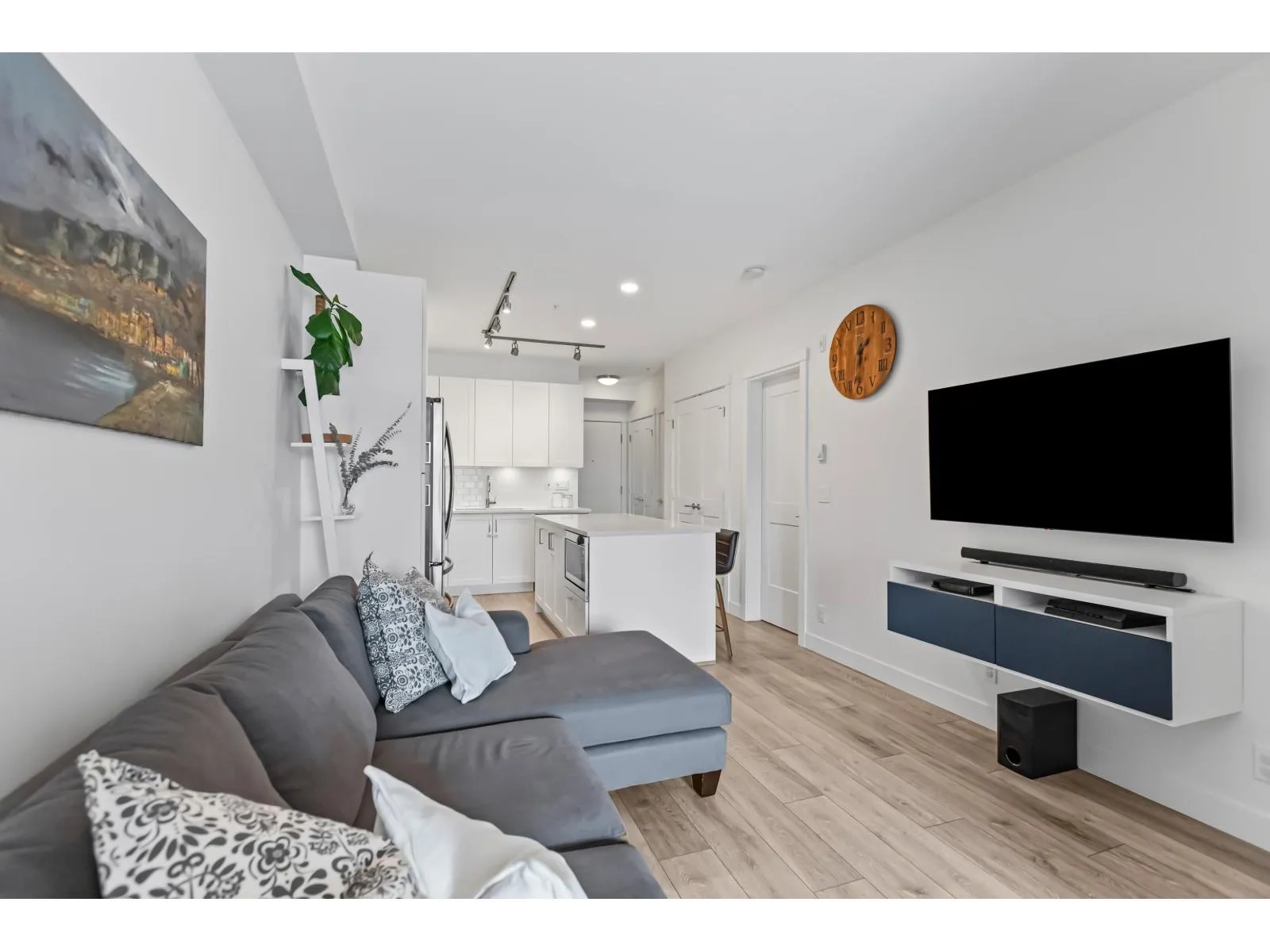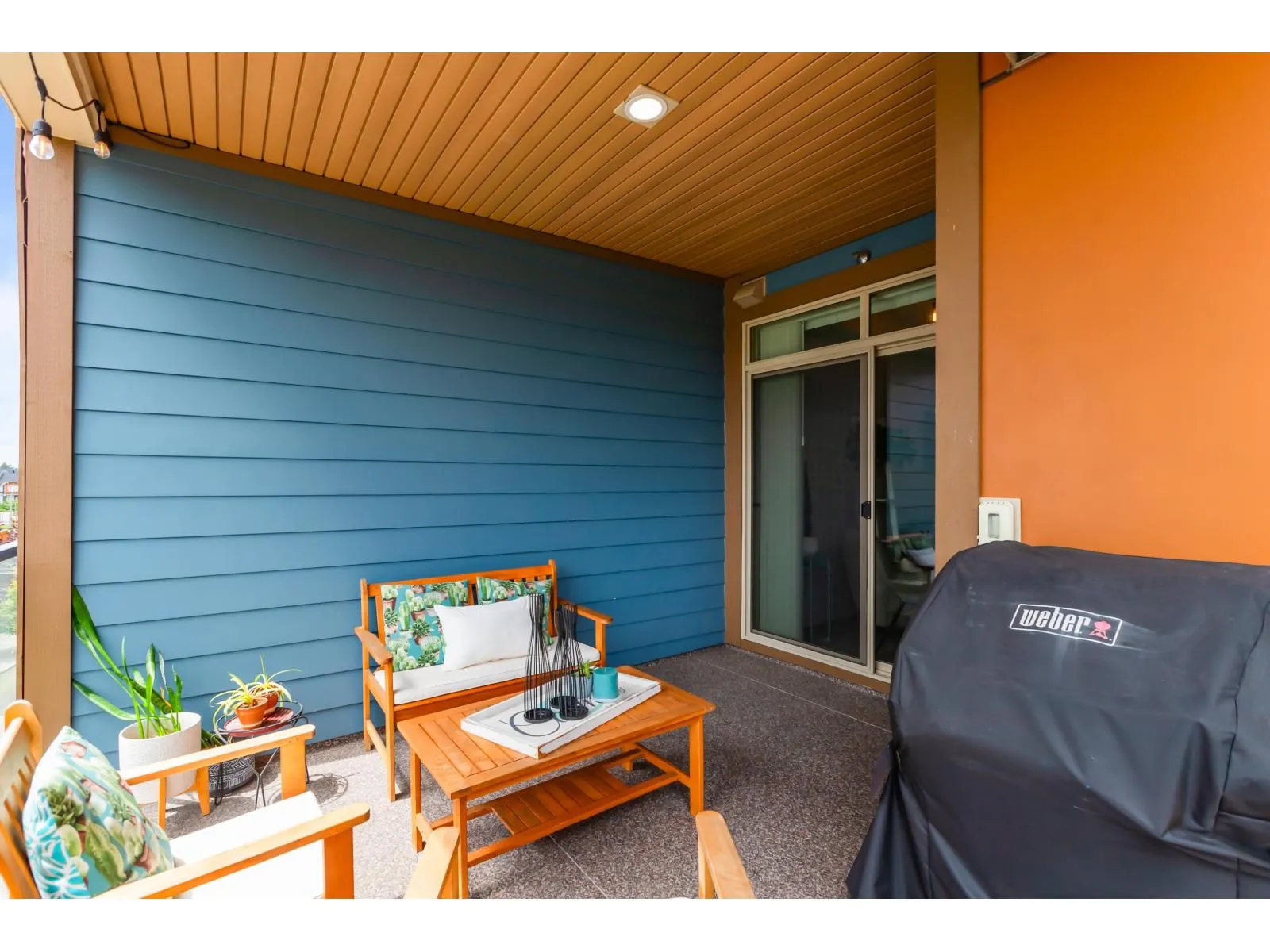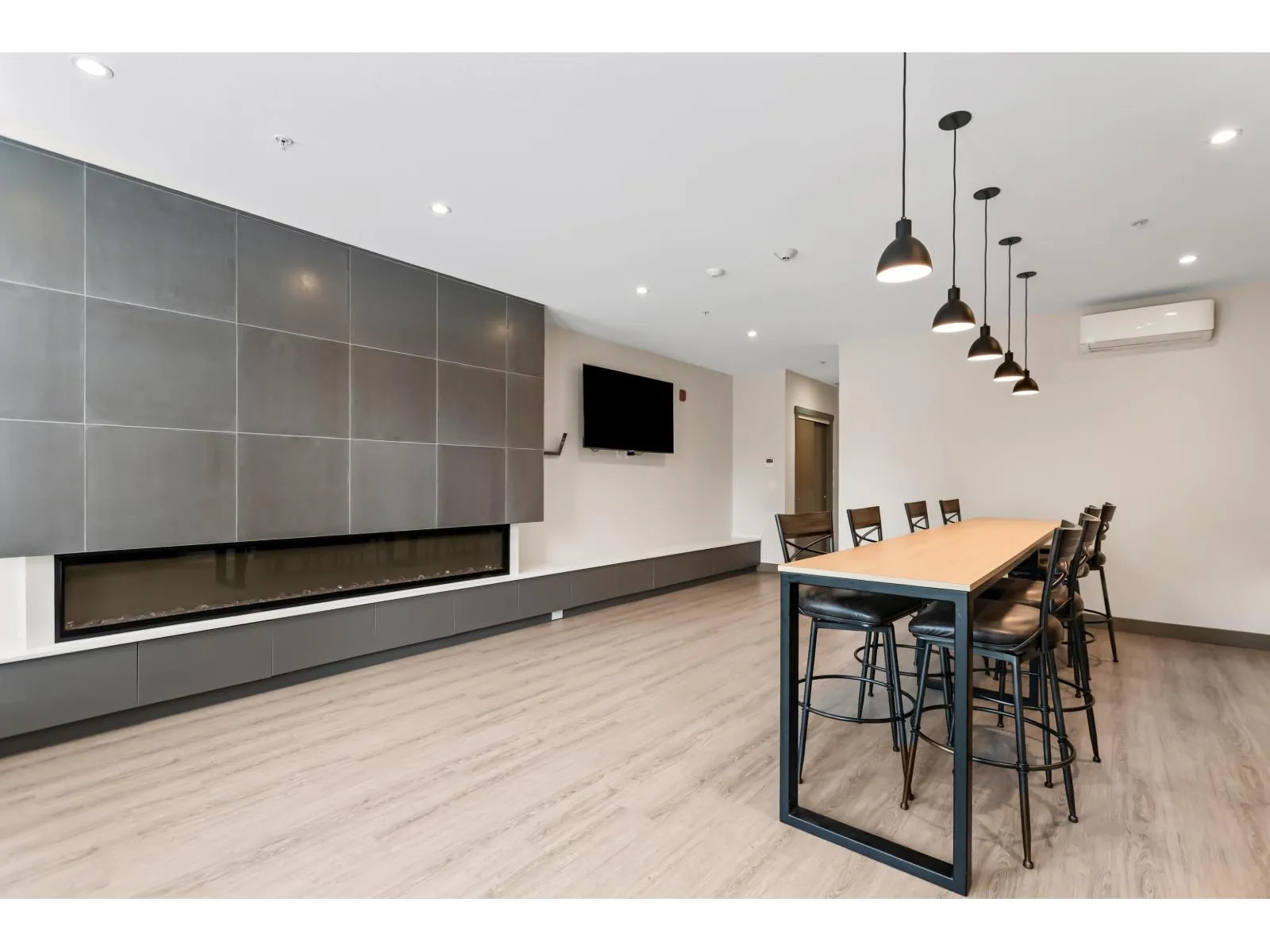 Bright, stylish, and in the heart of Willoughby Town Centre, this 2 bed, 2 bath condo at Grayson checks all the boxes. It's been incredibly well cared for and shows like new. Smart layout with two true bedrooms, sunny south-facing views, and wide plank flooring. The kitchen has a gas stove, stainless appliances, and a big eat-up bar, perfect for hosting. The primary suite features a walk-in closet and sleek en suite with double sinks and heated floors. The second bedroom has a window and works great as a kid's room, office, or guest space. Large covered deck, gym, playground, and social lounge with BBQ and fire pit seating. Includes two parking stalls and a roll-up storage locker. Steps to parks, schools, and shopping. (id:27476)