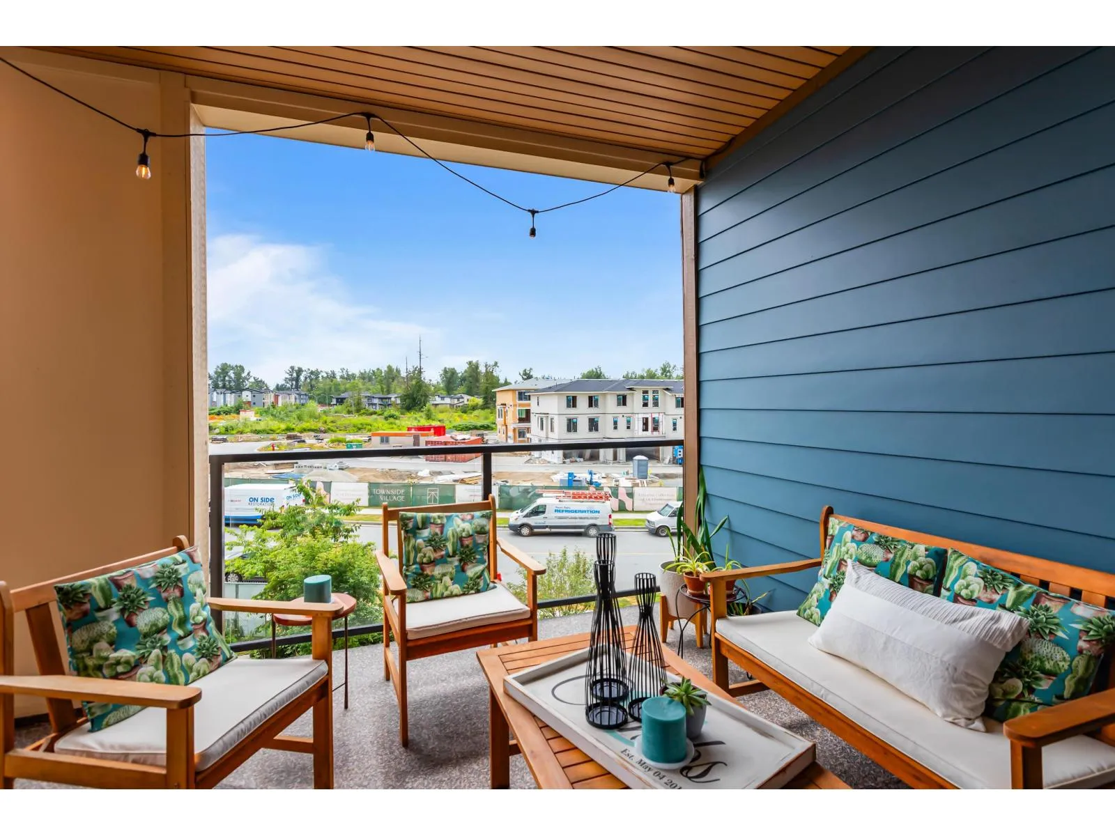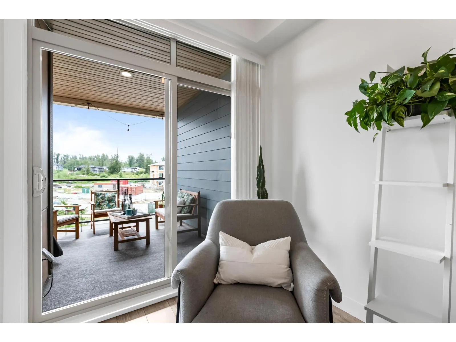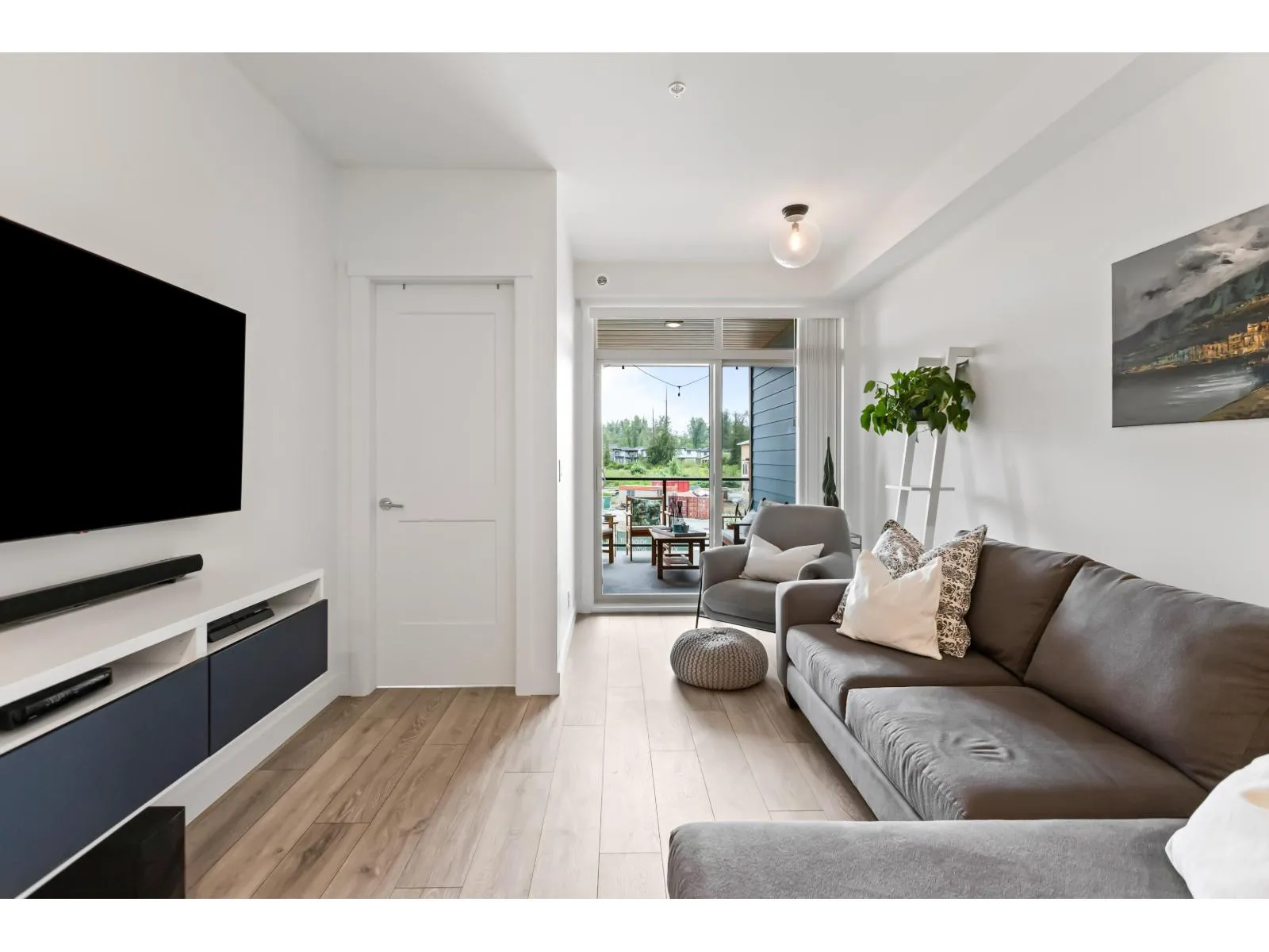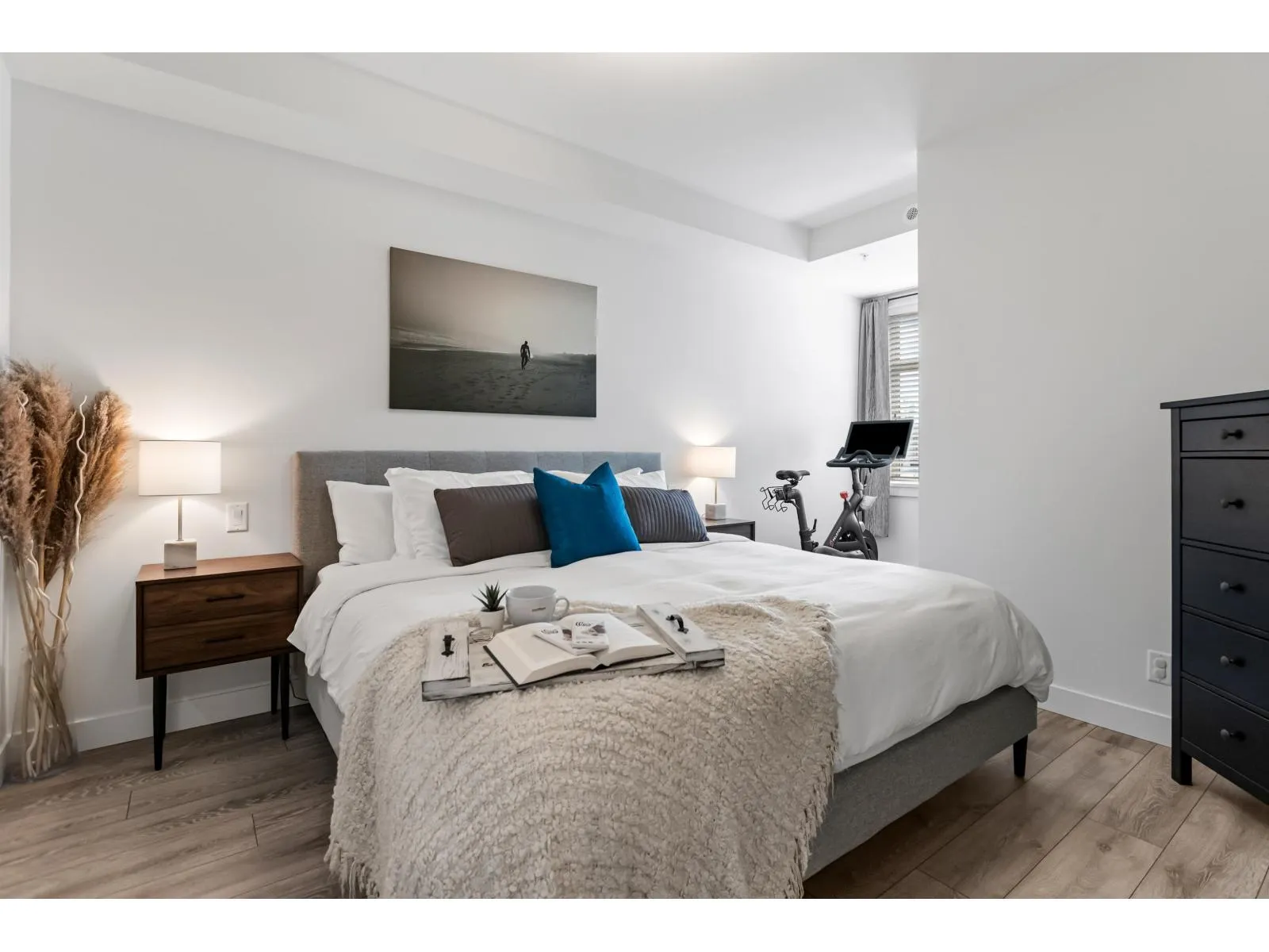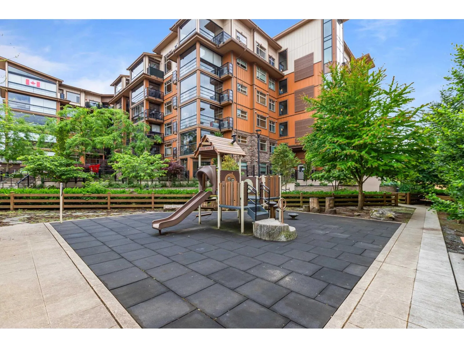Bright, stylish, and in the heart of Willoughby Town Centre, this 2 bed, 2 bath condo at Grayson checks all the boxes. It's been incredibly well cared for and shows like new. Smart layout with two true bedrooms, sunny south-facing views, and wide plank flooring. The kitchen has a gas stove, stainless appliances, and a big eat-up bar, perfect for hosting. The primary suite features a walk-in closet and sleek en suite with double sinks and heated floors. The second bedroom has a window and works great as a kid's room, office, or guest space. Large covered deck, gym, playground, and social lounge with BBQ and fire pit seating. Includes two parking stalls and a roll-up storage locker. Steps to parks, schools, and shopping. (id:27476)