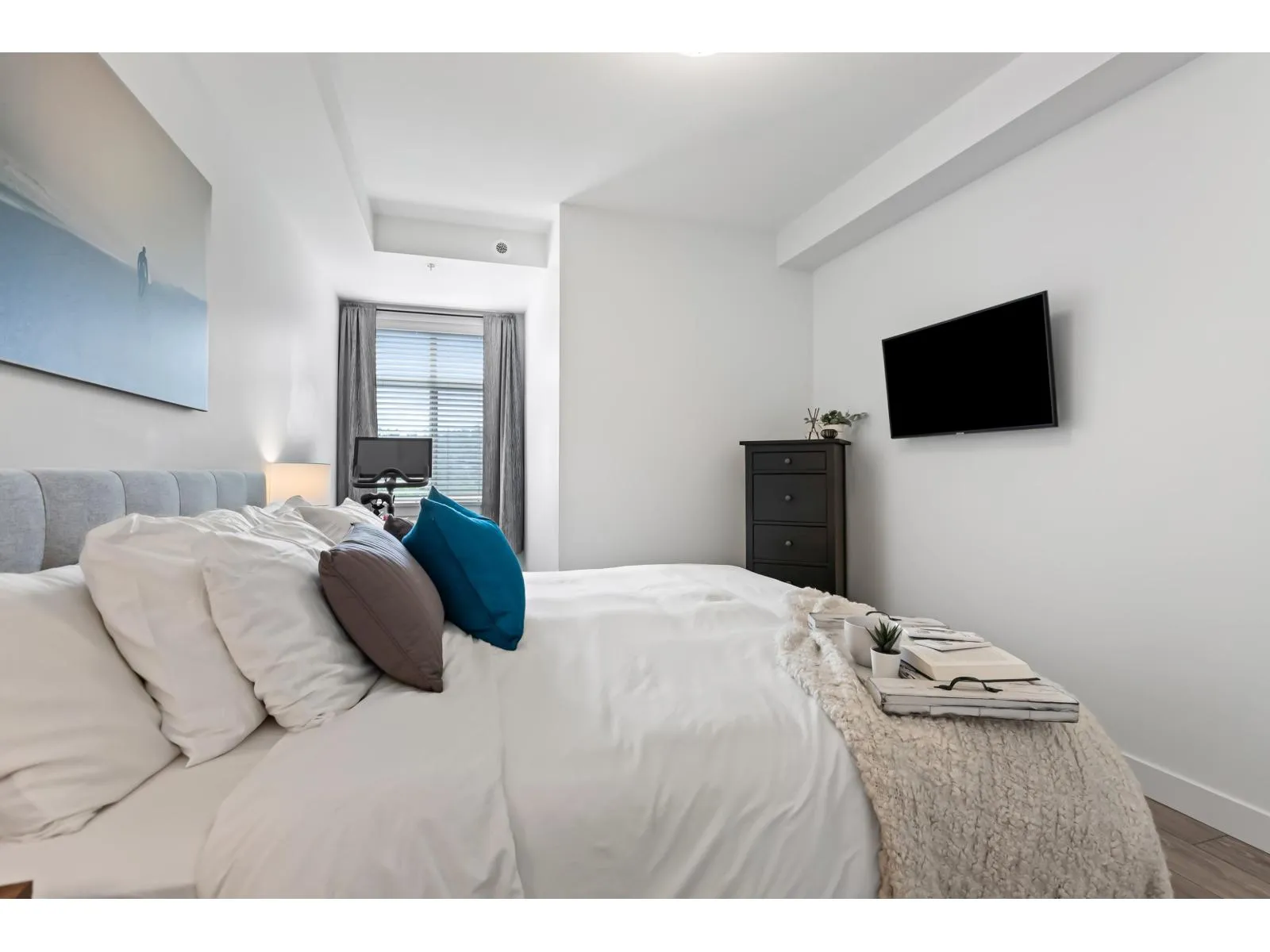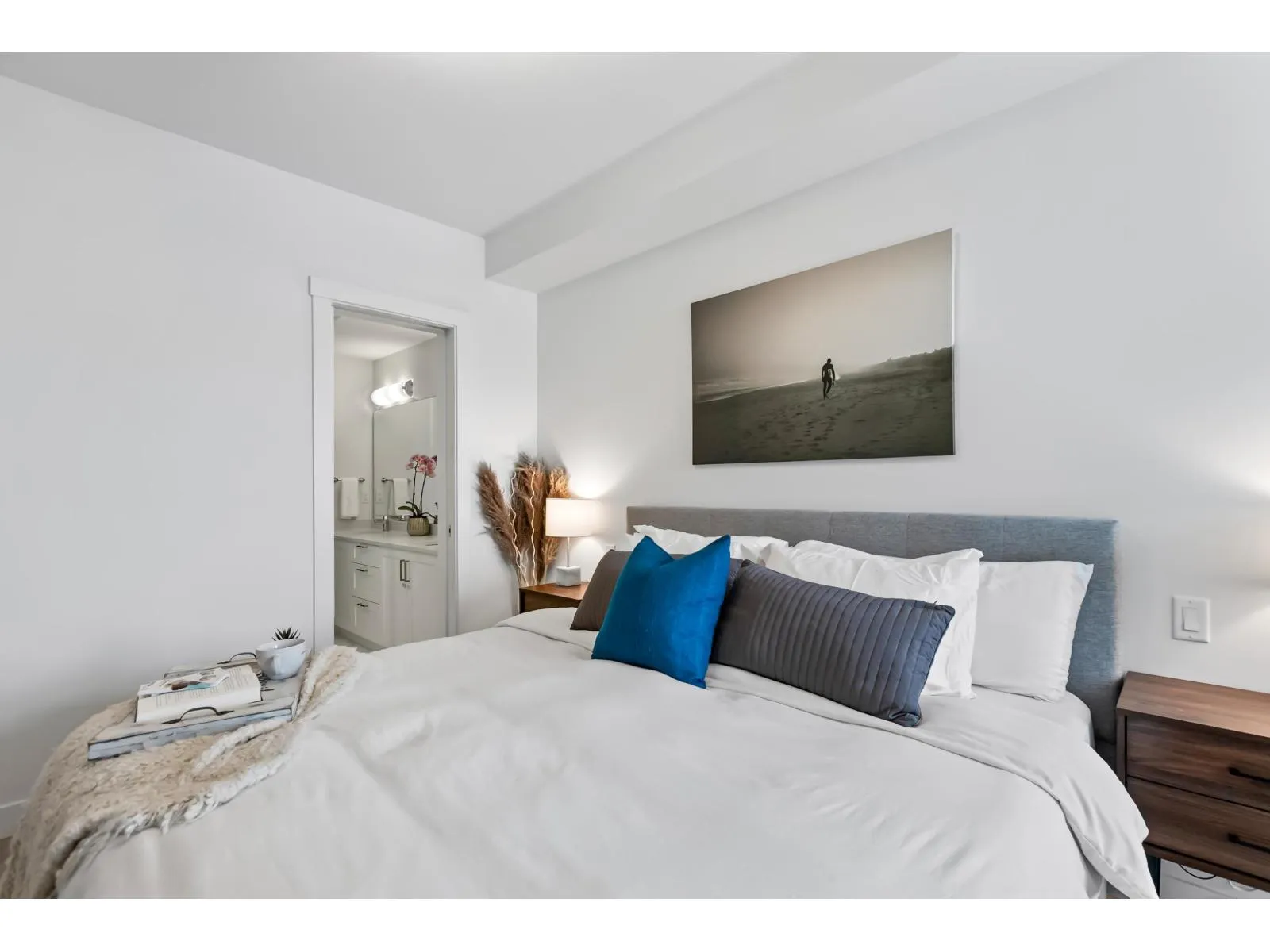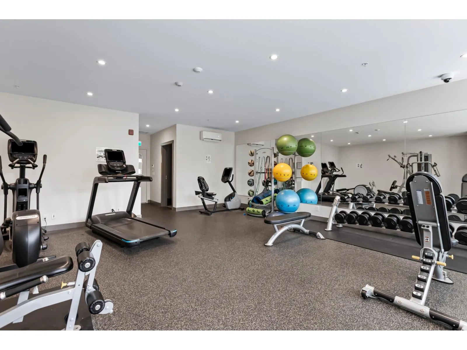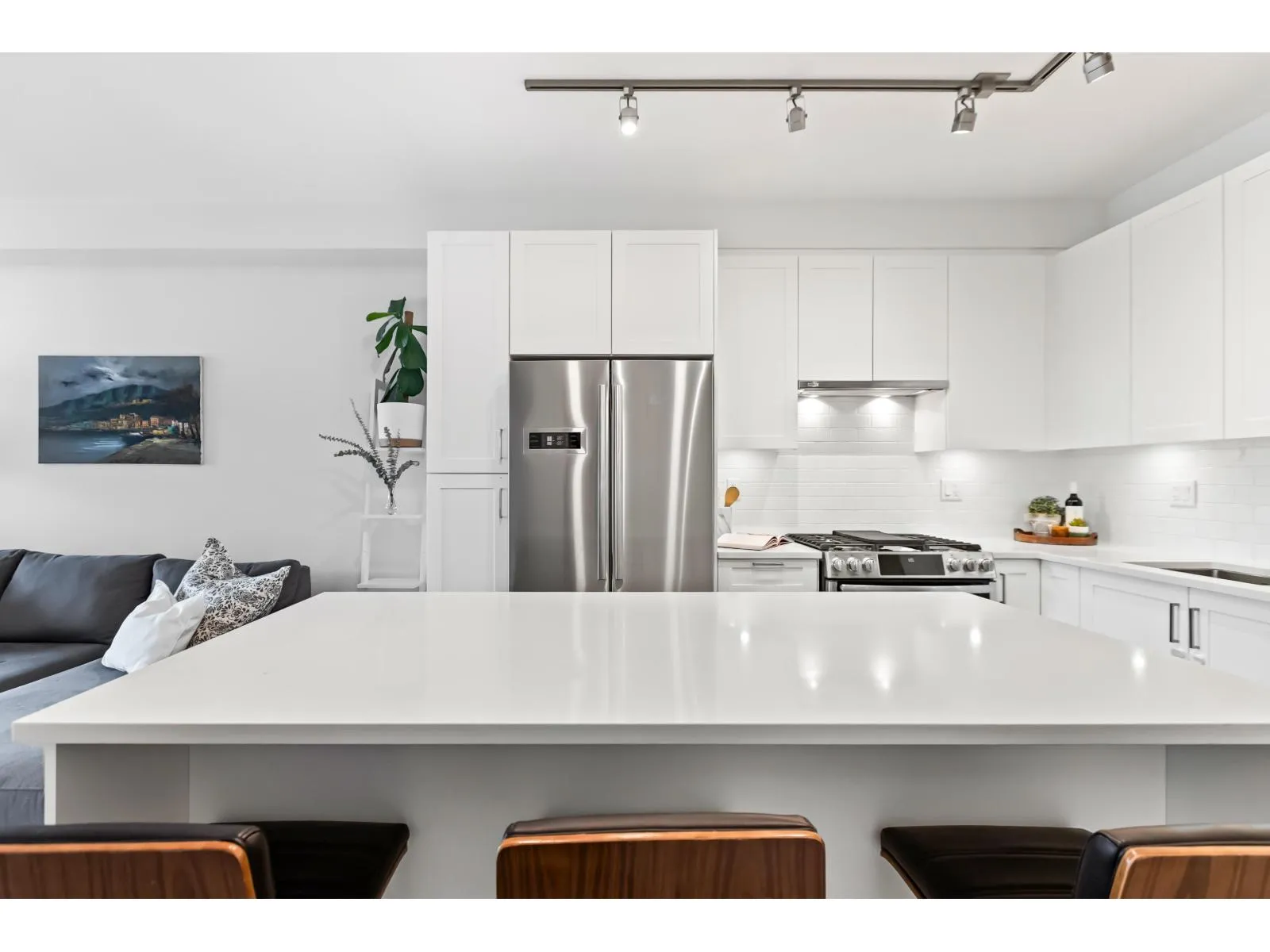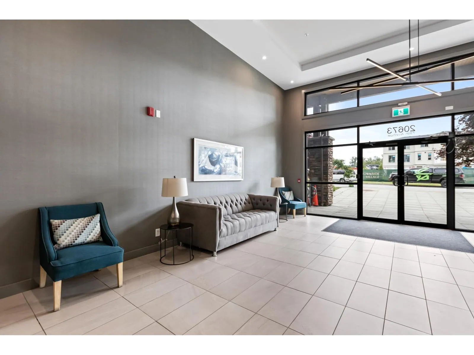 Bright, stylish, and in the heart of Willoughby Town Centre, this 2 bed, 2 bath condo at Grayson checks all the boxes. It's been incredibly well cared for and shows like new. Smart layout with two true bedrooms, sunny south-facing views, and wide plank flooring. The kitchen has a gas stove, stainless appliances, and a big eat-up bar, perfect for hosting. The primary suite features a walk-in closet and sleek en suite with double sinks and heated floors. The second bedroom has a window and works great as a kid's room, office, or guest space. Large covered deck, gym, playground, and social lounge with BBQ and fire pit seating. Includes two parking stalls and a roll-up storage locker. Steps to parks, schools, and shopping. (id:27476)