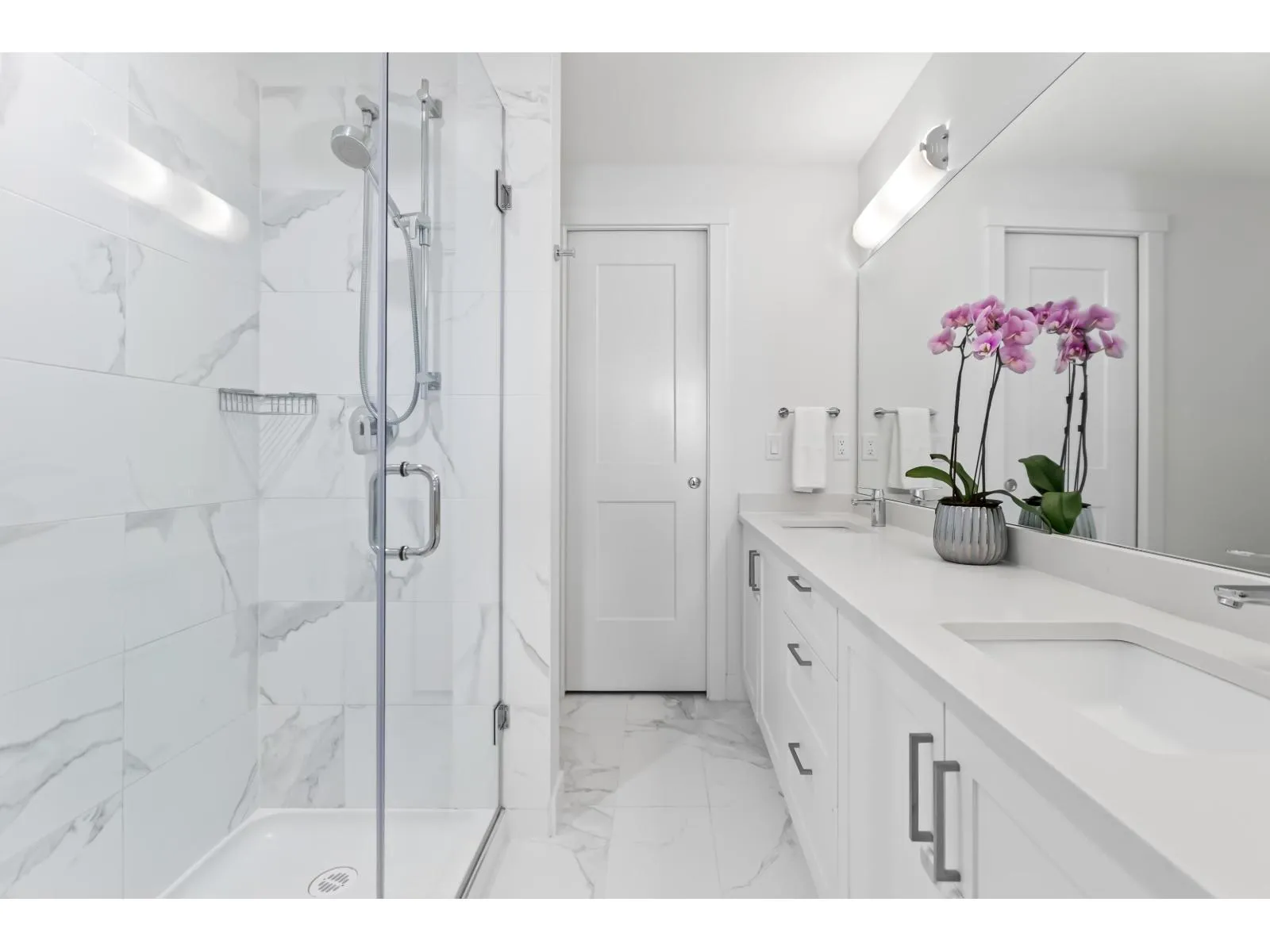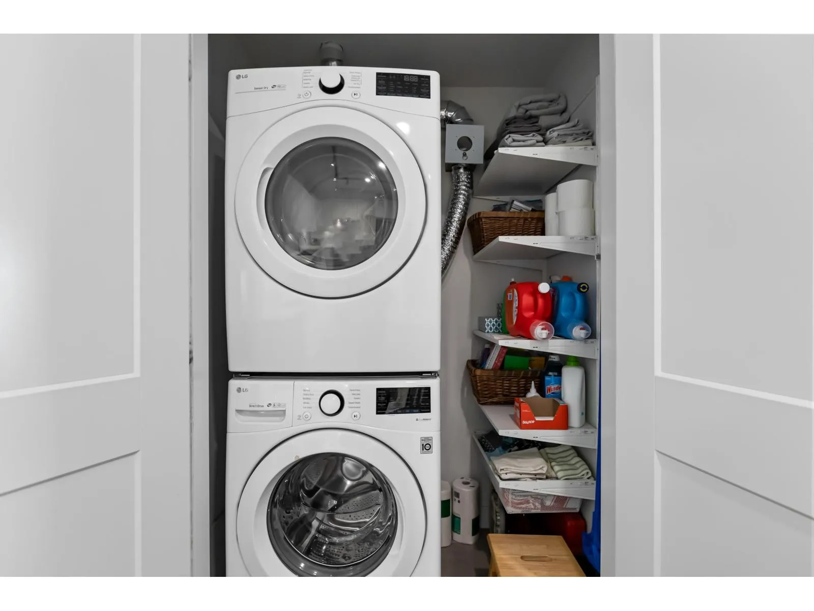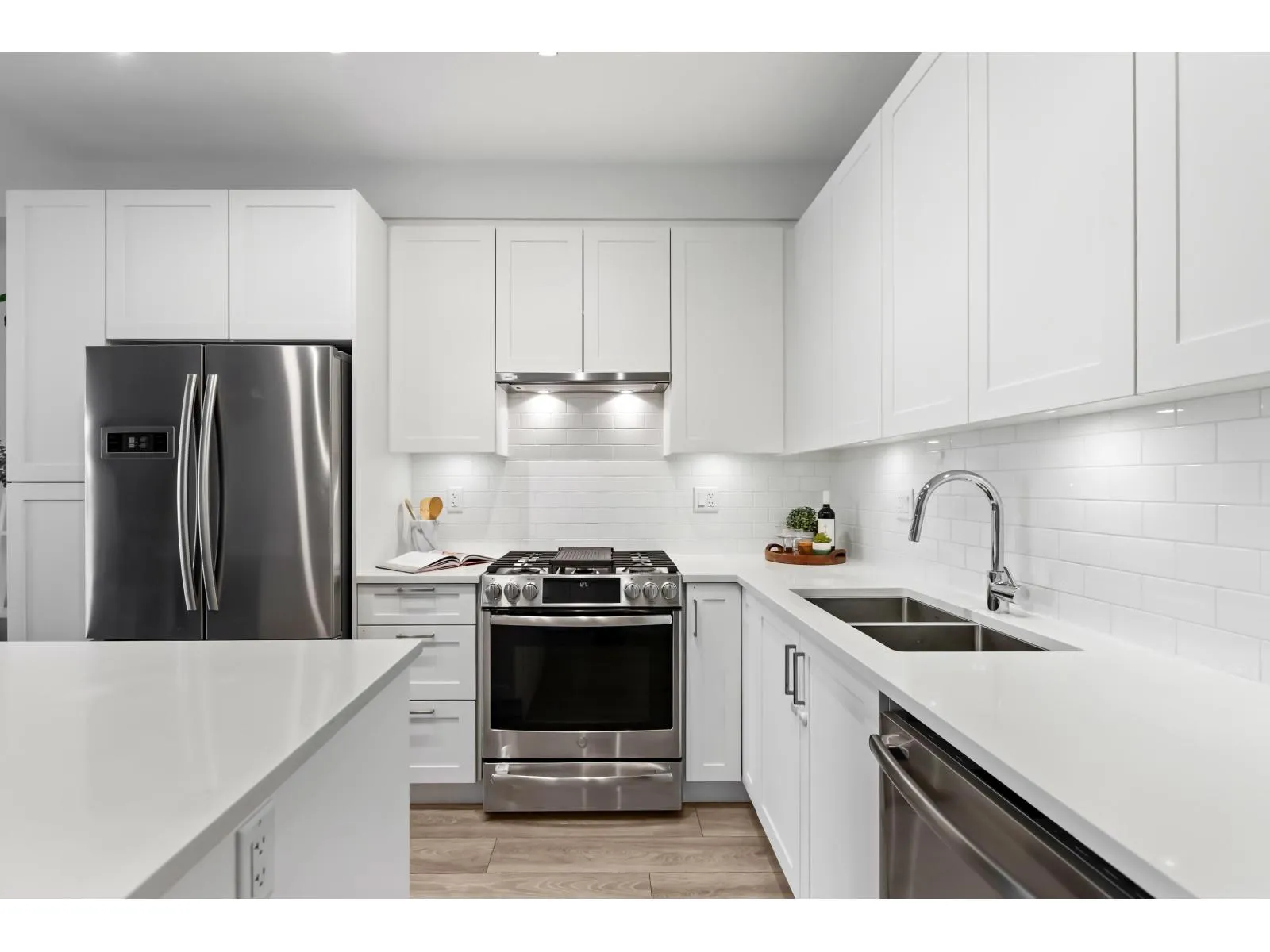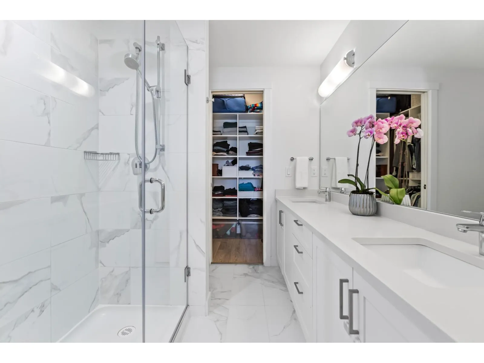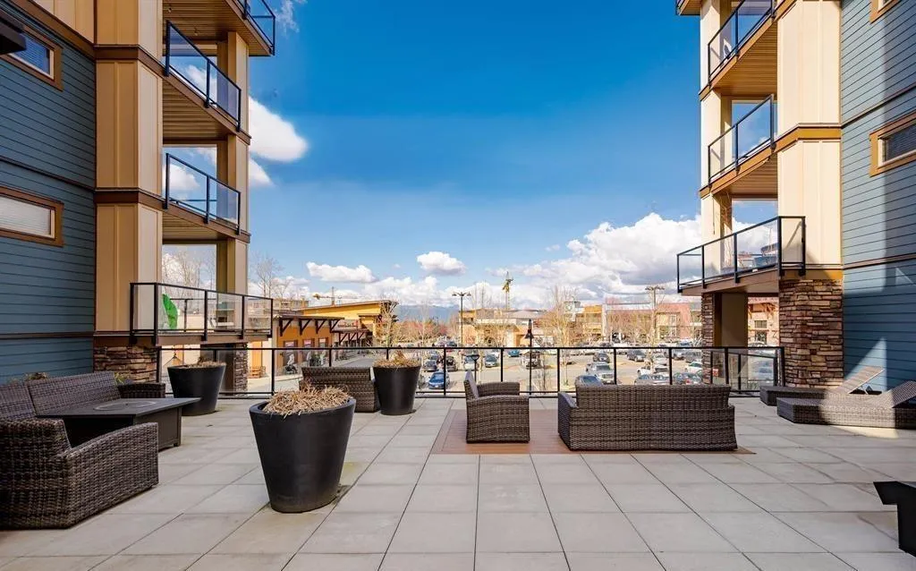 Bright, stylish, and in the heart of Willoughby Town Centre, this 2 bed, 2 bath condo at Grayson checks all the boxes. It's been incredibly well cared for and shows like new. Smart layout with two true bedrooms, sunny south-facing views, and wide plank flooring. The kitchen has a gas stove, stainless appliances, and a big eat-up bar, perfect for hosting. The primary suite features a walk-in closet and sleek en suite with double sinks and heated floors. The second bedroom has a window and works great as a kid's room, office, or guest space. Large covered deck, gym, playground, and social lounge with BBQ and fire pit seating. Includes two parking stalls and a roll-up storage locker. Steps to parks, schools, and shopping. (id:27476)