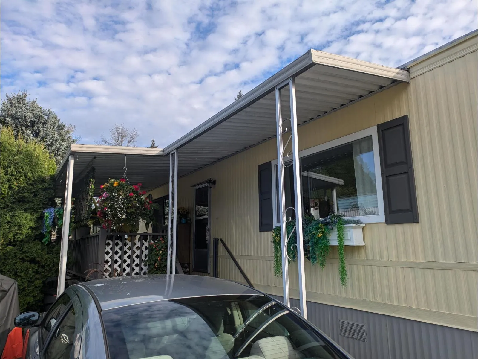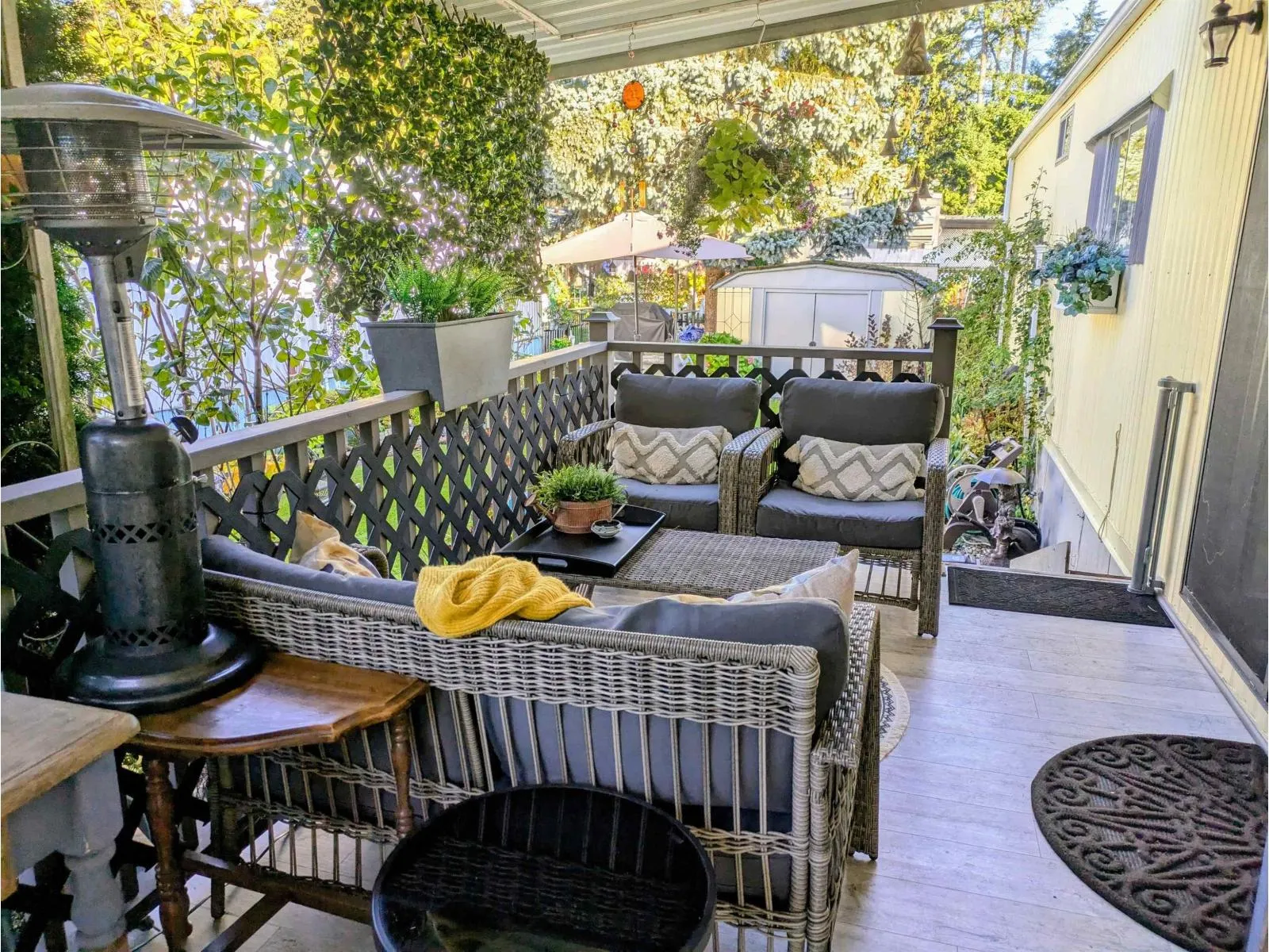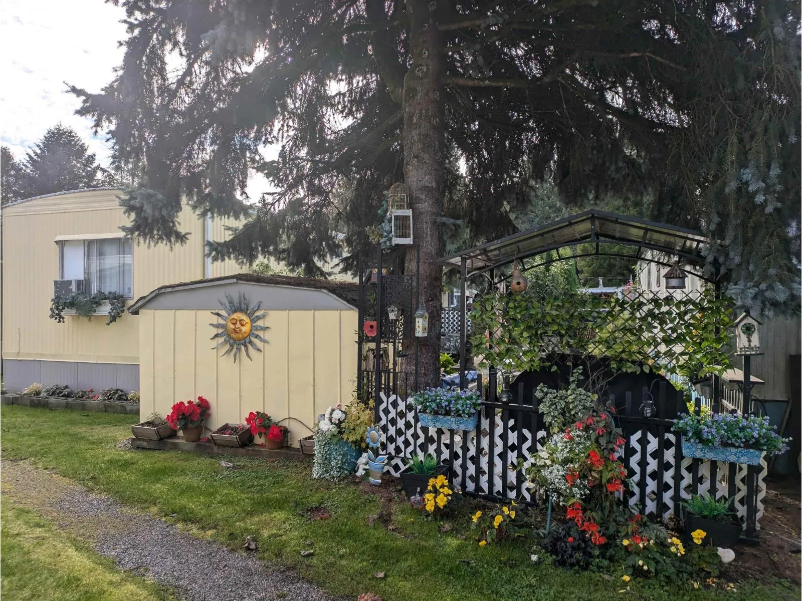 Embrace an idyllic 55+ lifestyle in Forest Green Estates. Meticulously updated and bright, this 2 bed, 1 bath mobile home is move in ready and a short stroll to public transit, shops, restaurants, theatres and pubs. Renos include new flooring, crown moldings and updated lighting throughout. Kitchen is spacious and all appliances are only 4 yrs old. The central island comfortably seats 8 and is perfect for entertaining. The spa like bathroom with oversize tub and an artistic vessel sink. Kingsized bed and dressers easily fit in the master bdrm and has a huge closet for extensive storage. Enjoy the lovely fenced yard with BBQ area and covered patio. Unit is now empty and photos were when owner lived there. It's waiting for you! (id:27476)