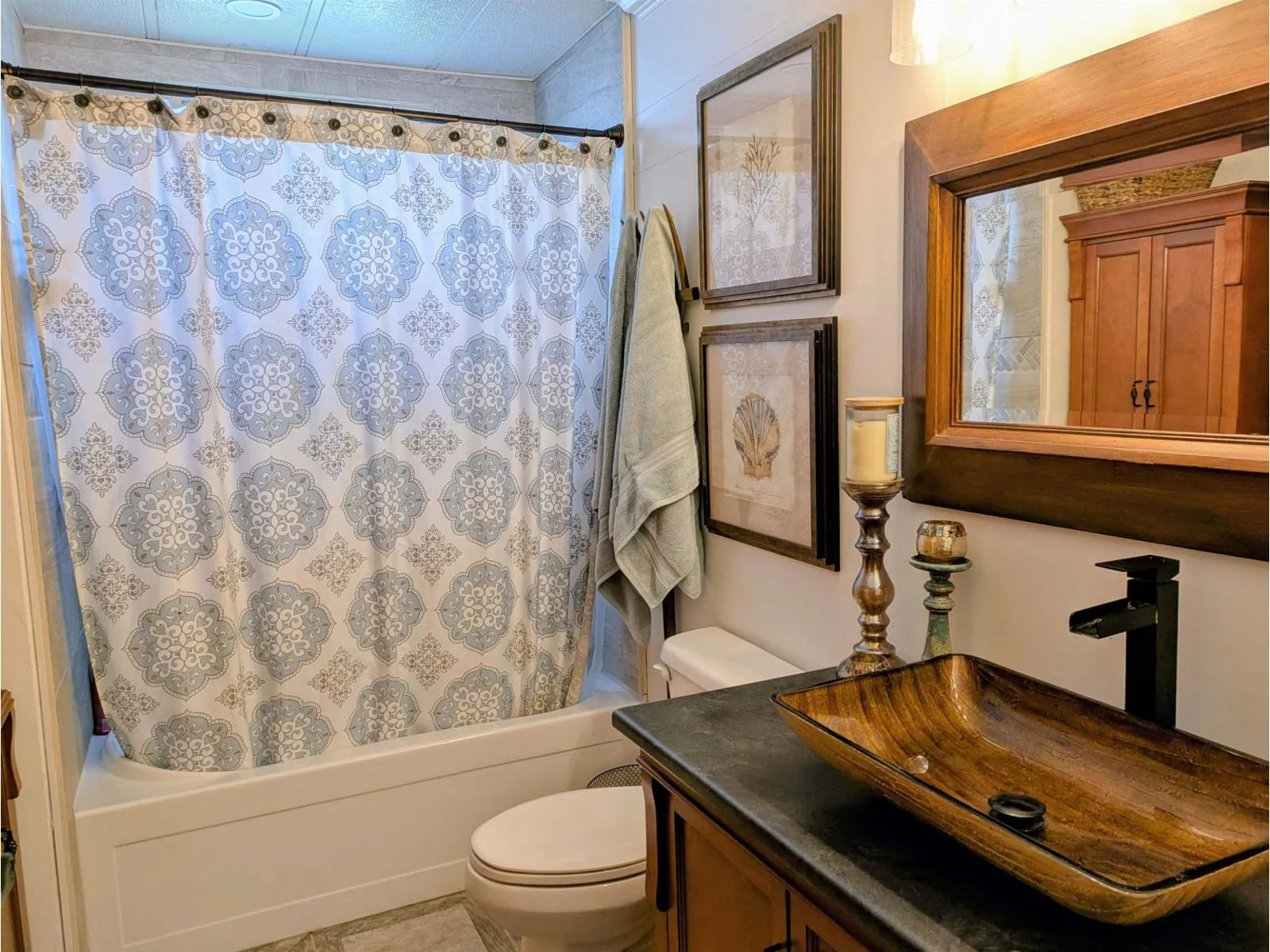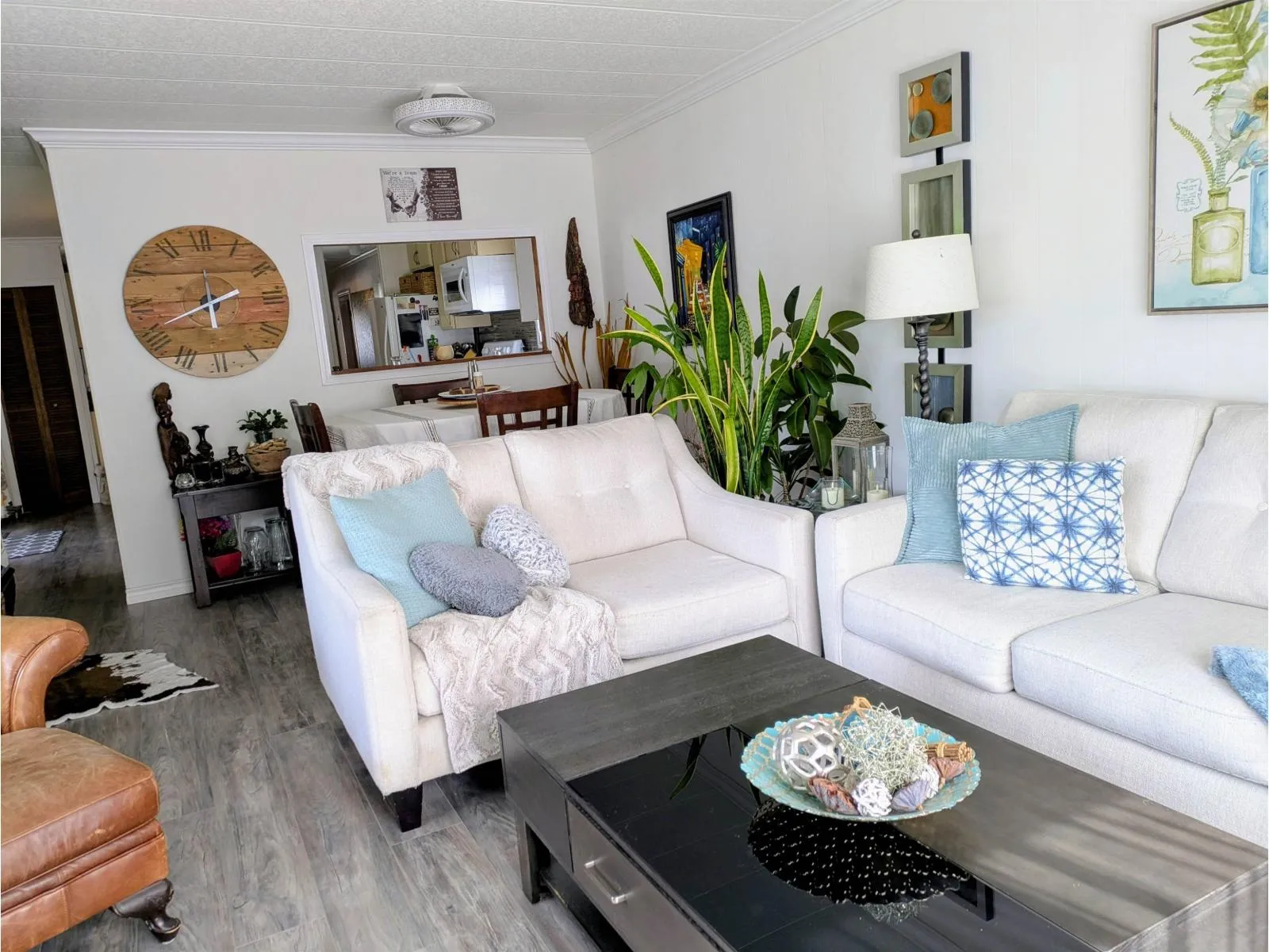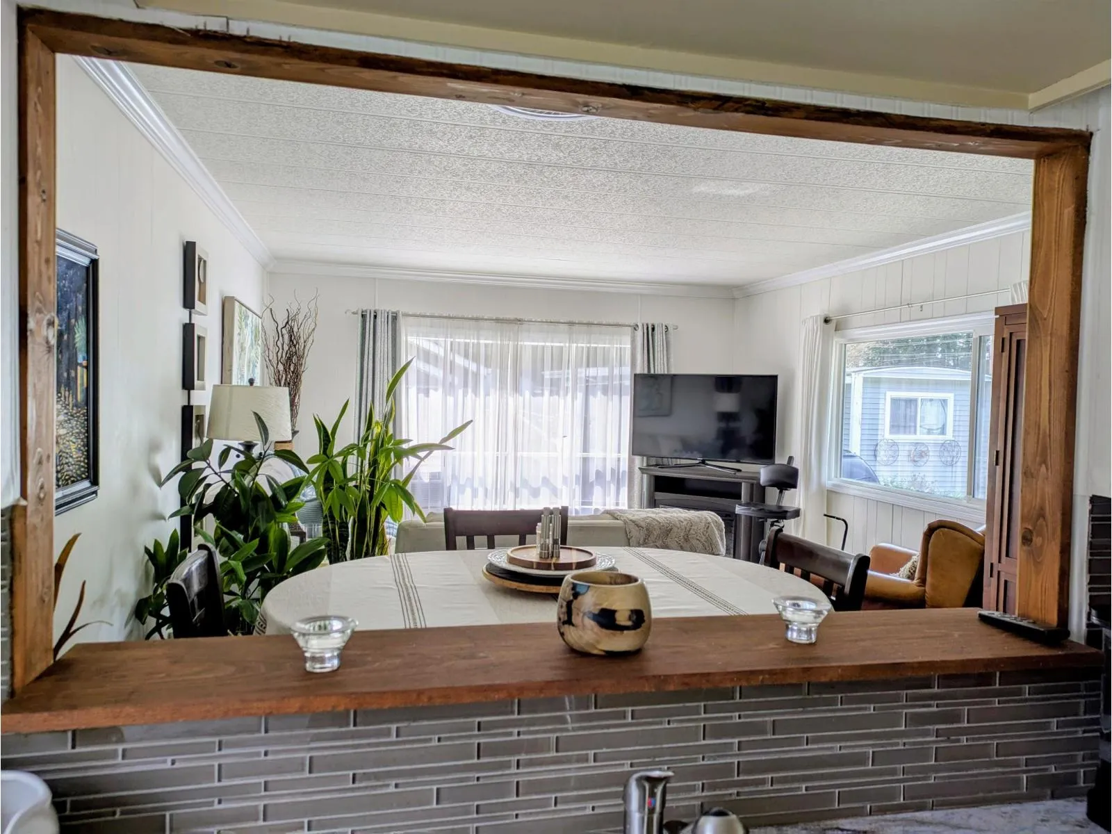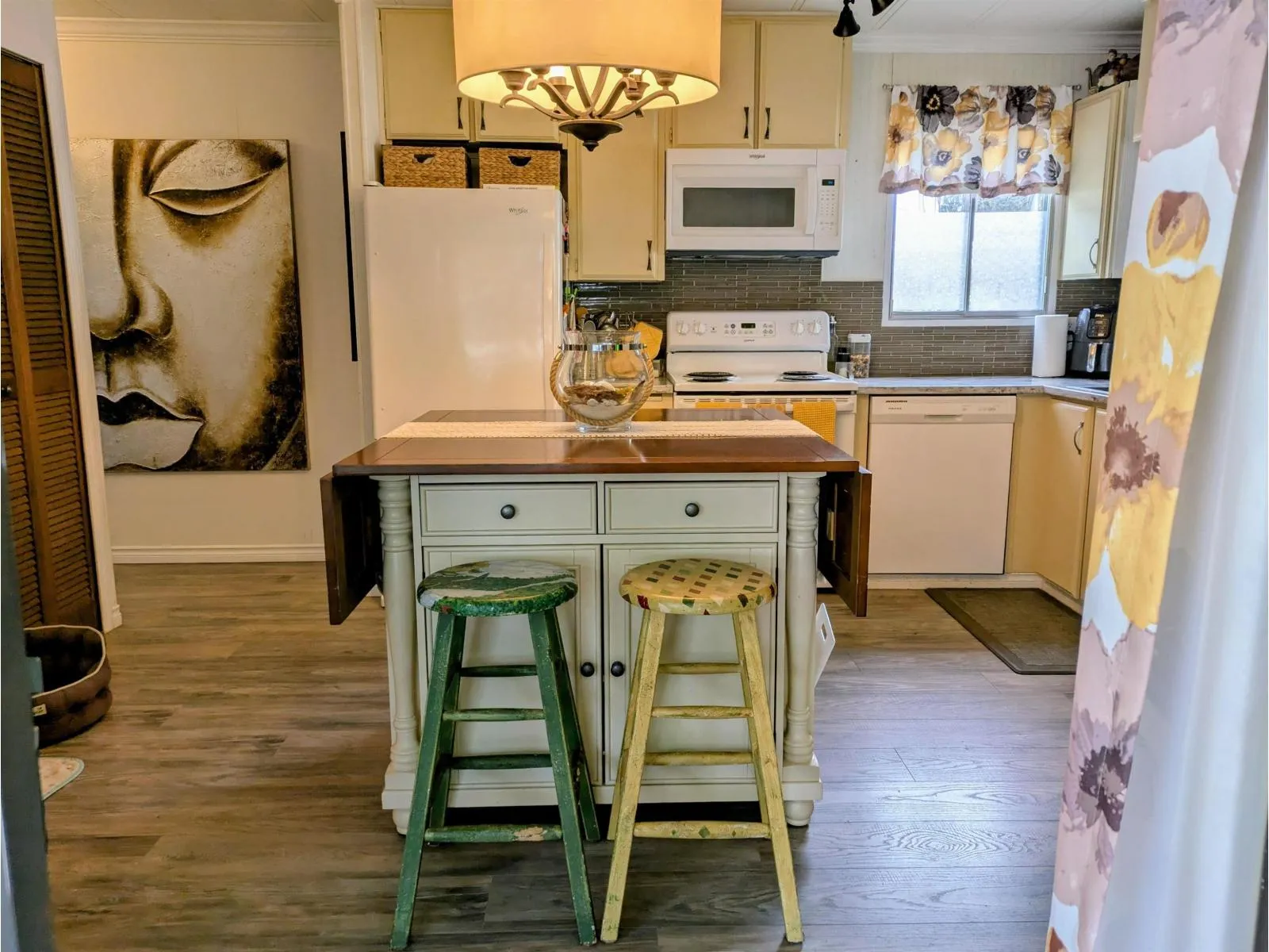 Embrace an idyllic 55+ lifestyle in Forest Green Estates. Meticulously updated and bright, this 2 bed, 1 bath mobile home is move in ready and a short stroll to public transit, shops, restaurants, theatres and pubs. Renos include new flooring, crown moldings and updated lighting throughout. Kitchen is spacious and all appliances are only 4 yrs old. The central island comfortably seats 8 and is perfect for entertaining. The spa like bathroom with oversize tub and an artistic vessel sink. Kingsized bed and dressers easily fit in the master bdrm and has a huge closet for extensive storage. Enjoy the lovely fenced yard with BBQ area and covered patio. Unit is now empty and photos were when owner lived there. It's waiting for you! (id:27476)