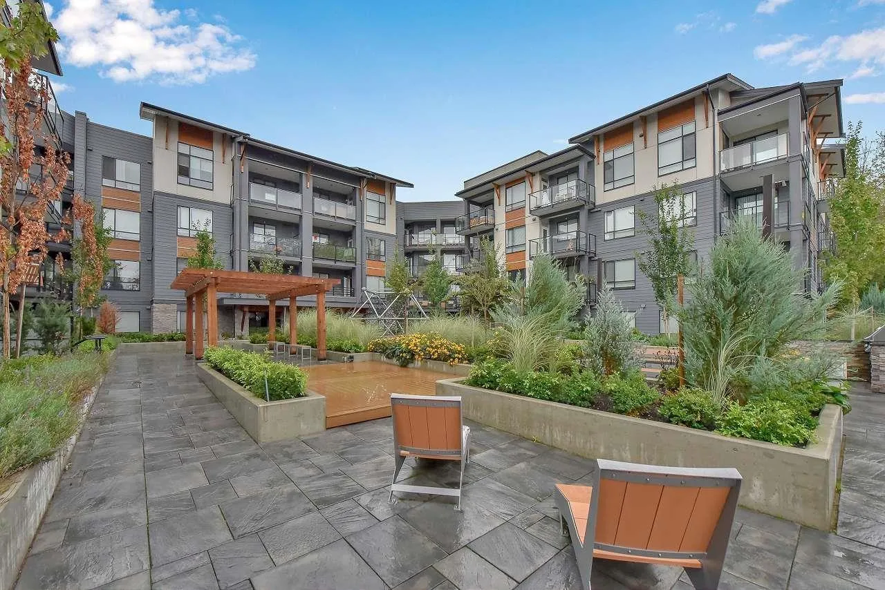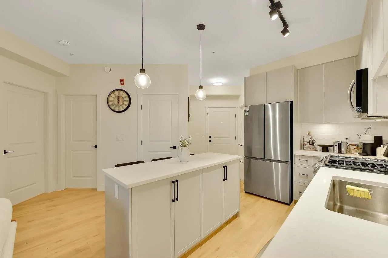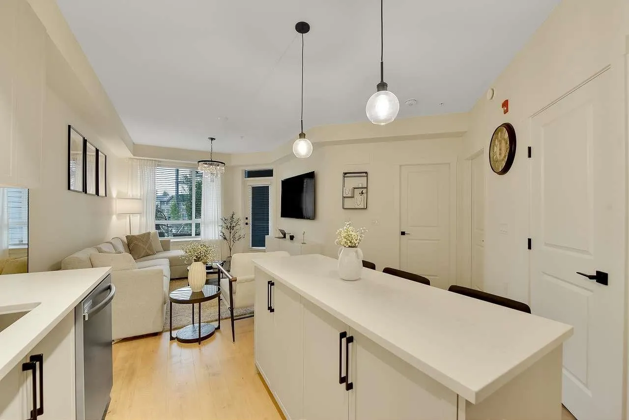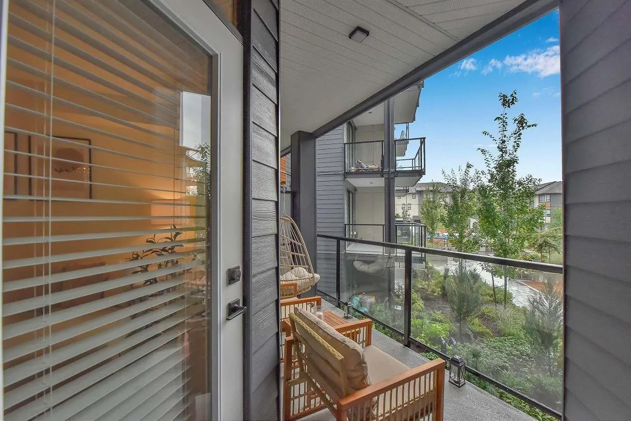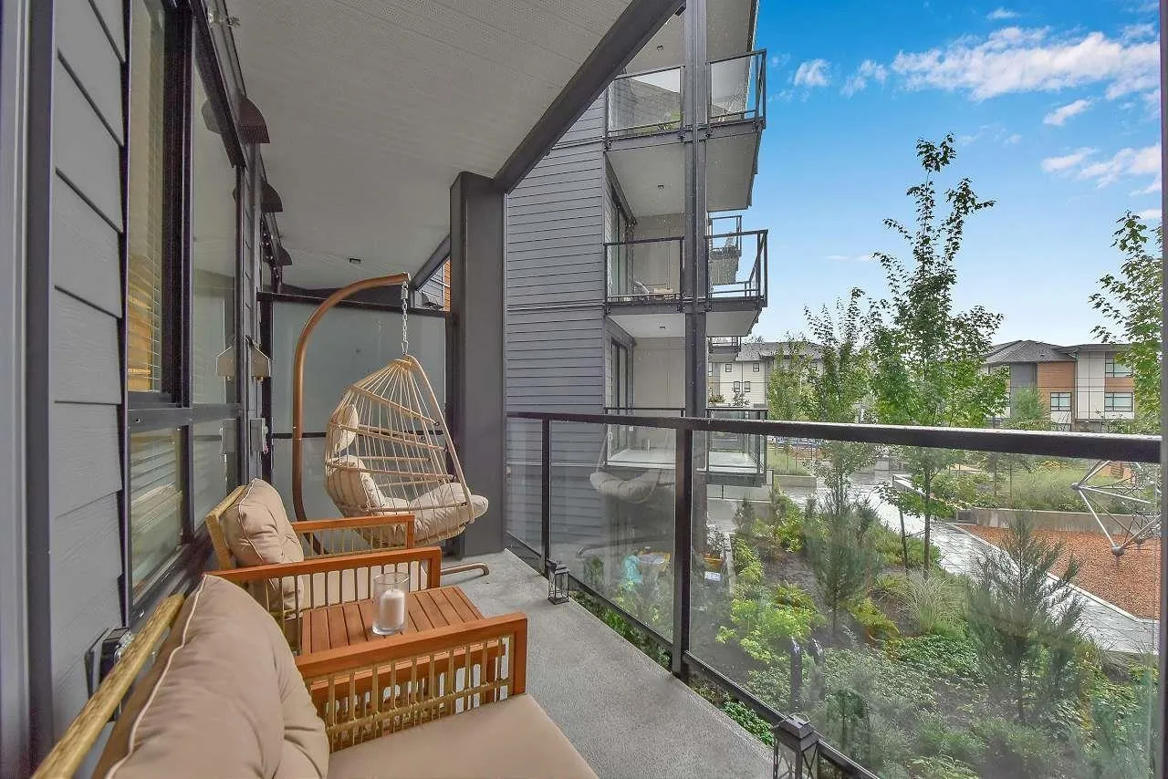 Camden by Award-Winning Zenterra! Step into this bright and modern 1 1-bedroom+den condo located in the heart of Langley's thriving Willoughby neighborhood. This meticulously designed home offers 677 sq ft of smart, functional living space-perfect for first-time buyers, professionals, or investors. The open-concept layout features a sleek, designer kitchen with quartz countertops, stainless steel Samsung appliances, and soft-close cabinetry, flowing into a spacious living area with large windows that fill the home with natural light. Den is perfect for a home office, nursery, or extra storage, W. facing balcony. The spacious bedroom fits a king-sized bed, and the modern 4-piece bathroom is styled with premium fixtures. 1 parking & Storage, Pets ok, built-in piping for AC. (id:27476)