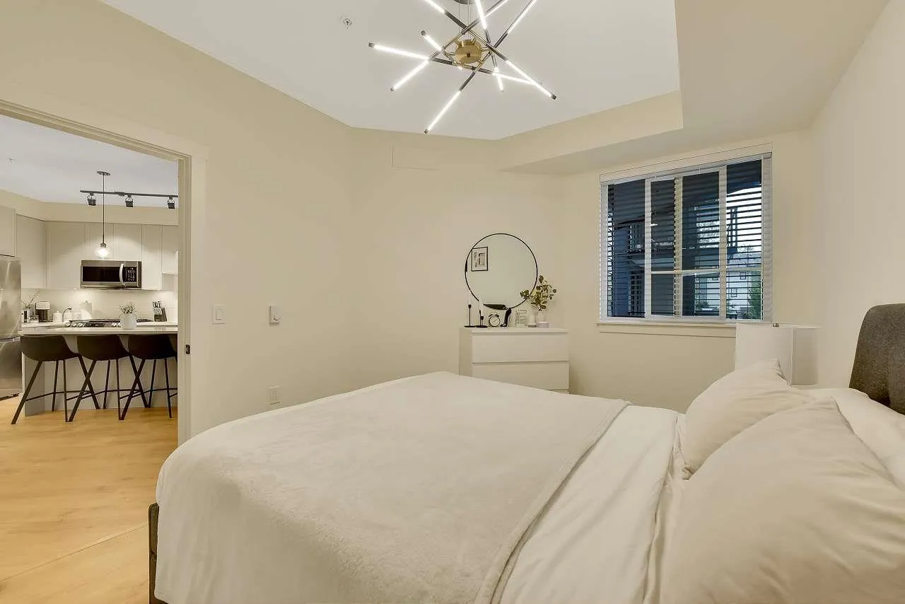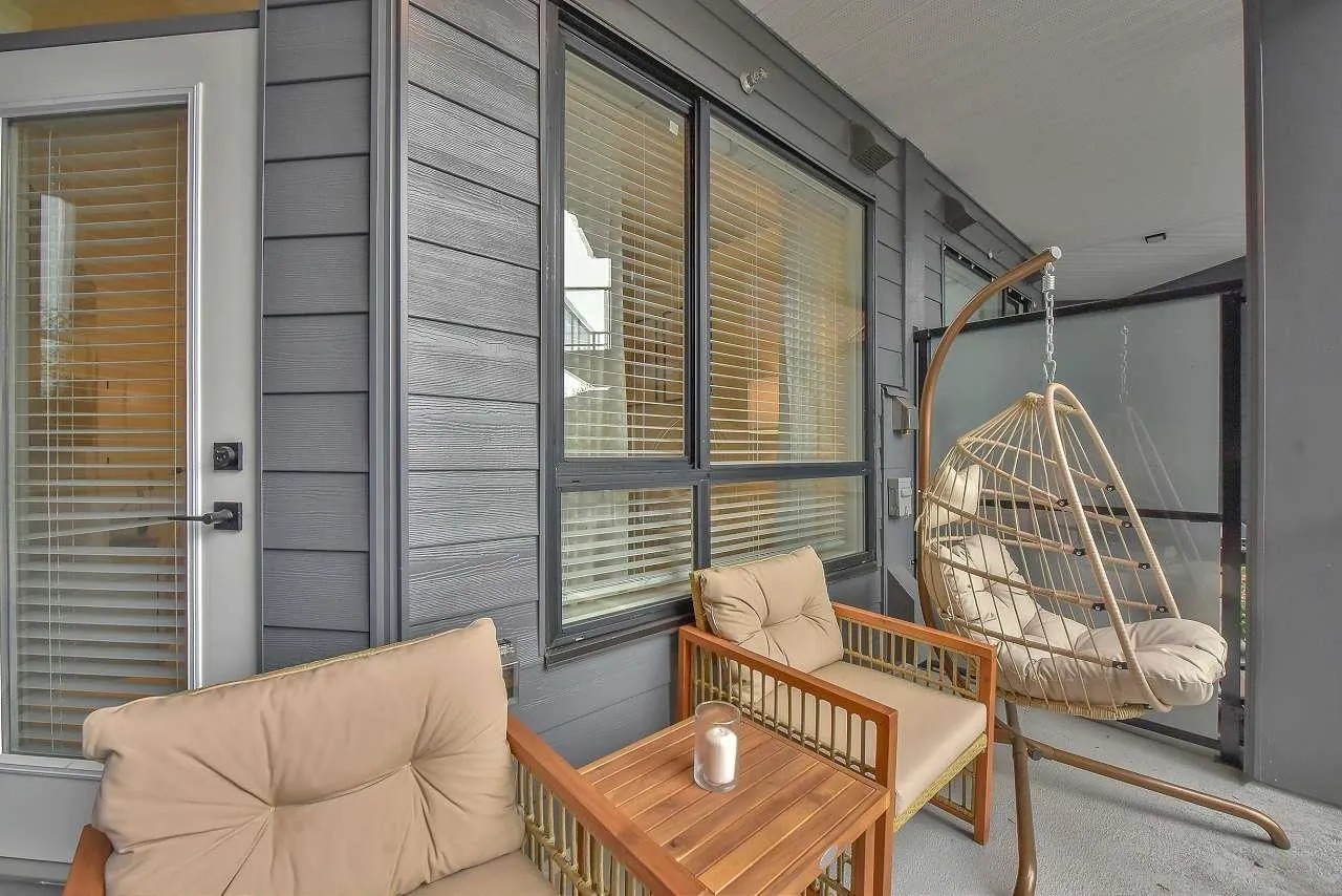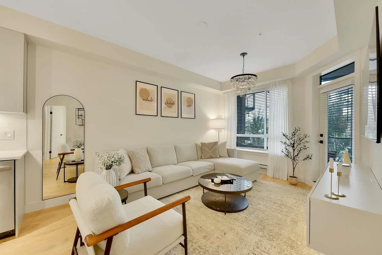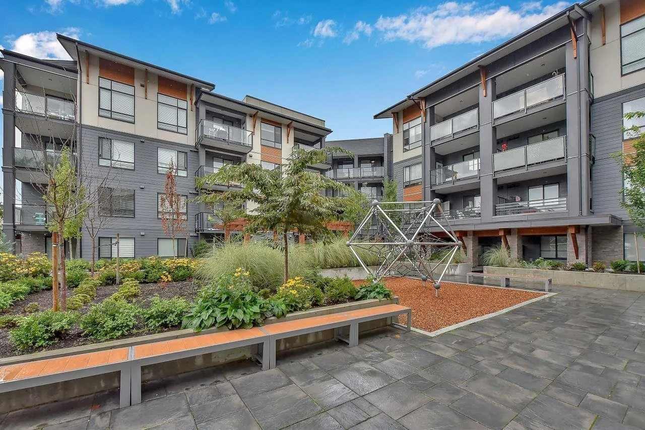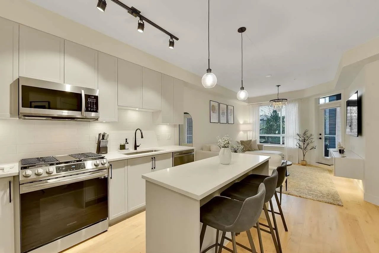Camden by Award-Winning Zenterra! Step into this bright and modern 1 1-bedroom+den condo located in the heart of Langley's thriving Willoughby neighborhood. This meticulously designed home offers 677 sq ft of smart, functional living space-perfect for first-time buyers, professionals, or investors. The open-concept layout features a sleek, designer kitchen with quartz countertops, stainless steel Samsung appliances, and soft-close cabinetry, flowing into a spacious living area with large windows that fill the home with natural light. Den is perfect for a home office, nursery, or extra storage, W. facing balcony. The spacious bedroom fits a king-sized bed, and the modern 4-piece bathroom is styled with premium fixtures. 1 parking & Storage, Pets ok, built-in piping for AC. (id:27476)