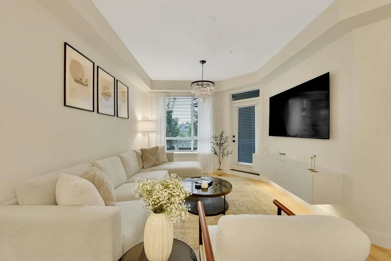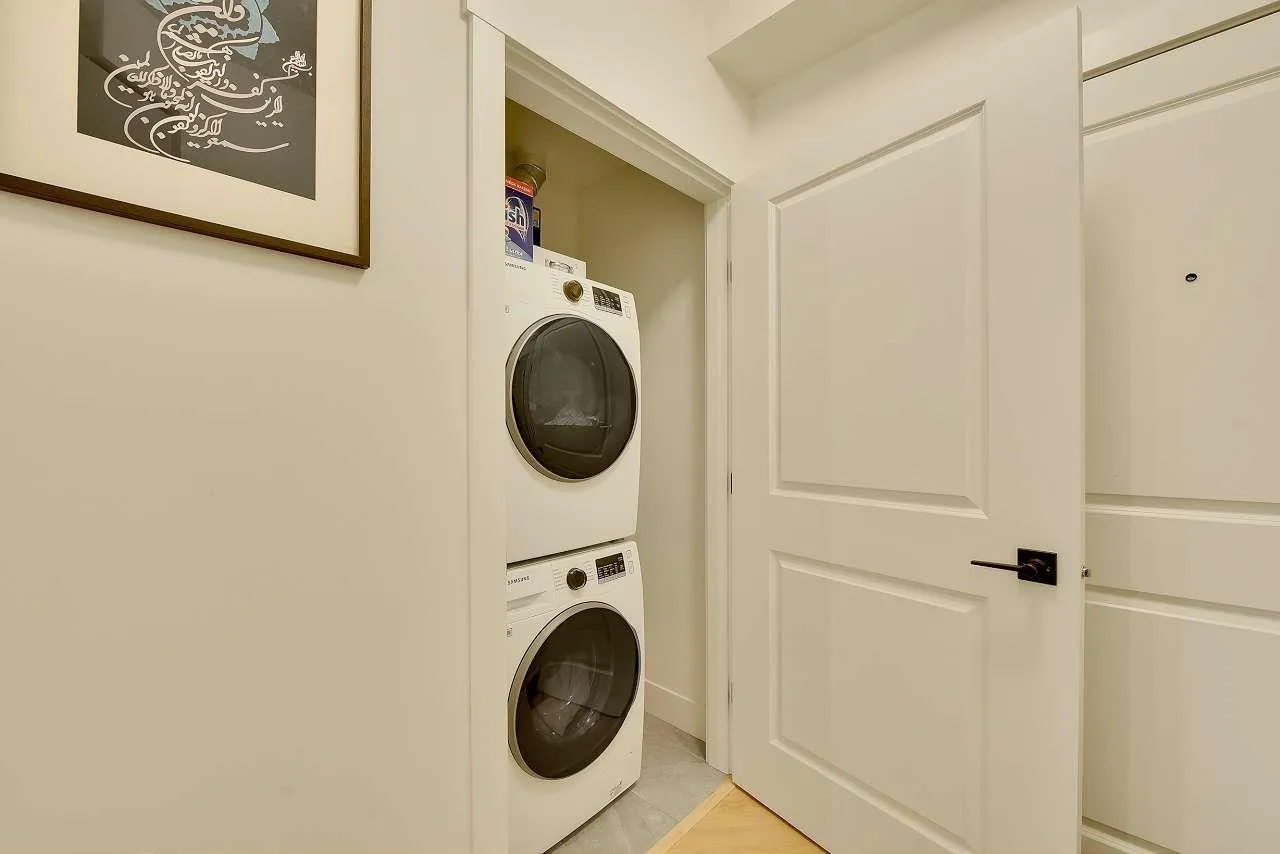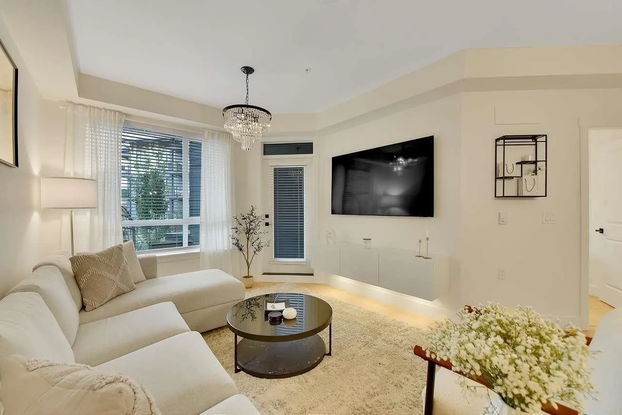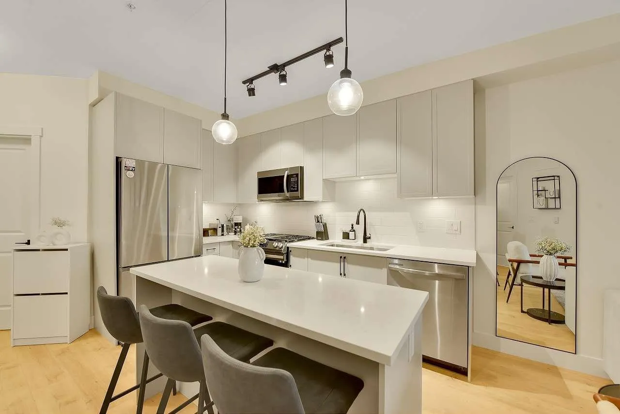 Camden by Award-Winning Zenterra! Step into this bright and modern 1 1-bedroom+den condo located in the heart of Langley's thriving Willoughby neighborhood. This meticulously designed home offers 677 sq ft of smart, functional living space-perfect for first-time buyers, professionals, or investors. The open-concept layout features a sleek, designer kitchen with quartz countertops, stainless steel Samsung appliances, and soft-close cabinetry, flowing into a spacious living area with large windows that fill the home with natural light. Den is perfect for a home office, nursery, or extra storage, W. facing balcony. The spacious bedroom fits a king-sized bed, and the modern 4-piece bathroom is styled with premium fixtures. 1 parking & Storage, Pets ok, built-in piping for AC. (id:27476)