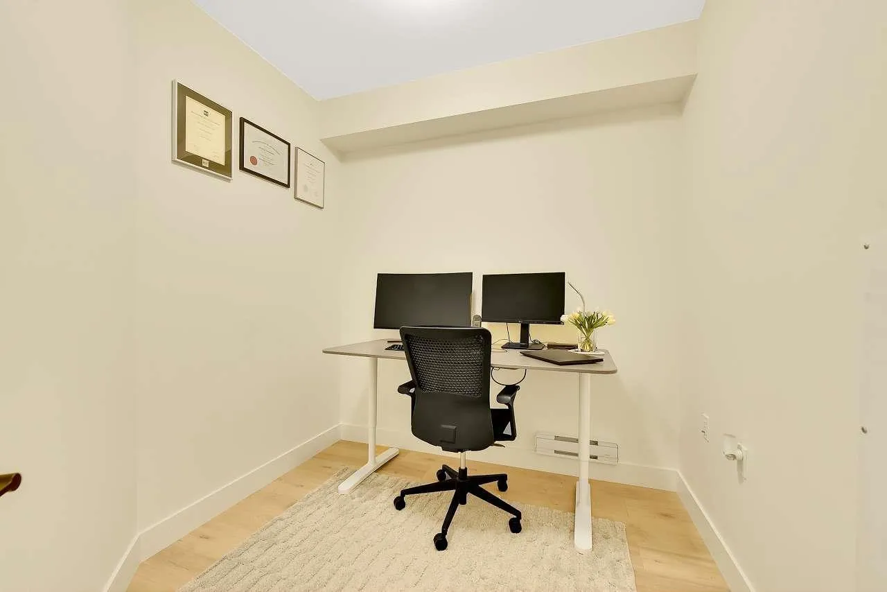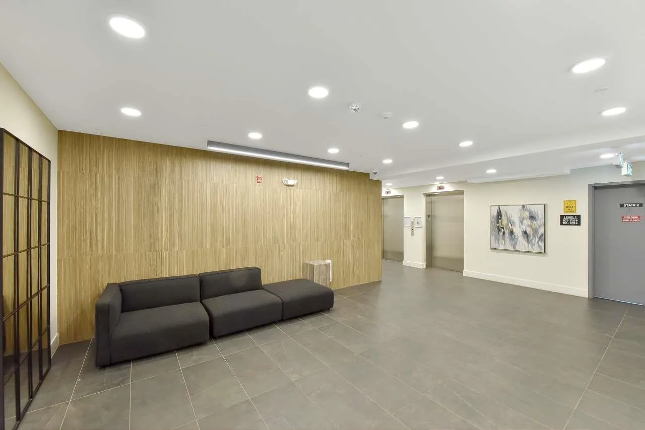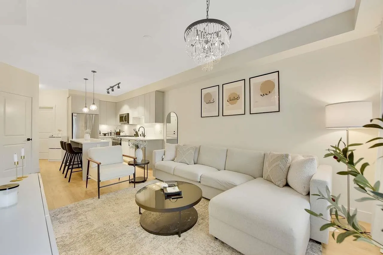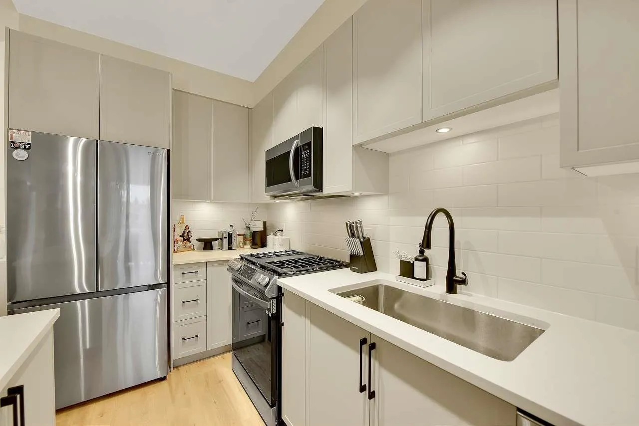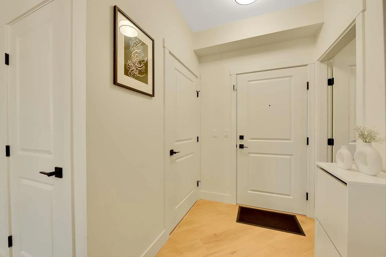 Camden by Award-Winning Zenterra! Step into this bright and modern 1 1-bedroom+den condo located in the heart of Langley's thriving Willoughby neighborhood. This meticulously designed home offers 677 sq ft of smart, functional living space-perfect for first-time buyers, professionals, or investors. The open-concept layout features a sleek, designer kitchen with quartz countertops, stainless steel Samsung appliances, and soft-close cabinetry, flowing into a spacious living area with large windows that fill the home with natural light. Den is perfect for a home office, nursery, or extra storage, W. facing balcony. The spacious bedroom fits a king-sized bed, and the modern 4-piece bathroom is styled with premium fixtures. 1 parking & Storage, Pets ok, built-in piping for AC. (id:27476)