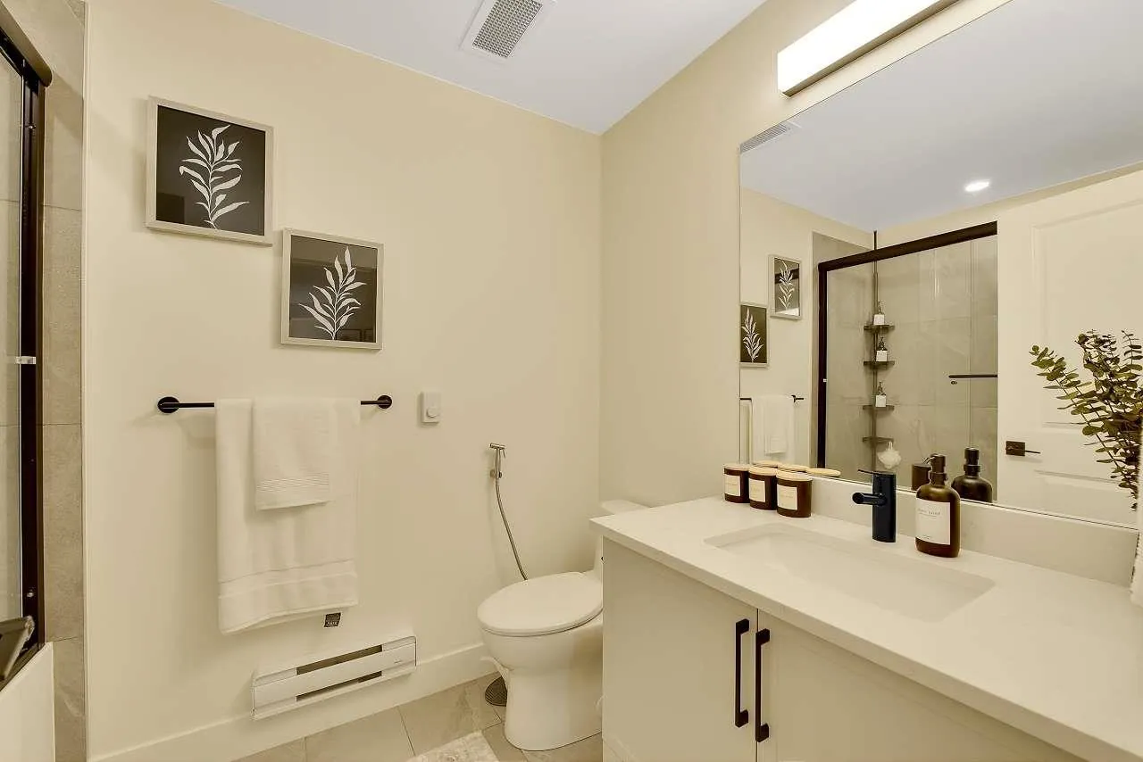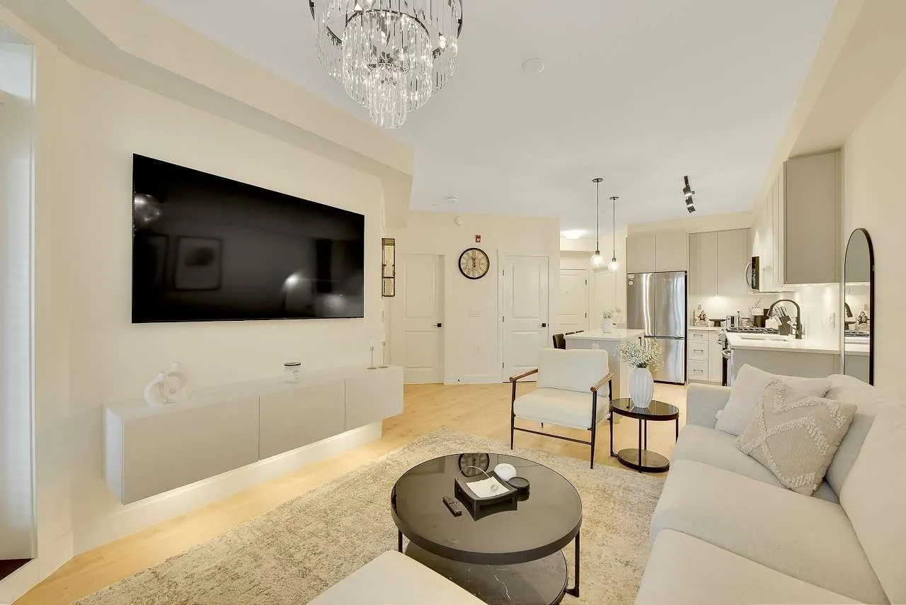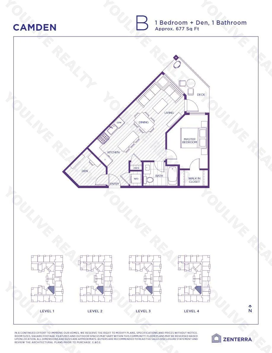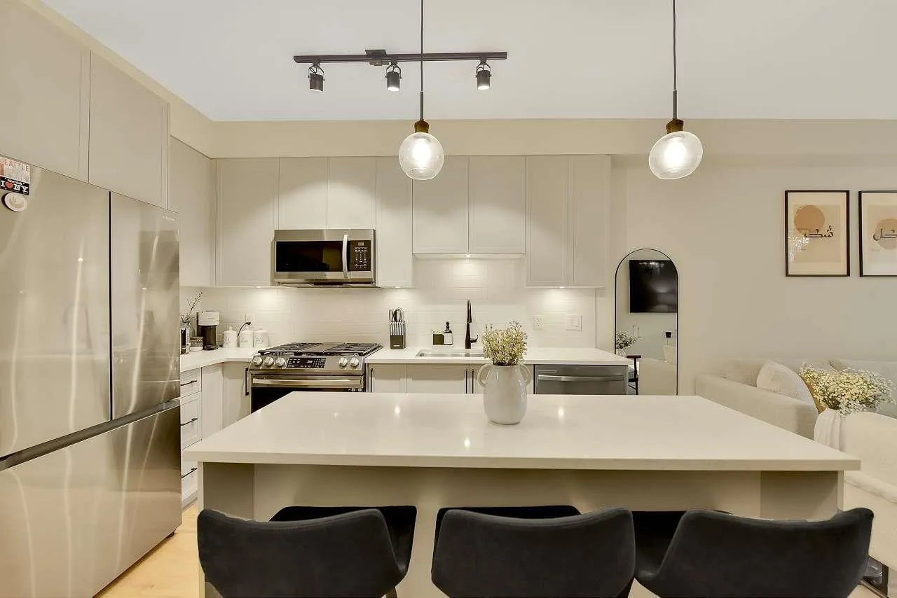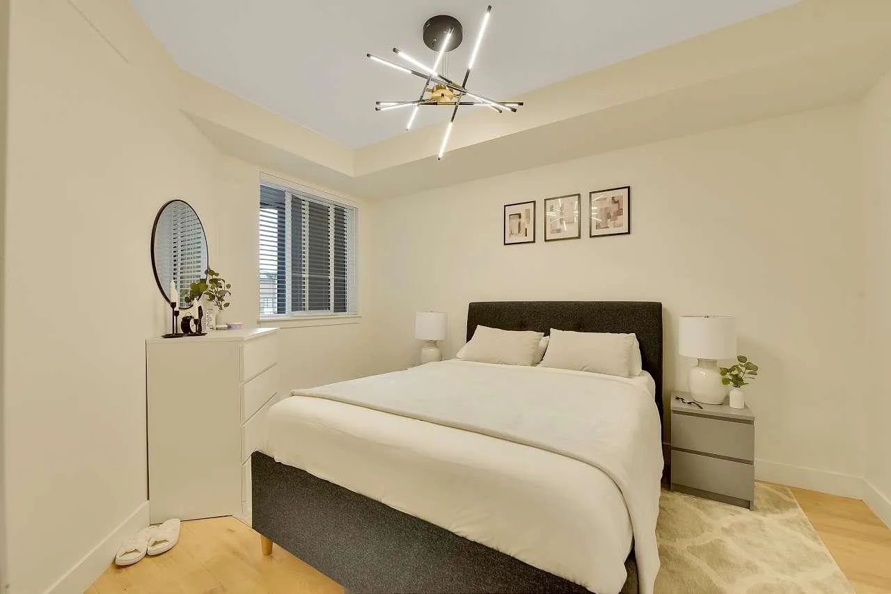 Camden by Award-Winning Zenterra! Step into this bright and modern 1 1-bedroom+den condo located in the heart of Langley's thriving Willoughby neighborhood. This meticulously designed home offers 677 sq ft of smart, functional living space-perfect for first-time buyers, professionals, or investors. The open-concept layout features a sleek, designer kitchen with quartz countertops, stainless steel Samsung appliances, and soft-close cabinetry, flowing into a spacious living area with large windows that fill the home with natural light. Den is perfect for a home office, nursery, or extra storage, W. facing balcony. The spacious bedroom fits a king-sized bed, and the modern 4-piece bathroom is styled with premium fixtures. 1 parking & Storage, Pets ok, built-in piping for AC. (id:27476)