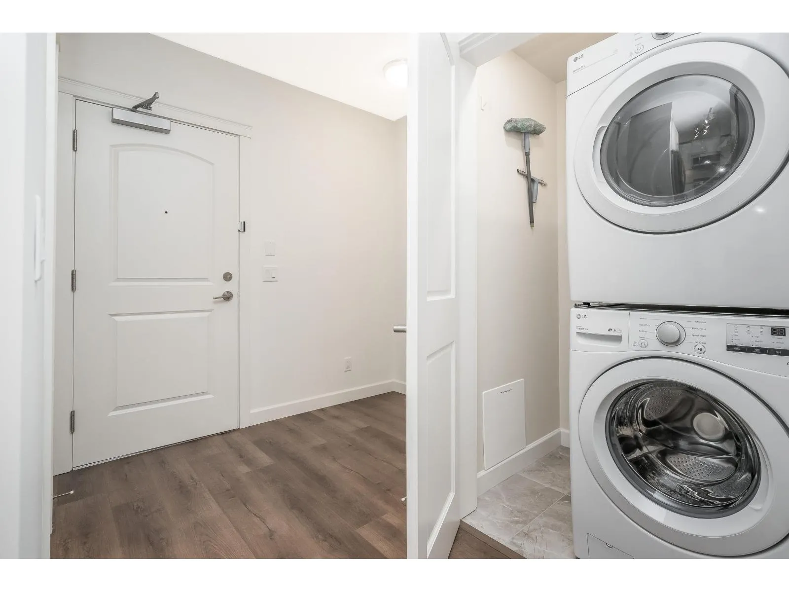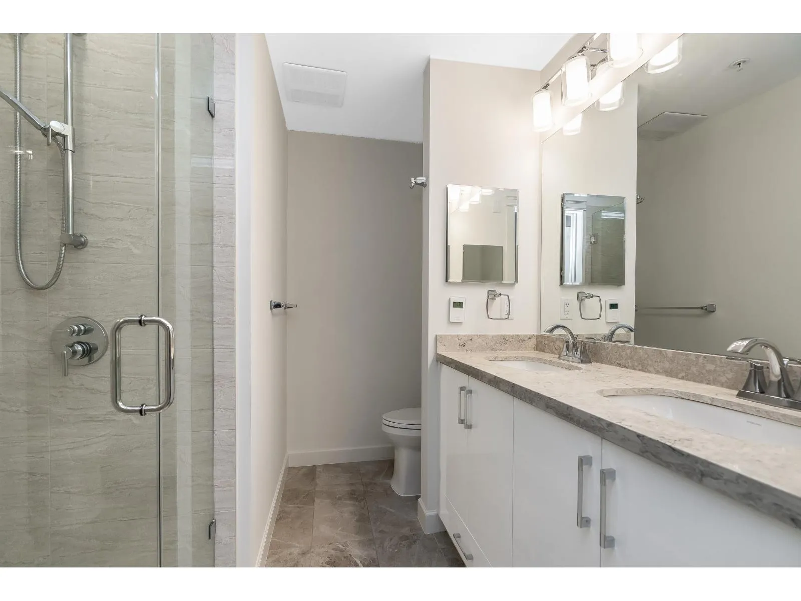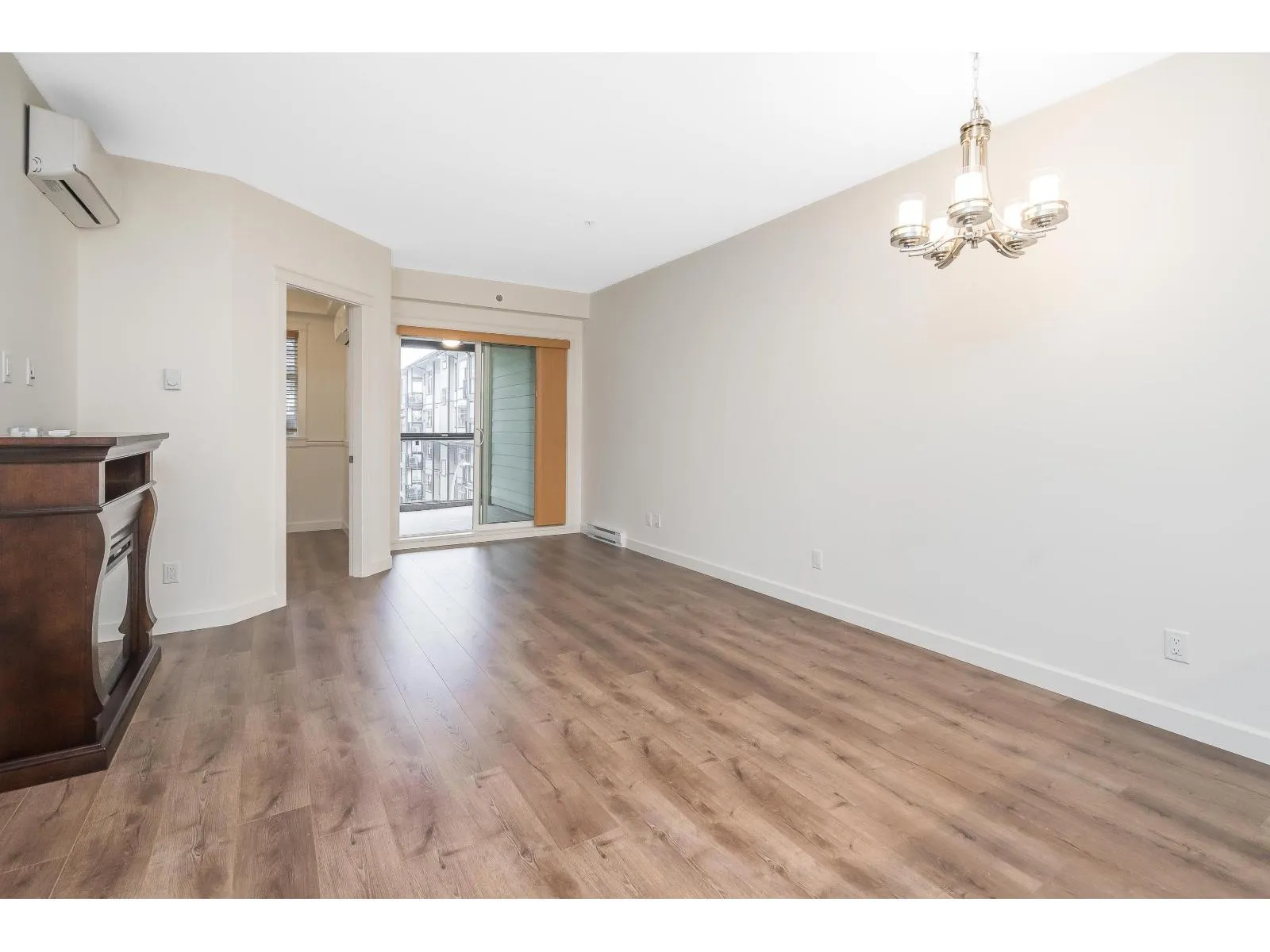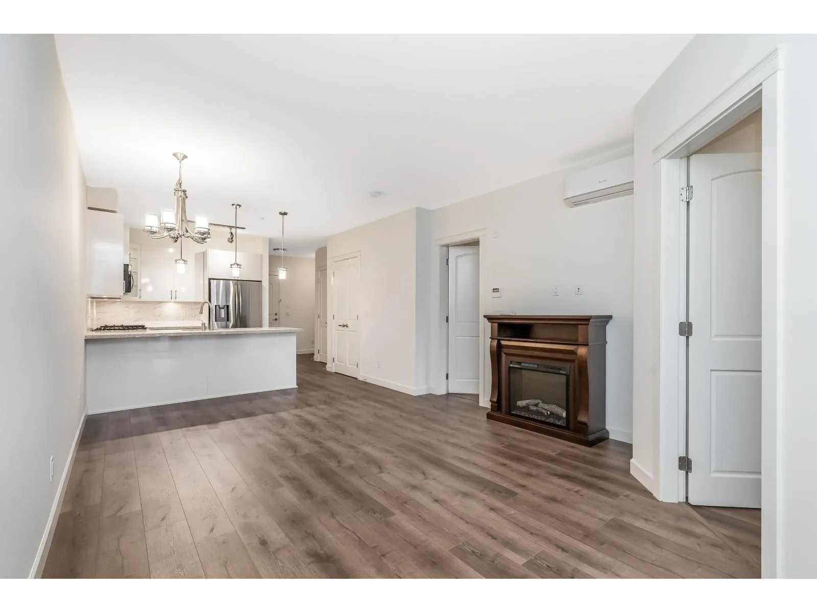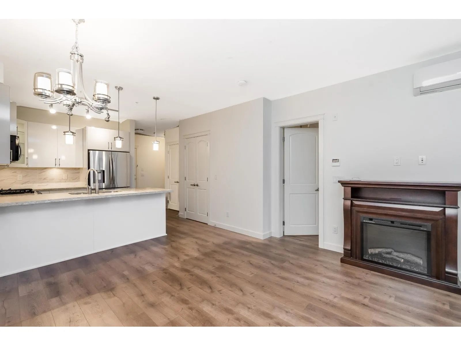 This bright 2-bedroom + den, 2-bathroom home offers over 1,000 sq. ft. of open-concept living with 9' ceilings, large windows, and engineered hardwood floors. The gourmet kitchen features granite counters, stainless steel appliances, and a central island. Enjoy a spacious living/dining area with fireplace and access to a covered balcony. The primary suite includes a walk-in closet and ensuite with heated floors, double sinks, glass shower, and soaker tub. A second bedroom, versatile den, full bathroom, air conditioning, and in-suite laundry add comfort. Rent includes 2 secure parking stalls and a large storage locker. Yorkson Creek provides a fitness centre, amenity room, and landscaped grounds. Steps to Willoughby Town Centre, schools, - Yorkson Creek Middle & R.E. Mountain Secondary! (id:27476)