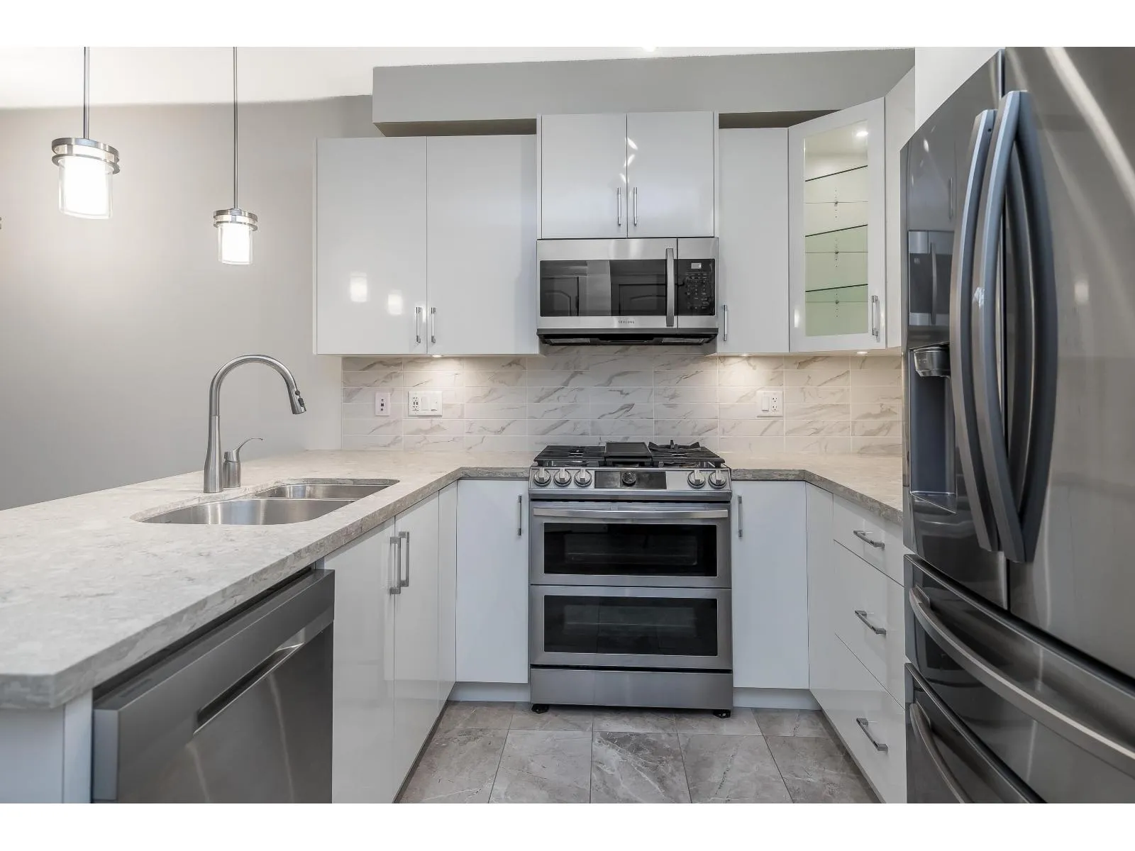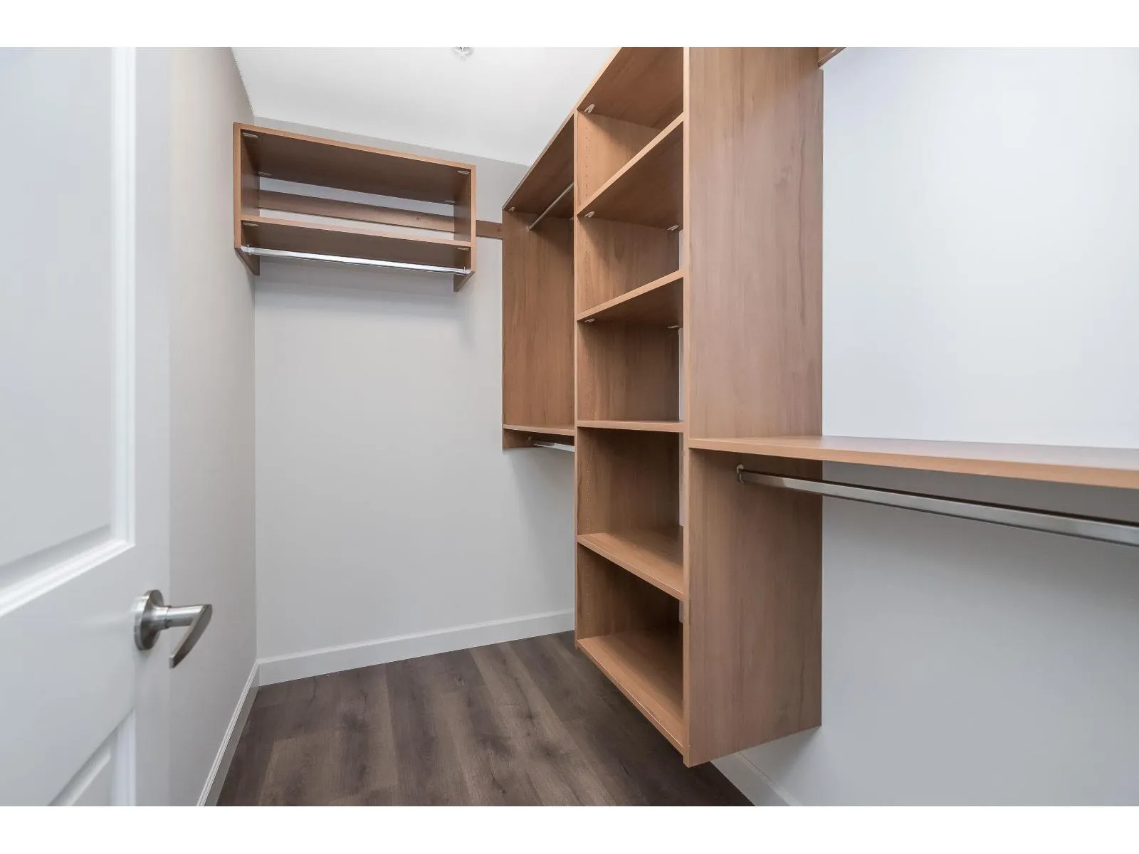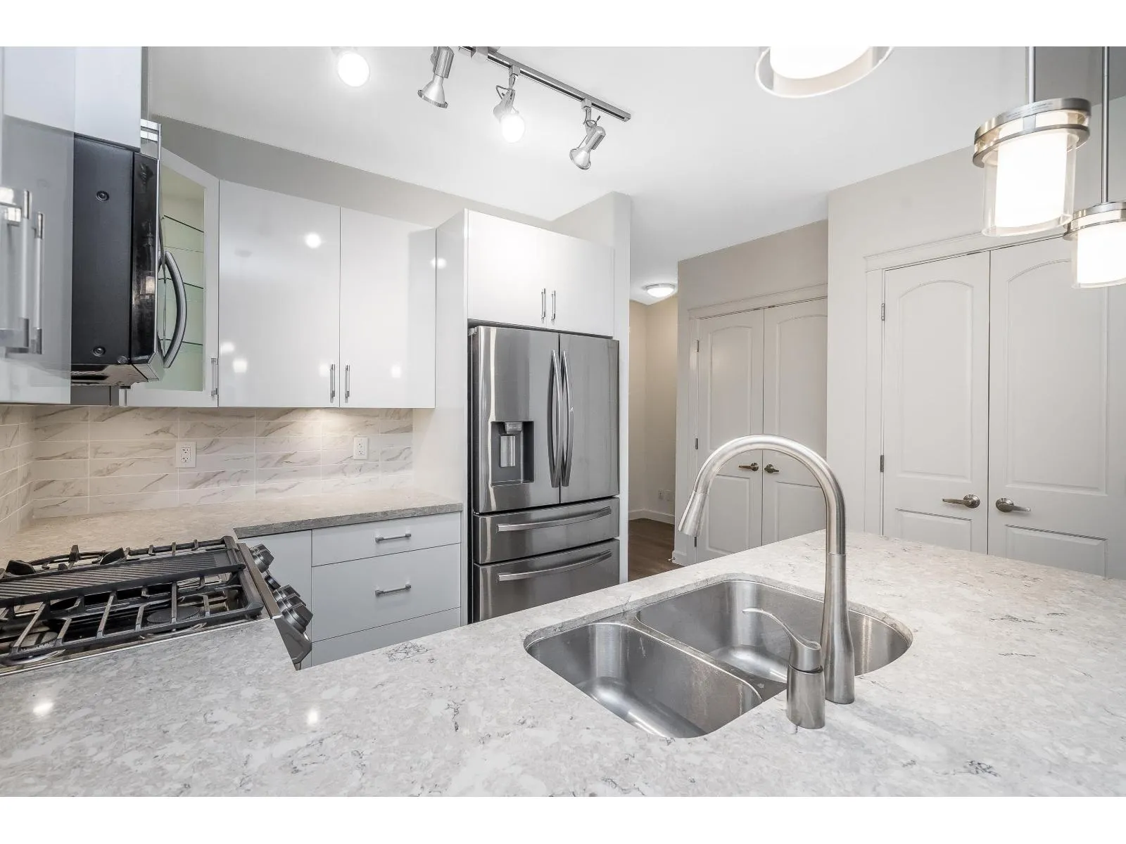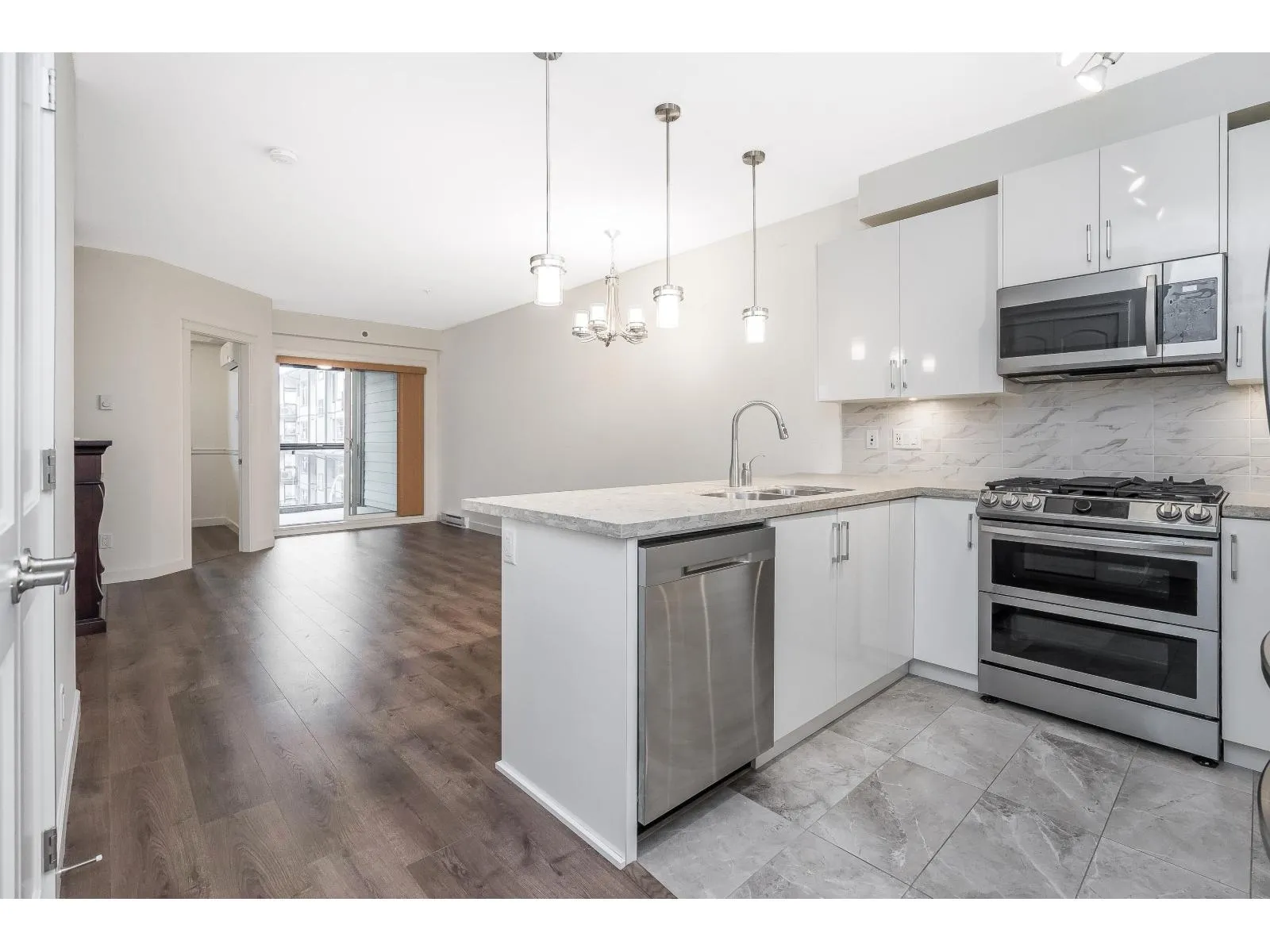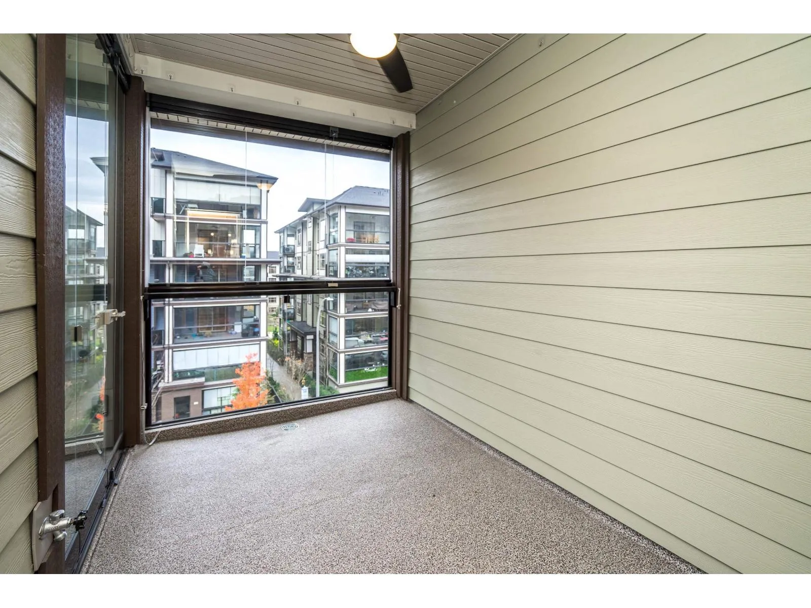 This bright 2-bedroom + den, 2-bathroom home offers over 1,000 sq. ft. of open-concept living with 9' ceilings, large windows, and engineered hardwood floors. The gourmet kitchen features granite counters, stainless steel appliances, and a central island. Enjoy a spacious living/dining area with fireplace and access to a covered balcony. The primary suite includes a walk-in closet and ensuite with heated floors, double sinks, glass shower, and soaker tub. A second bedroom, versatile den, full bathroom, air conditioning, and in-suite laundry add comfort. Rent includes 2 secure parking stalls and a large storage locker. Yorkson Creek provides a fitness centre, amenity room, and landscaped grounds. Steps to Willoughby Town Centre, schools, - Yorkson Creek Middle & R.E. Mountain Secondary! (id:27476)