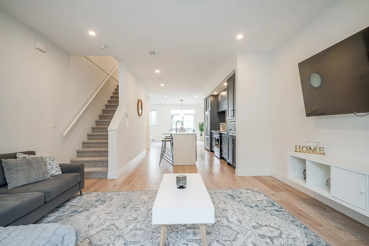 This well-maintained 4-bedroom townhome in the Ascent complex offers over 1,700 sq ft of stylish, functional living space. The entry-level includes a private bedroom with a full bathroom-perfect for guests or a home office. The main floor features two flexible living areas and a modern kitchen with navy cabinets, gold hardware, quartz counters, and a Whirlpool appliance package. Plush carpet and wide plank laminate flooring complete the look. Upstairs are three spacious bedrooms, including a primary suite with his and hers closets. Enjoy greenery views from the back deck, just five minutes from all Willowbrook amenities. MUST SEE! (id:27476)