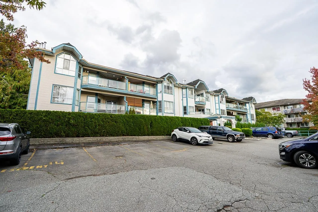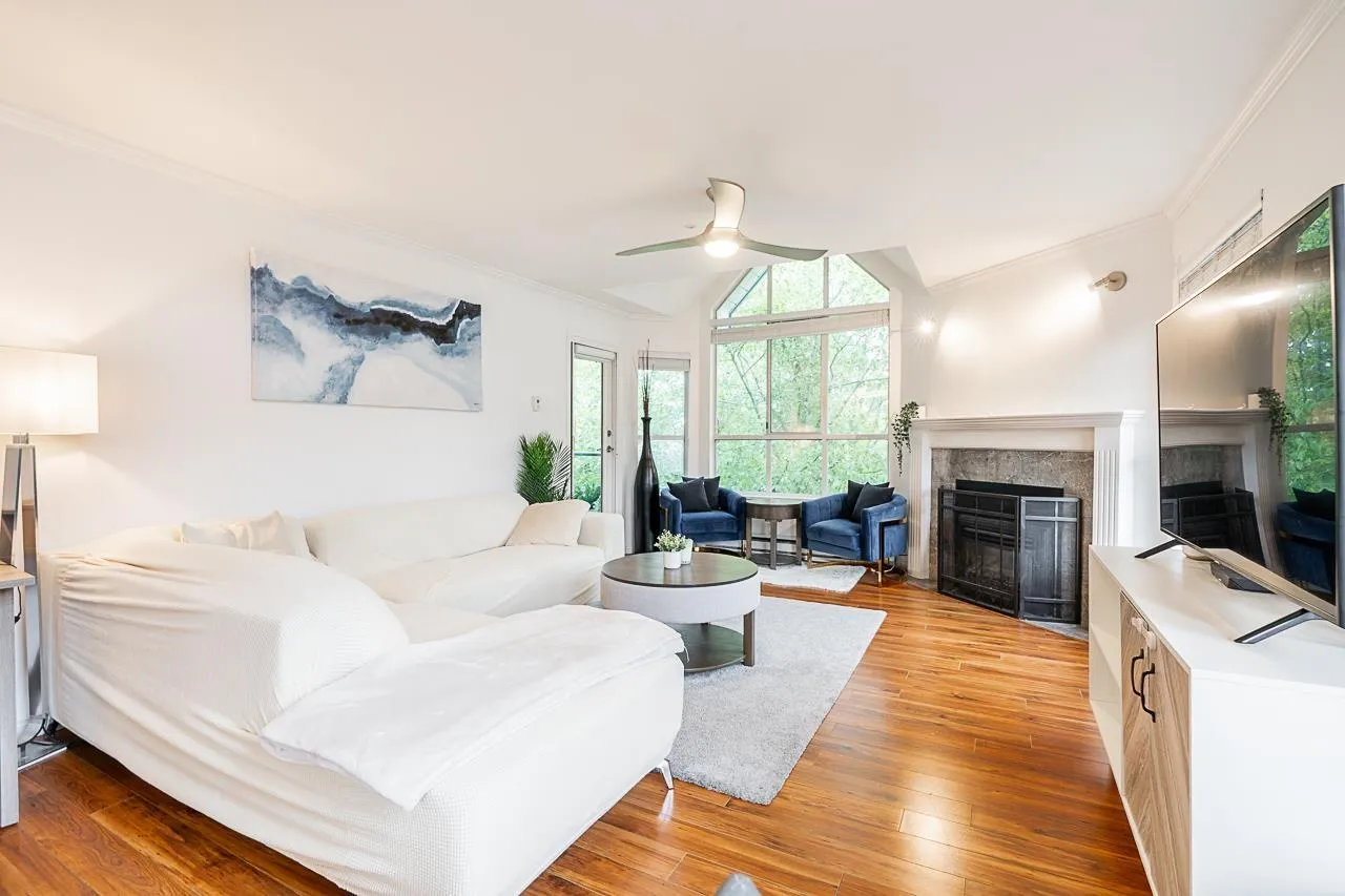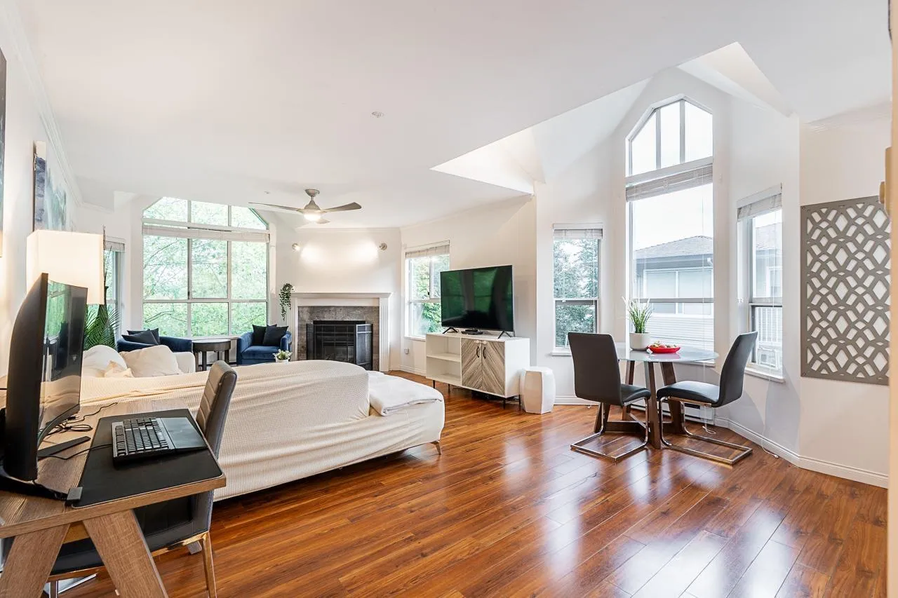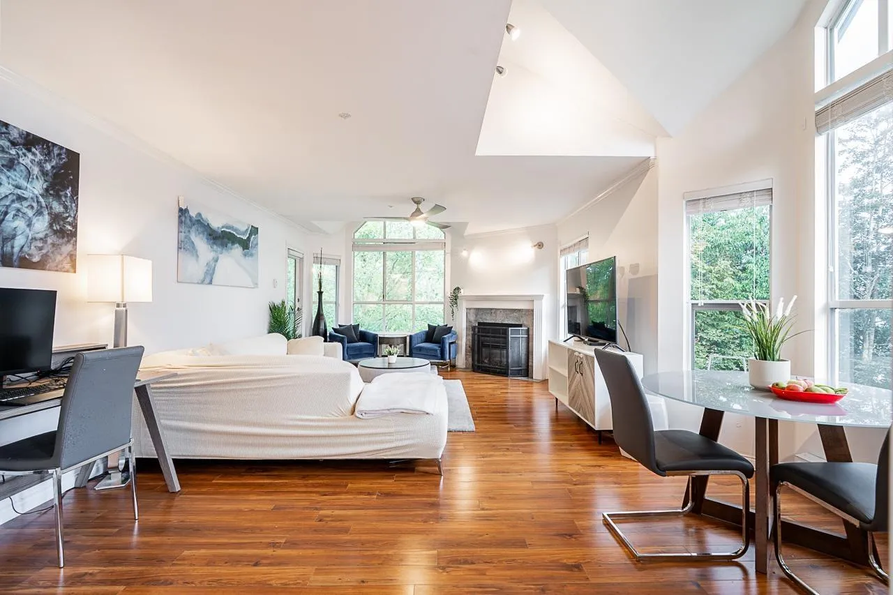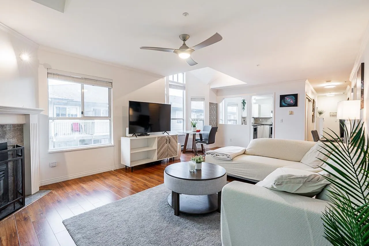 Welcome to Cambridge Court, a spacious top-floor corner home offering 1,228 sq. ft. of bright and airy living. Vaulted ceilings and oversized windows fill the space with natural light, while the east-facing balcony is perfect for your morning coffee or relaxing after work. This well-maintained 2 bedroom, 2 bathroom layout features a generous living and dining area, cozy gas fireplace, full-size laundry room, and heated bathroom floors for year-round comfort. The proactive, well-managed strata includes gas and hot water in your maintenance fee. Ideally located within walking distance to shopping, restaurants, parks, and transit, just minutes from the future SkyTrain station. One secure underground parking stall included. Move-in ready, book your private tour today! (id:27476)