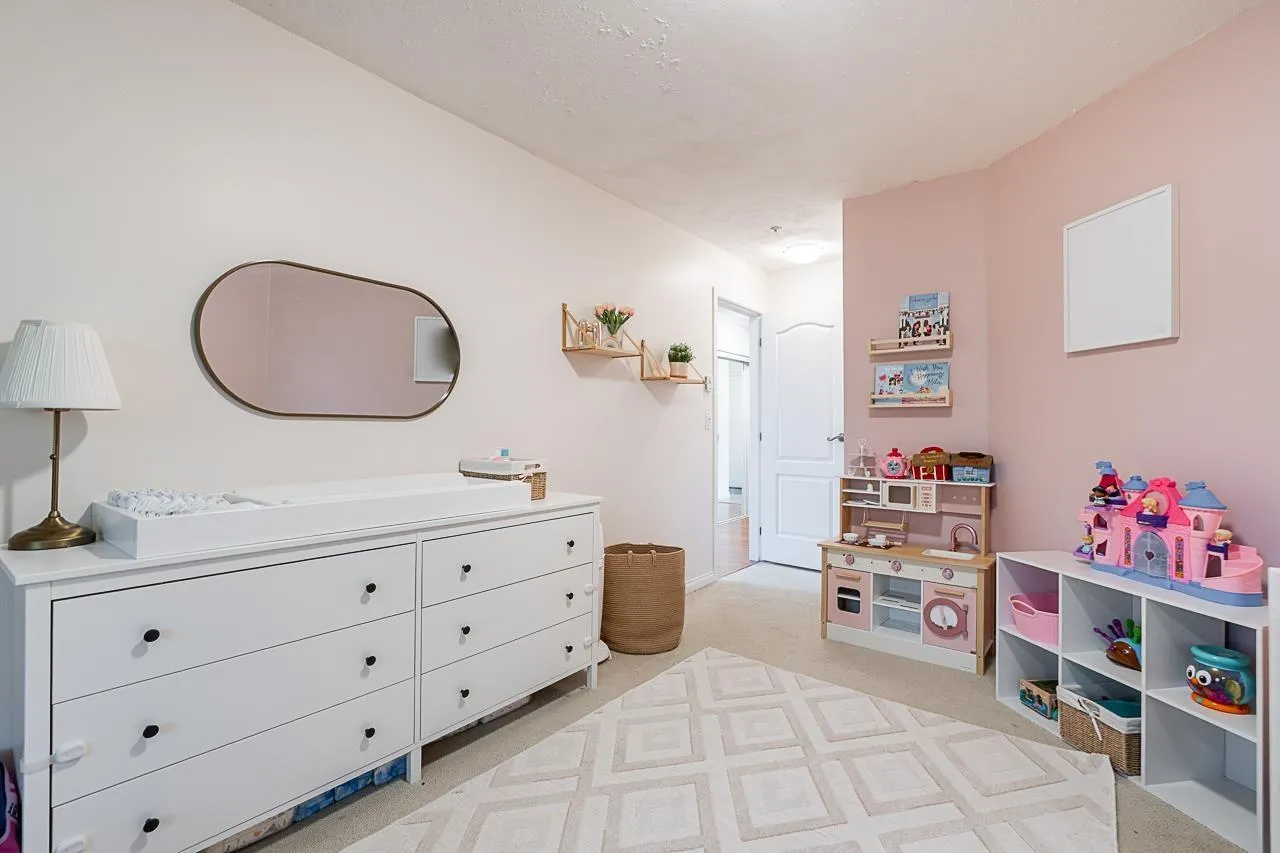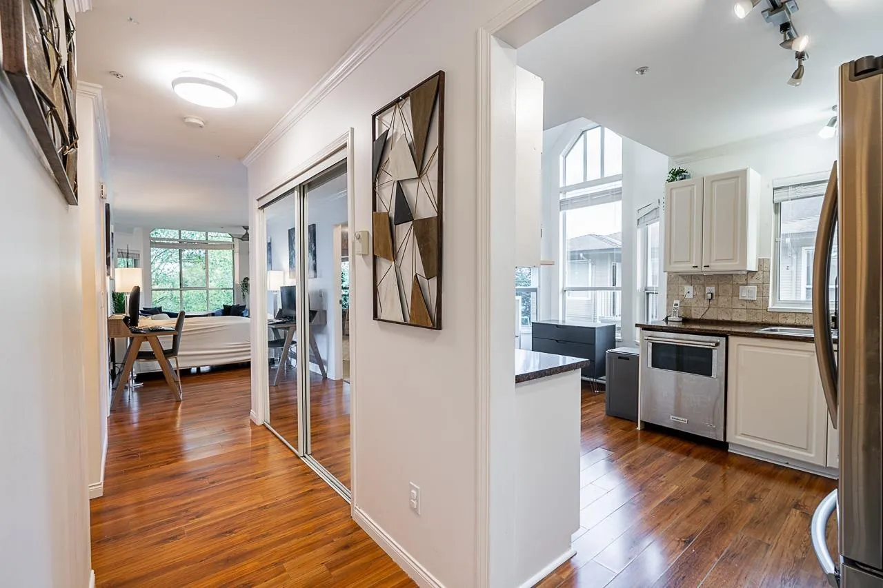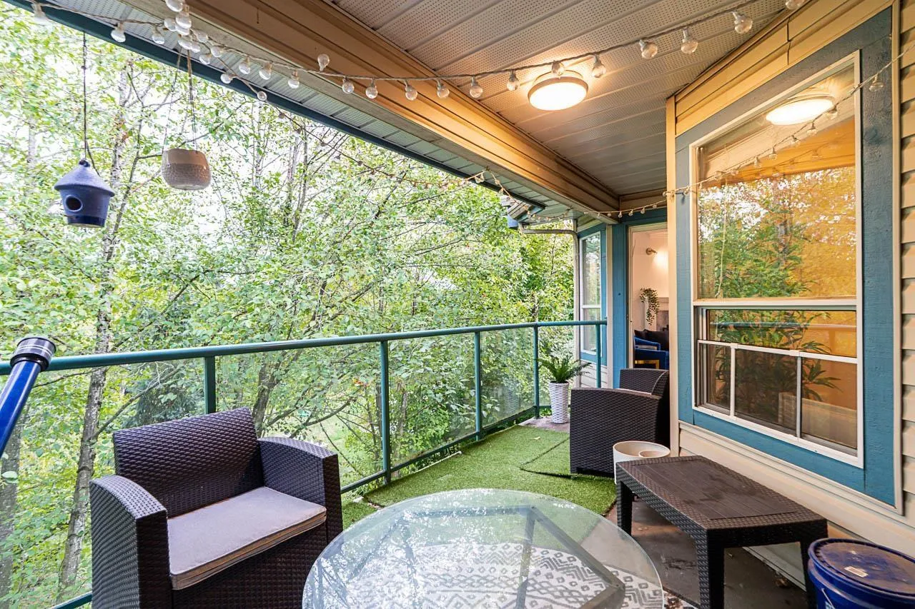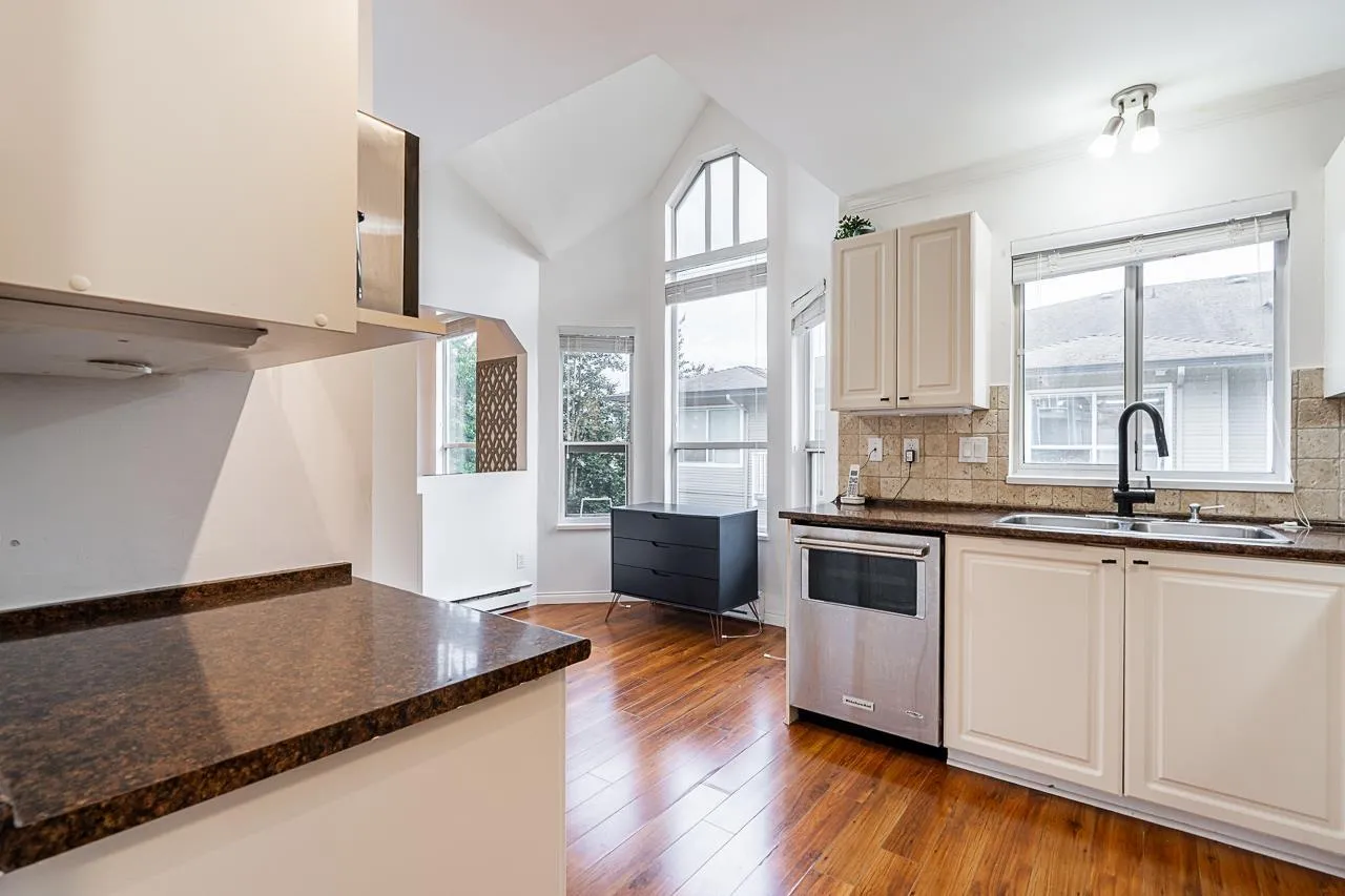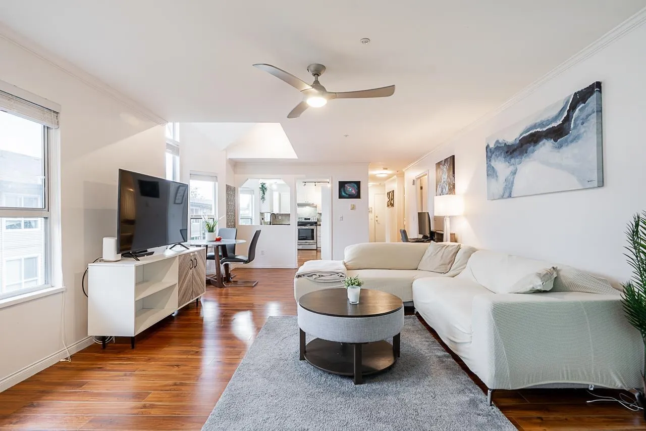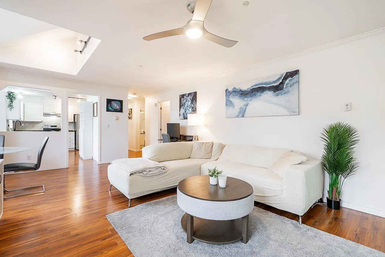 Welcome to Cambridge Court, a spacious top-floor corner home offering 1,228 sq. ft. of bright and airy living. Vaulted ceilings and oversized windows fill the space with natural light, while the east-facing balcony is perfect for your morning coffee or relaxing after work. This well-maintained 2 bedroom, 2 bathroom layout features a generous living and dining area, cozy gas fireplace, full-size laundry room, and heated bathroom floors for year-round comfort. The proactive, well-managed strata includes gas and hot water in your maintenance fee. Ideally located within walking distance to shopping, restaurants, parks, and transit, just minutes from the future SkyTrain station. One secure underground parking stall included. Move-in ready, book your private tour today! (id:27476)