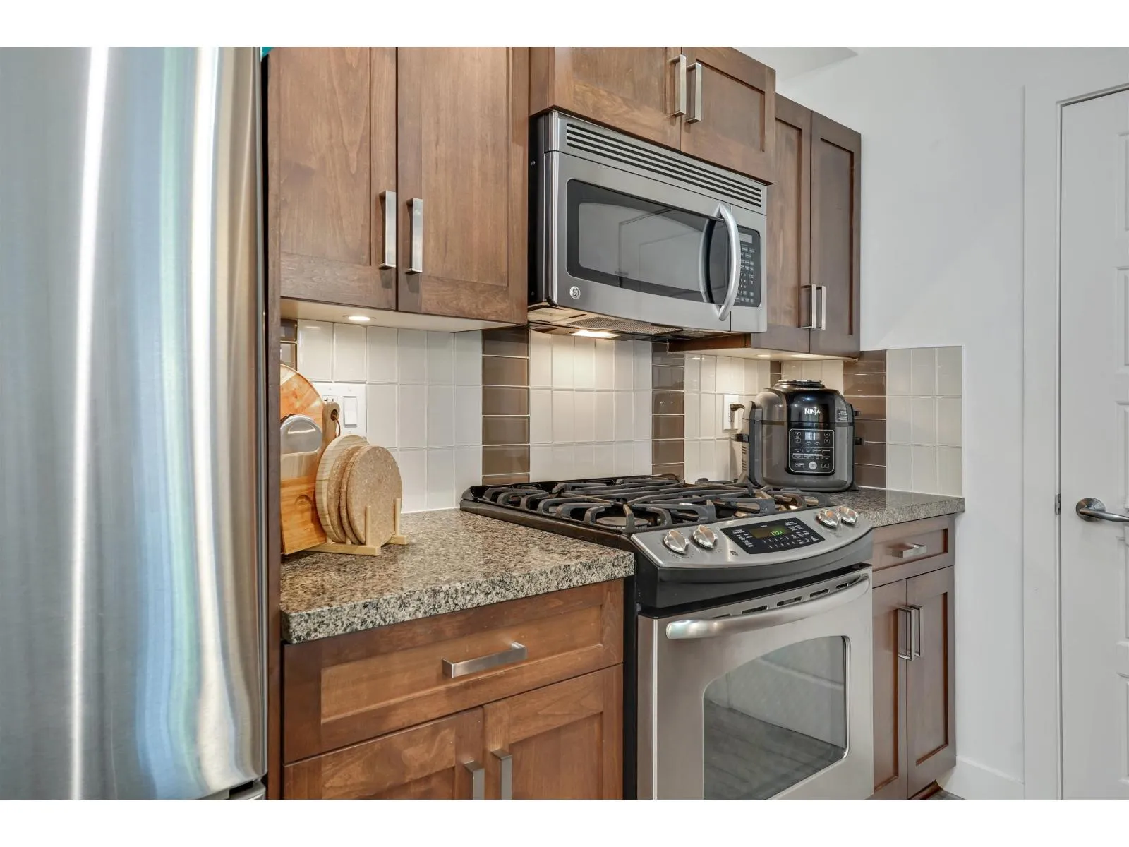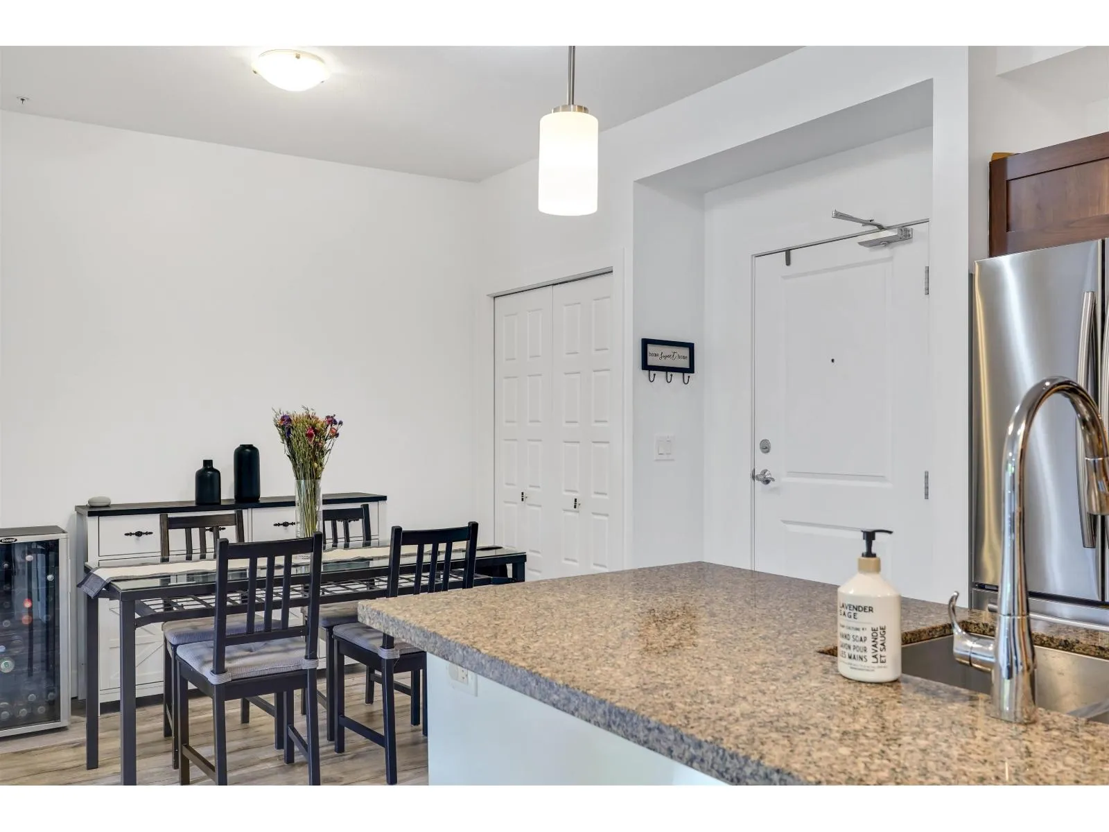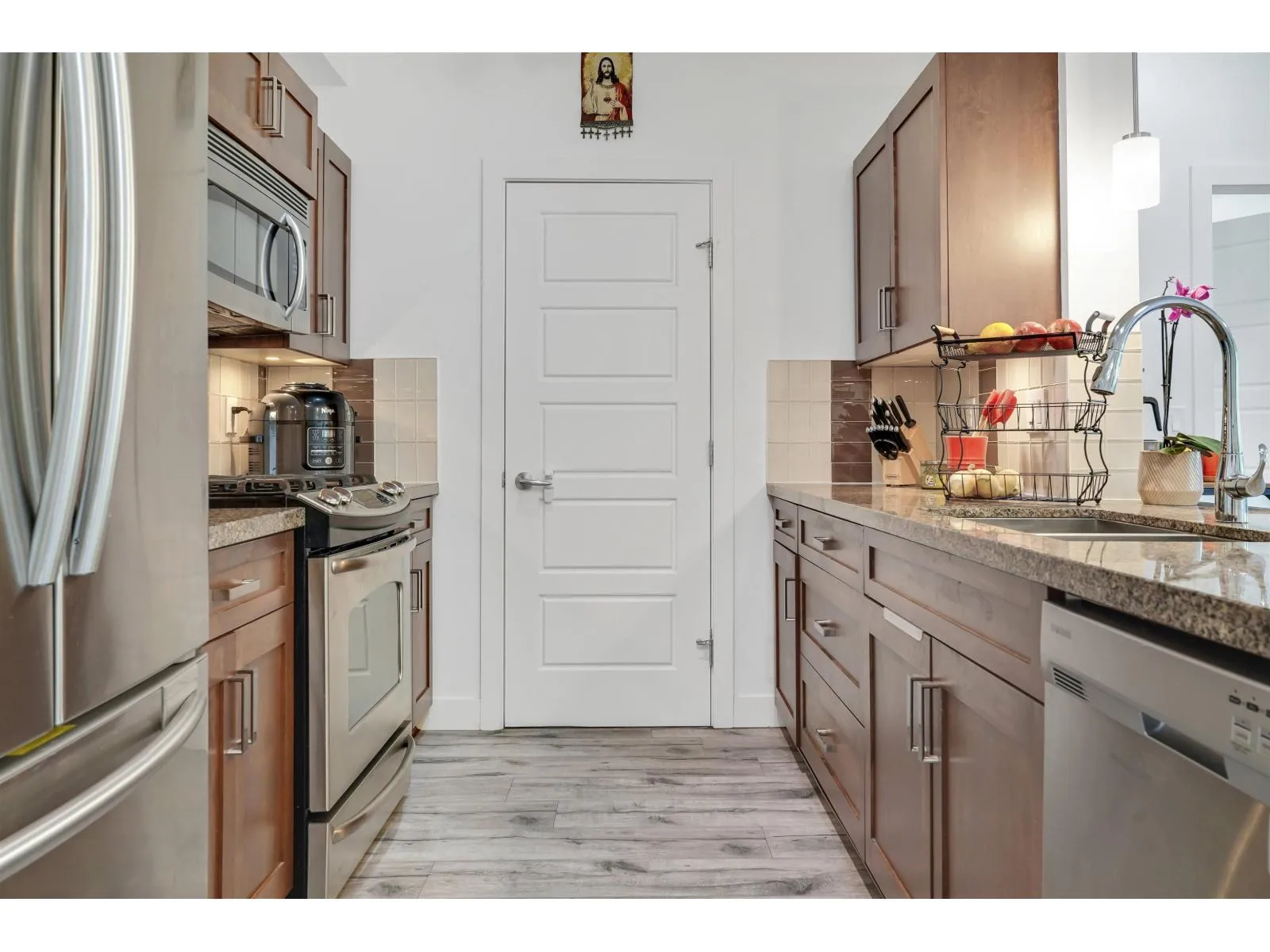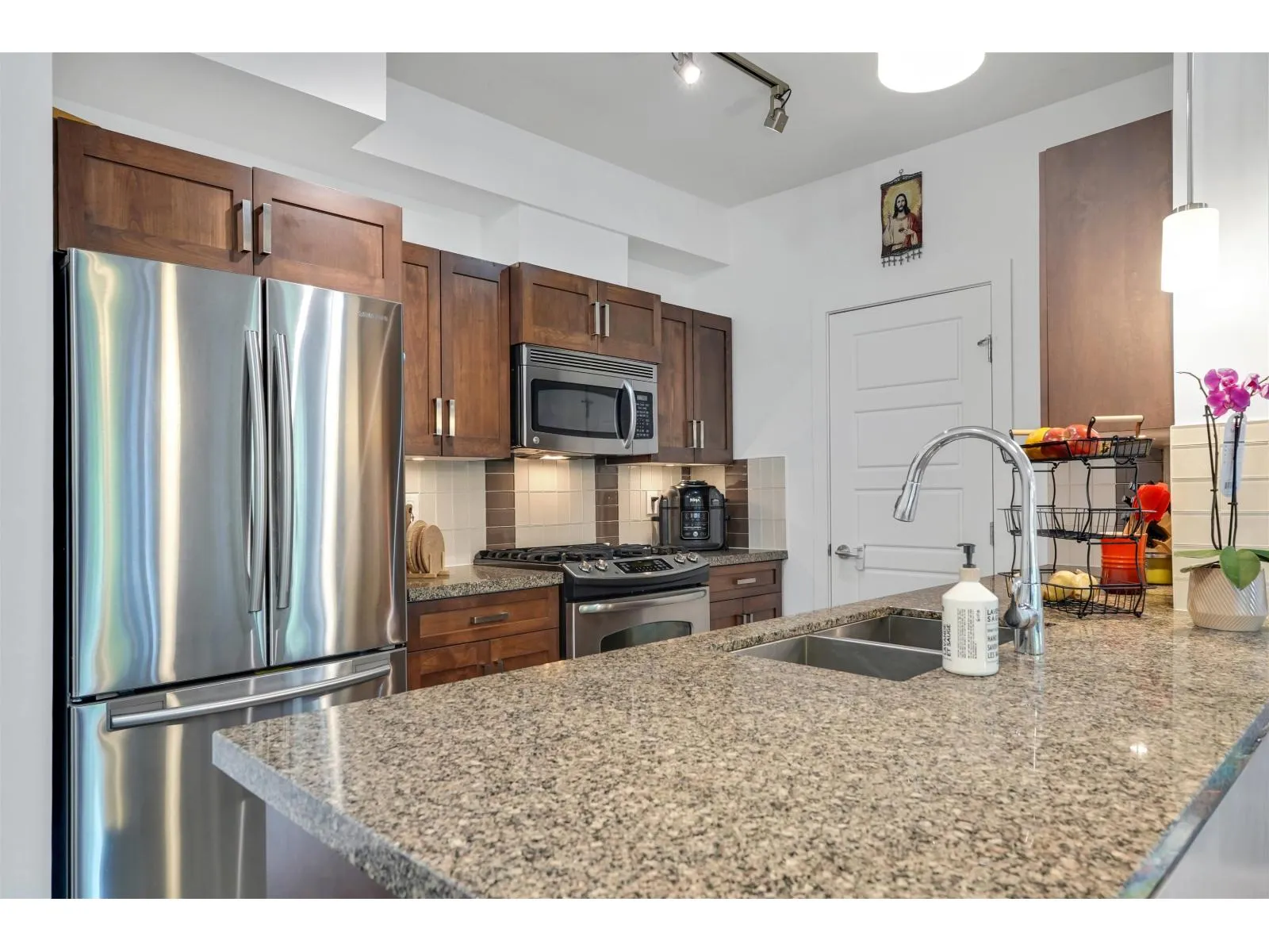 Welcome to VARSITY, the most popular complex in the heart of Langley City! Centrally located and walking distance to shopping, restaurants, schools, transit and amenities, Varsity is just steps away to the upcoming sky train line in Langley. In a gated community and with a safe underground parking, this 2 bed + 2 bath condo features an open layout, new laminate flooring all throughout, stainless steel appliances, granite countertops, ceiling fans, new light fixtures in the kitchen and bathrooms, smart thermostats and smart switches. A private setting plus a great location facing North East makes this property an excellent starter home, upgrade or investment property. This is a corner unit on 2nd floor and no unit underneath. Don't miss this opportunity and book your showing today! (id:27476)