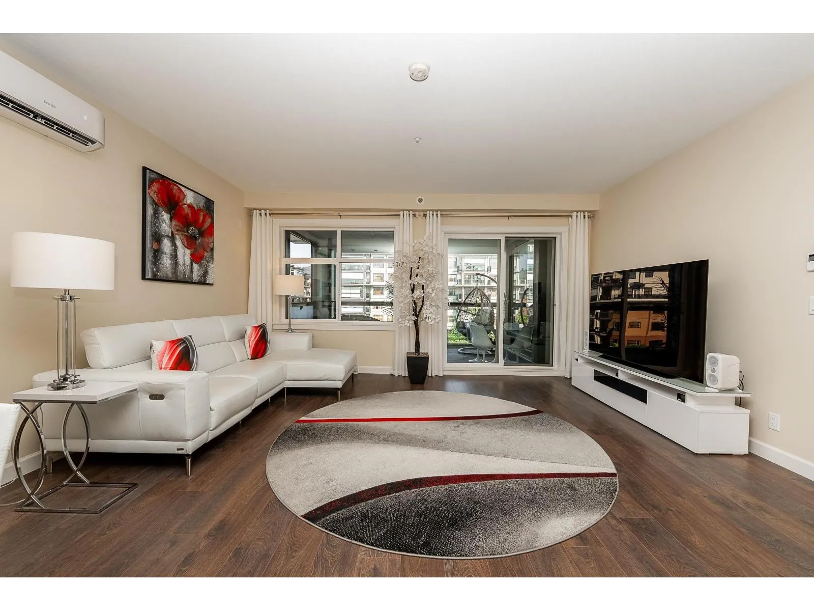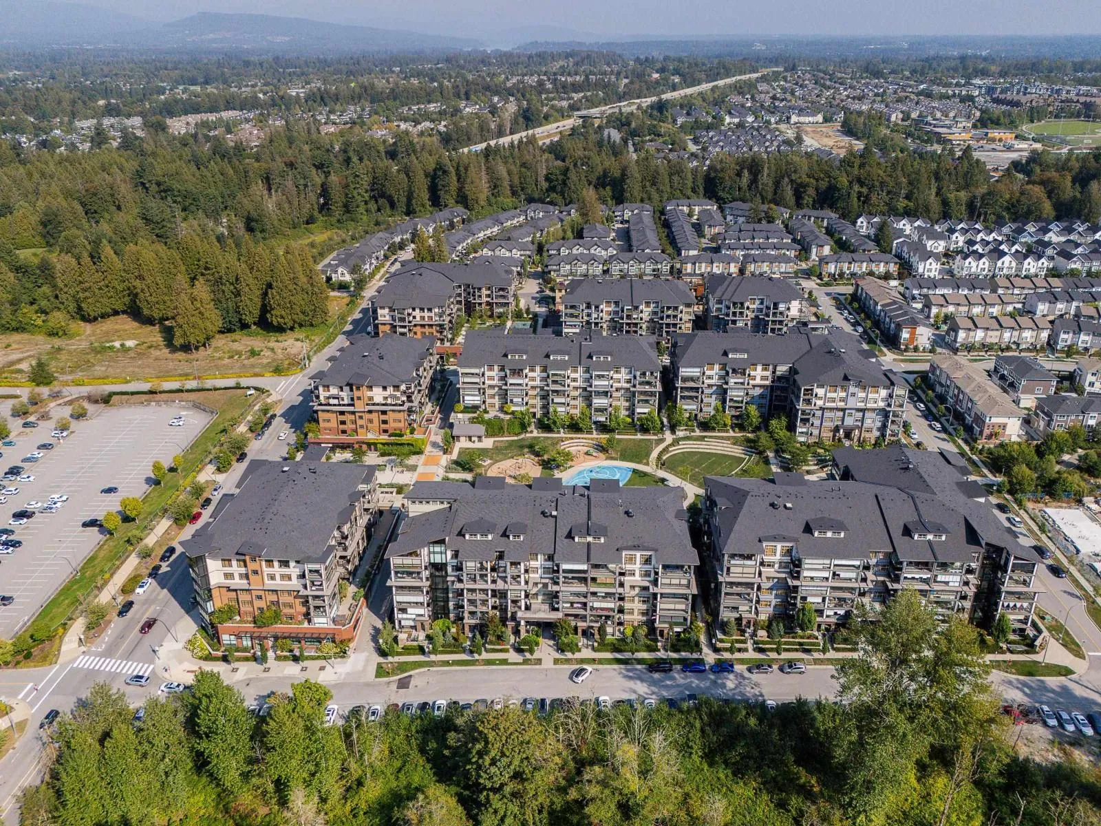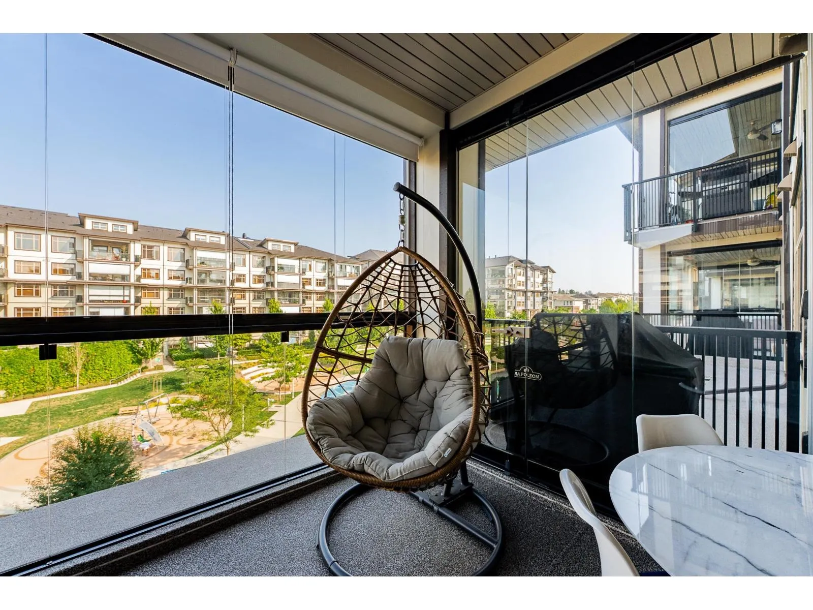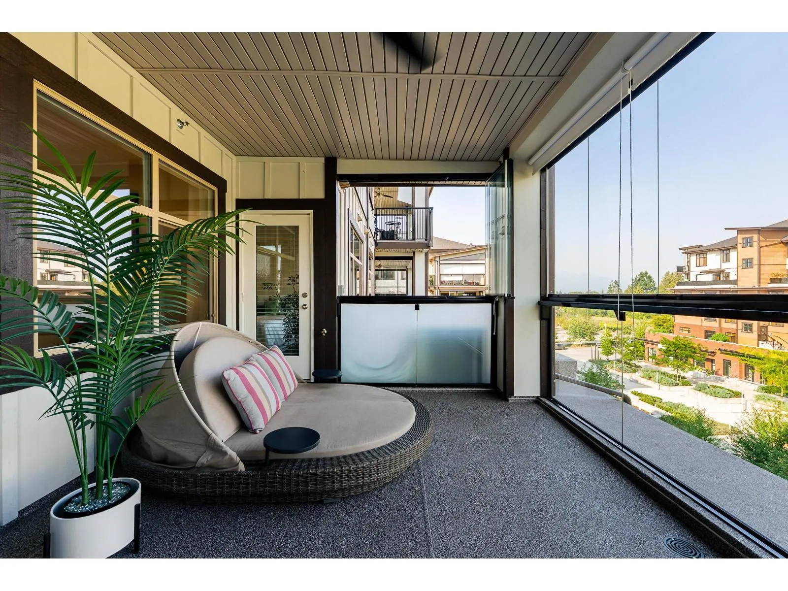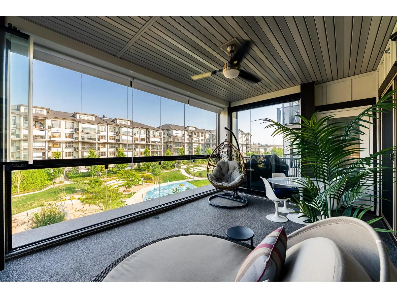 Immaculate and spacious East-facing 3 bedroom + den at sought-after Yorkson Park! Offering 1,583 sq ft of bright and air conditioned living space, plus a 225 sq ft solarium/balcony with retractable glass panels and courtyard views. The gourmet kitchen features a peninsula with seating, gas range and sleek cabinetry, seamlessly connecting to the dining and living area. Designed for year-round enjoyment, the solarium expands your living space. Generous bedrooms include two with luxurious ensuites, double vanities, frameless glass showers, walk-in closets, and access to the solarium. Added features include an energy-efficient heat pump with A/C, gas BBQ hookup, 2 parking stalls, and a storage locker. Conveniently located near Carvolth Exchange, shopping, restaurants, and quick highway access. (id:27476)