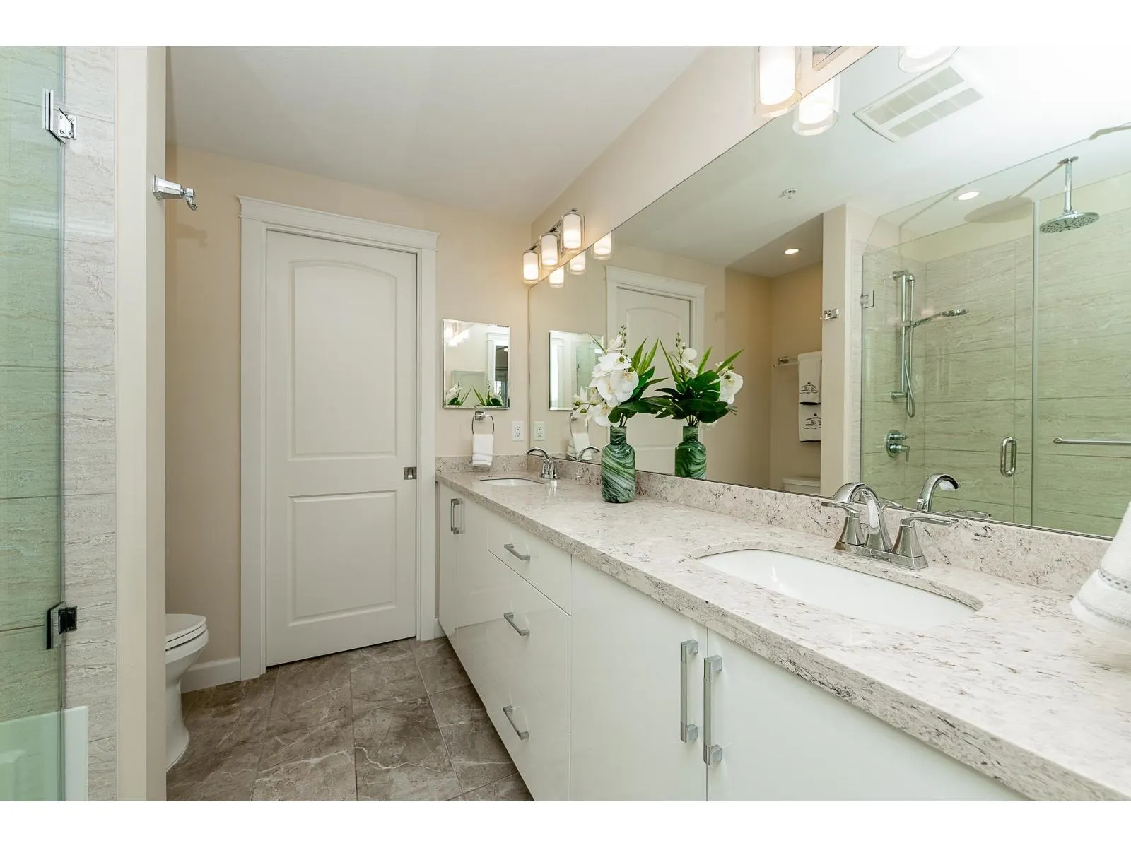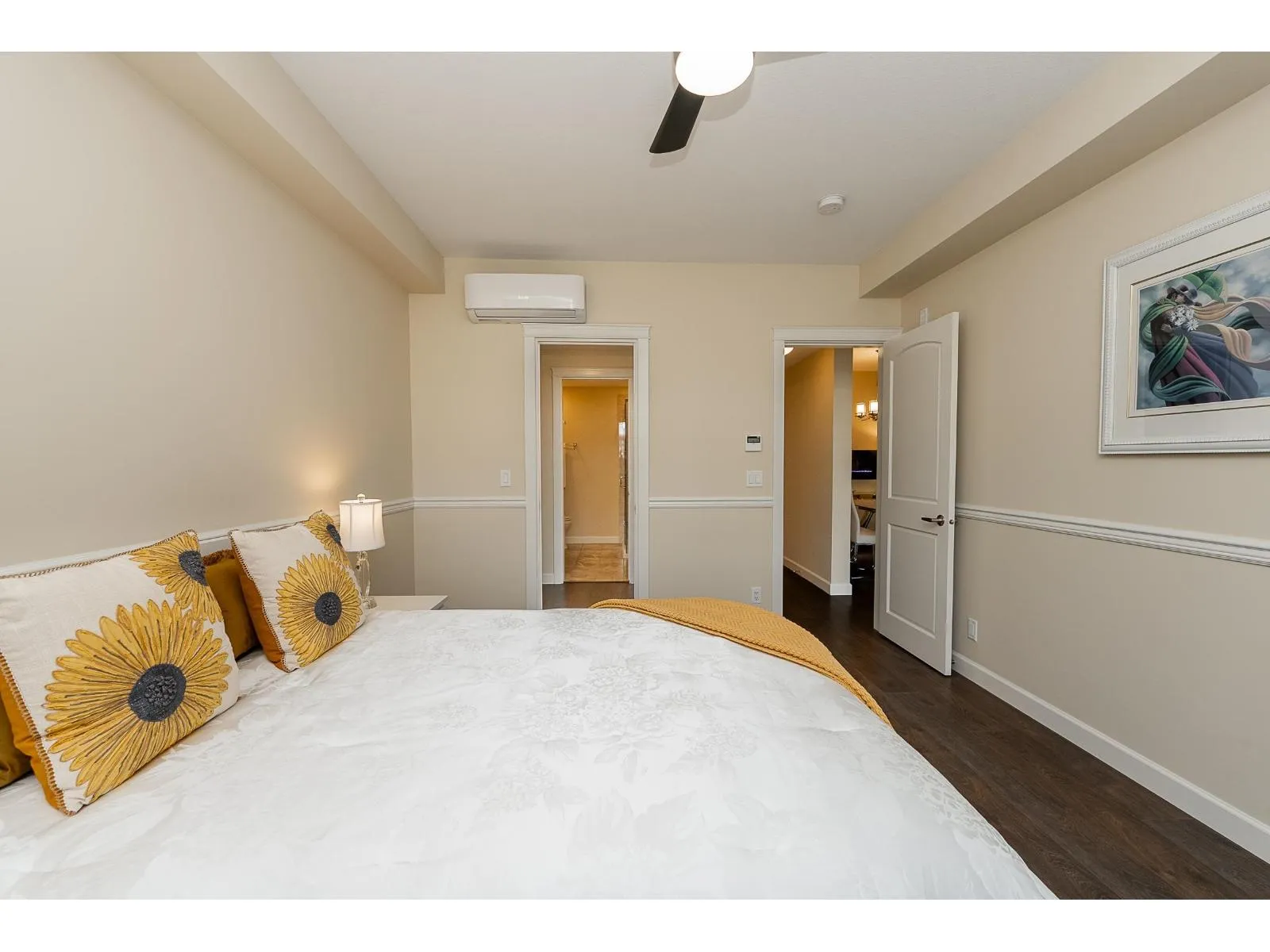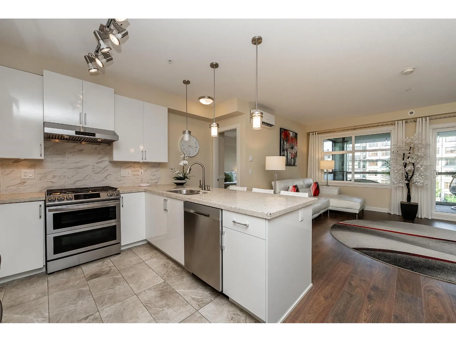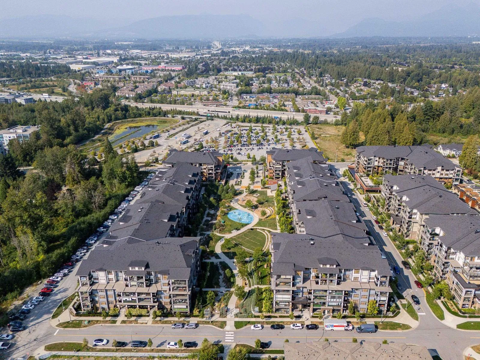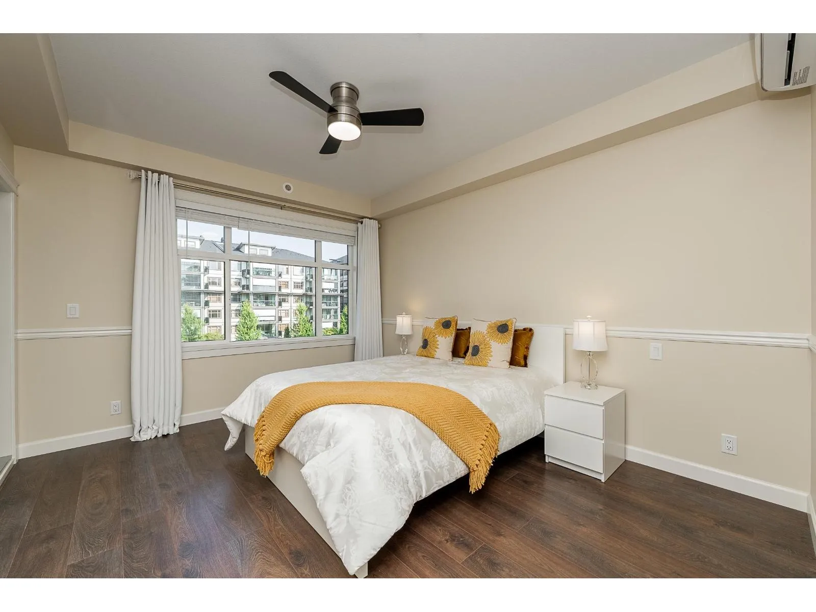 Immaculate and spacious East-facing 3 bedroom + den at sought-after Yorkson Park! Offering 1,583 sq ft of bright and air conditioned living space, plus a 225 sq ft solarium/balcony with retractable glass panels and courtyard views. The gourmet kitchen features a peninsula with seating, gas range and sleek cabinetry, seamlessly connecting to the dining and living area. Designed for year-round enjoyment, the solarium expands your living space. Generous bedrooms include two with luxurious ensuites, double vanities, frameless glass showers, walk-in closets, and access to the solarium. Added features include an energy-efficient heat pump with A/C, gas BBQ hookup, 2 parking stalls, and a storage locker. Conveniently located near Carvolth Exchange, shopping, restaurants, and quick highway access. (id:27476)