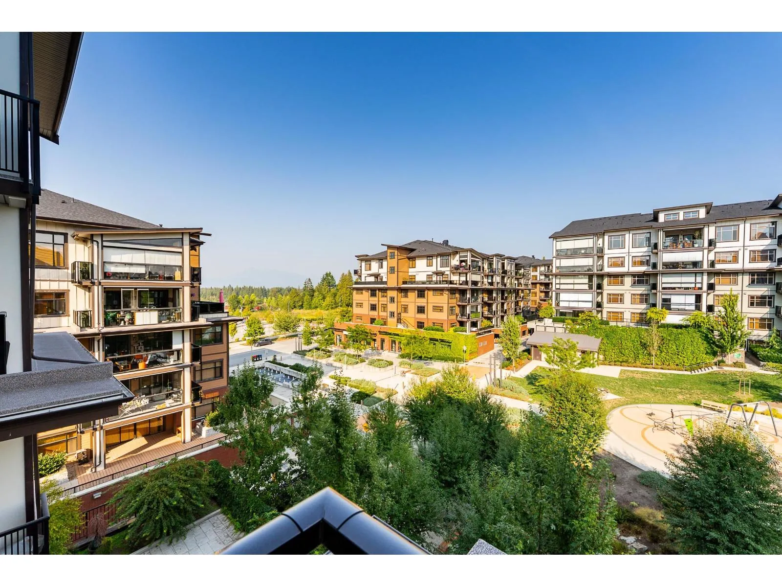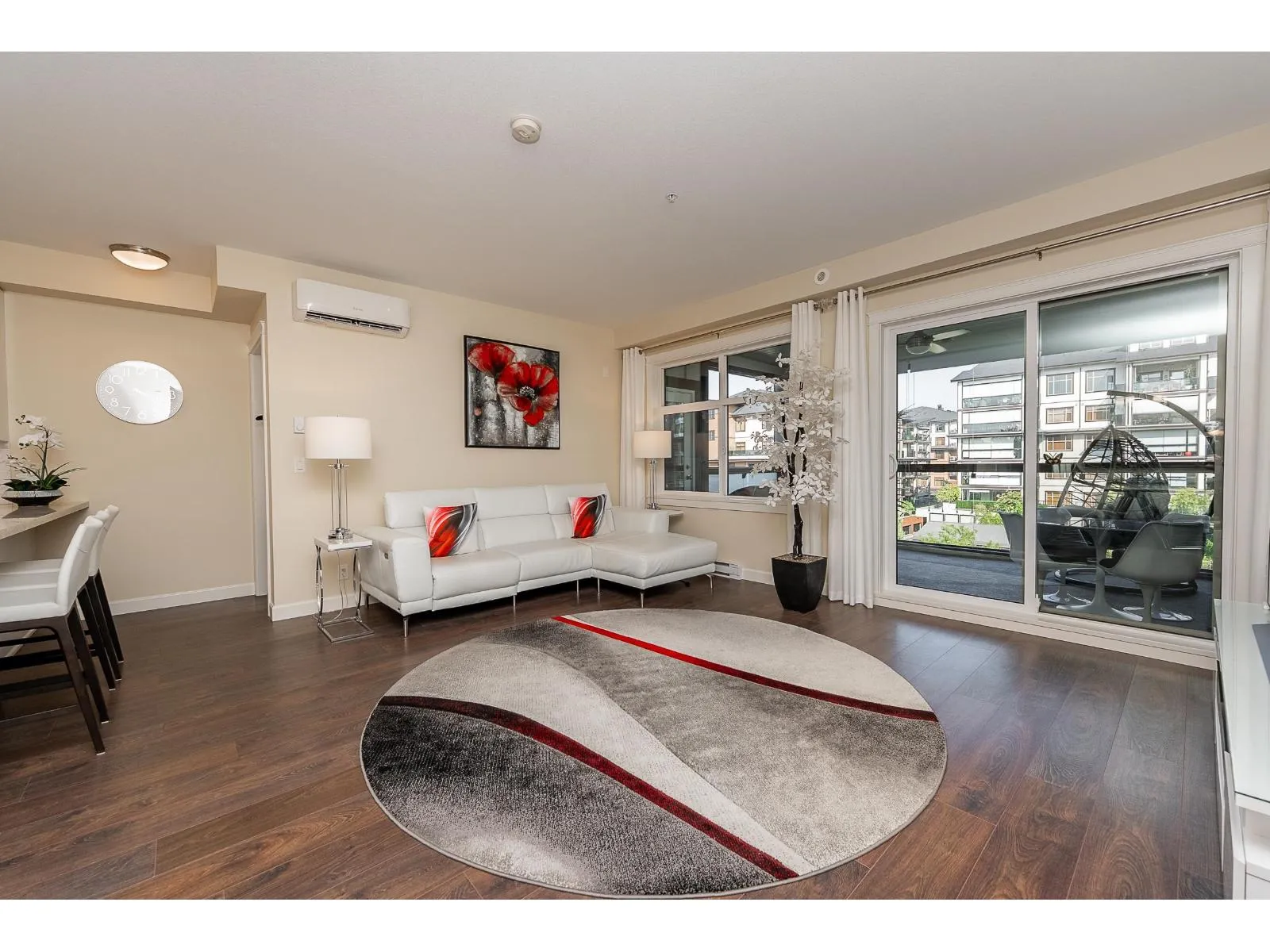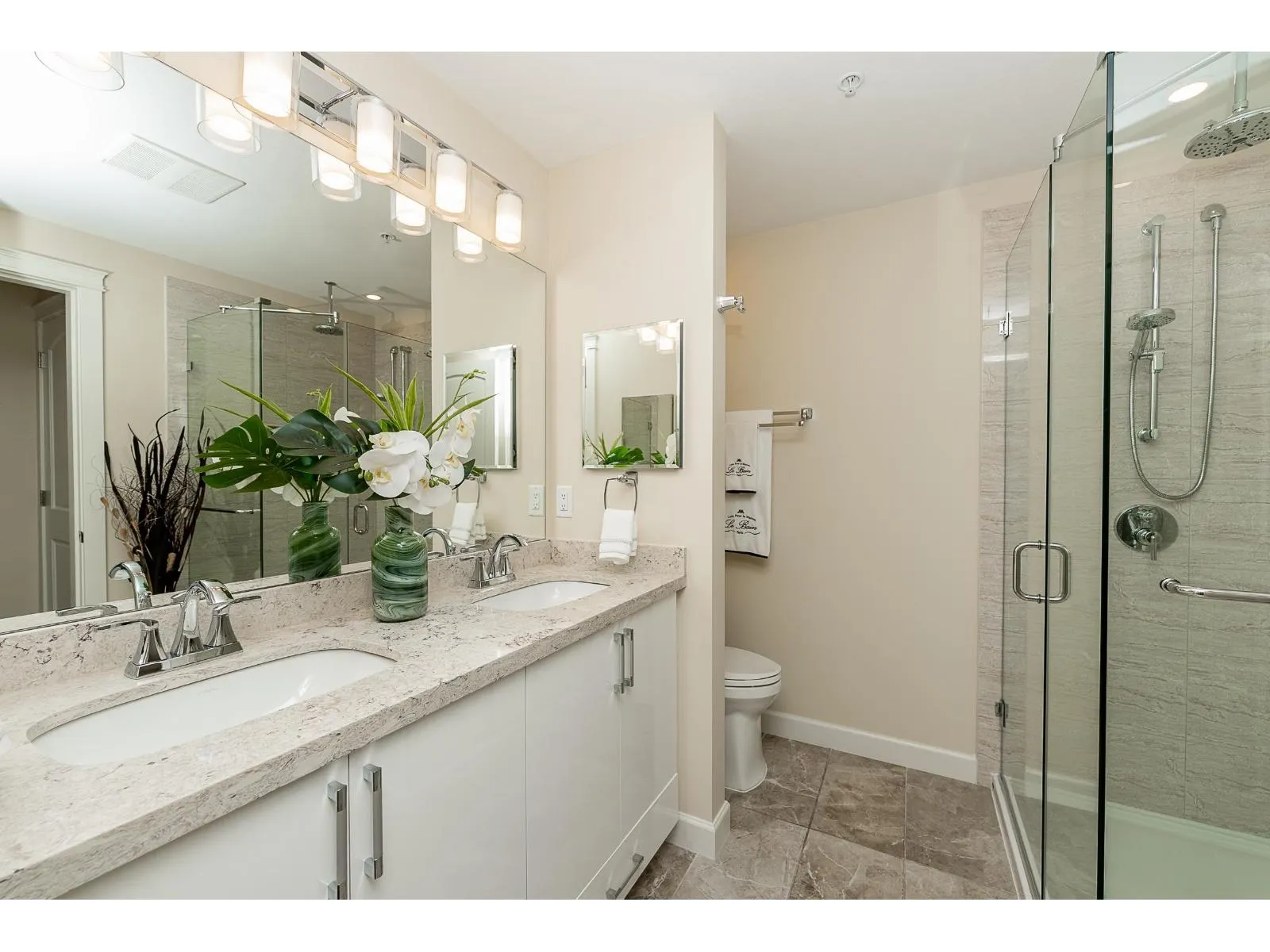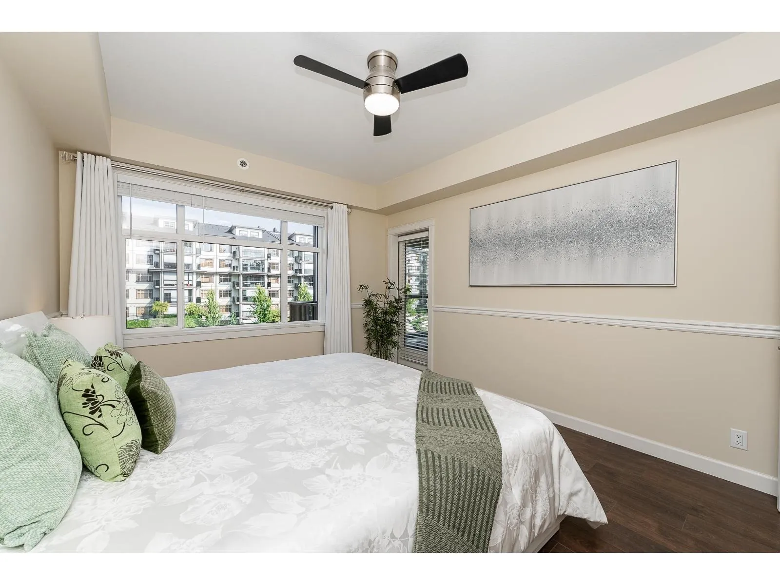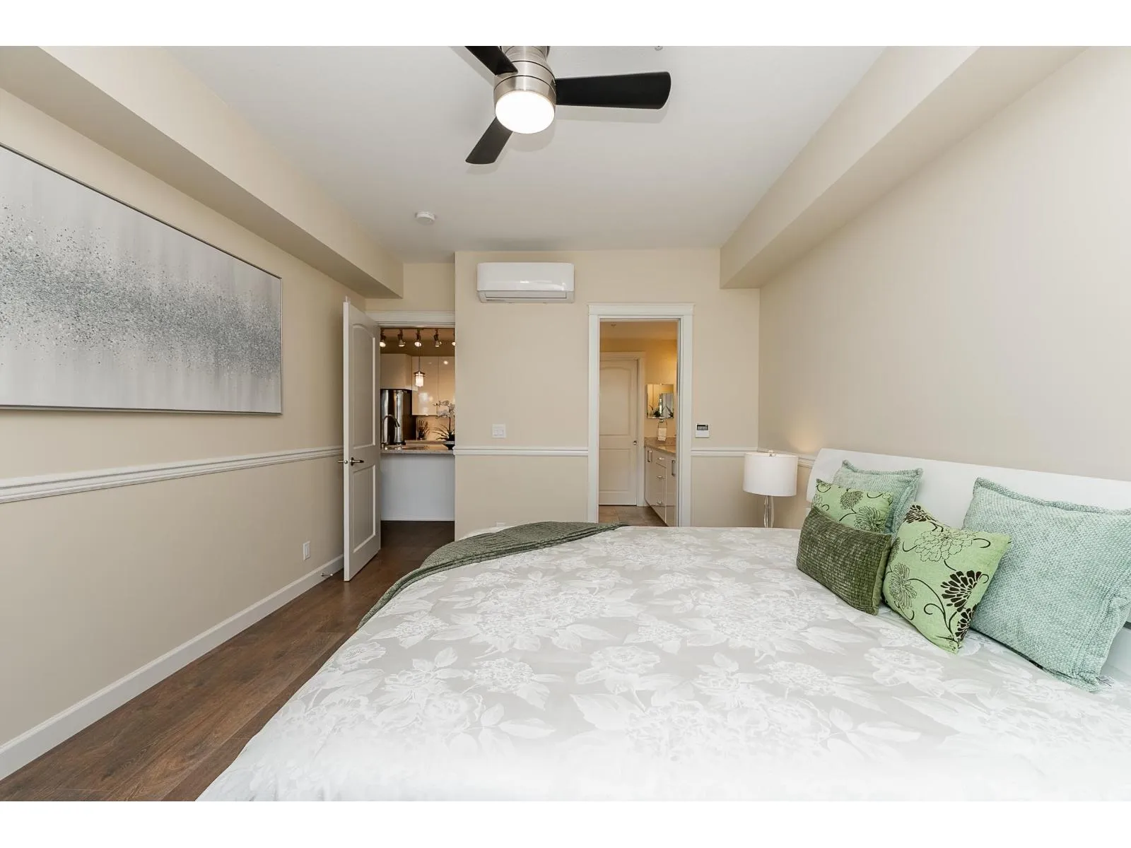 Immaculate and spacious East-facing 3 bedroom + den at sought-after Yorkson Park! Offering 1,583 sq ft of bright and air conditioned living space, plus a 225 sq ft solarium/balcony with retractable glass panels and courtyard views. The gourmet kitchen features a peninsula with seating, gas range and sleek cabinetry, seamlessly connecting to the dining and living area. Designed for year-round enjoyment, the solarium expands your living space. Generous bedrooms include two with luxurious ensuites, double vanities, frameless glass showers, walk-in closets, and access to the solarium. Added features include an energy-efficient heat pump with A/C, gas BBQ hookup, 2 parking stalls, and a storage locker. Conveniently located near Carvolth Exchange, shopping, restaurants, and quick highway access. (id:27476)
