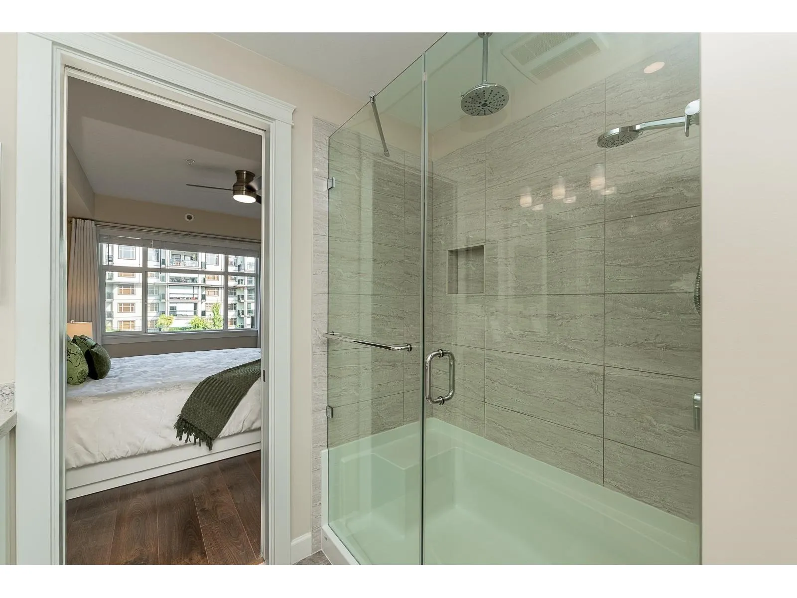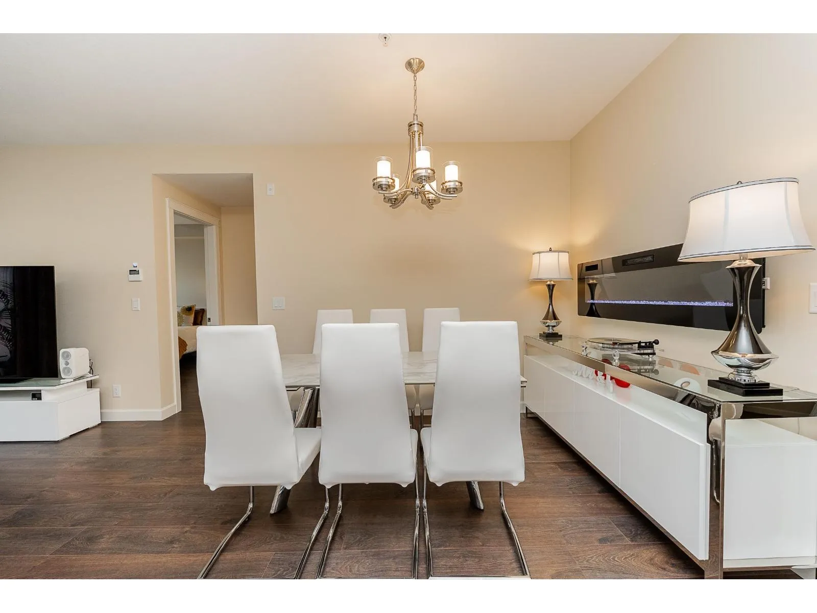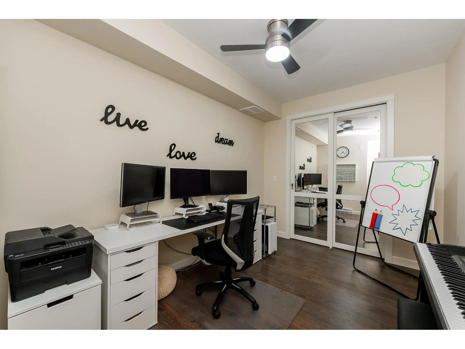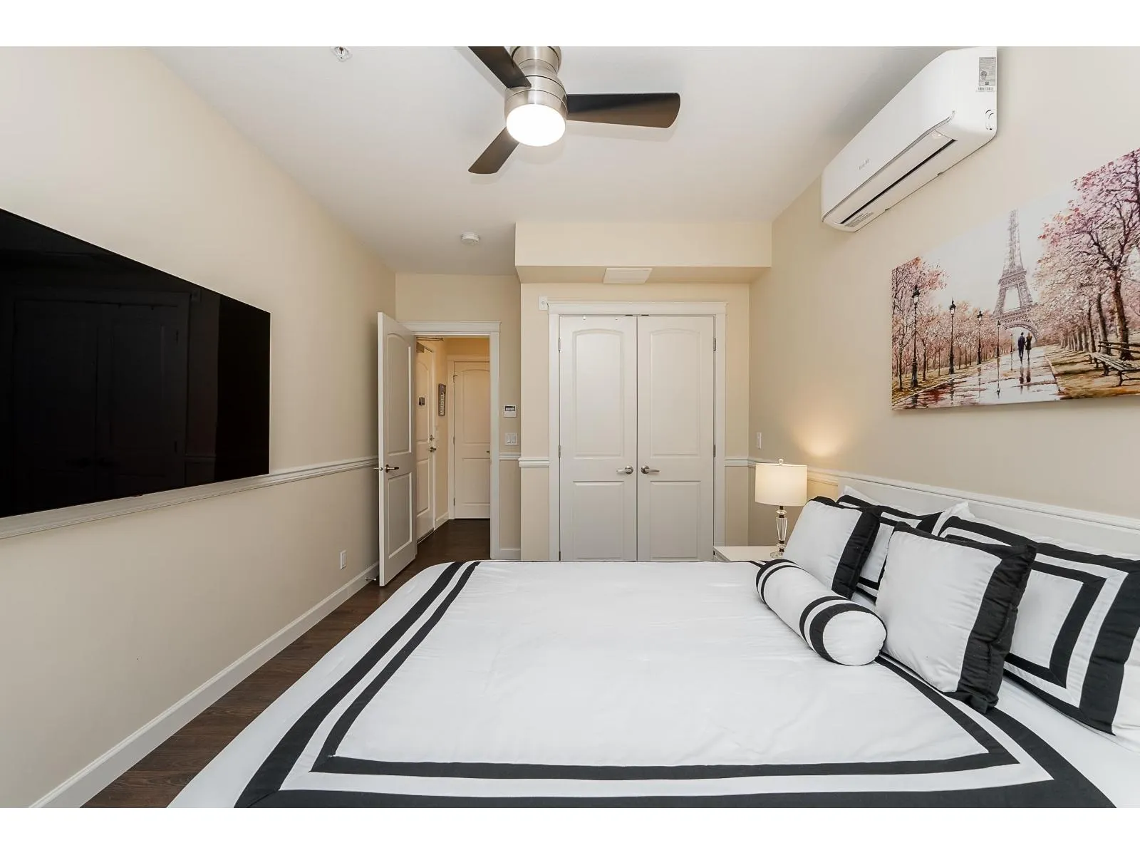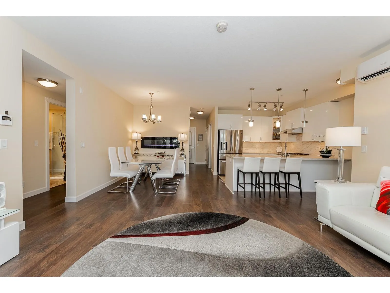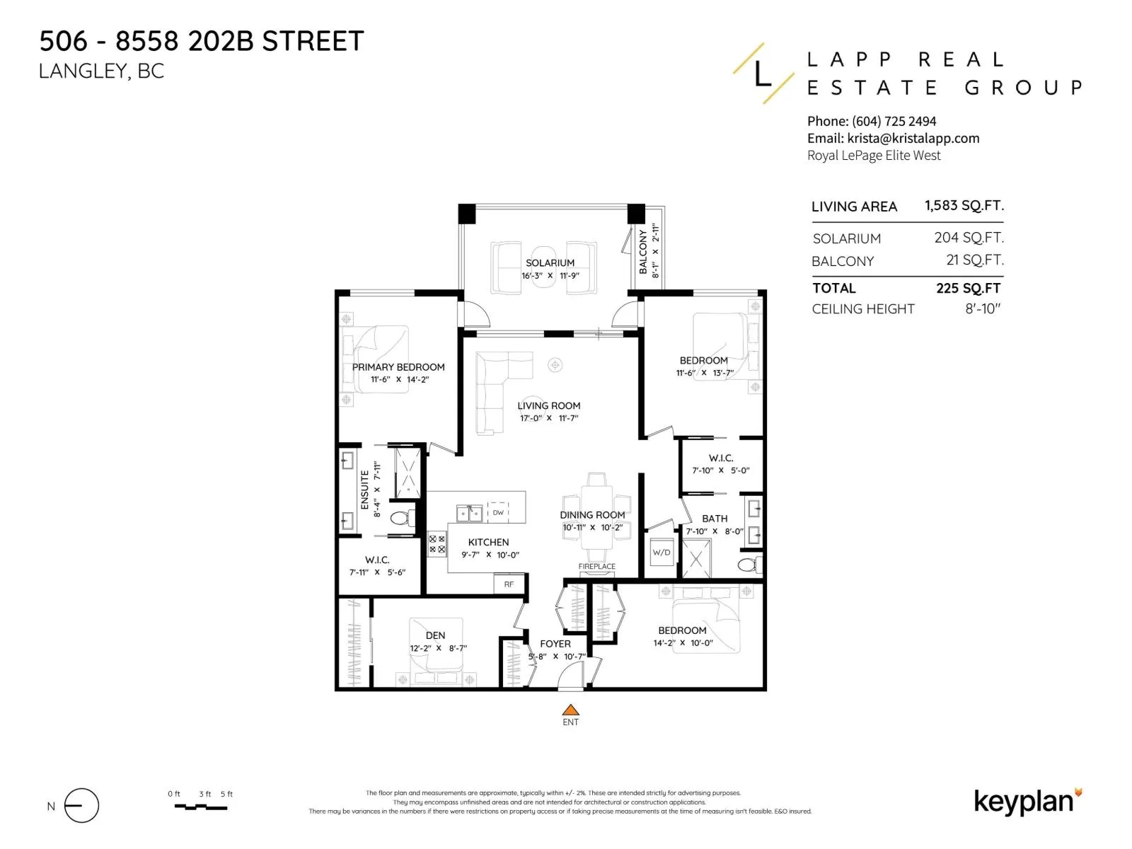 Immaculate and spacious East-facing 3 bedroom + den at sought-after Yorkson Park! Offering 1,583 sq ft of bright and air conditioned living space, plus a 225 sq ft solarium/balcony with retractable glass panels and courtyard views. The gourmet kitchen features a peninsula with seating, gas range and sleek cabinetry, seamlessly connecting to the dining and living area. Designed for year-round enjoyment, the solarium expands your living space. Generous bedrooms include two with luxurious ensuites, double vanities, frameless glass showers, walk-in closets, and access to the solarium. Added features include an energy-efficient heat pump with A/C, gas BBQ hookup, 2 parking stalls, and a storage locker. Conveniently located near Carvolth Exchange, shopping, restaurants, and quick highway access. (id:27476)