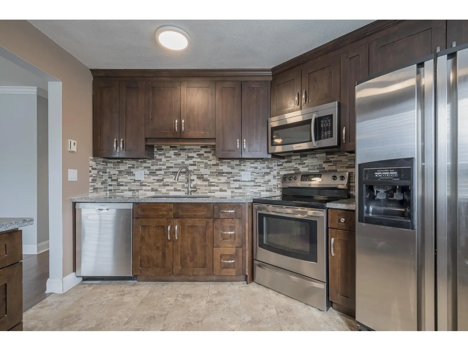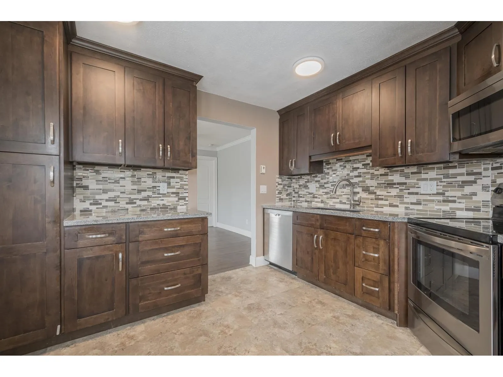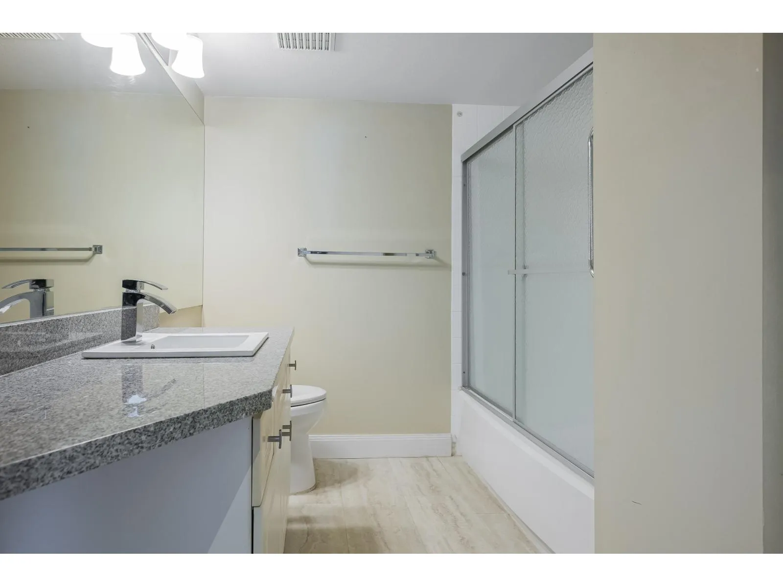 College Court! A great pet friendly complex, presents this 1005 sq ft END UNIT with 2 large bedrooms on opposite ends for privacy. Primary has 4 pc updated ensuite and the 2nd bedroom has a cheater ensuite as well! Newer kitchen with granite & S/S appliances ~ bright, spacious, with southern exposure providing tons of light. This unit comes with 2 secure underground parking spots and there is a bike storage area. In suite laundry, lots of storage & hot water is included in strata fee. Great rental for investors with Kwantlen Polytechnic steps away and near the upcoming new skytrain. Walk to shopping, transit & all amenities. (id:27476)