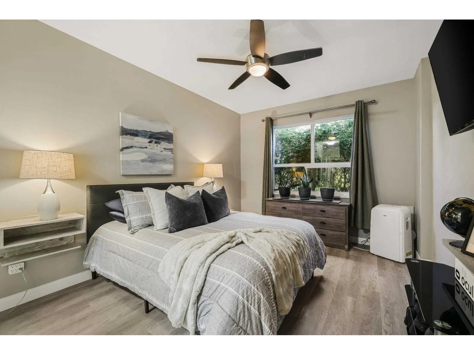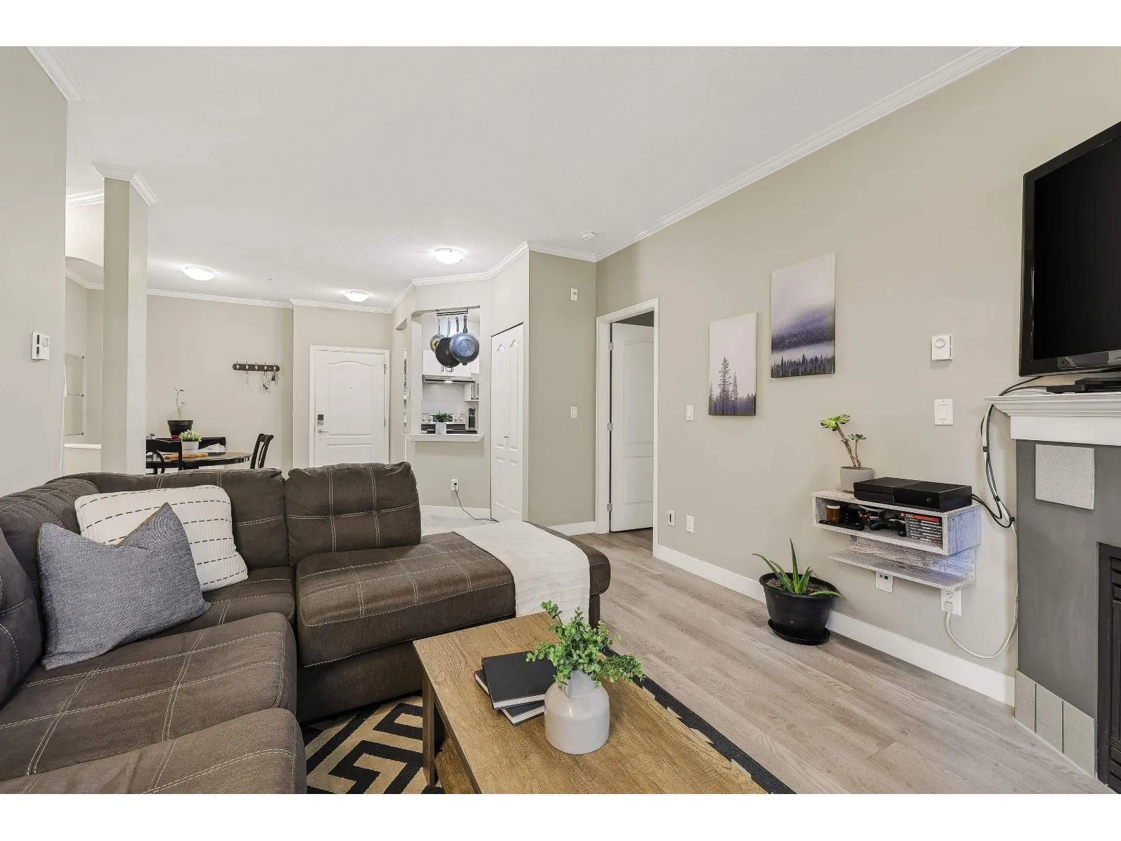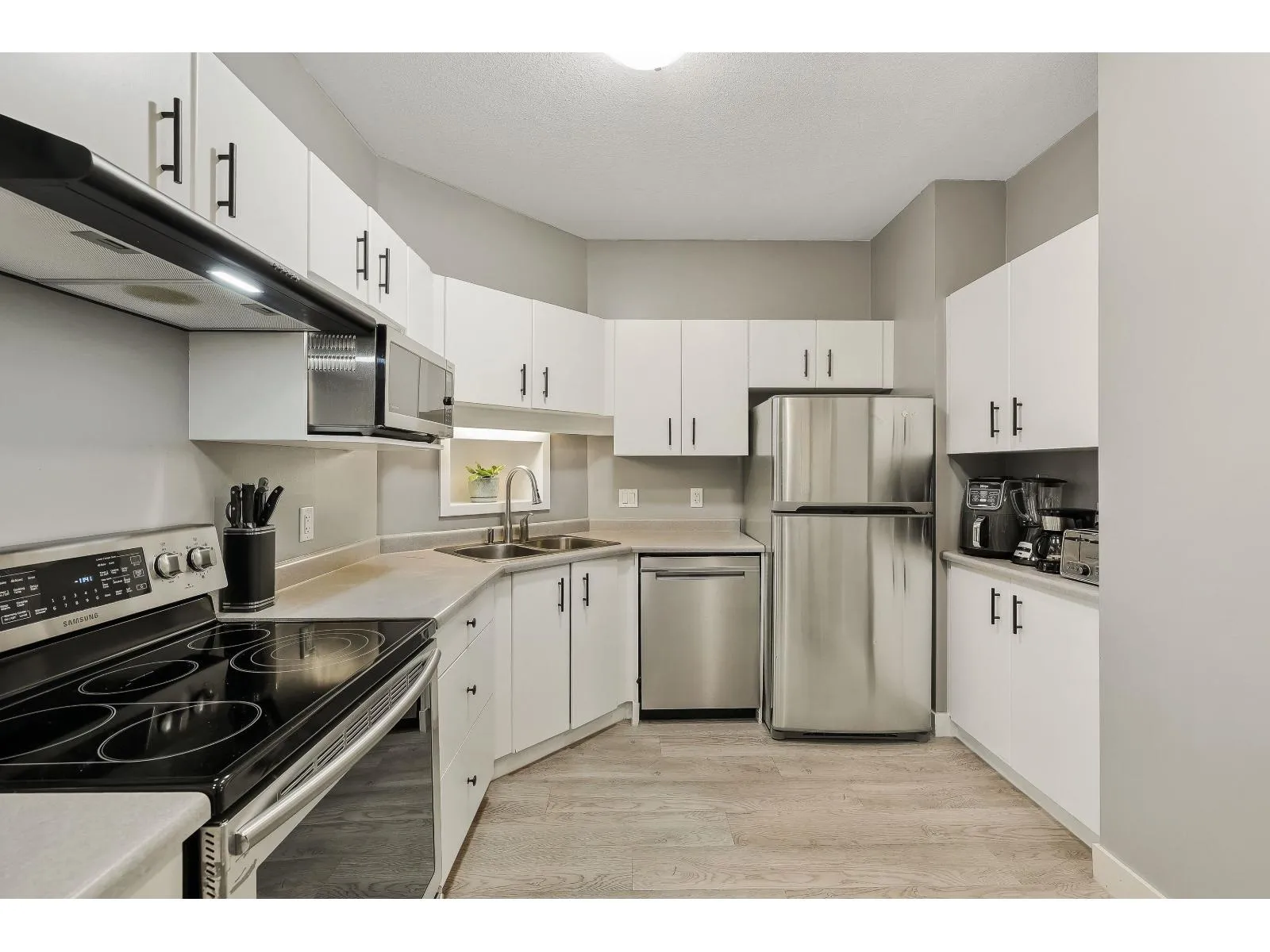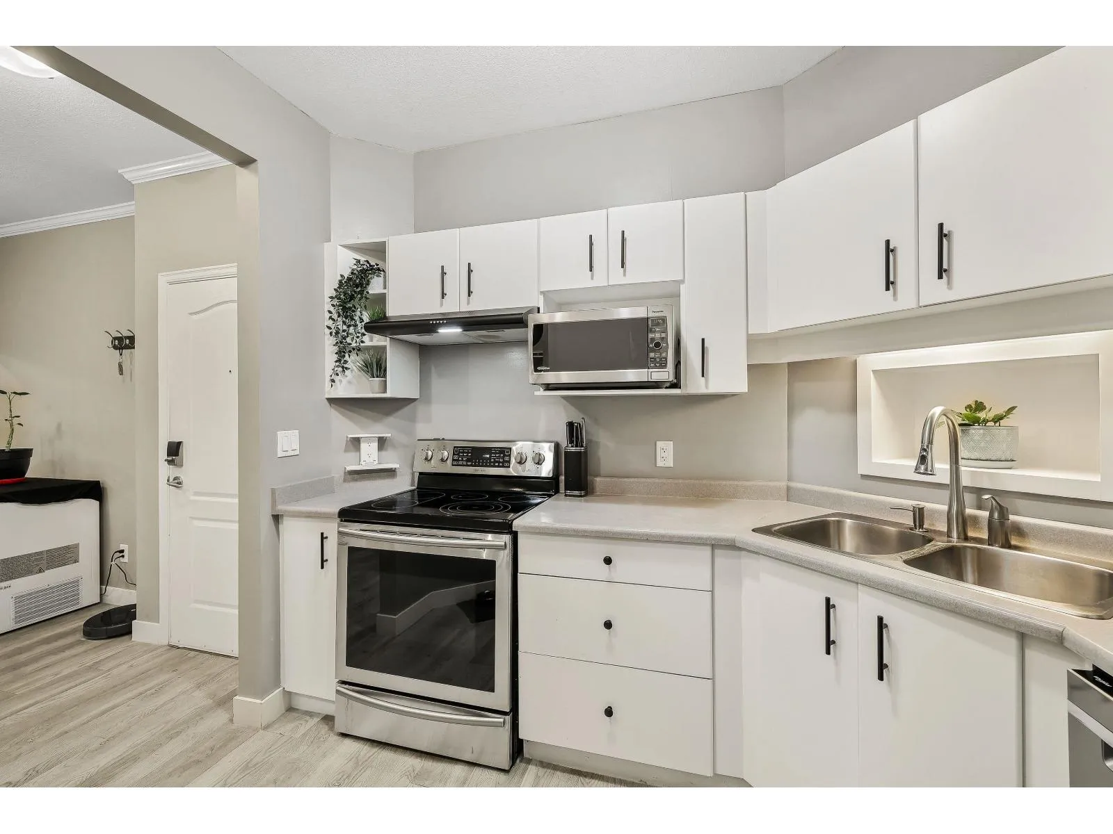 CORNER, GROUND Floor unit in sought-after City Grande! This 2Bdrm/2Bth is beautifully updated with wide-plank floors throughout PLUS new SS appliances in your bright kitchen w/double-sinks + ample storage. The generous Primary offers plenty of closet space + your private 3-pce Ensuite. Enjoy the abundant natural light, a cozy gas fireplace & private covered deck perfect for relaxing or entertaining. Convenient in-suite laundry space provides extra storage. Close to shops, cafes, near Lynnwood Park & upcoming SkyTrain. Well-maintained complex amenities include Exercise, Billiards & Rec rooms. Secure underground parking + storage locker. This condo is move-in ready! (id:27476)