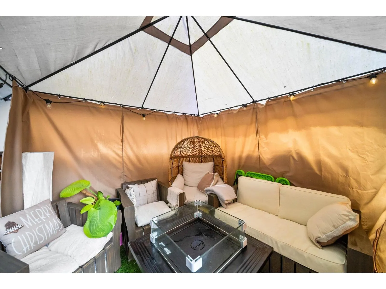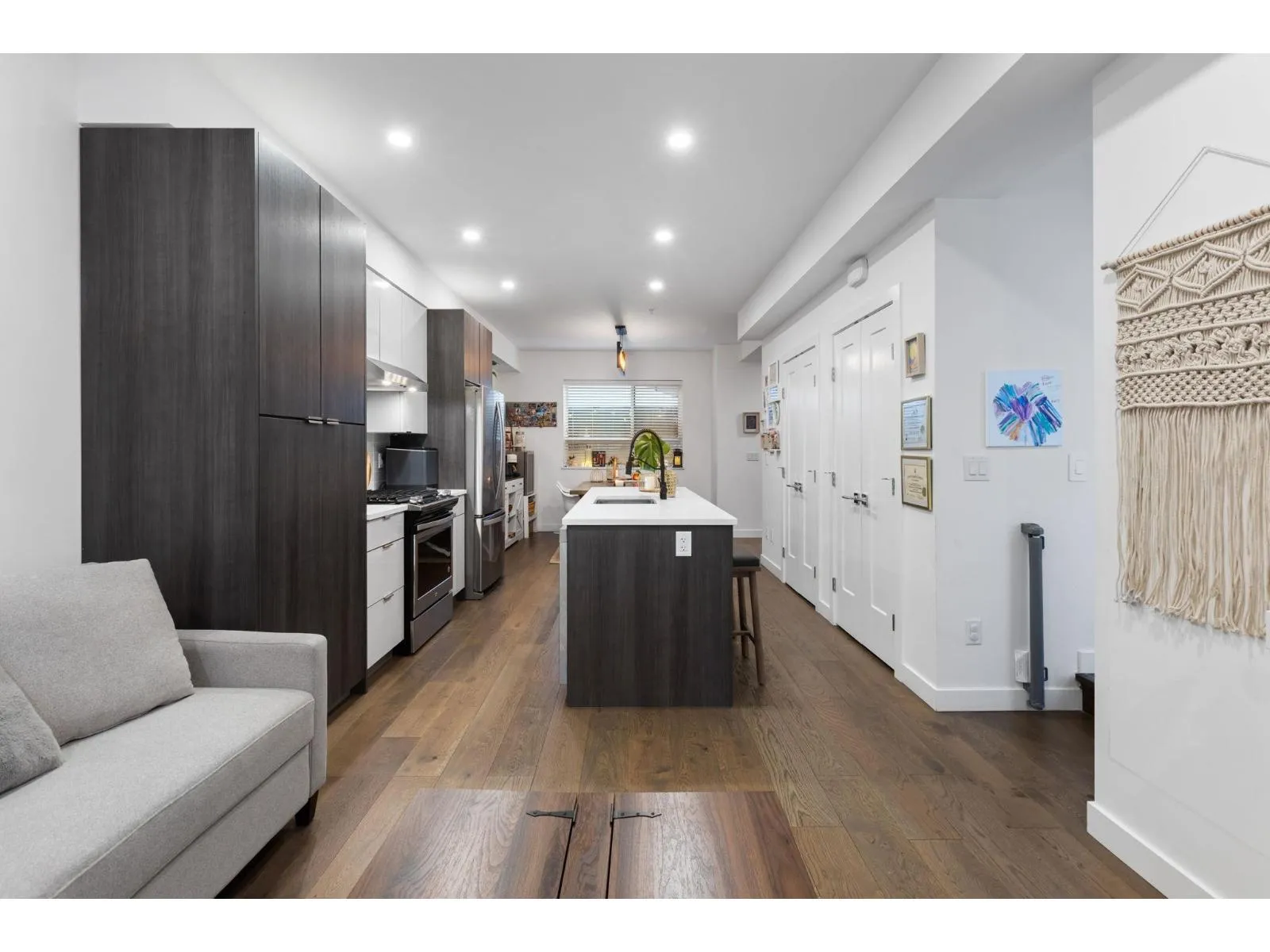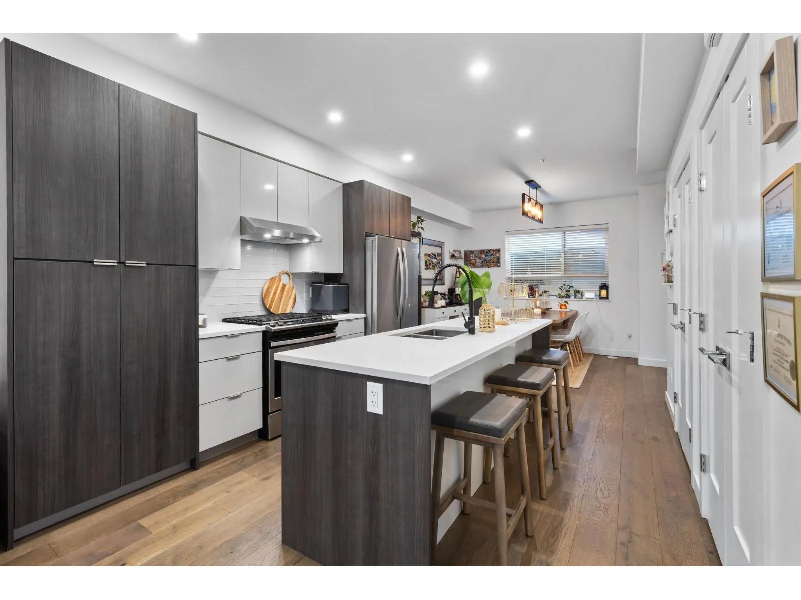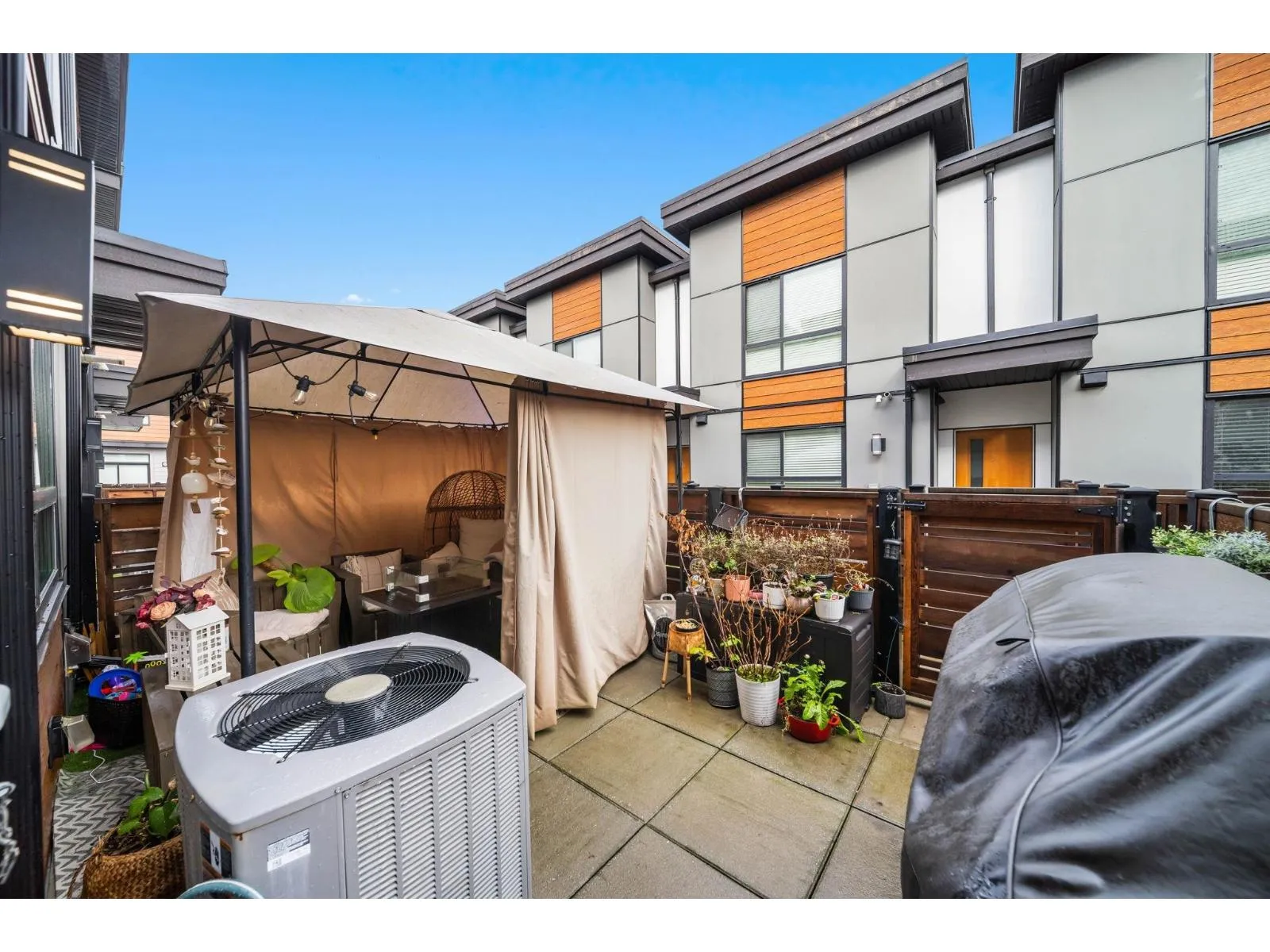 Welcome to this very clean and very well-kept 3 bed and 2.5 bath townhouse in The Terraces! The main floor offers an open-concept living room, a kitchen with a large island with a quartz countertop, and a dining area, which leads to a patio with turf. The upper floor has a decent-sized primary bedroom with its own ensuite and two additional bedrooms and a family bathroom. Additional features include central AC and hot water on demand. This centrally located complex is just a few minutes' walk to shopping, restaurants, recreation, parks, and the future new Skytrain station.Bonus EV charger, Updated Washer/Dryer, Hoodfan and hot water. Move in ready! Open House October 25th 2-4 PM (id:27476)