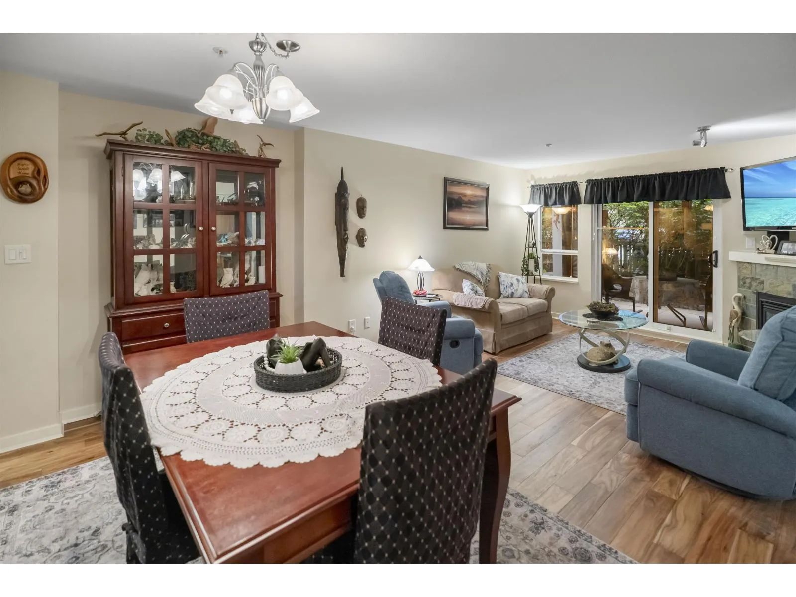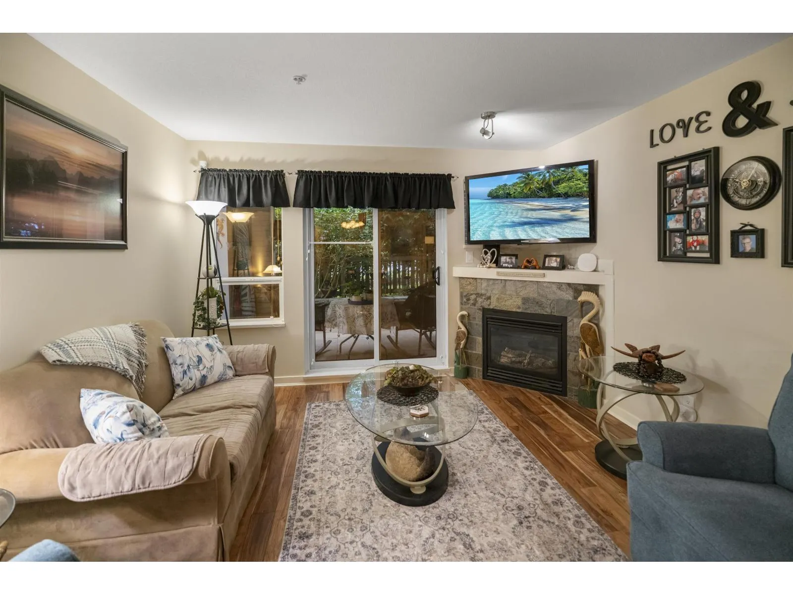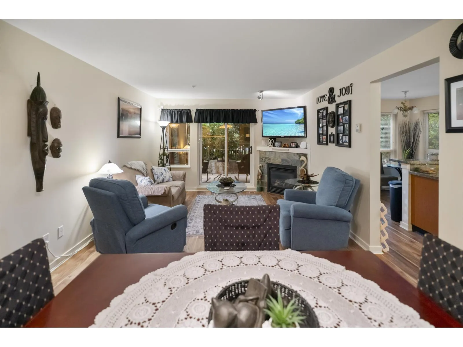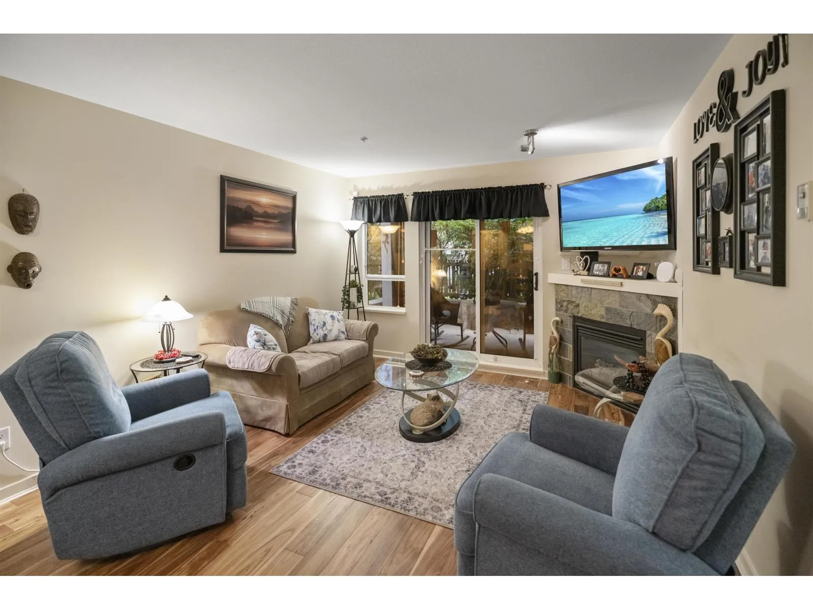 Fantastic Ground-Floor Corner Unit! Bright and spacious 2-bedroom + den home featuring upgraded hardwood flooring and freshly painted, ready for you to move in! The inviting living room with a cozy gas fireplace flows into a formal dining area, perfect for entertaining. Enjoy your morning coffee or unwind on the large private, treed patio-a peaceful retreat ideal for pets, kids, or gardening enthusiasts. The kitchen offers stainless steel appliances, ample cabinetry, and a sunny eating nook. The primary bedroom includes a walk-in closet and a full ensuite, while the second bedroom is thoughtfully separated for privacy. The den makes a perfect home office or guest space. Located on a quiet street yet close to shopping, cafes, transit, schools, parks, and Kwantlen University. Experience comfort, space, and convenience in one perfect package. Open House: Oct 25 & 26, 2-4 PM! (id:27476)