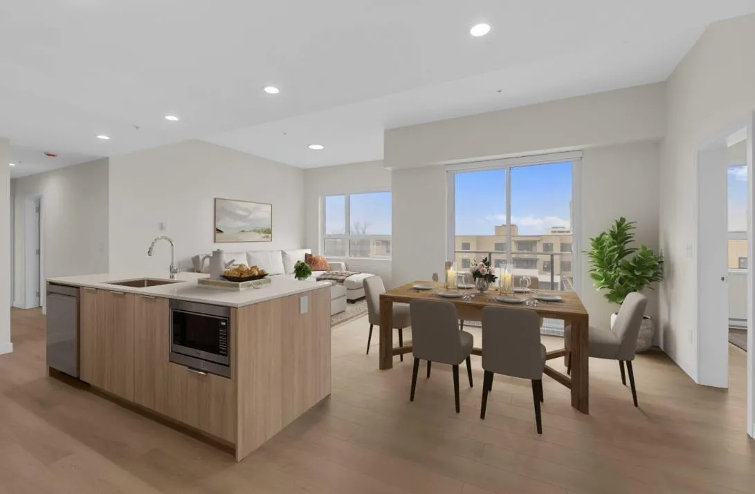 Welcome to South Village Condos designed by VESTA at Latimer Heights. TOP FLOOR CORNER UNIT that offers 934sqft of thoughtfully designed living space. This unit features 2 bed + 2 full bathrooms with a rare SEPERATE Living & Dining area complemented with high ceilings. Enjoy abundant natural light year-round with large windows on both sides of the unit. For added privacy, this unit is conveniently located beside the stairs. Features an open concept kitchen with spacious island, Gas range hood, stainless steel appliances, AC Wall unit and contemporary light colour scheme. South Village condos is ideally located just minutes from top-rated schools, shopping, parks, Carvolth Bus Exchange, Langley Event Centre and Hwy 1. Comes with One EV capable Parking stall plus 1 storage locker. (id:27476)