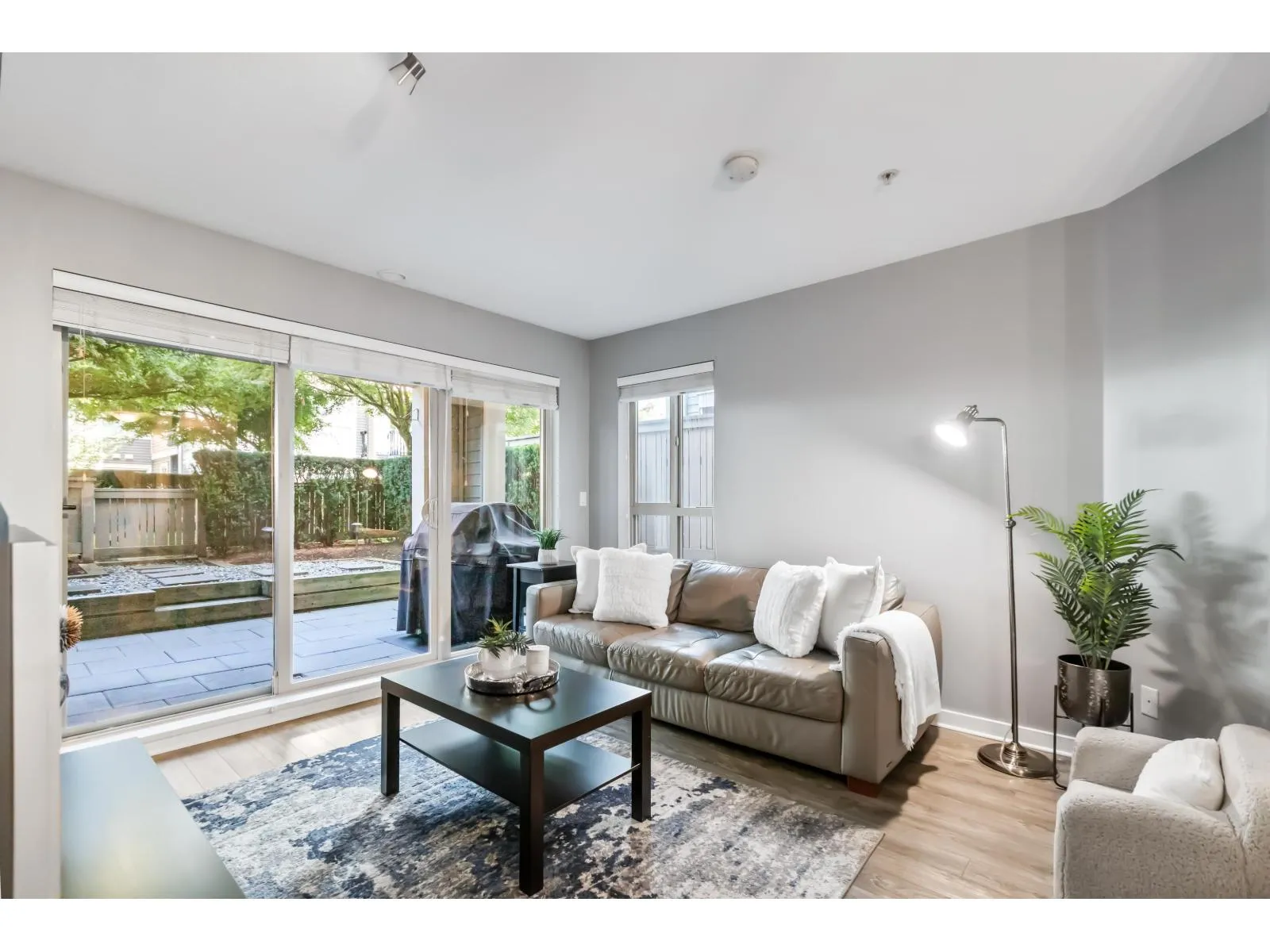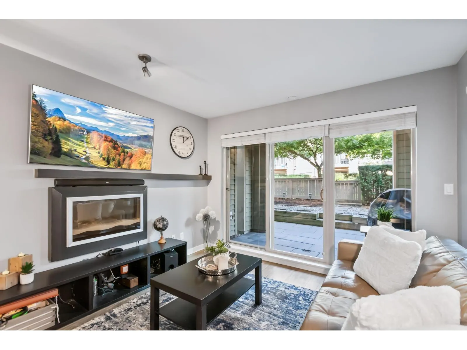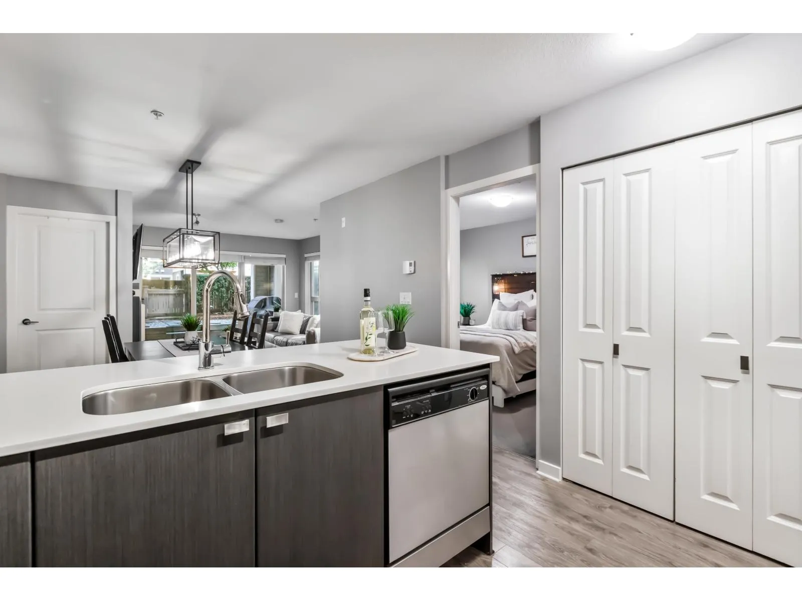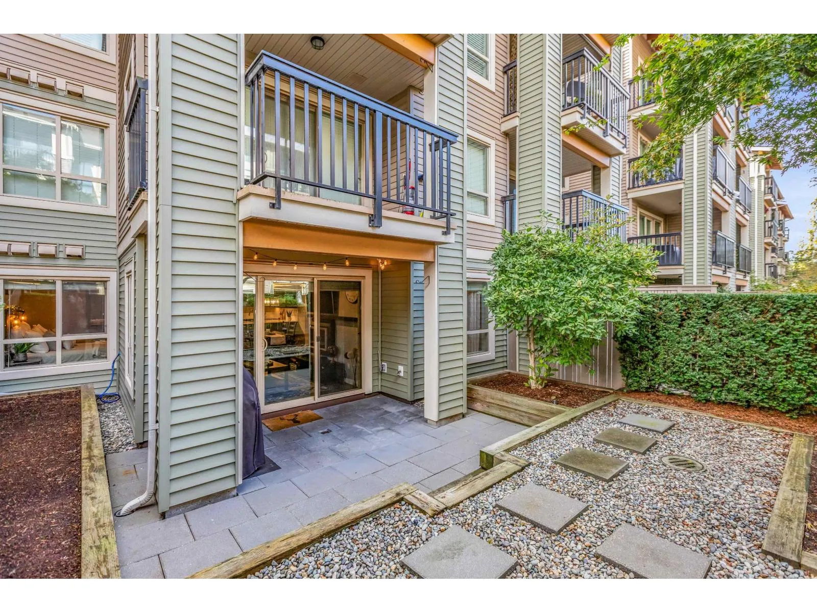 CORNERSTONE presents this beautiful GROUND FLOOR HOME offering a LARGE PRIVATE YARD with EXTRA ENTRANCE, situated on the QUIET SIDE OF THE BUILDING. Located in a secure, raised podium-style complex with no public access,ideal for pets/children.This 2-bedrm, 2-bathrm condo features an open-concept floor plan. The modern kitchen is thoughtfully designed with quartz countertops, S/S appliances, sleek cabinetry & laminate flooring that flows seamlessly into the dining/living areas.Living rm includes a floating fireplace & provides access to your private 149 sqft patio/large yard through oversized sliding doors/windows. The well-designed layout offers separated bedrms for added privacy,primary features a W/I closet & full ensuite. Pet-friendly building & located just off the Langley Bypass. (id:27476)