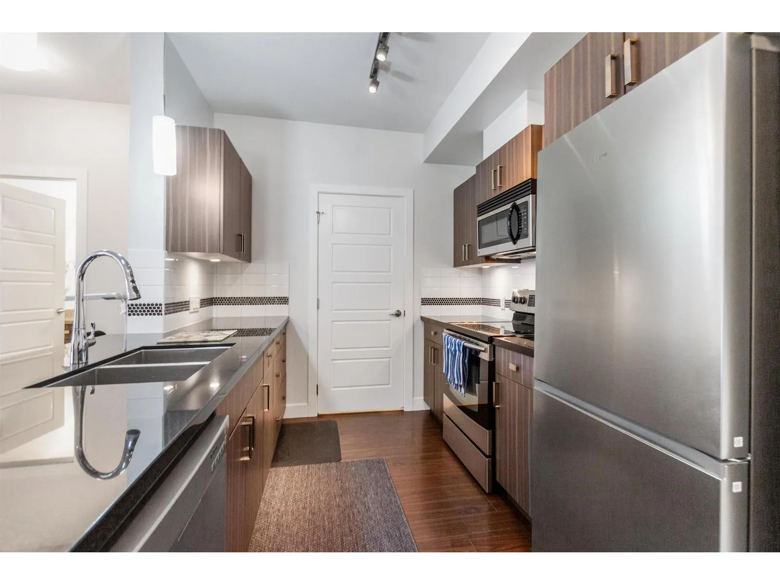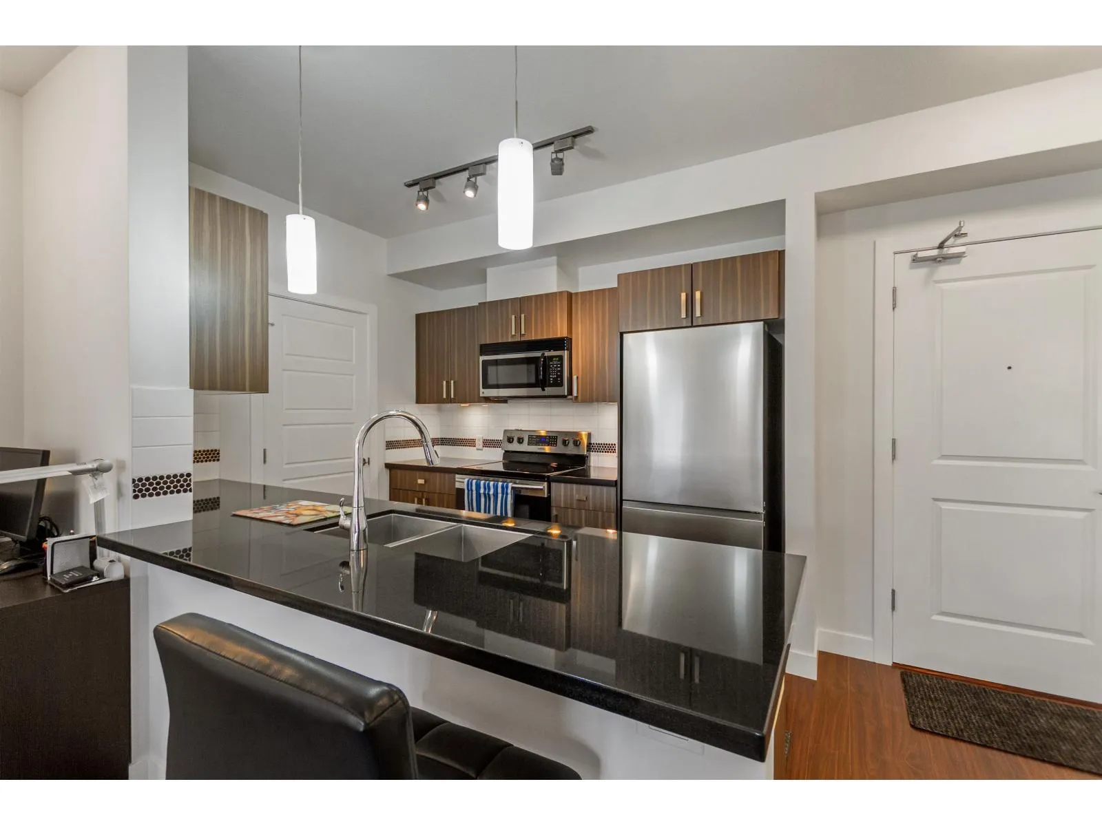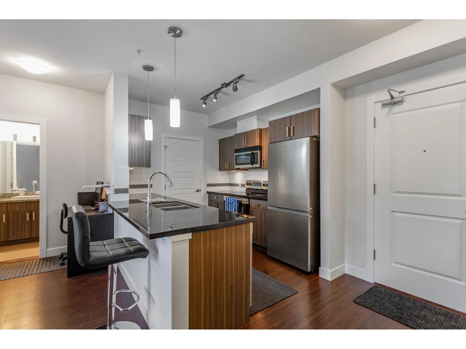 Well maintained 2 bedroom 2 bathroom condo with open and optimal floor plan for great use of space. Both bedrooms and bathrooms on opposite sides are separated by living area for maximum privacy. Functional kitchen with stainless steel appliances and soft close cabinets. Laundry room off the kitchen with full sized washer & dryer. Good sized balcony is facing the quiet side of the building. Unit comes with one secure underground parking stall and storage locker. All this in a well run building. Nestled in a quiet neighborhood, yet close to everything! Steps away from grocery stores, supermarkets and restaurants. Just minutes away from the future skytrain station. (id:27476)