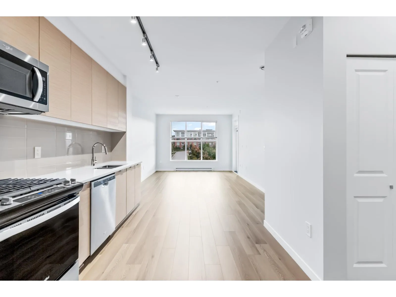 BEST IN THE BUILDING! Presenting a gorgeously designed and expansive 1 bed, 1 bath home in renowned UNION PARK by Polygon. PERFECT POSITION! Enjoys views over expansive courtyard, gardens AND sunny Southern exposure for ample privacy & sunny living. A STUNNING 642ft layout boasts over height ceilings, large windows inviting natural light throughout. Modern finishing by high quality builder including stunning galley kitchen, dream bathroom, plus MOVE IN to a freshly professionally painted space w/brand new laminate flooring just installed. Enjoy RESORT LIVING from home.. Commercial grade gym, outdoor pool+hot tub, billiards lounge, basketball court, gardens, playground - ALL just steps to Yorkson Creek sports complex, future community centre, schools and Willoughby Town Centre! (id:27476)