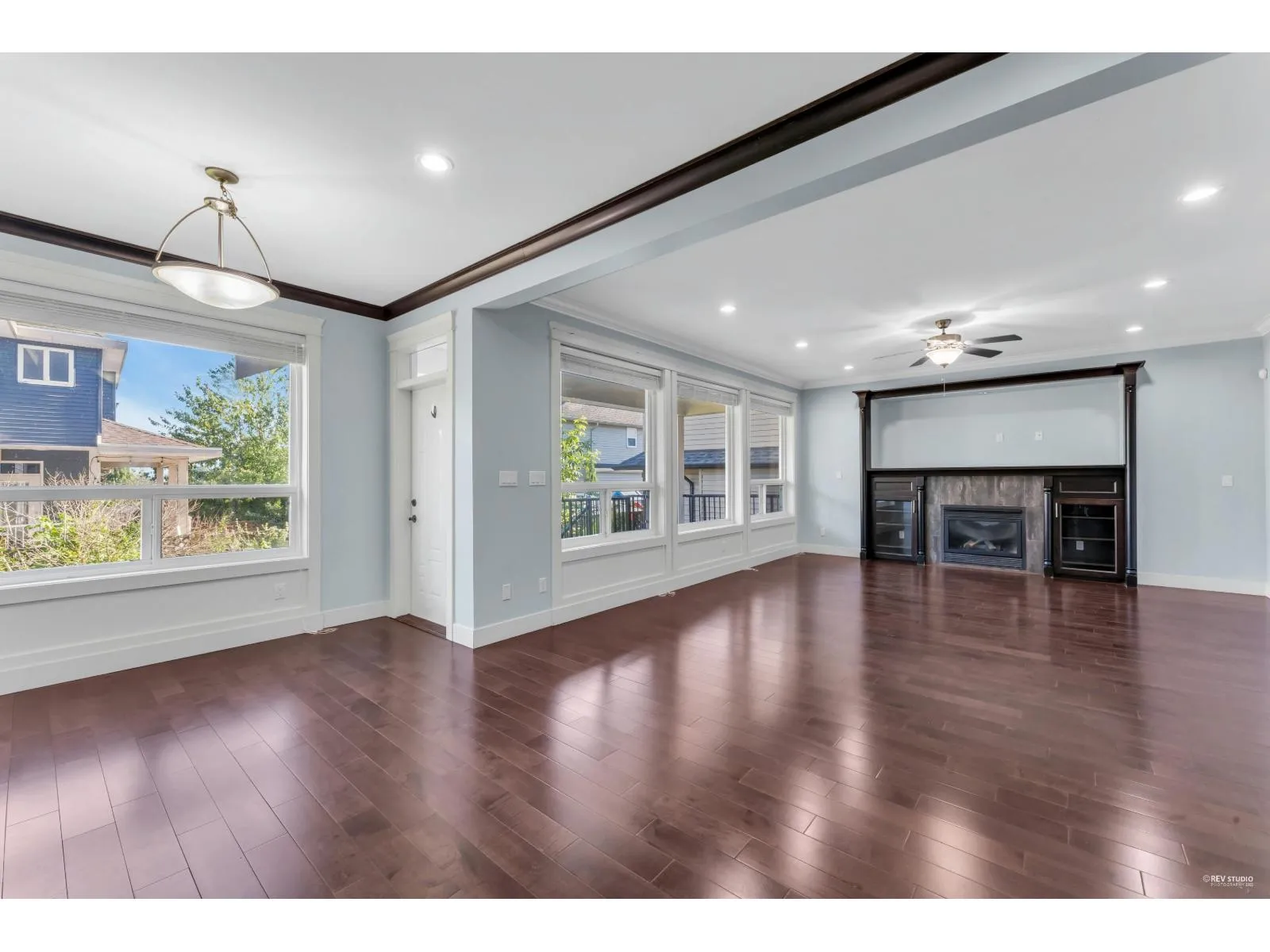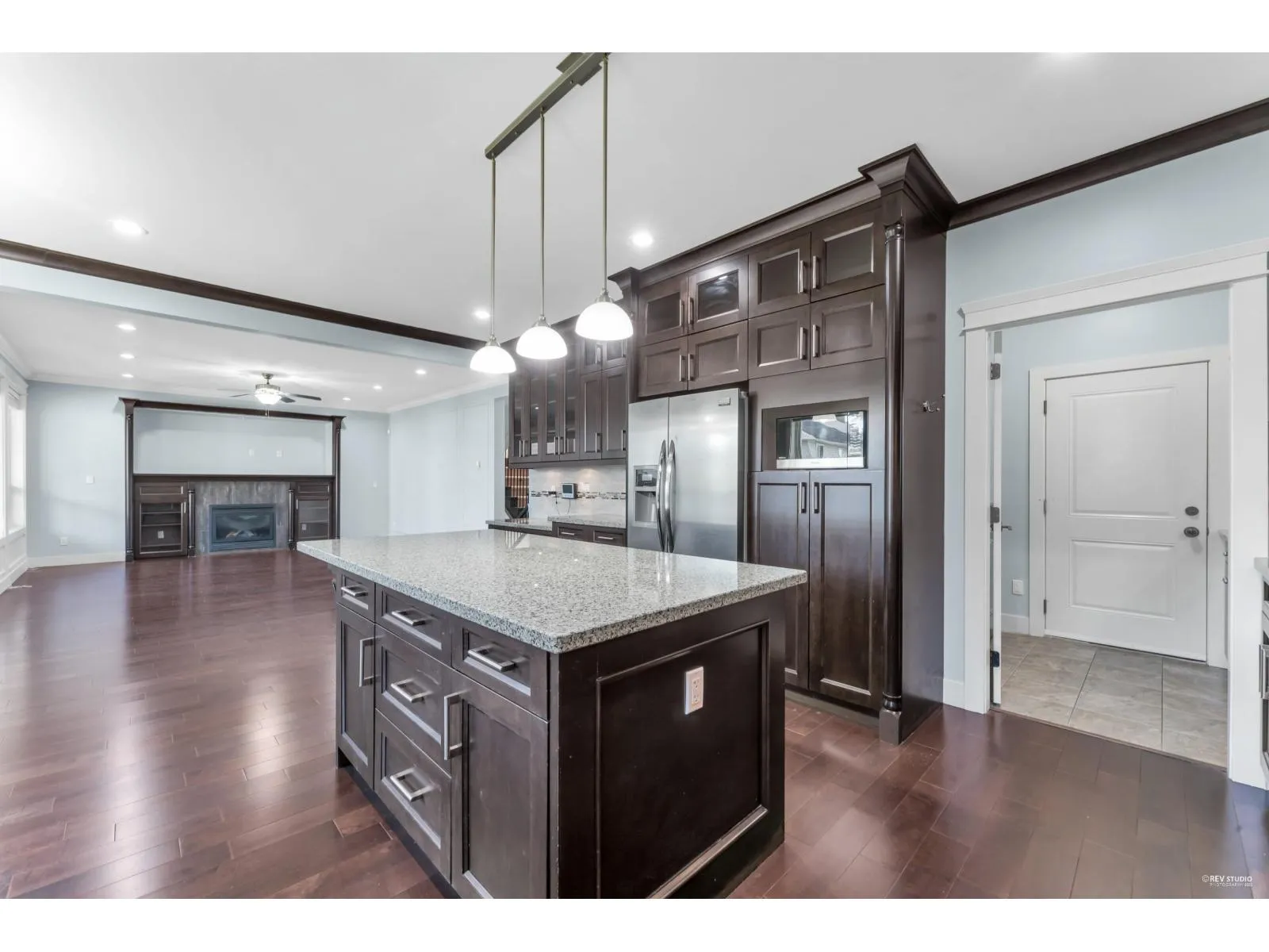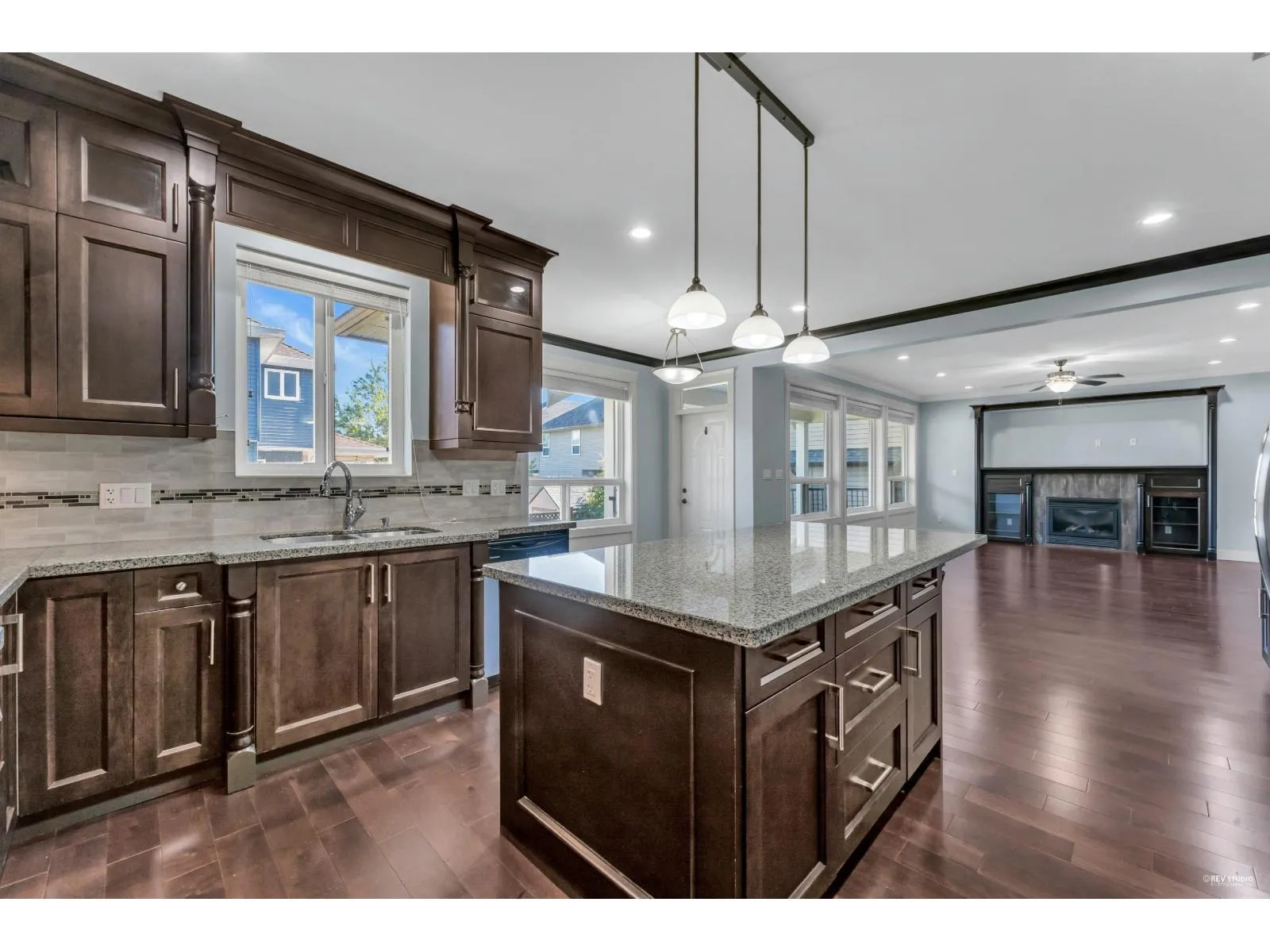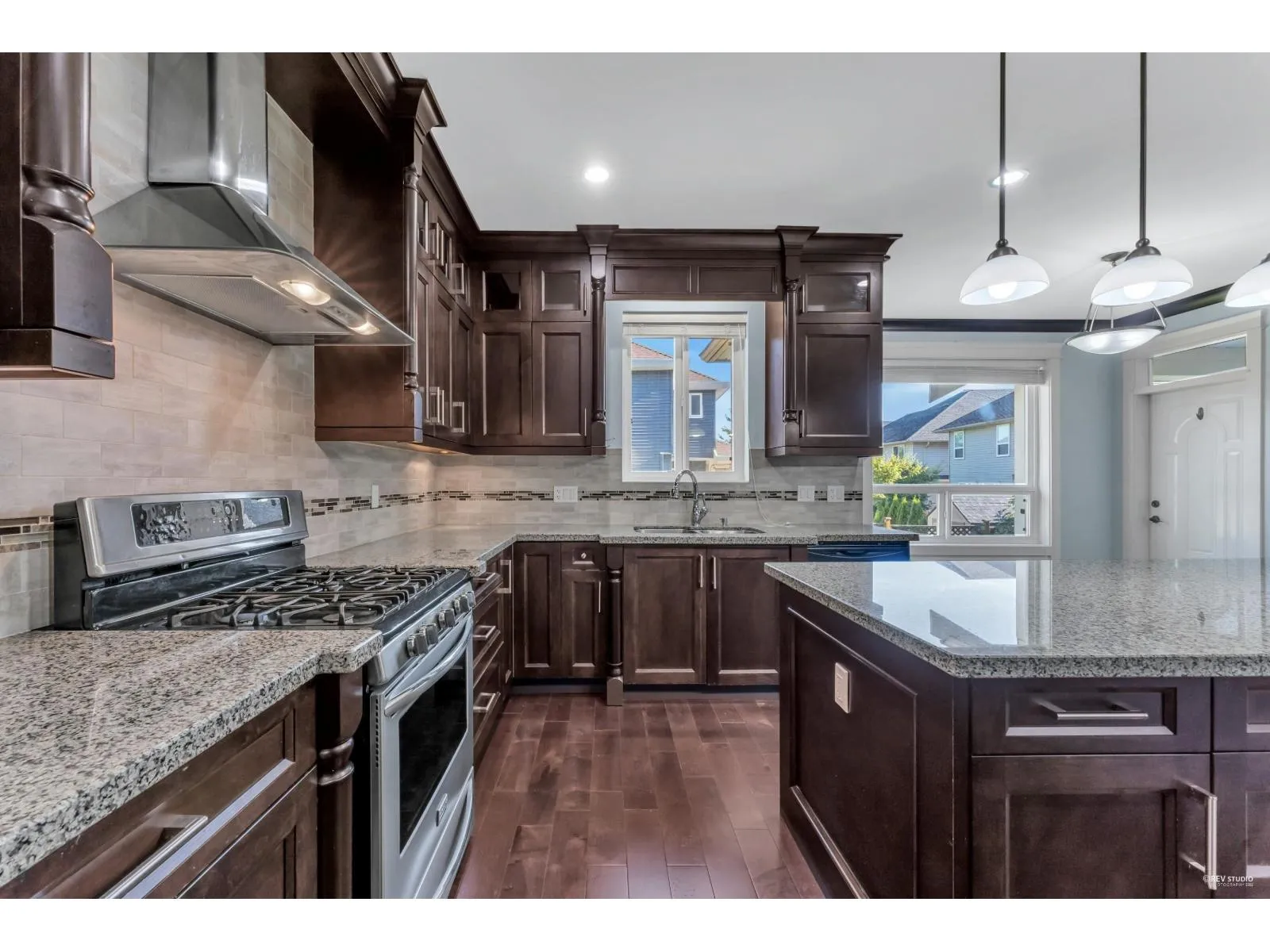 Luxurious home in Yorkson South! Featuring a gourmet kitchen with granite counters, large island with built-in drawers, custom maple cabinets, S/S appliances & gas stove. Main floor offers a spacious office/living space with wainscoting, plus a bright family room with gas fireplace, custom built-ins & engineered hardwood floors. Upstairs includes a primary suite with walk-in closet & organizers, ensuite with jacuzzi tub, granite counters, maple cabinets, separate showers & mountain views. Radiant heat, designer lighting & crown mouldings throughout the top two floors. Basement includes media room & 2-bed legal suite with new laminate flooring. Close to Lynn Fripps Elementary, parks & shopping. (id:27476)