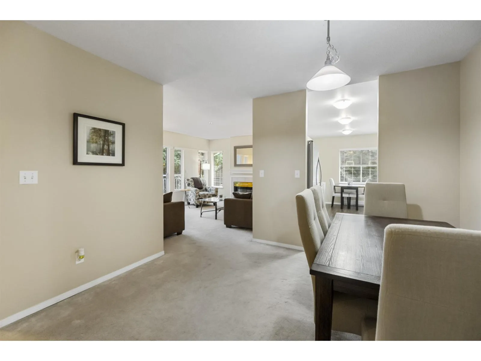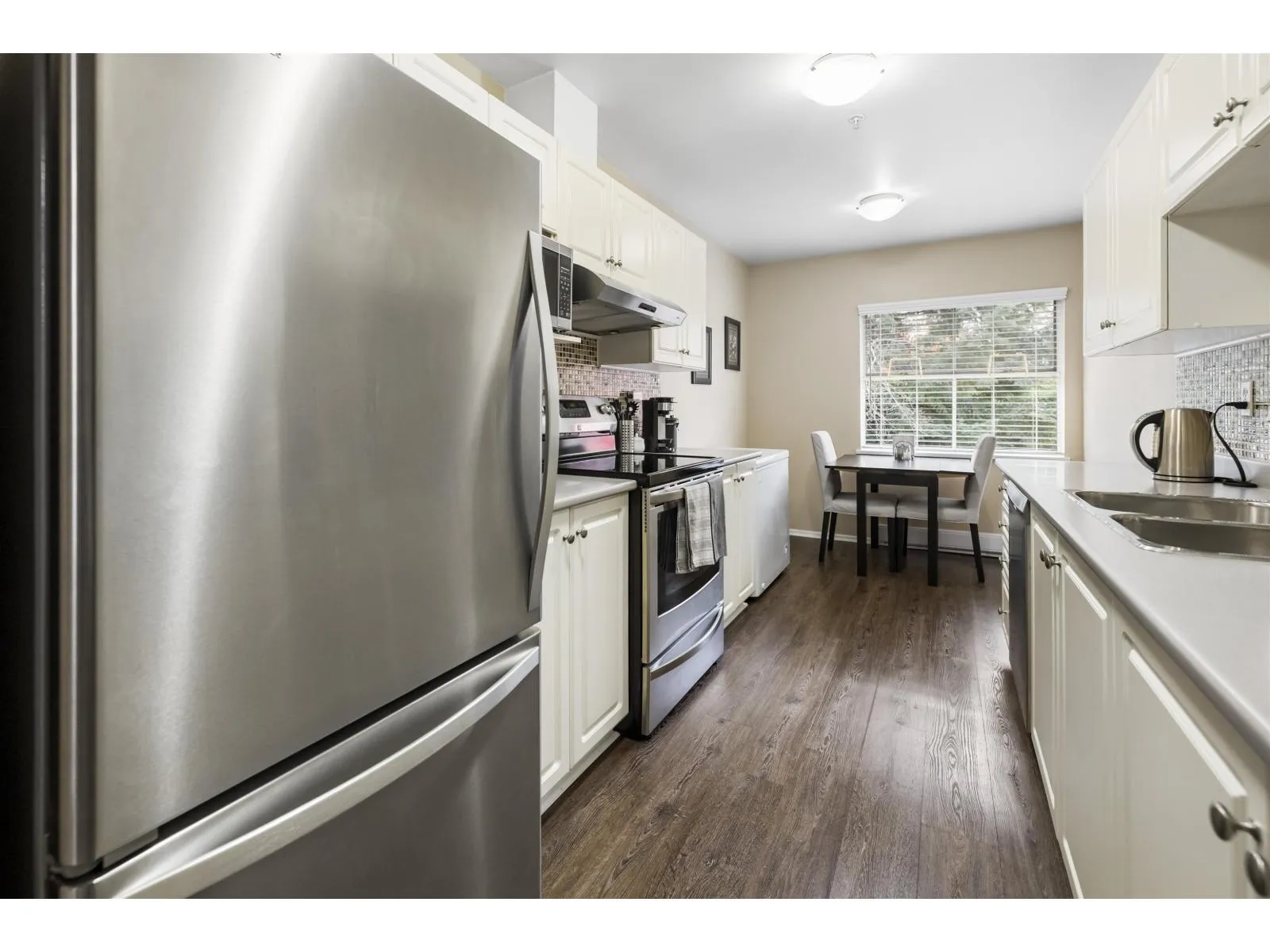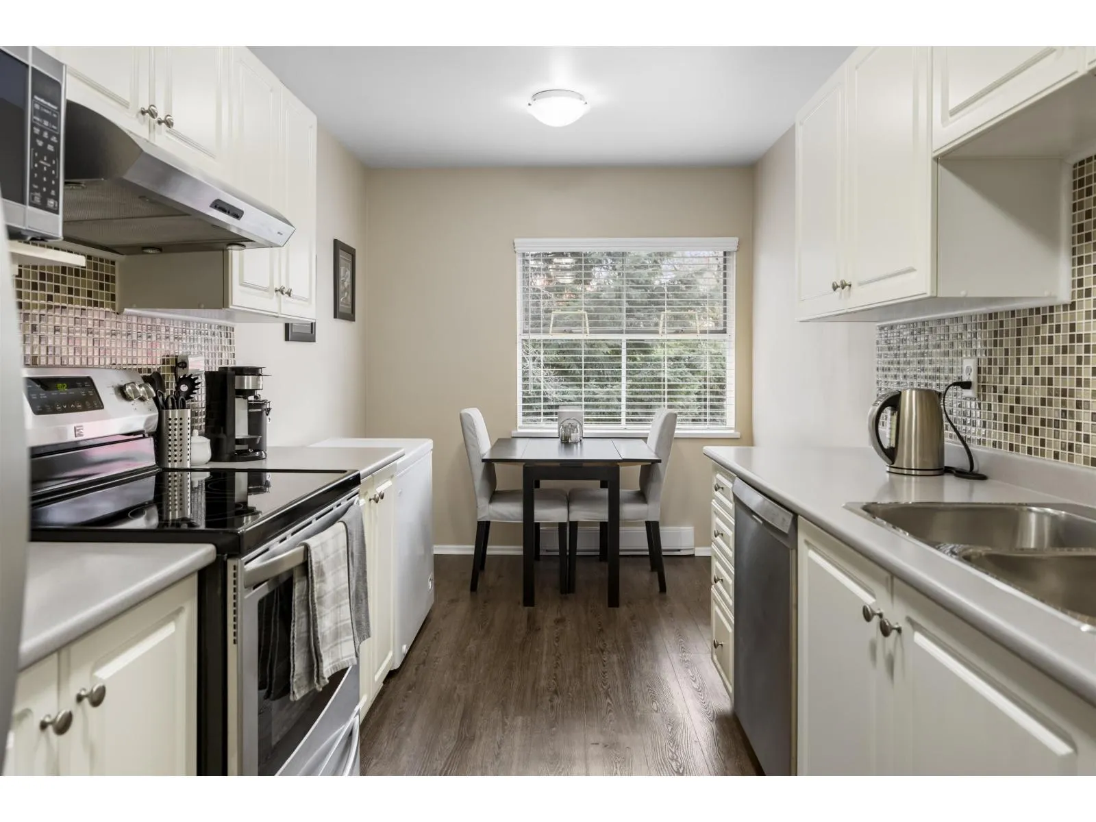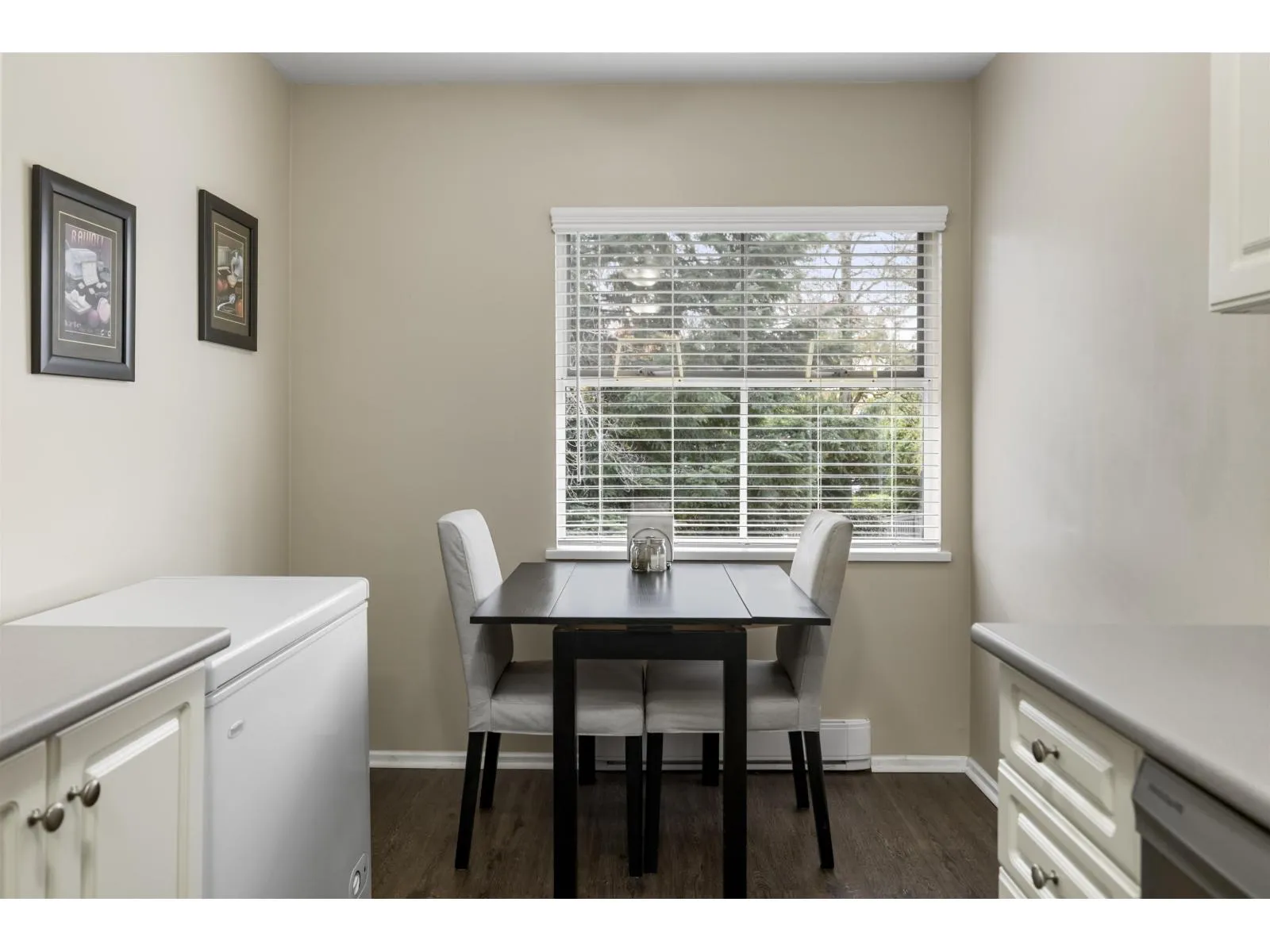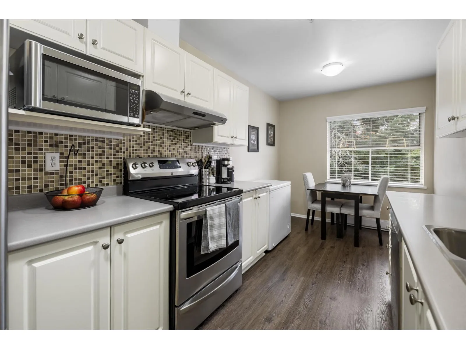 Welcome home to The Meadows. This large 3 bedroom 2 bathroom upper unit townhome offers over 1300 sq ft of well laid out space and no one above you. A corner unit with lots of natural light and extra windows. Enjoy additional privacy from the East facing deck with a view of the trees. All bedrooms are a good size, perfect for a growing family or for those who work from home. There's an eating area in the kitchen, plus a full size dining room. Cozy up in the living room next to the gas fireplace. Newer blinds, updated hot water tank, stainless steel appliances, and kitchen flooring. Large entrance foyer with plenty of storage. Parking for 2, one in the shared garage and one on the pad outside. Terrific central location within walking distance to shopping, parks, schools, and transit. (id:27476)